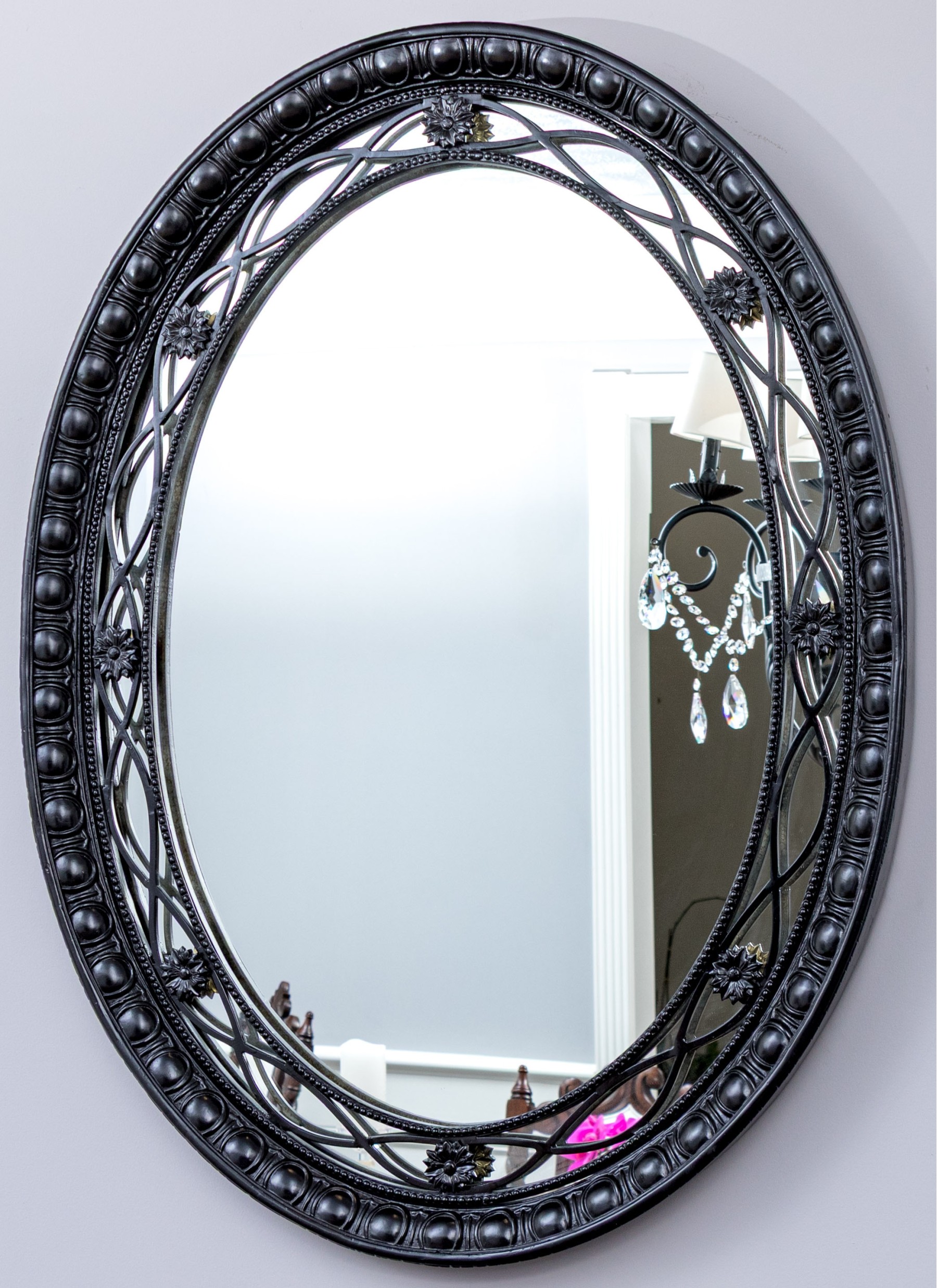 A gorgeous oval mirror in an ornate ebonized frame decorated with petaled relief and an openwork inner overlay of flowers and vines.
