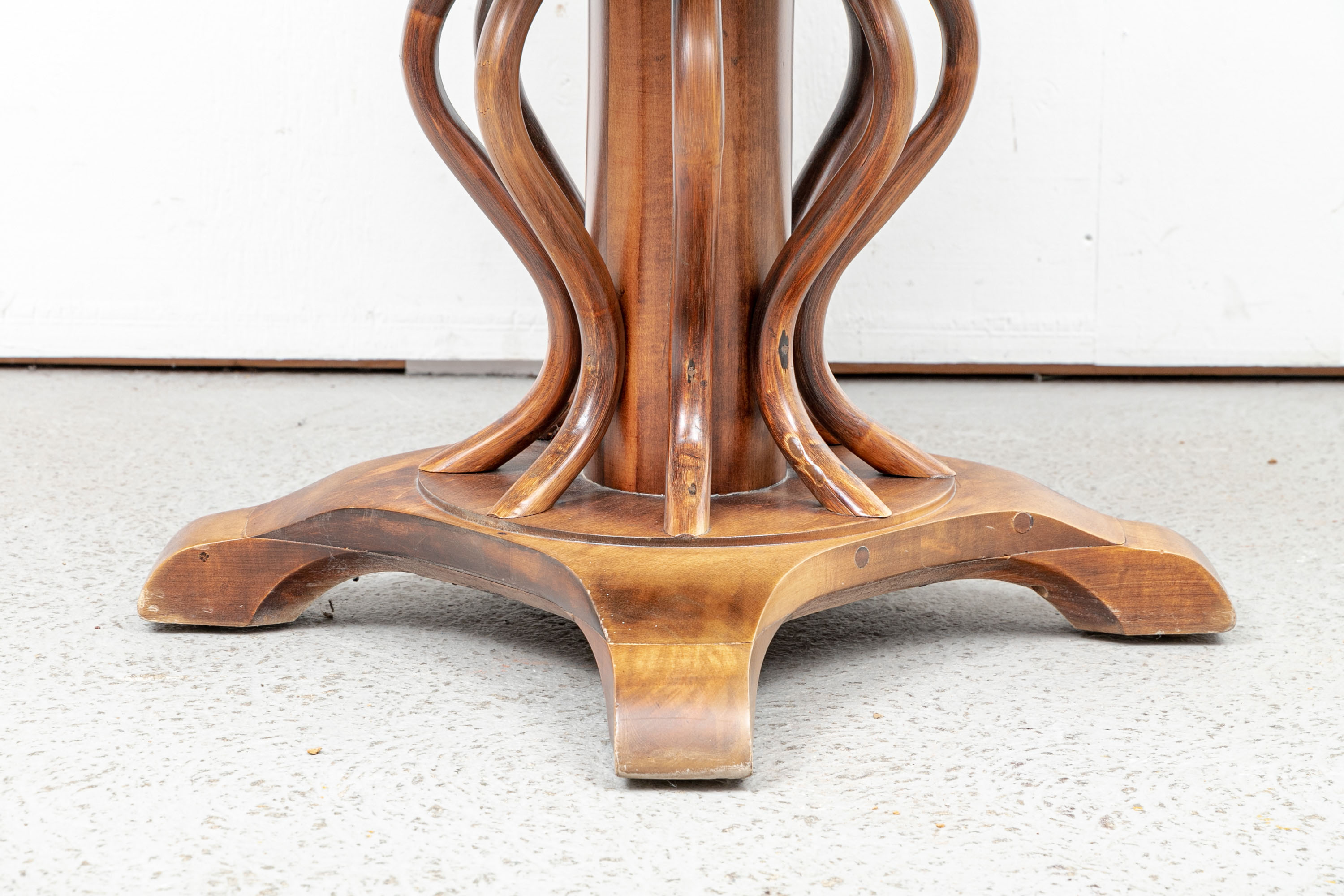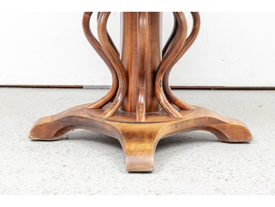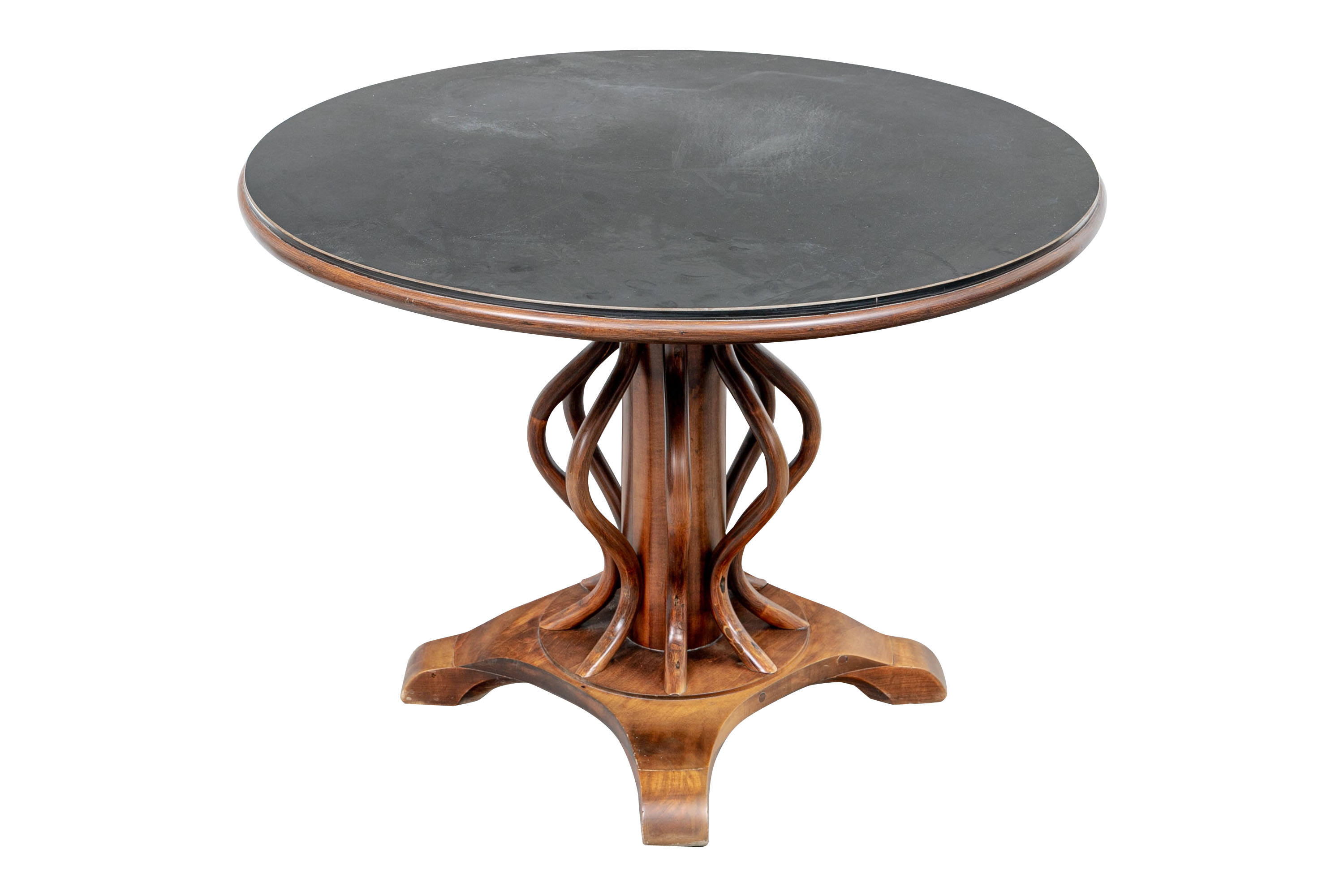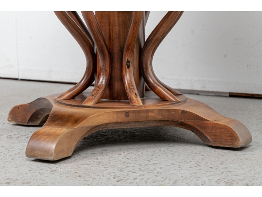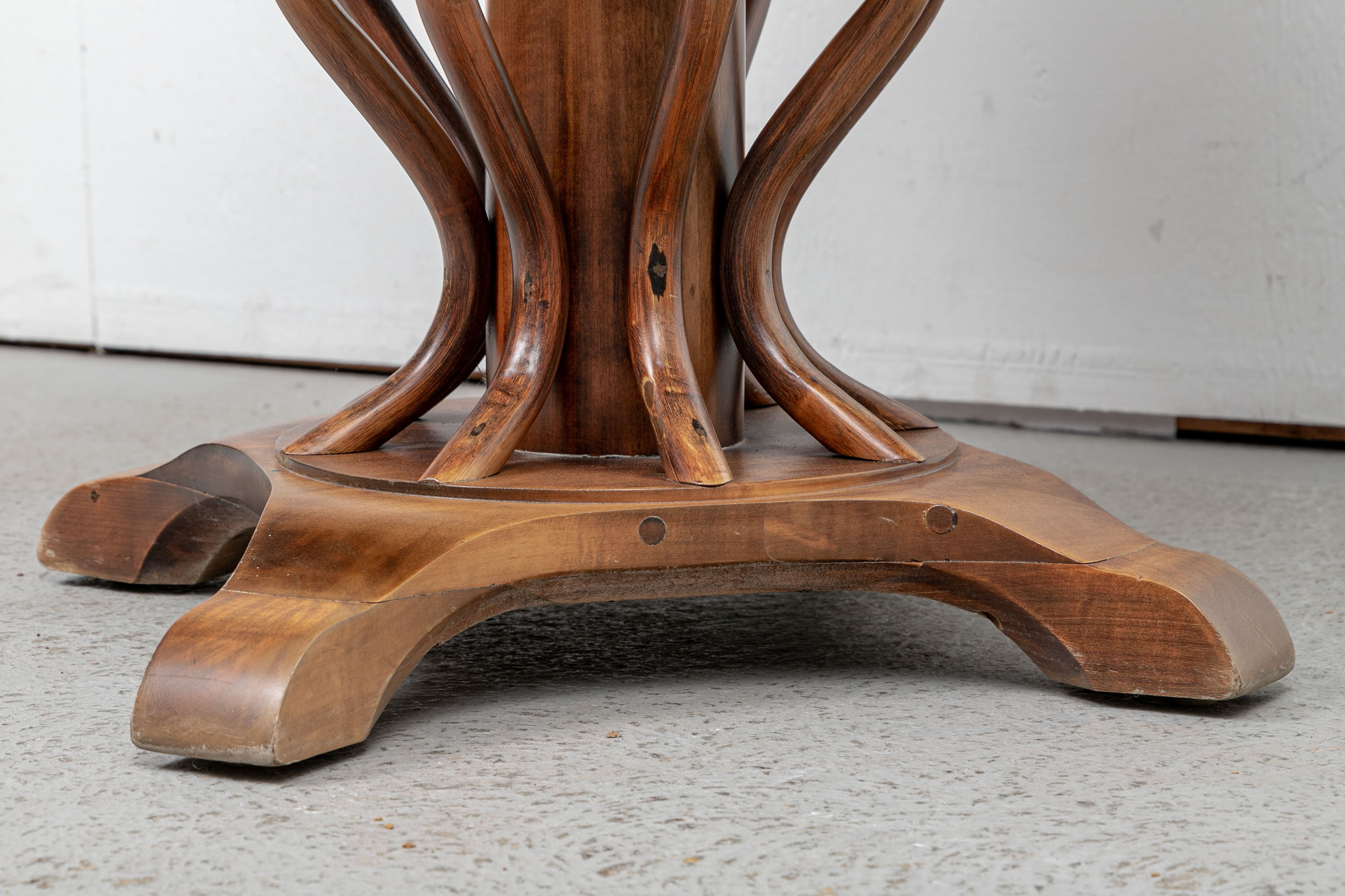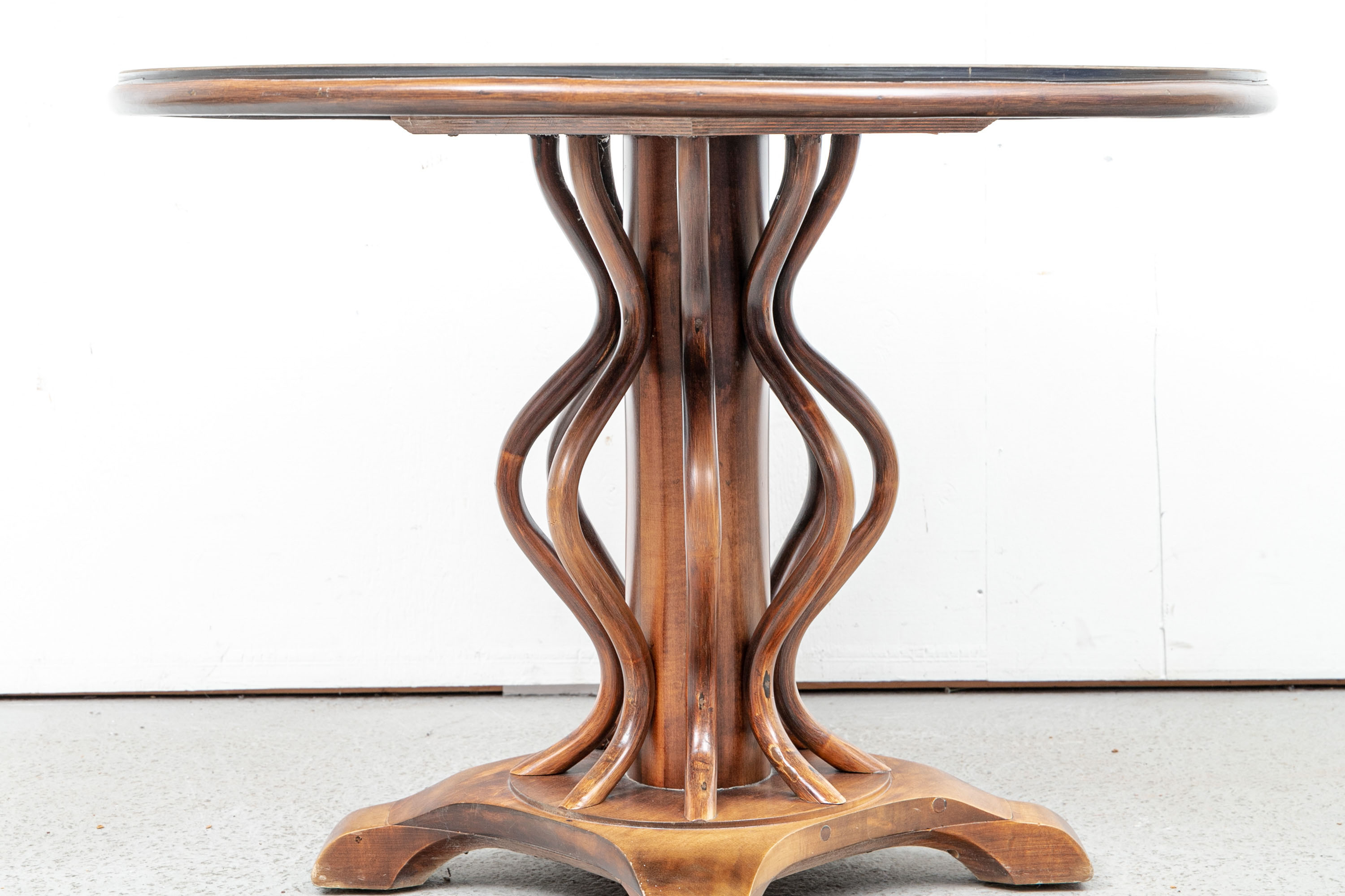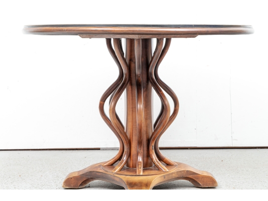 Center table with a bentwood encased pedestal with 8 curved supports resting on a quad footed plinth base. The top surface ebonized with contrasting wood trim.