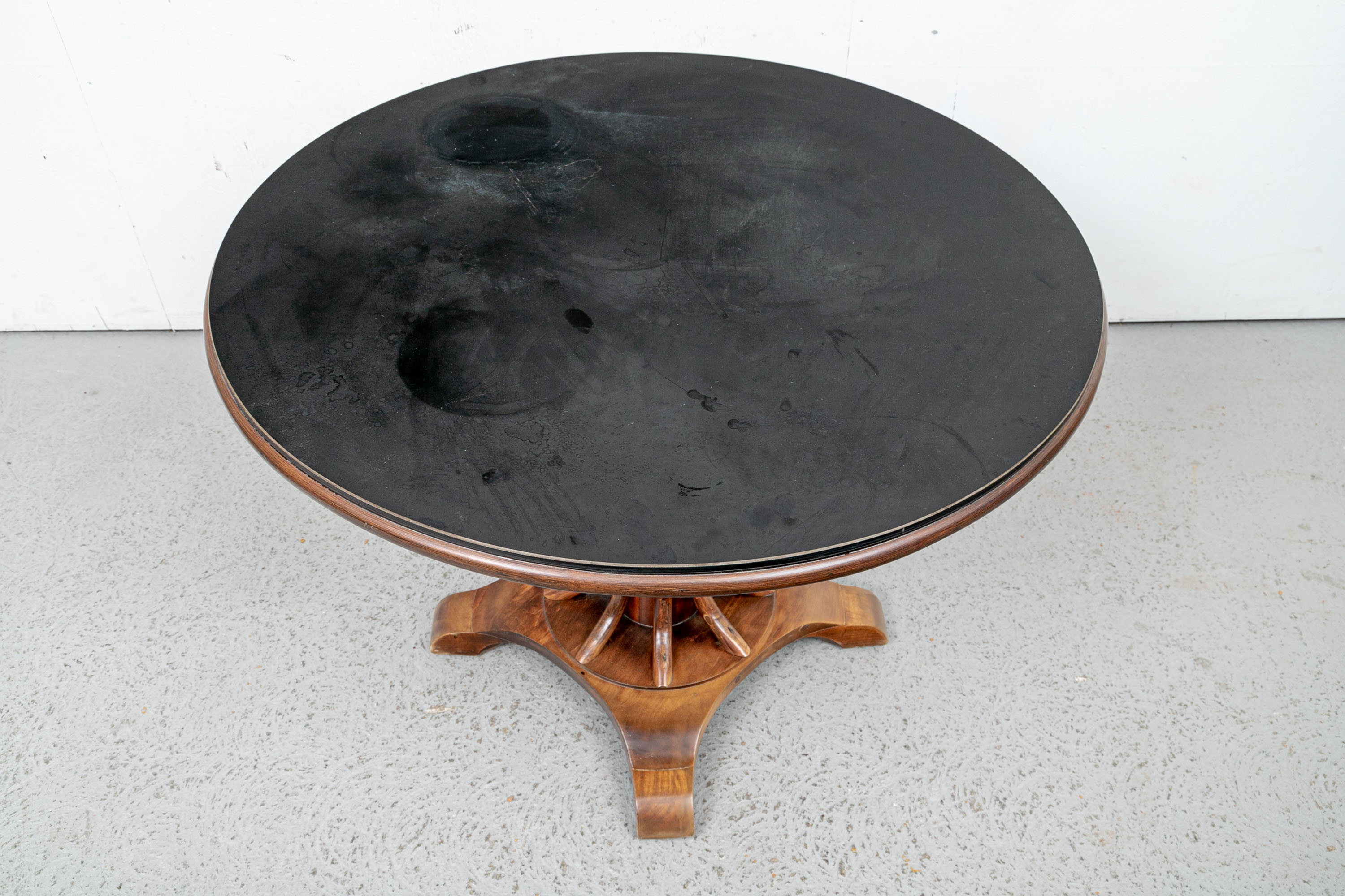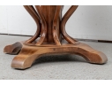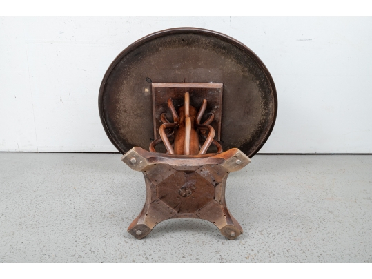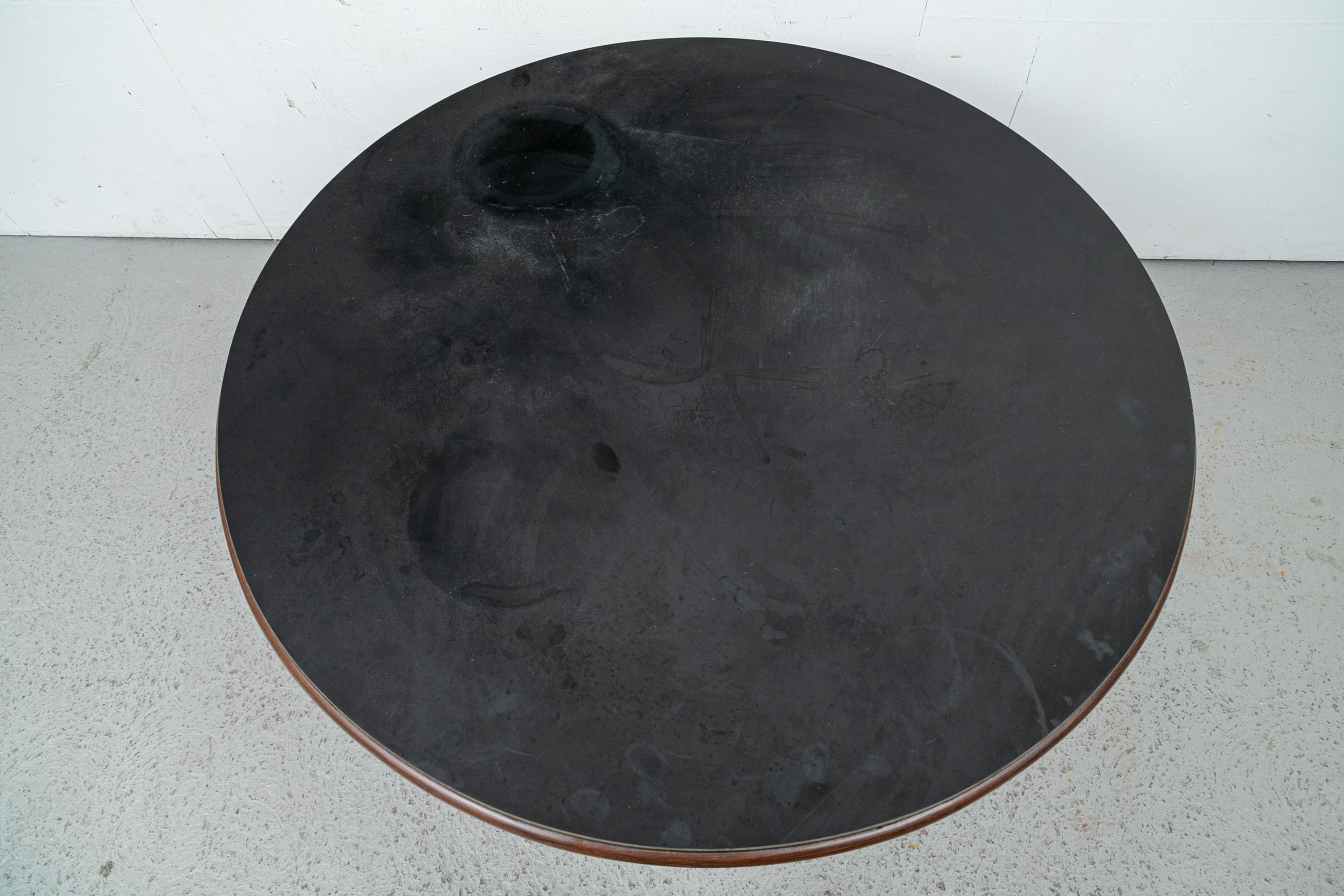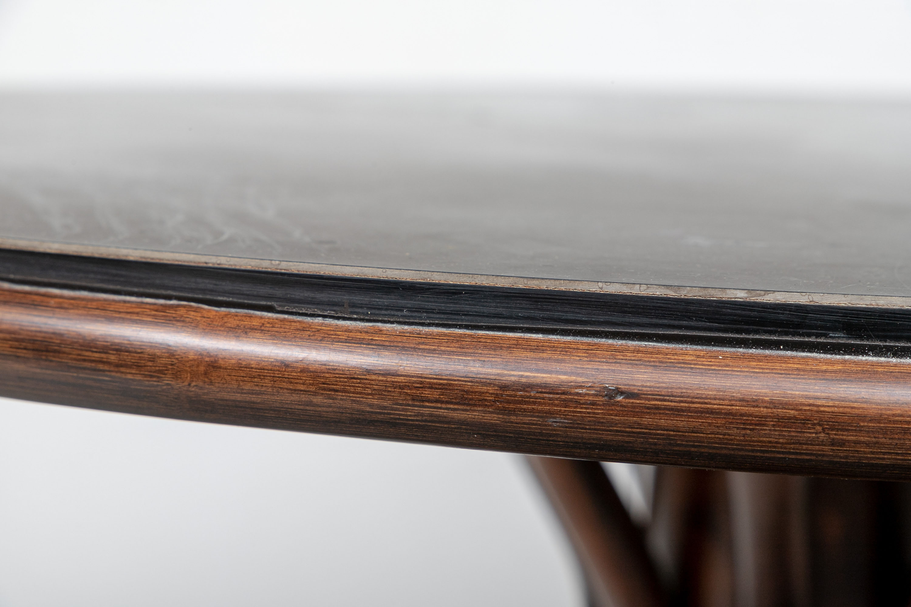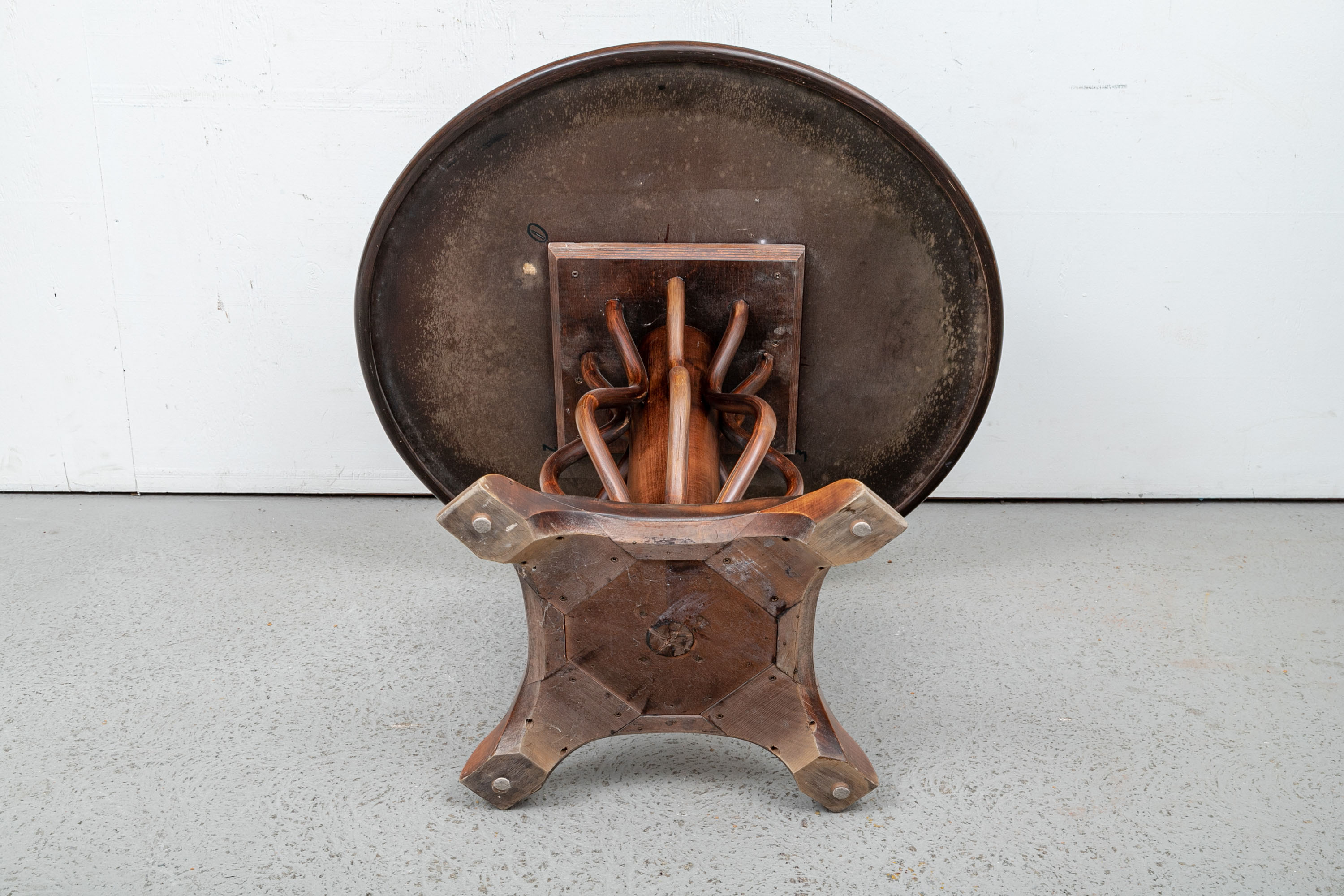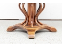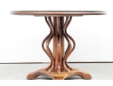 Center table with a bentwood encased pedestal with 8 curved supports resting on a quad footed plinth base. The top surface ebonized with contrasting wood trim.