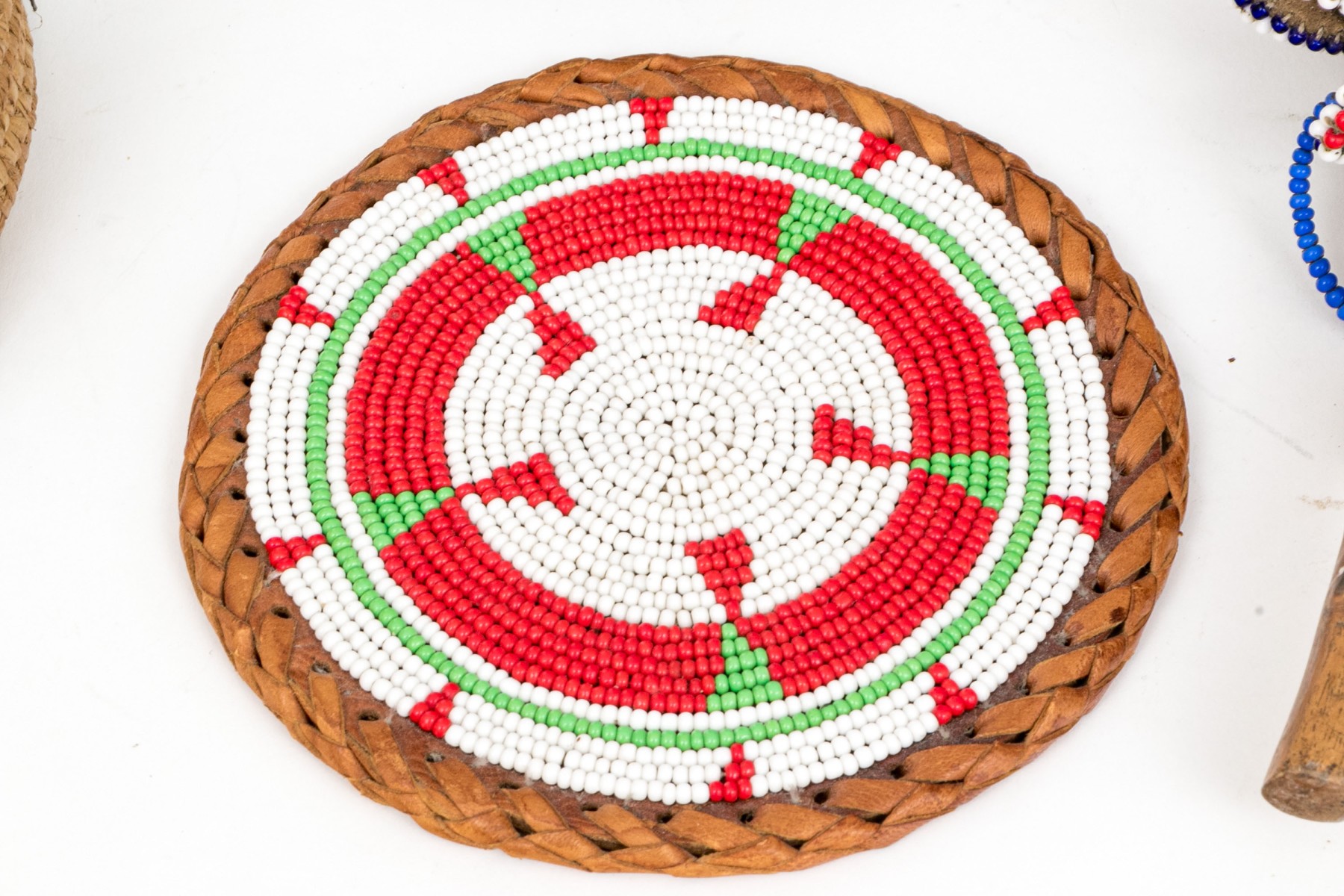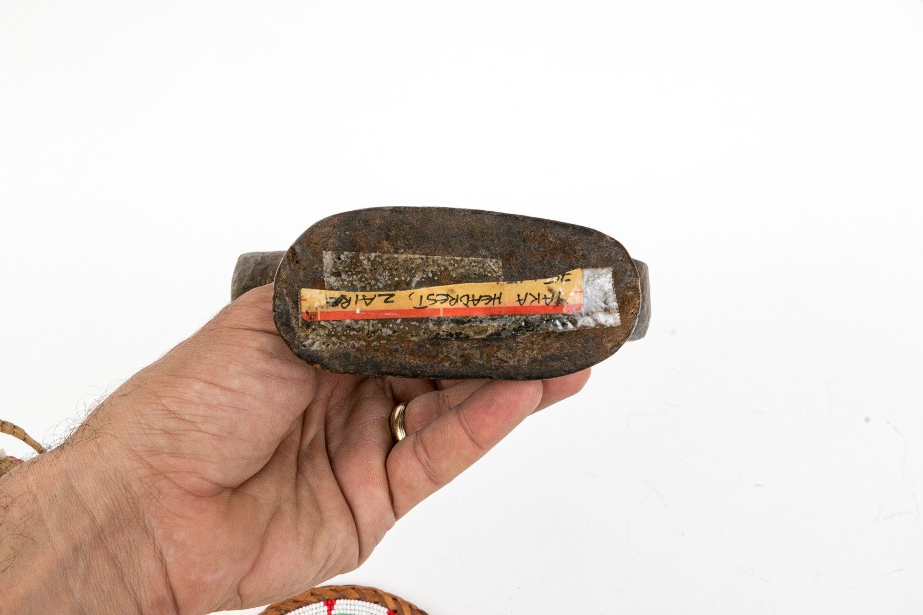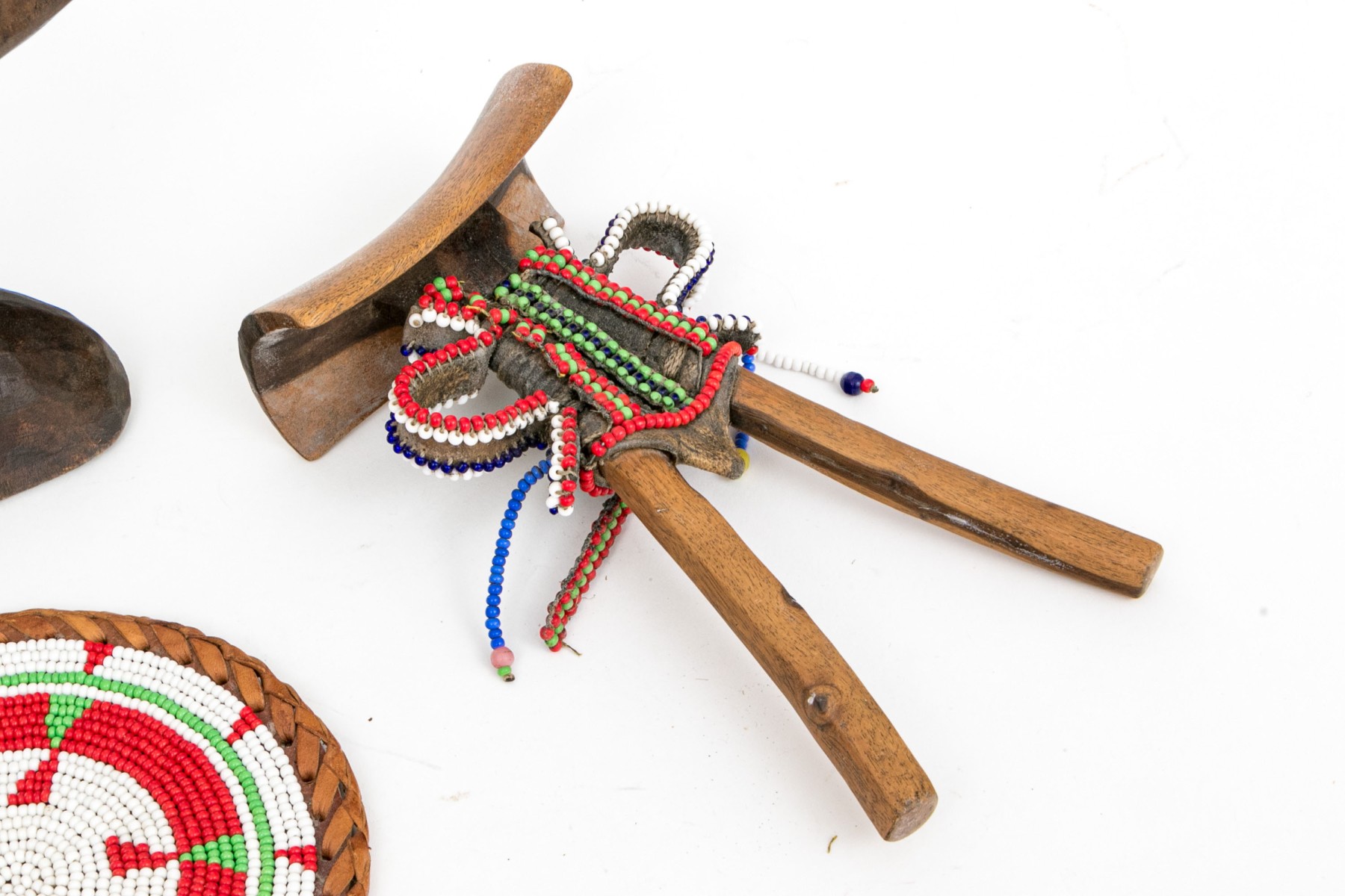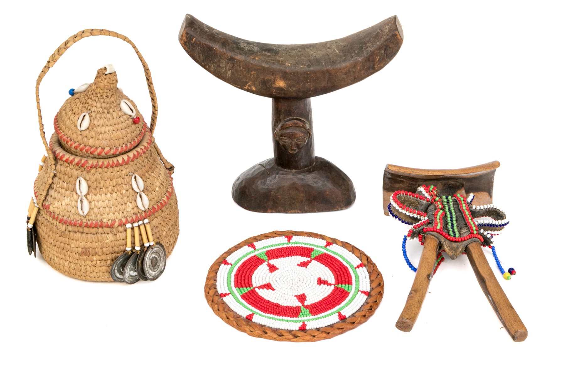 An eclectic assortment comprised of a Chinese style carved wood headrest, a shell embellished lidded vase with handle, and more.