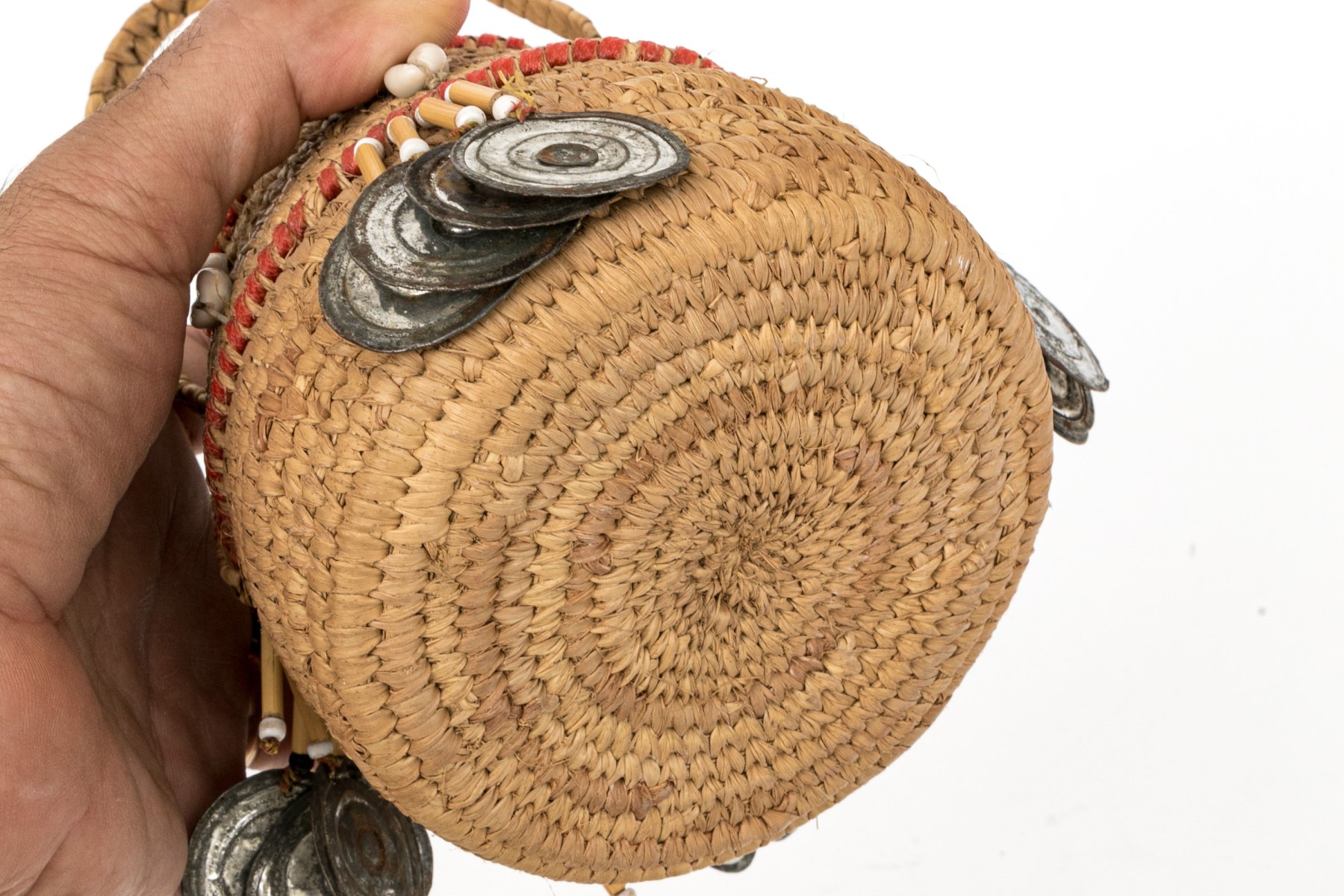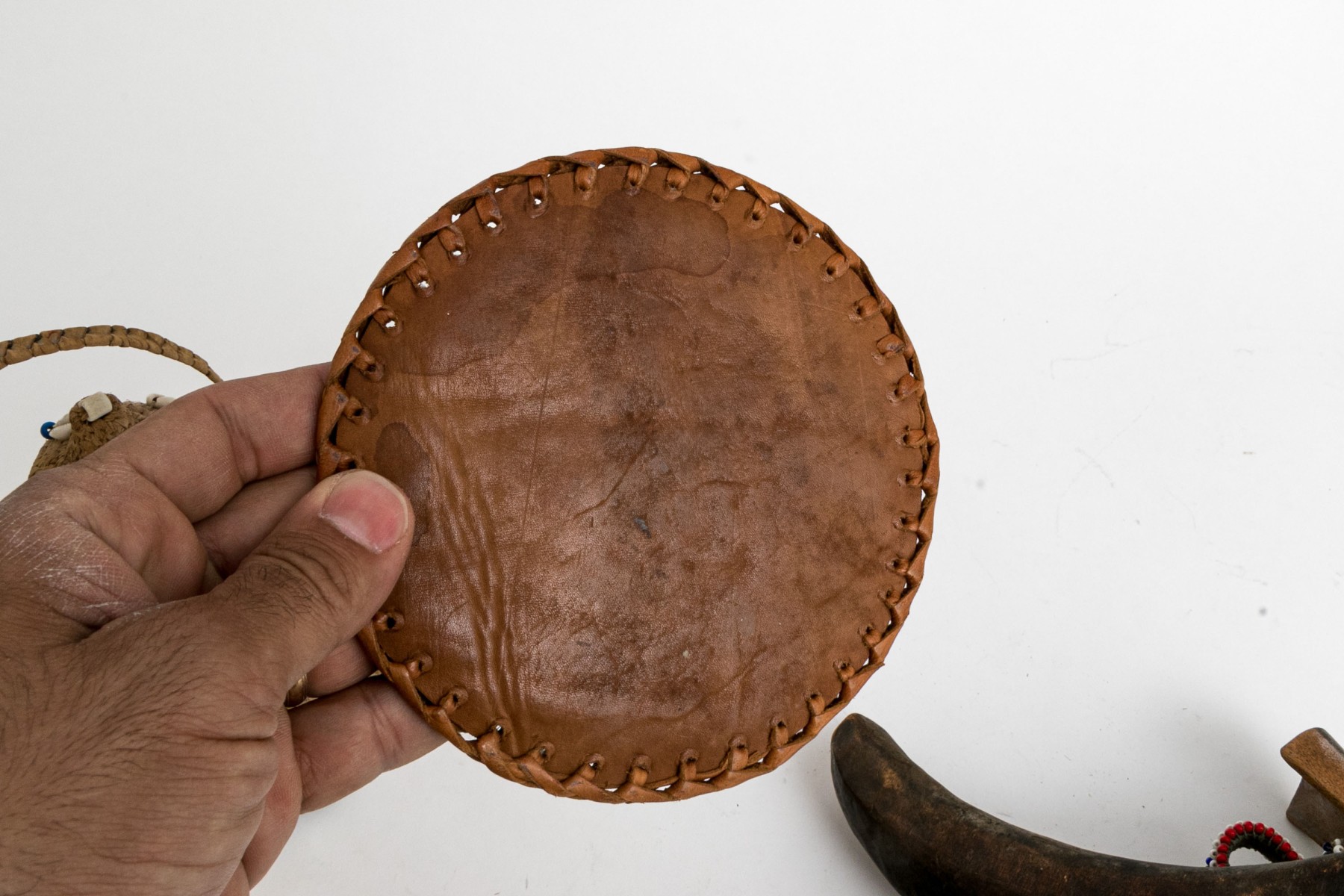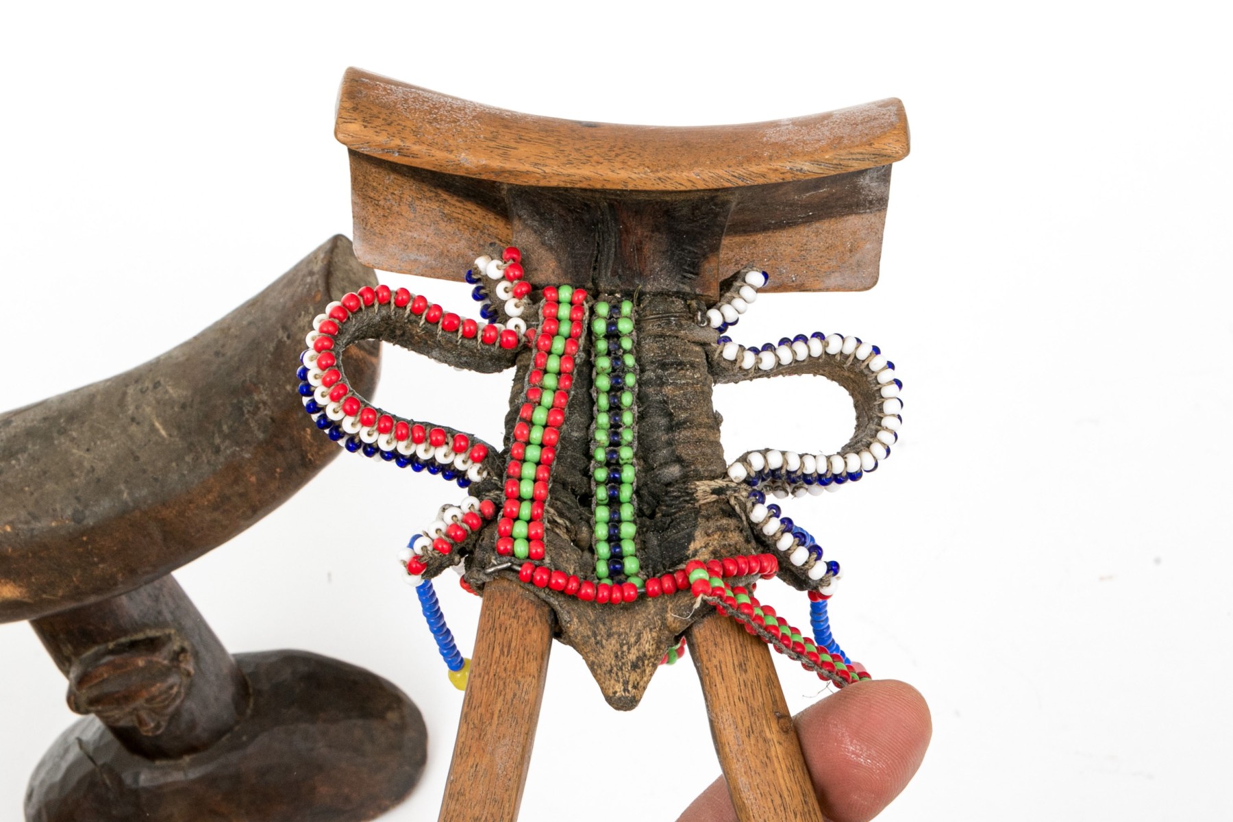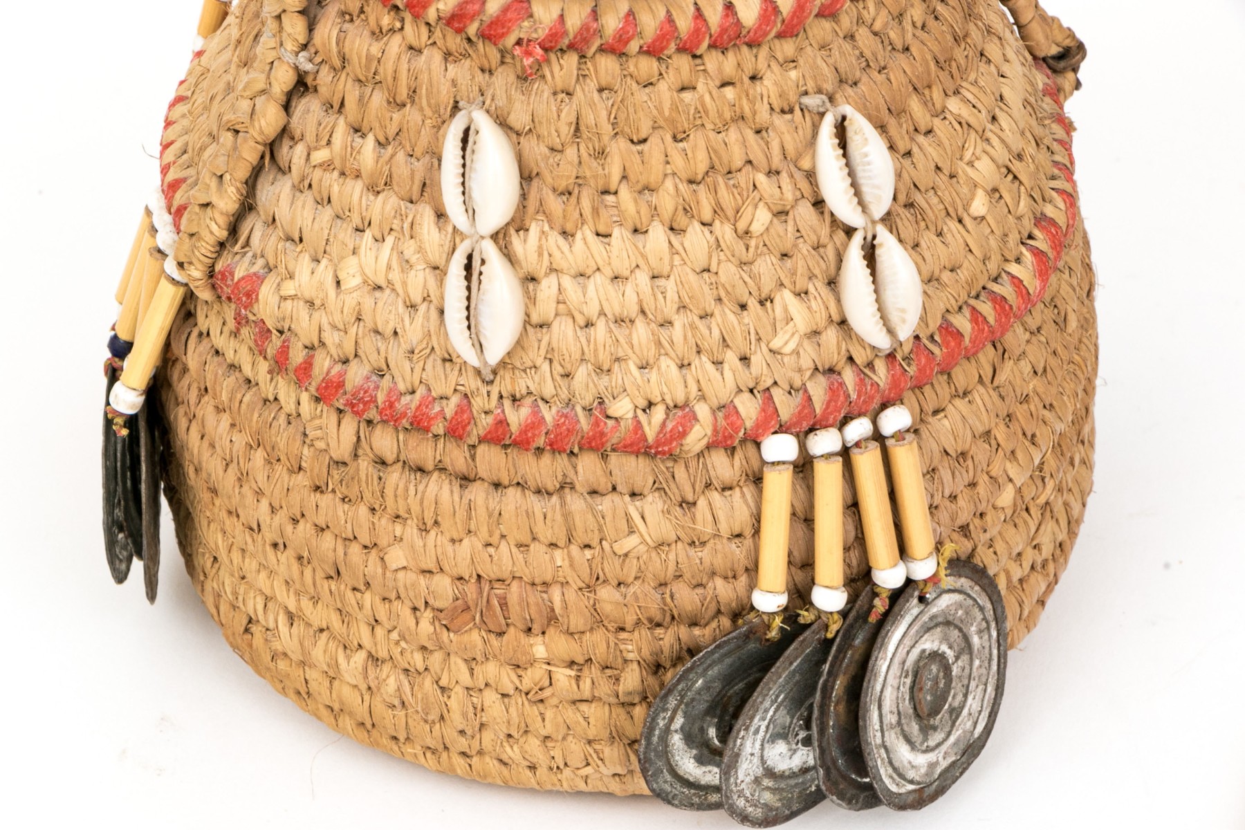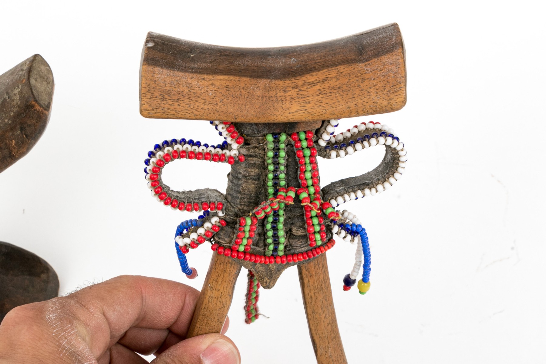 An eclectic assortment comprised of a Chinese style carved wood headrest, a shell embellished lidded vase with handle, and more.
