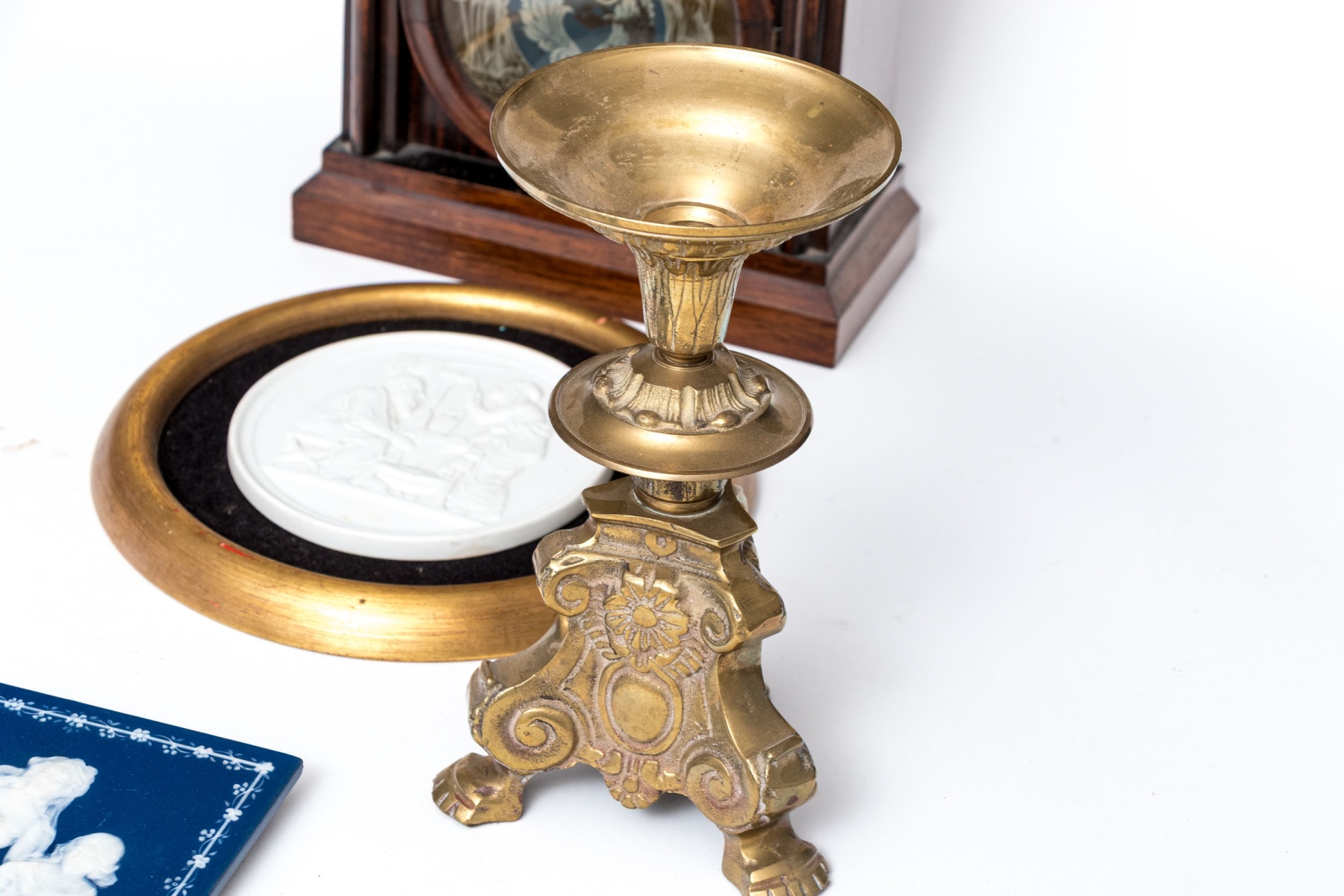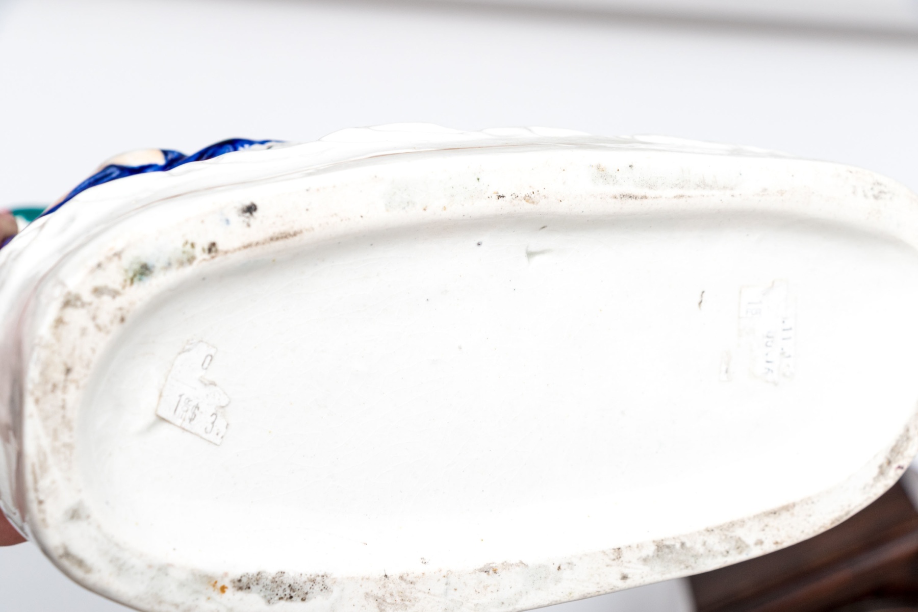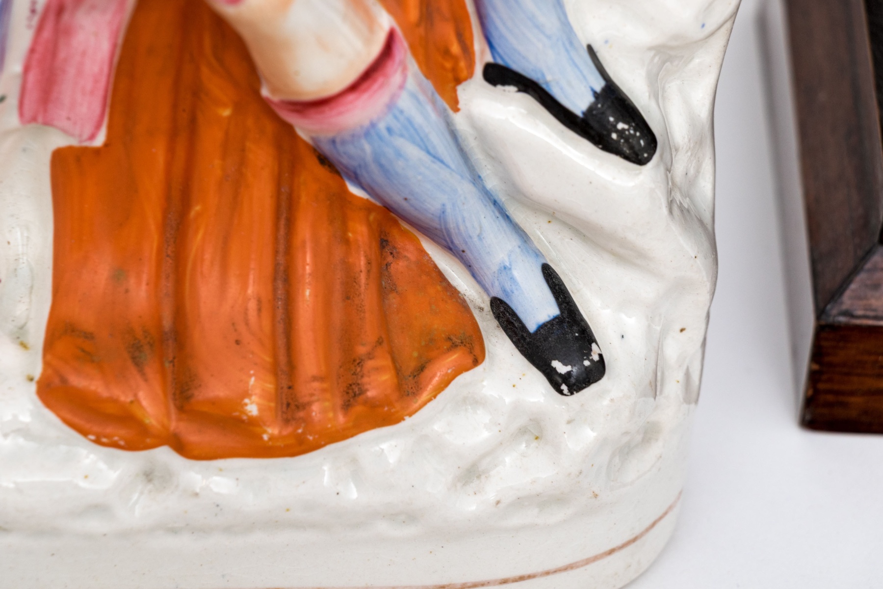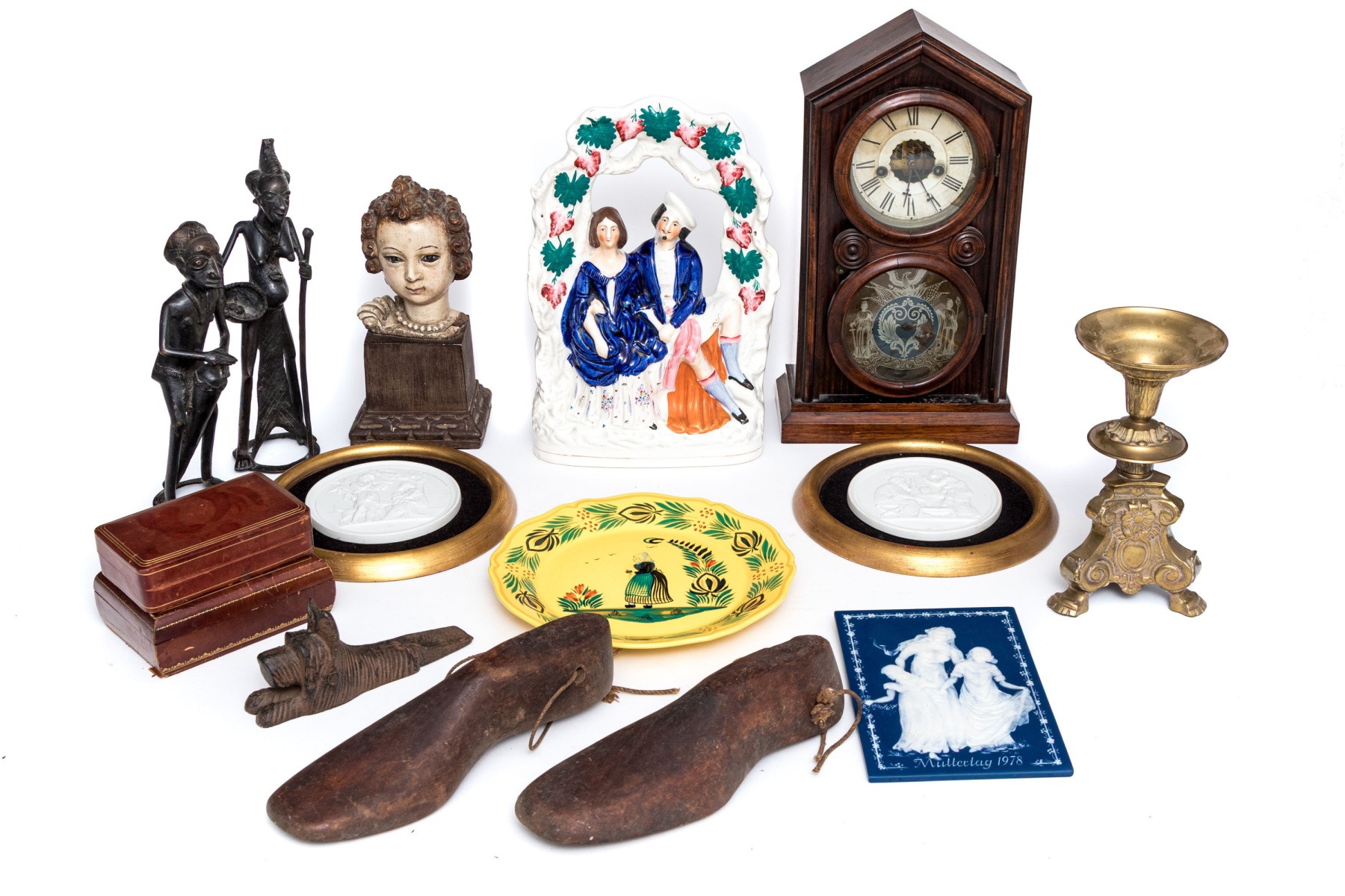 Comprised of a Quimper ceramic plate, Staffordshire fairing depicting a couple under archway, mantel clock, bust, carved wood shoe forms, and more.