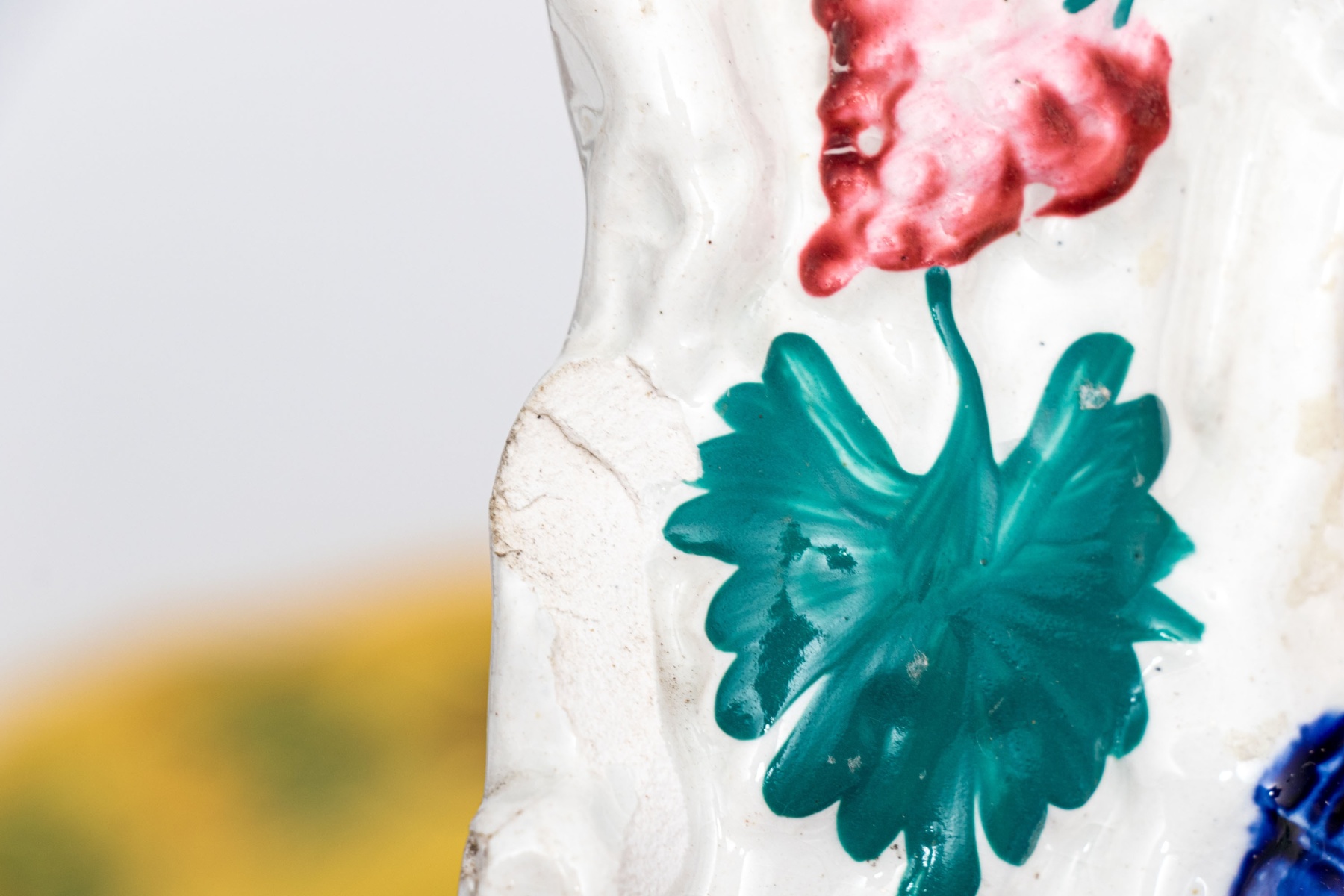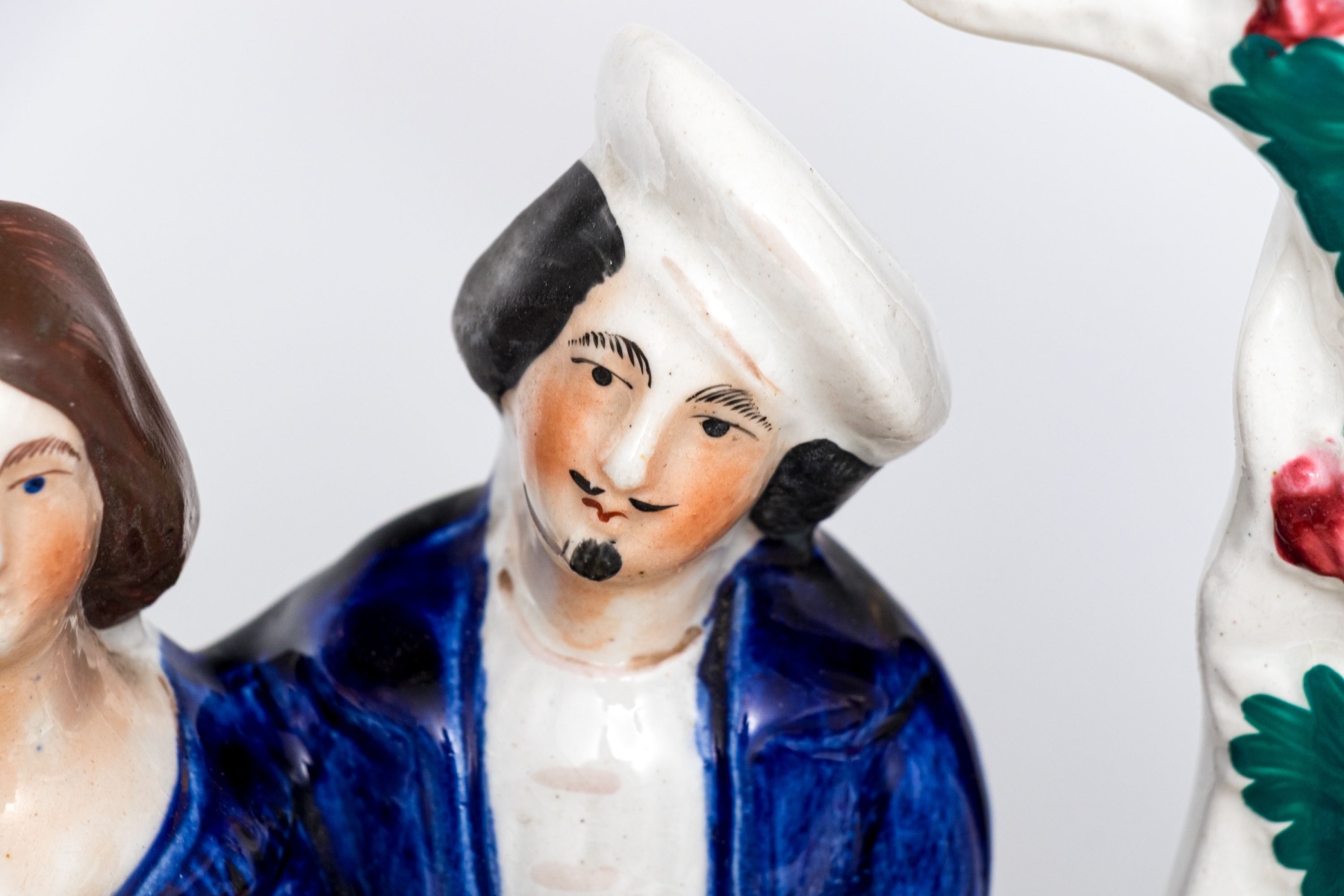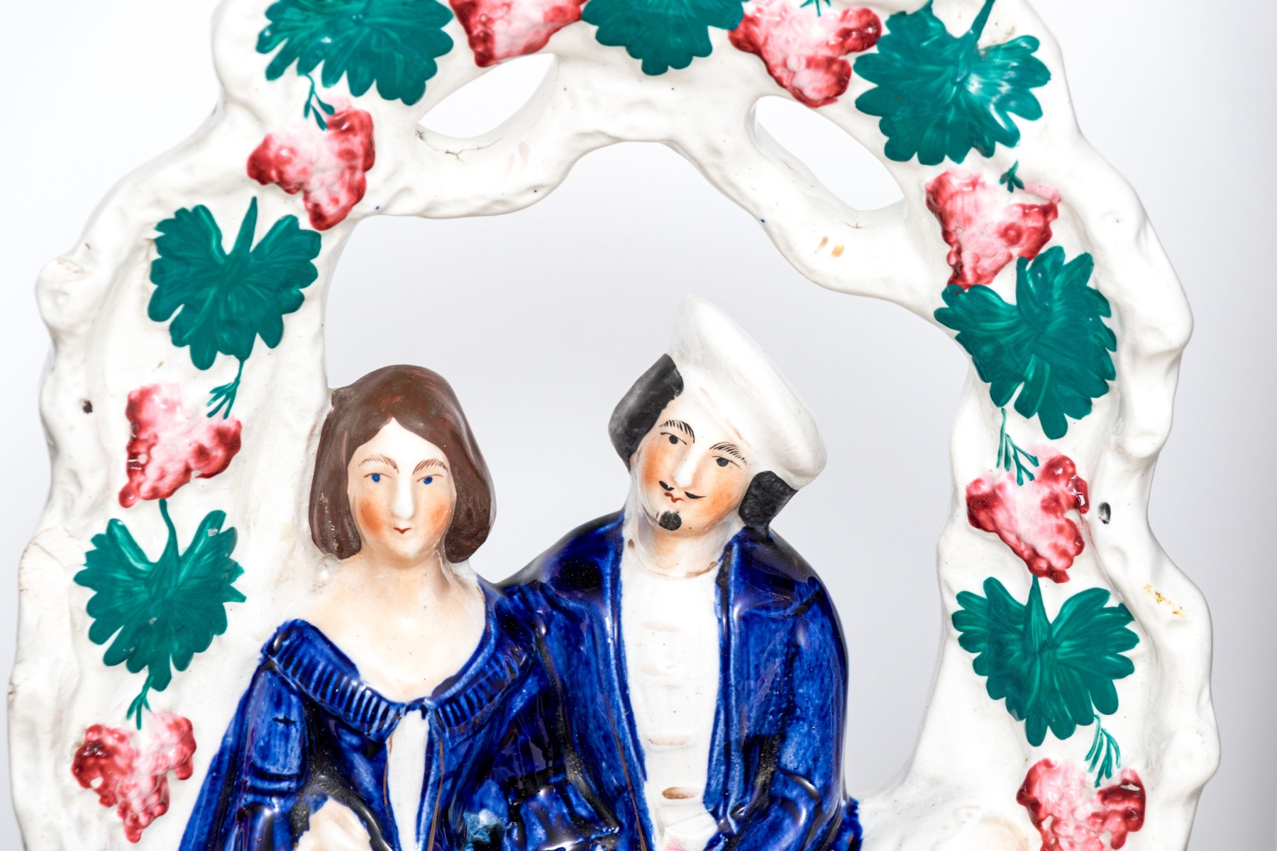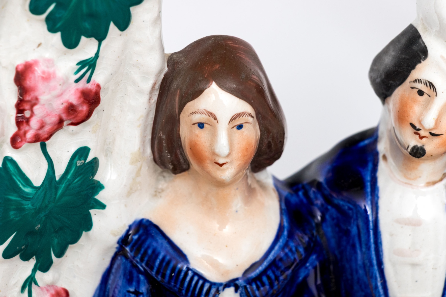 Comprised of a Quimper ceramic plate, Staffordshire fairing depicting a couple under archway, mantel clock, bust, carved wood shoe forms, and more.