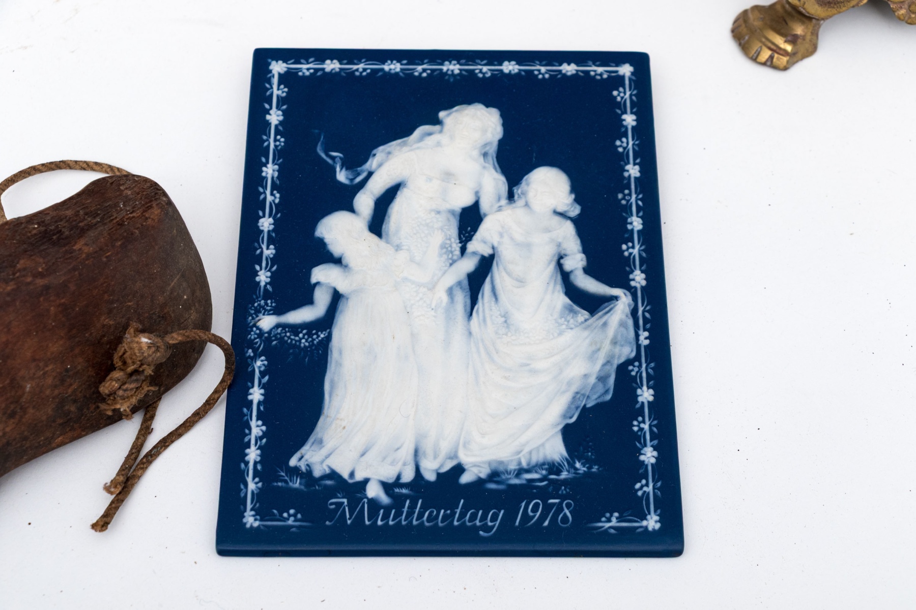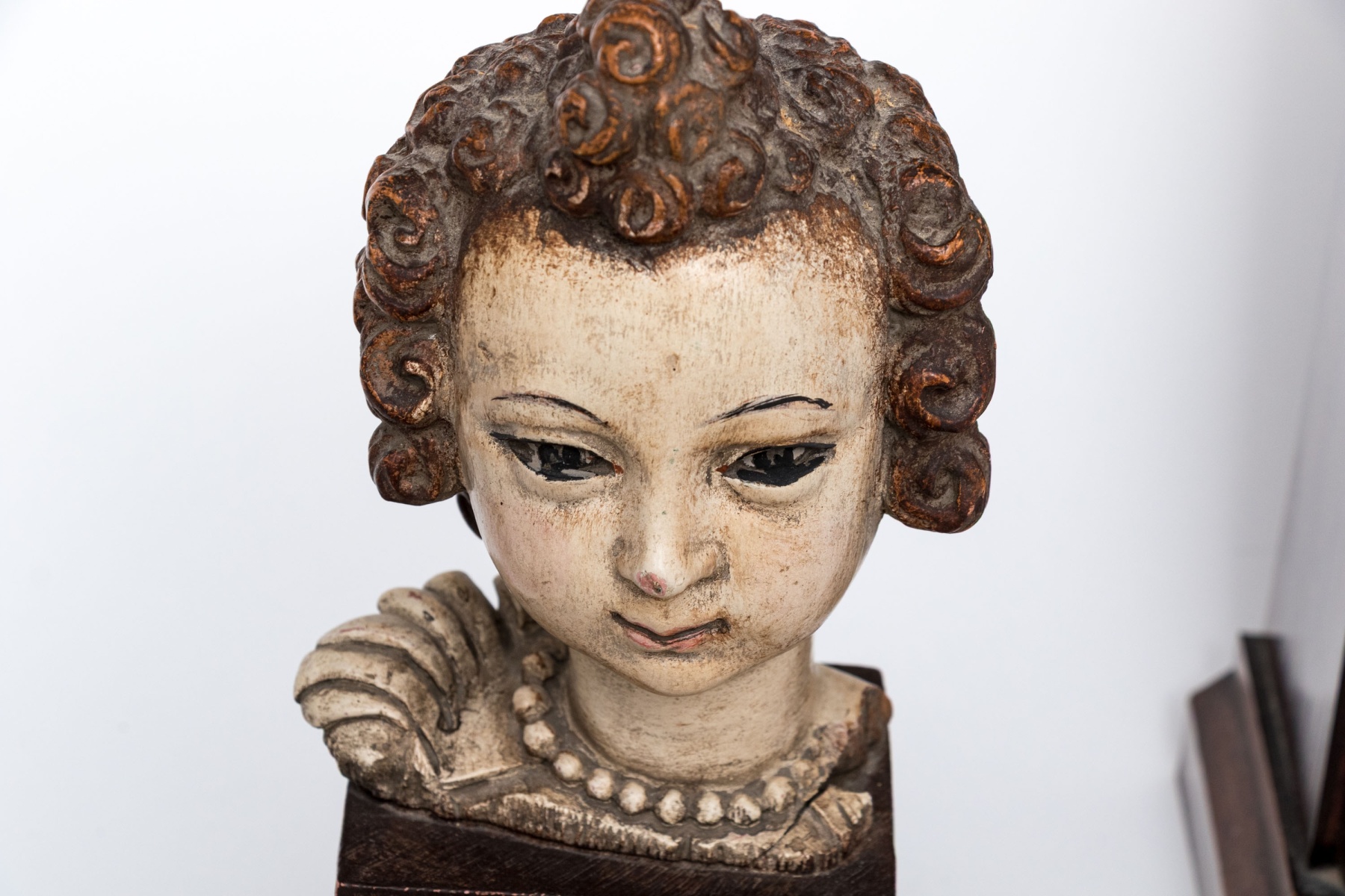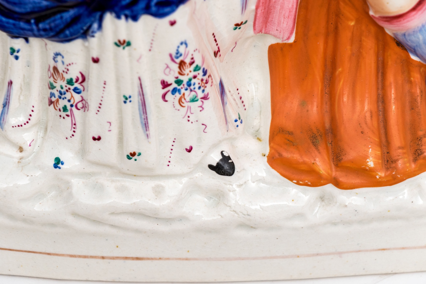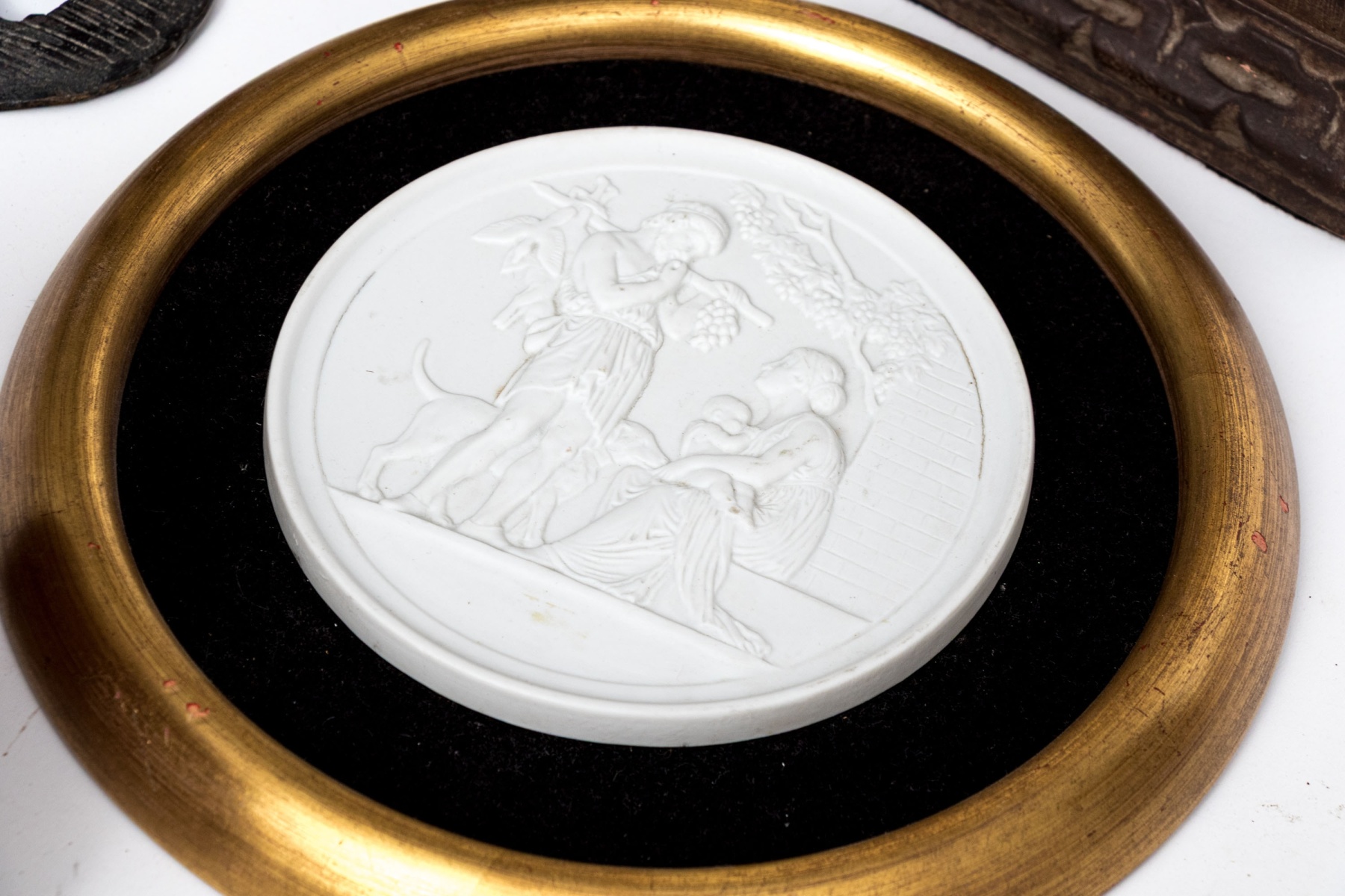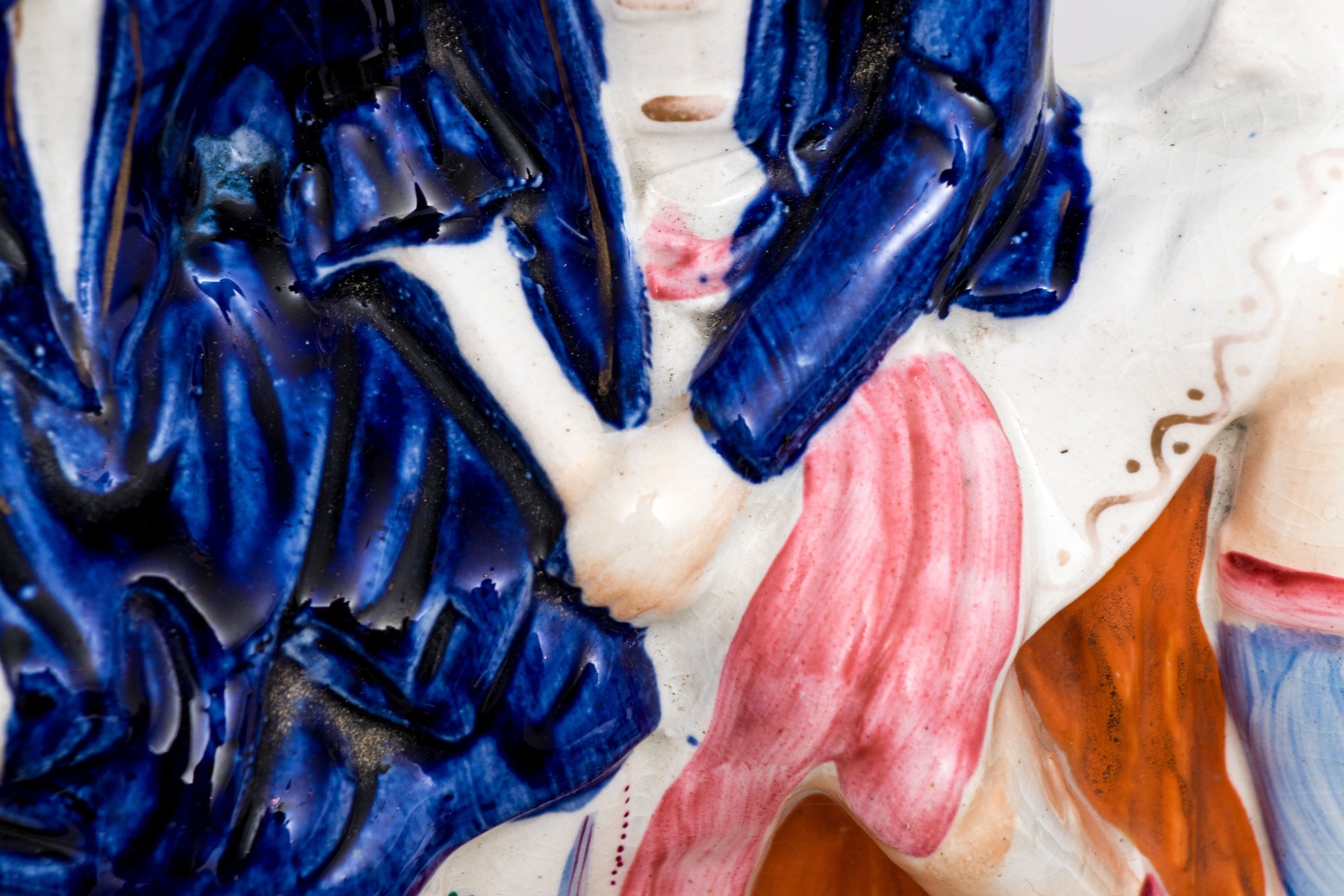 Comprised of a Quimper ceramic plate, Staffordshire fairing depicting a couple under archway, mantel clock, bust, carved wood shoe forms, and more.