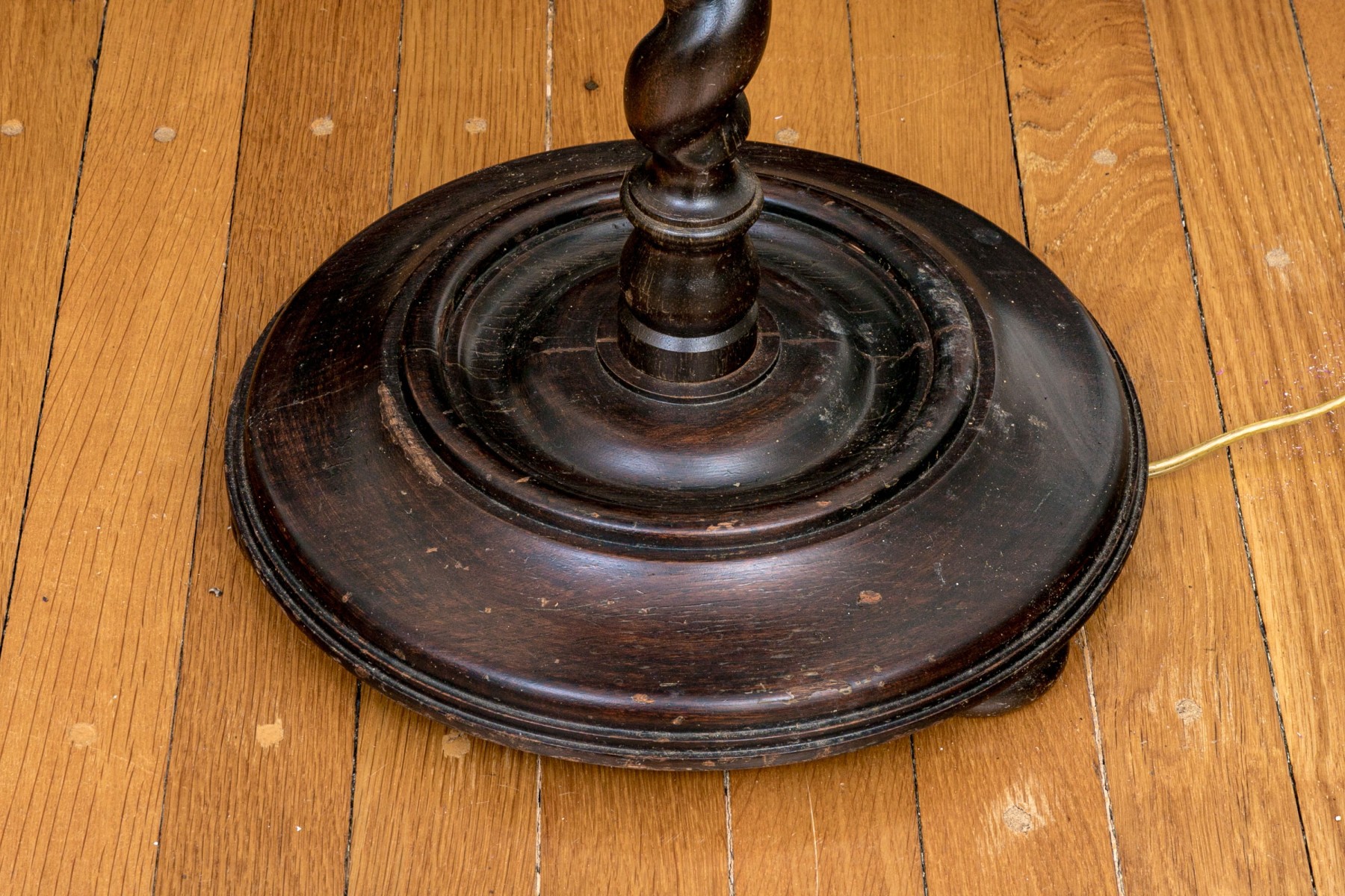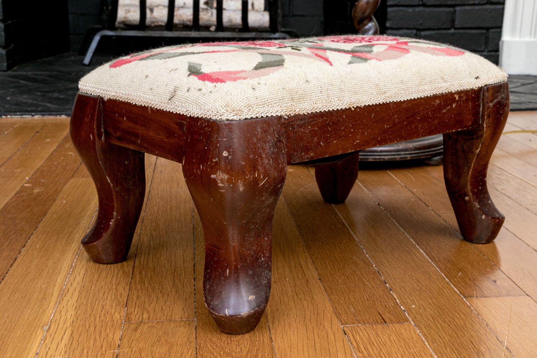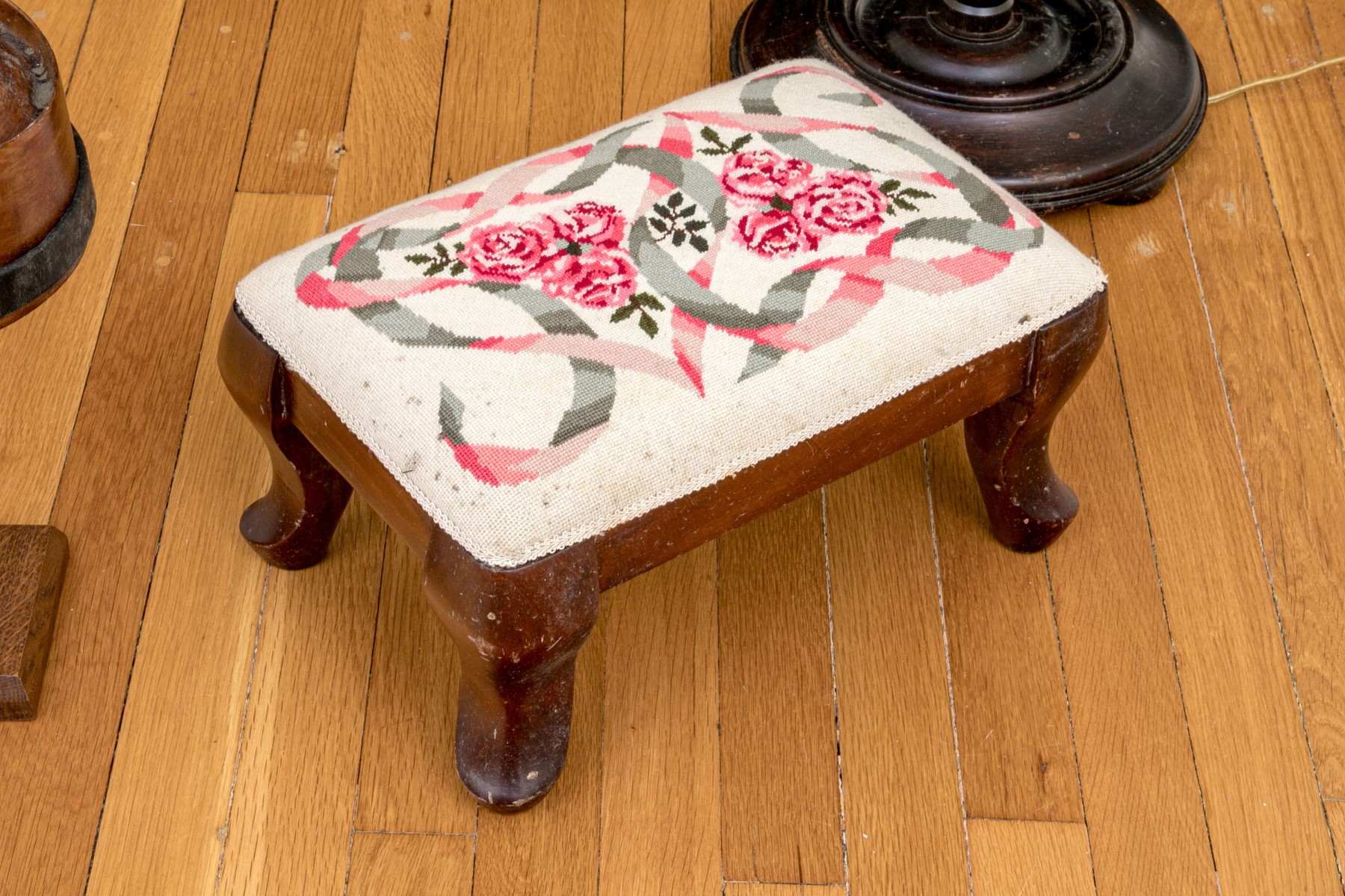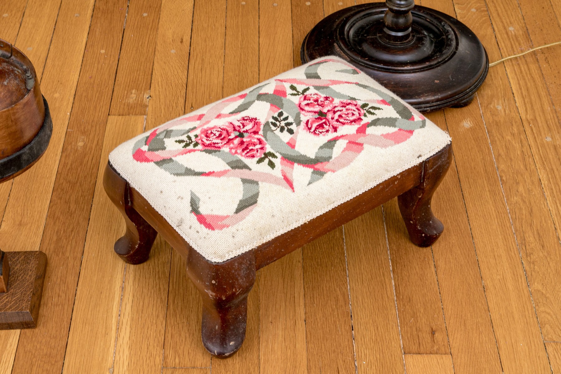 Comprised of a lovely needle point upholstered footstool, together with a Jacobean style barley twist floor lamp along with a carved, mixed media hatstand.