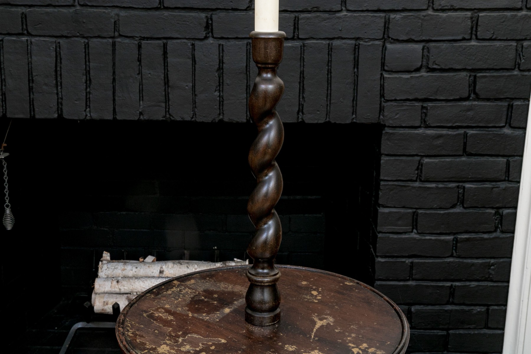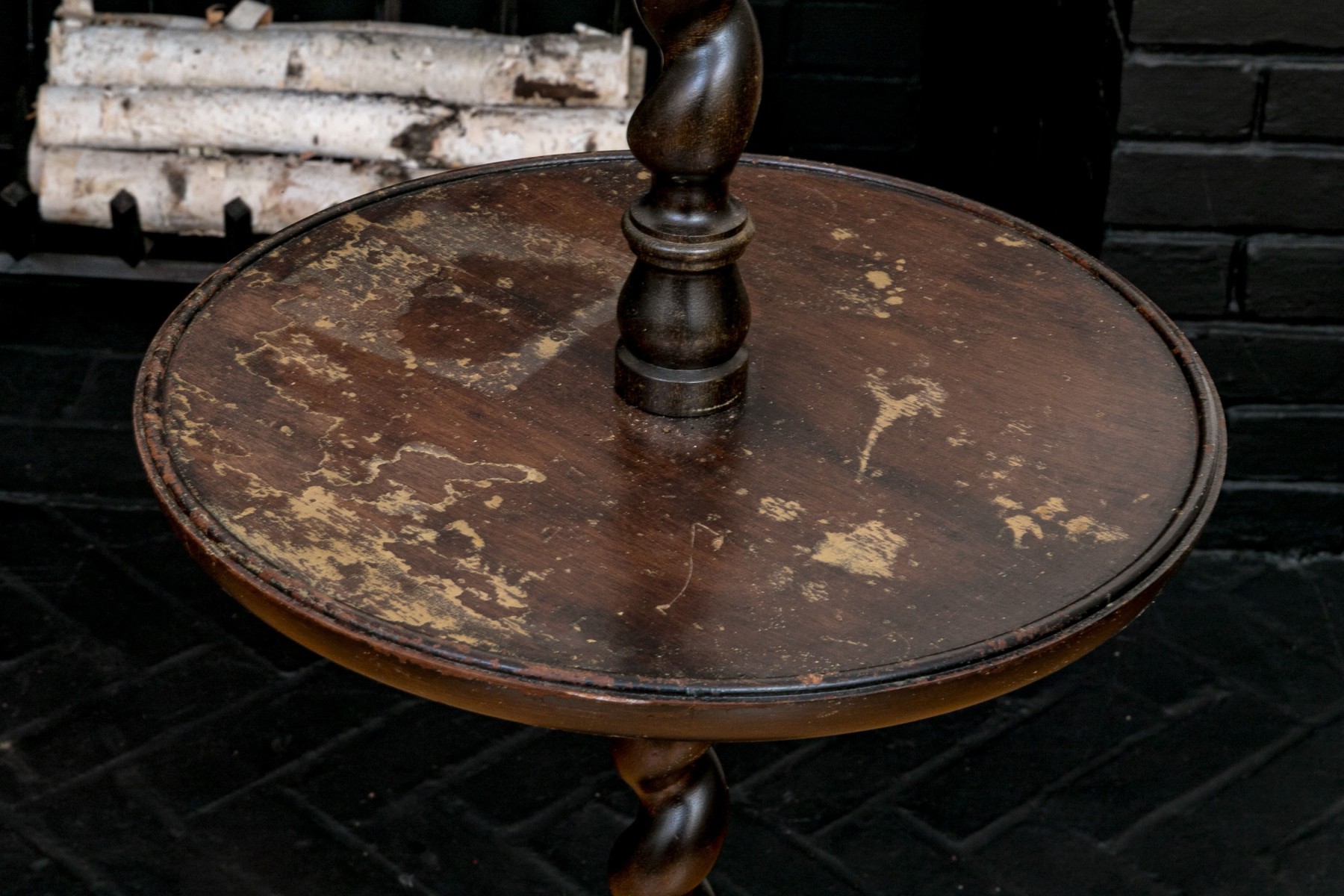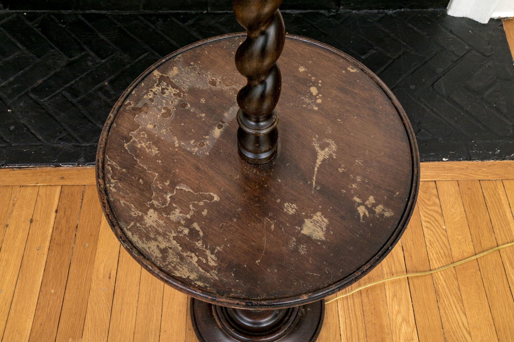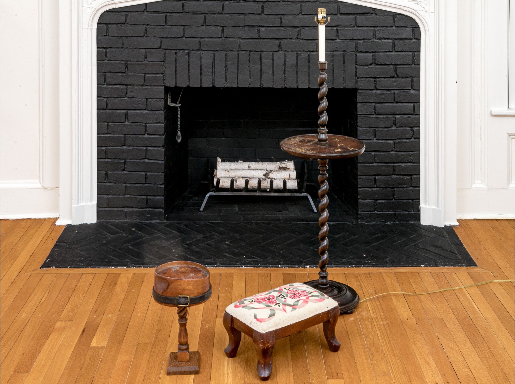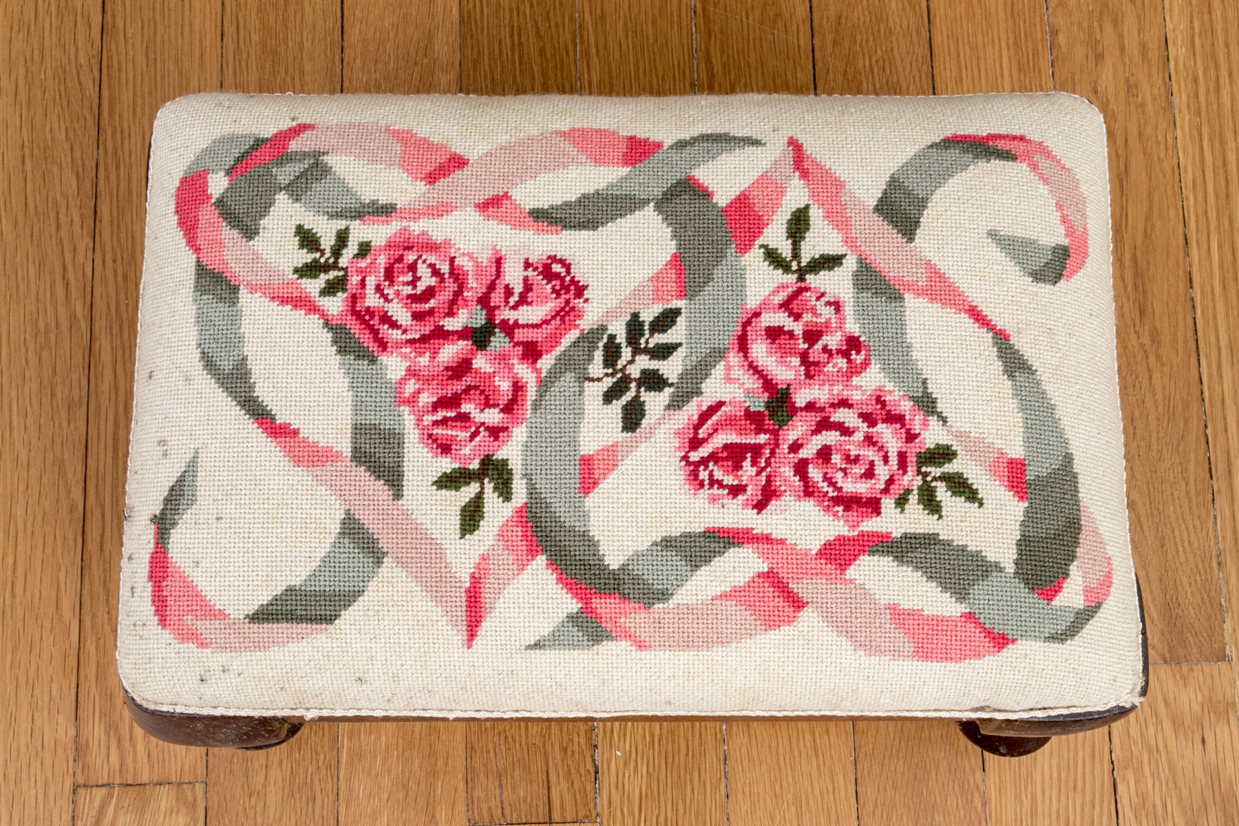 Comprised of a lovely needle point upholstered footstool, together with a Jacobean style barley twist floor lamp along with a carved, mixed media hatstand.