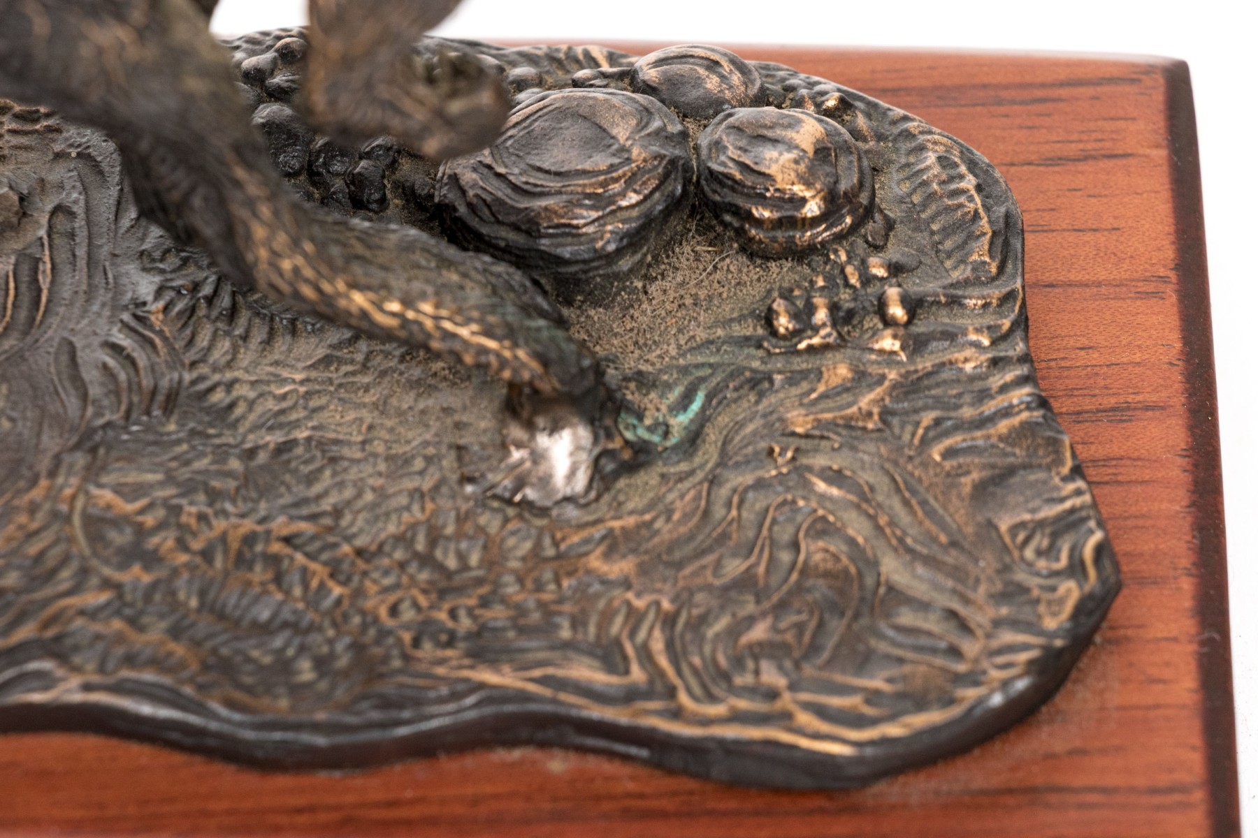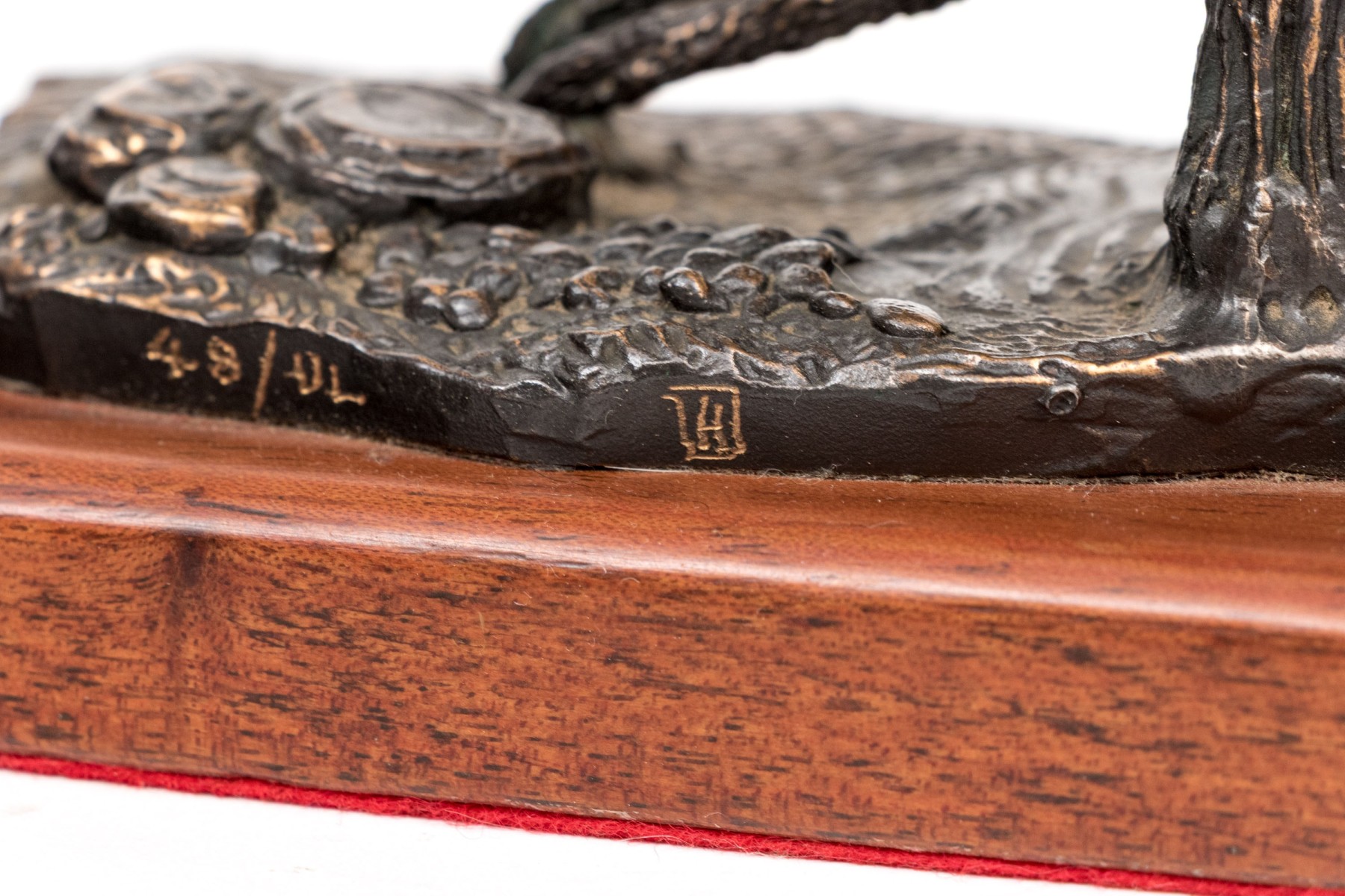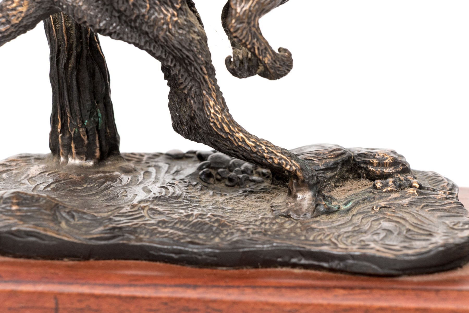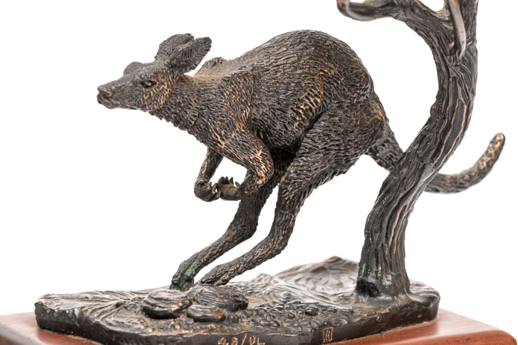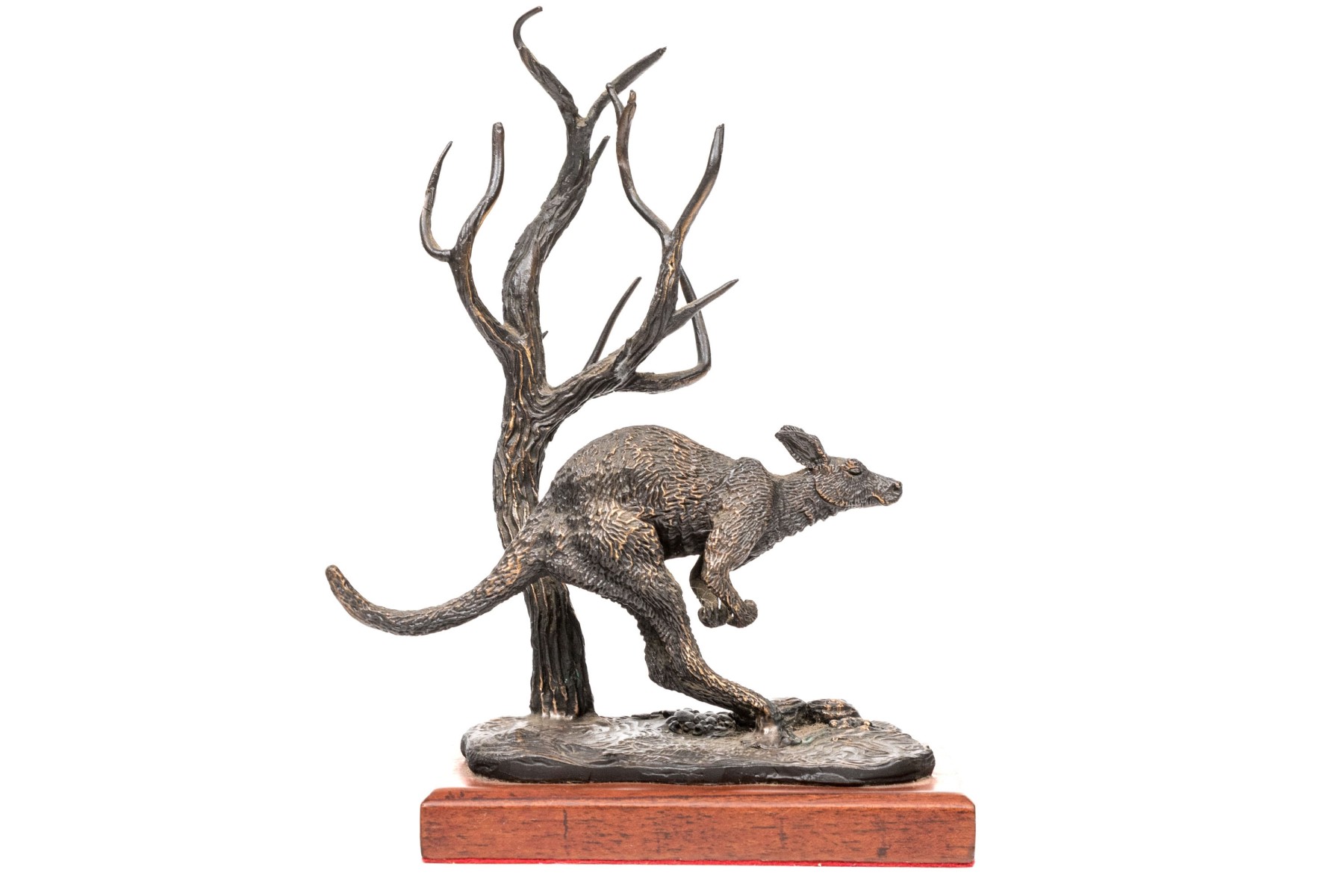 Eddie Hackman (Australian, b. 1933) bronze sculpture depicting a kangaroo great texture throughout the fur. The kangaroo poses mid-jump next to a bare branched tree along a naturalistic ground, mounted to an orange-brown rectangular wood base lined with red felt underfoot. Marked 49/DL with an insignia to the left trim of sculpture above base.