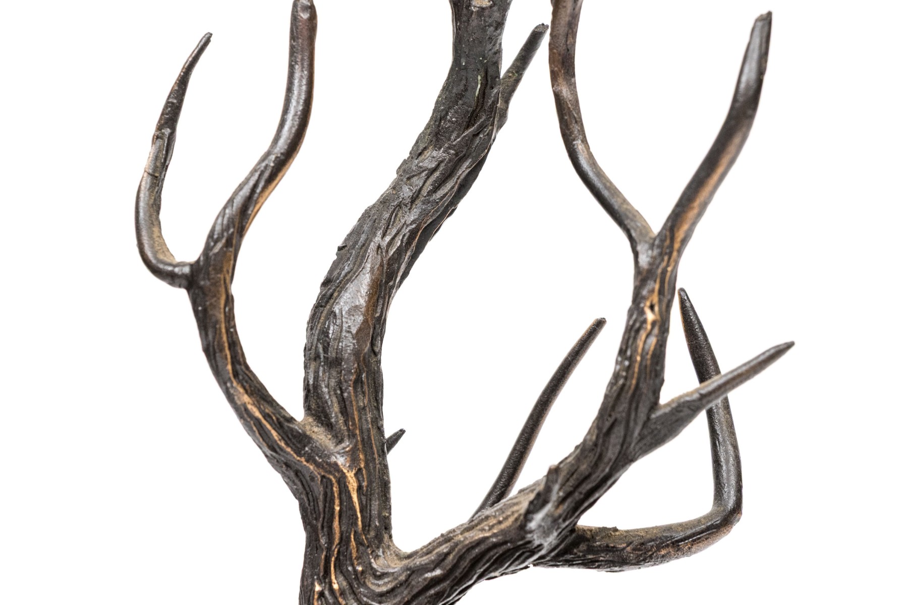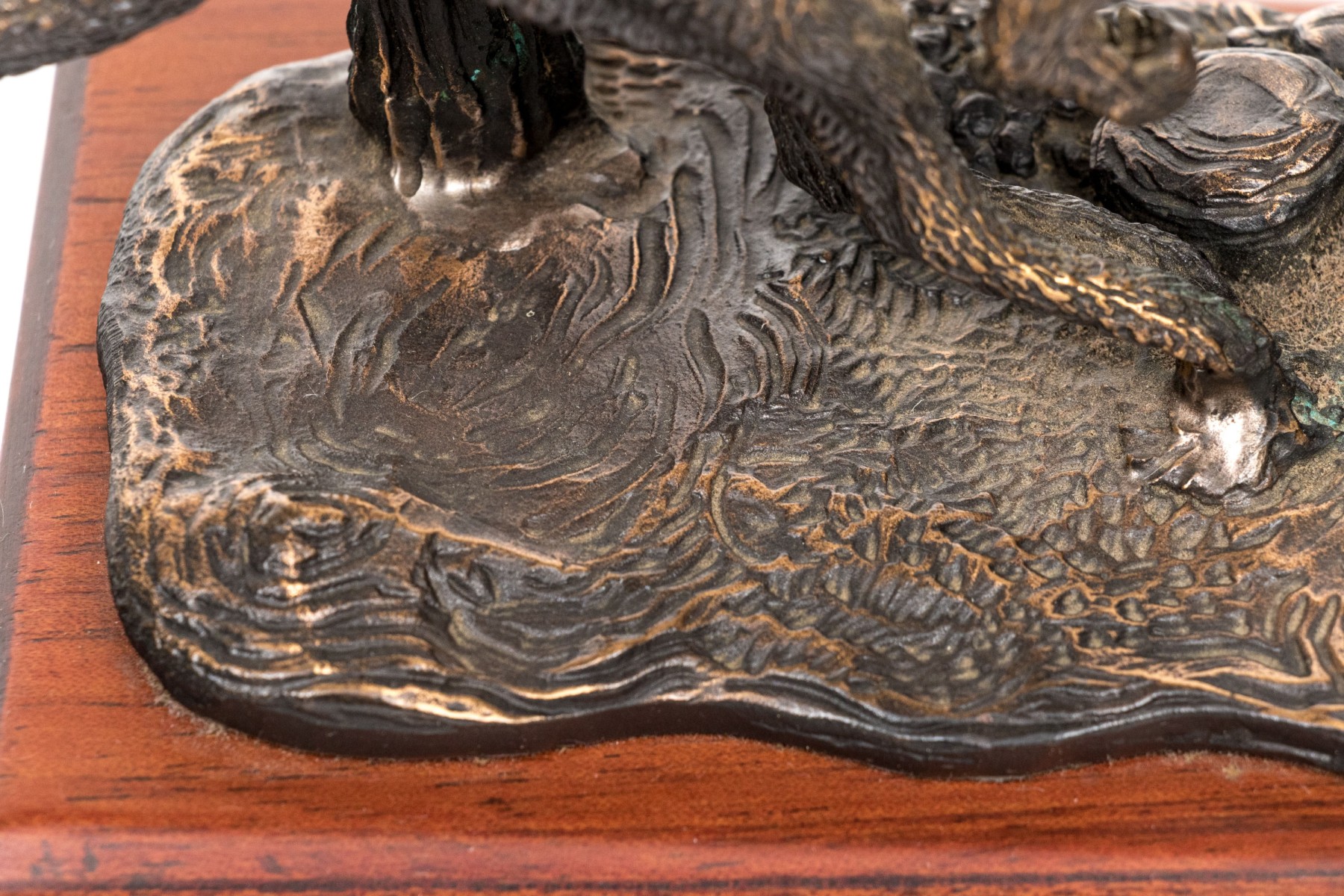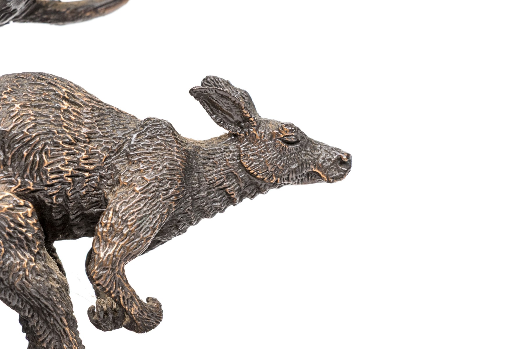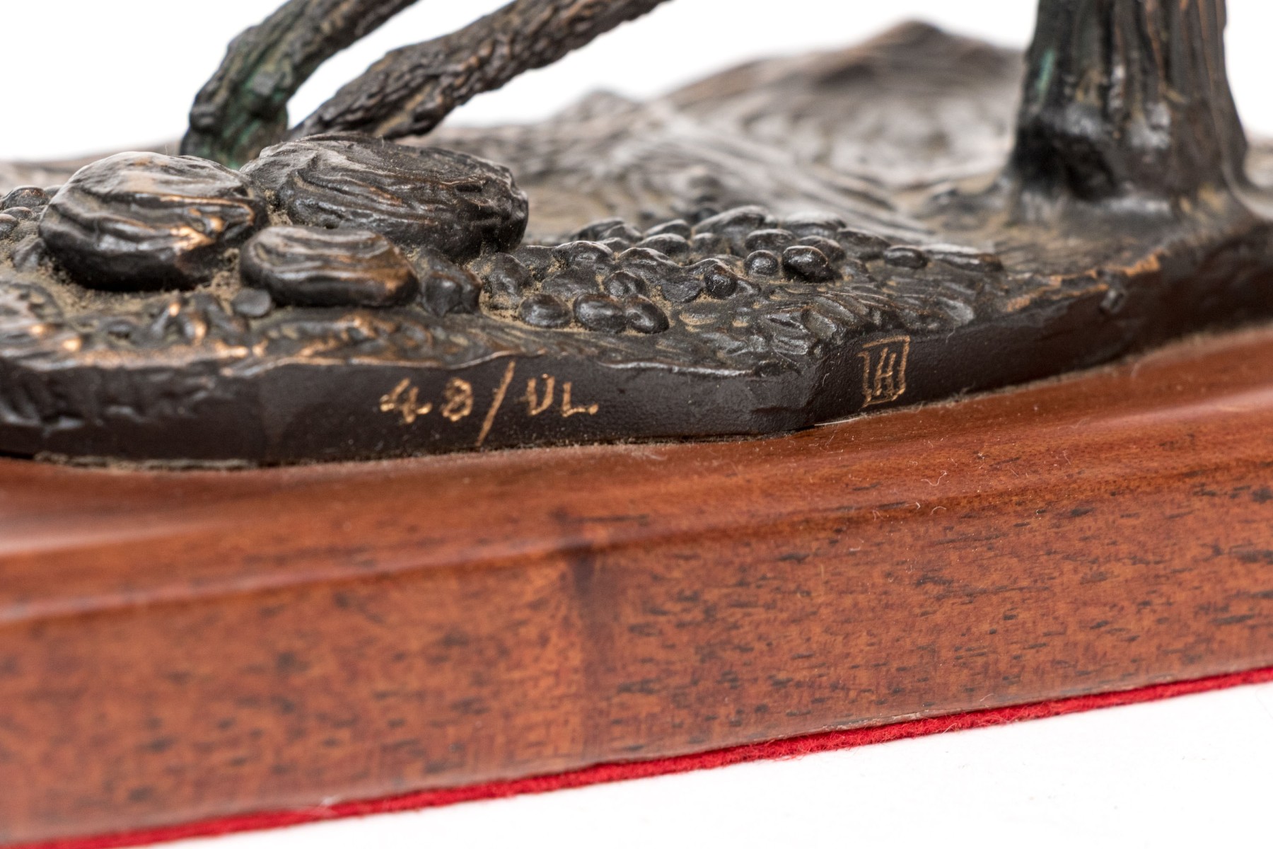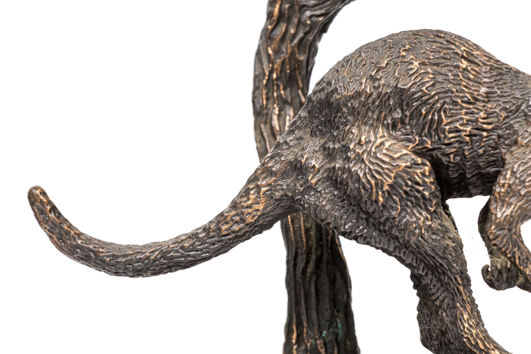 Eddie Hackman (Australian, b. 1933) bronze sculpture depicting a kangaroo great texture throughout the fur. The kangaroo poses mid-jump next to a bare branched tree along a naturalistic ground, mounted to an orange-brown rectangular wood base lined with red felt underfoot. Marked 49/DL with an insignia to the left trim of sculpture above base.