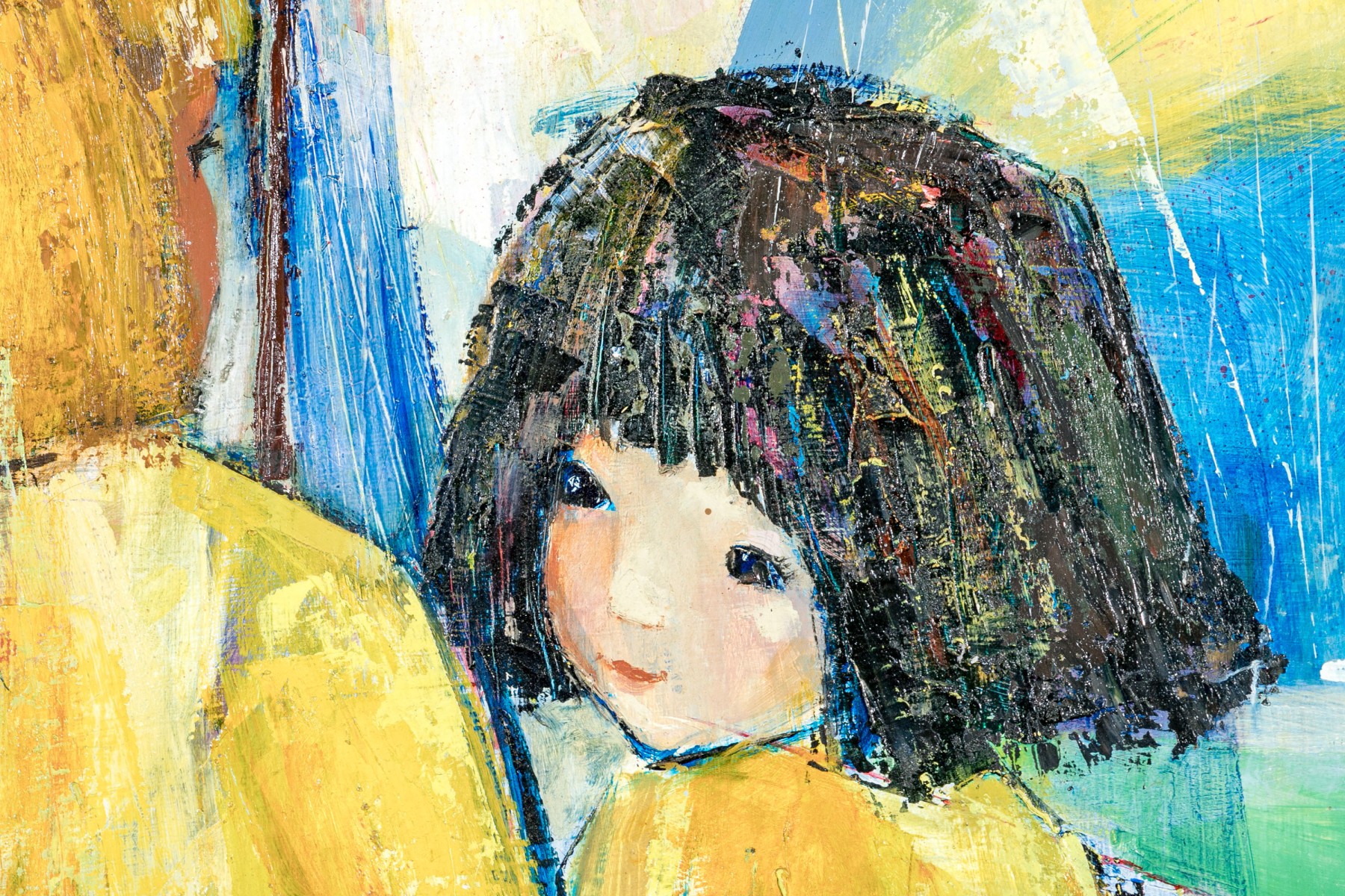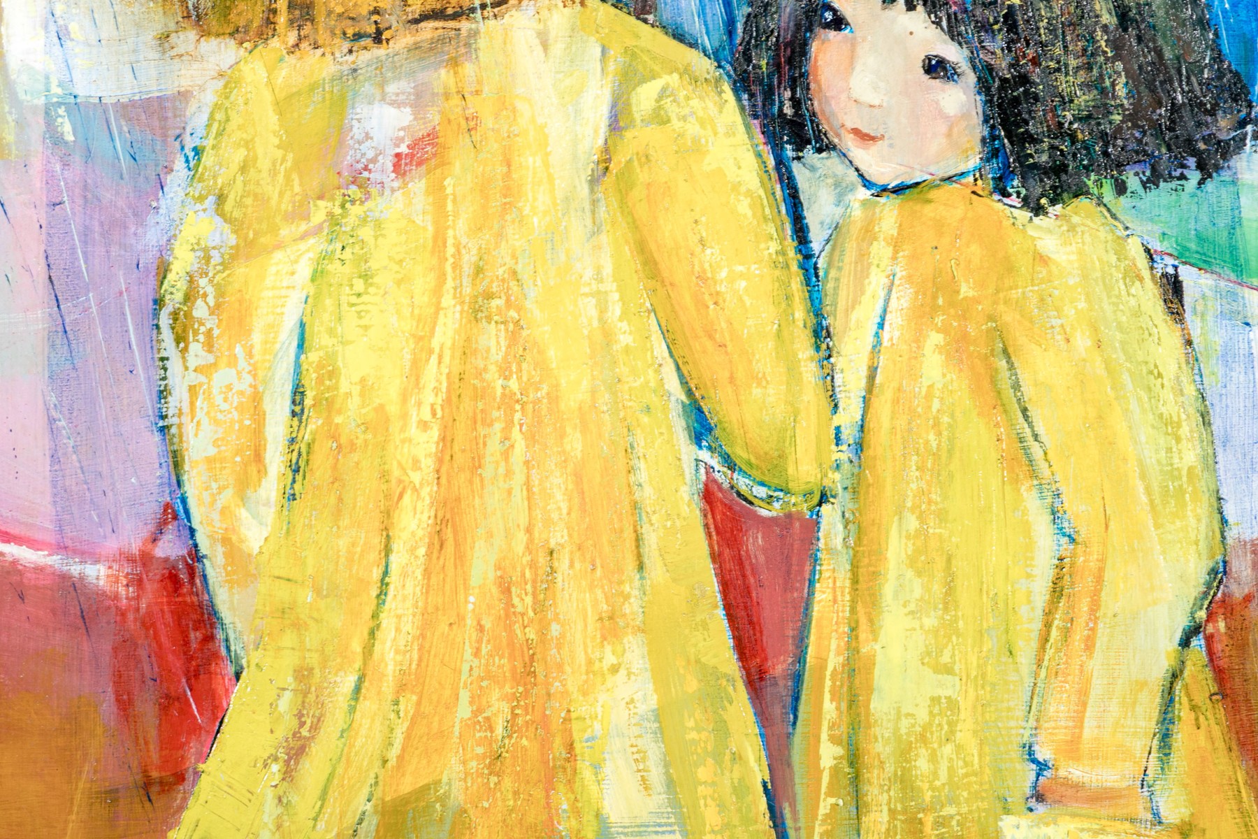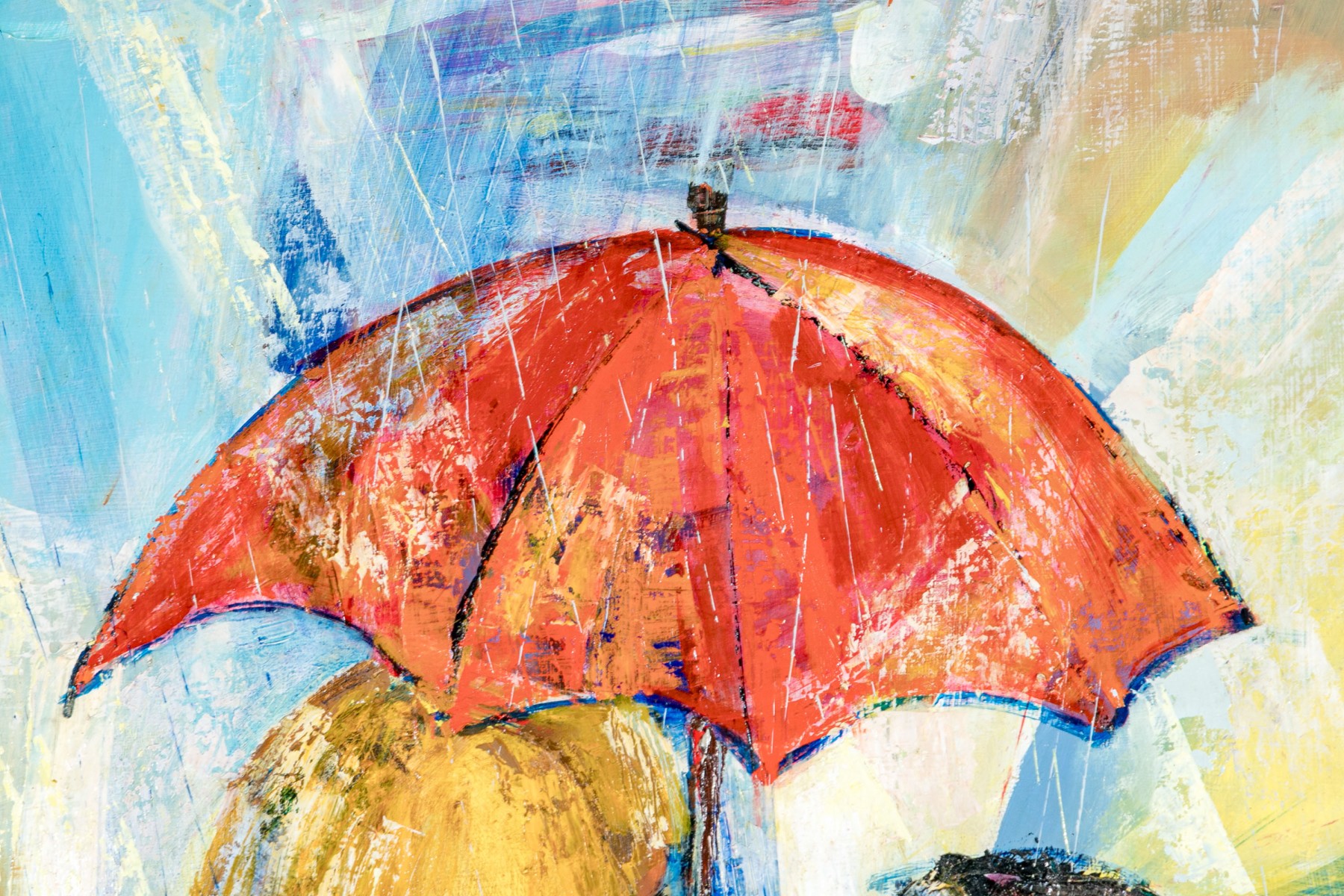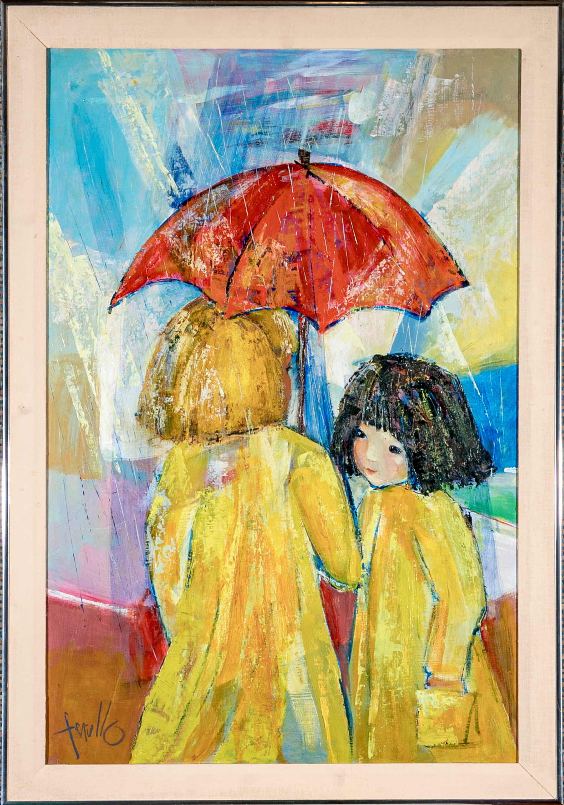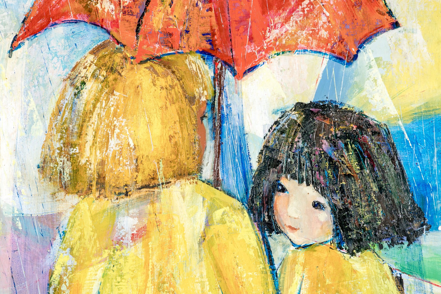 Oil on board depicting two little girls in yellow raincoats beneath a red umbrella, rendered in a pallet style.