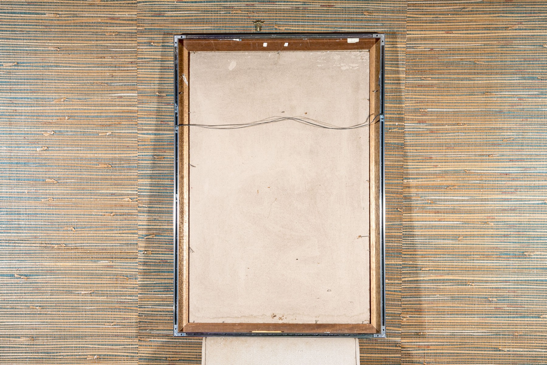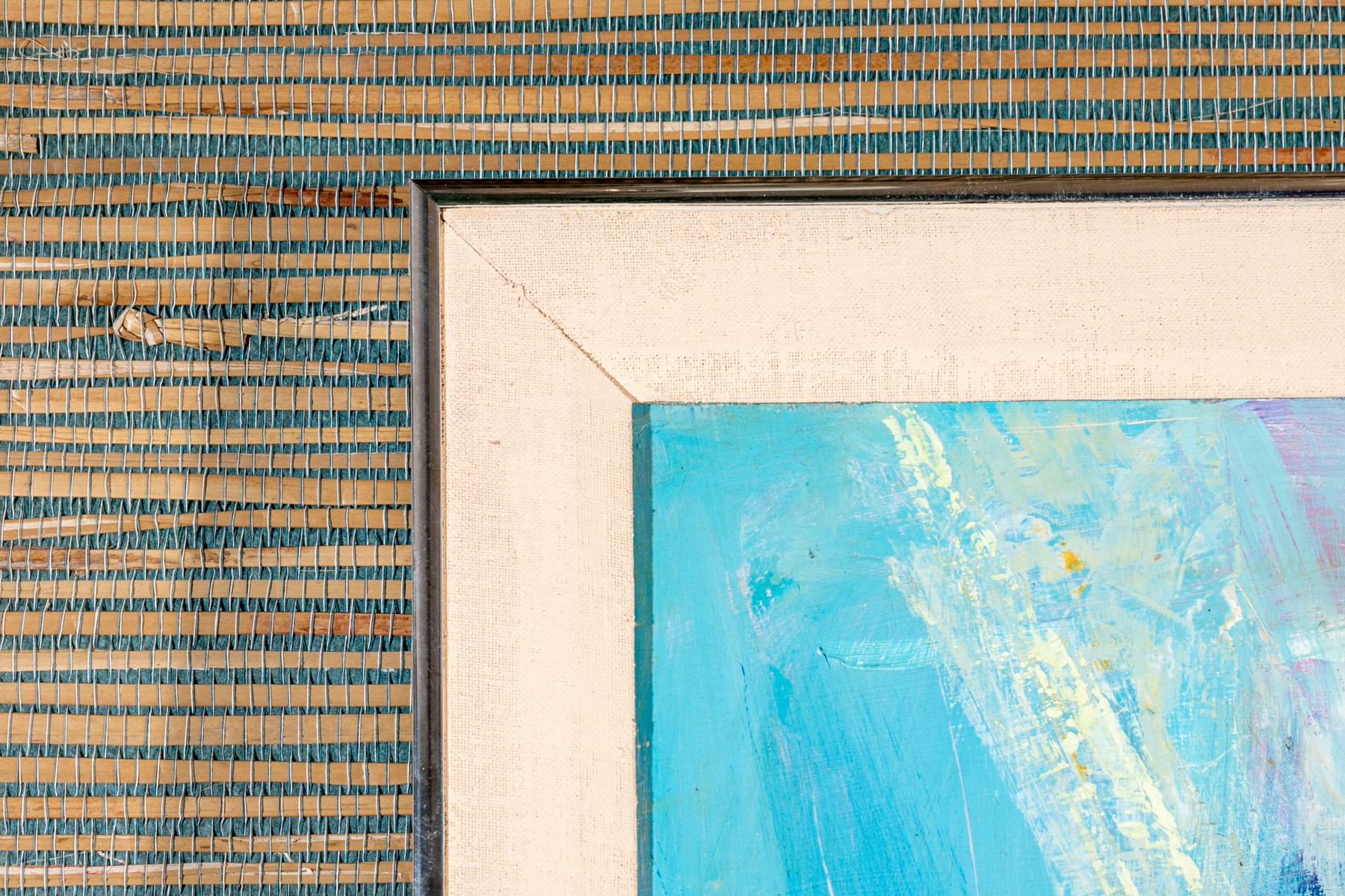Presented in a silver-tone metal frame with a painted linen fillet.