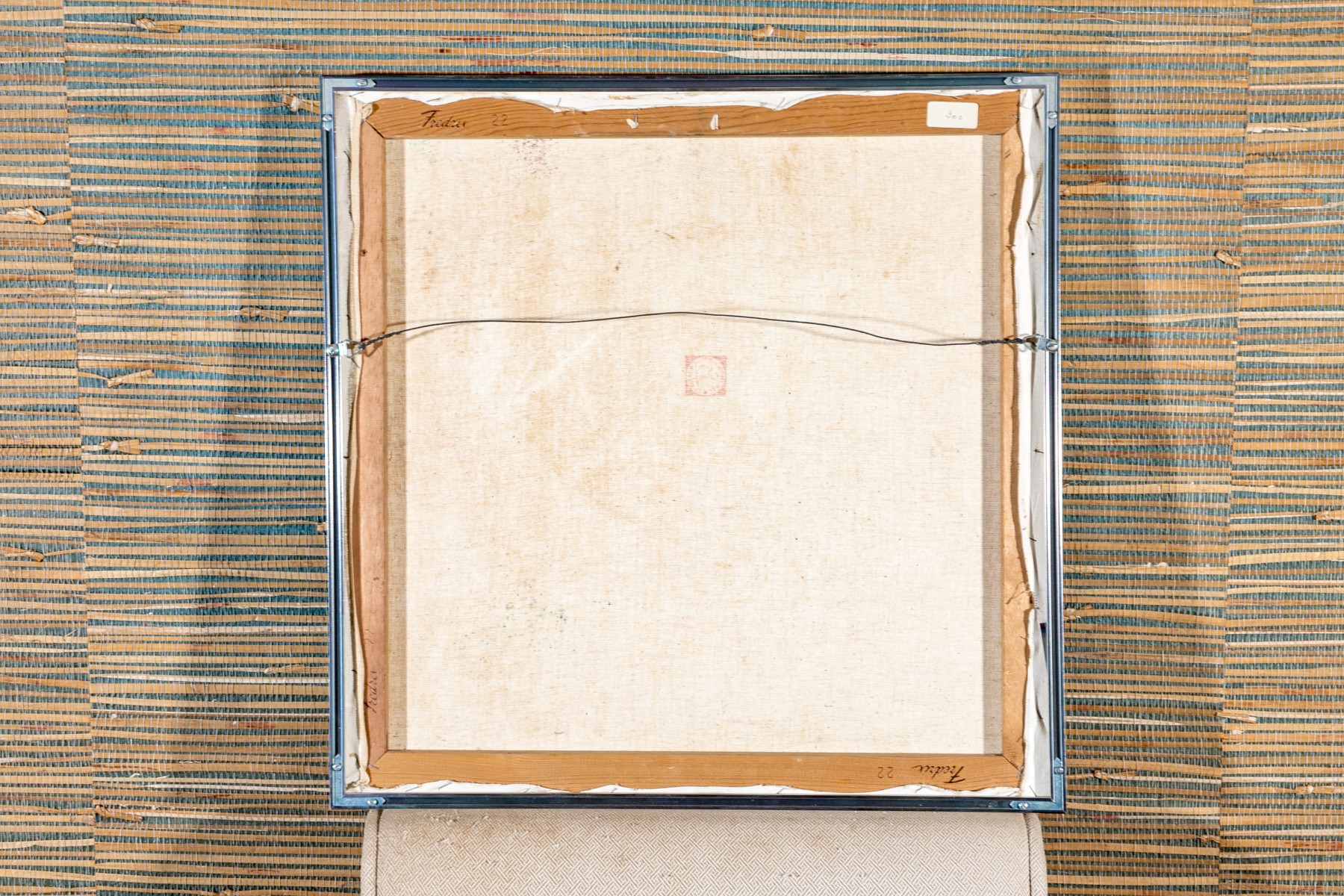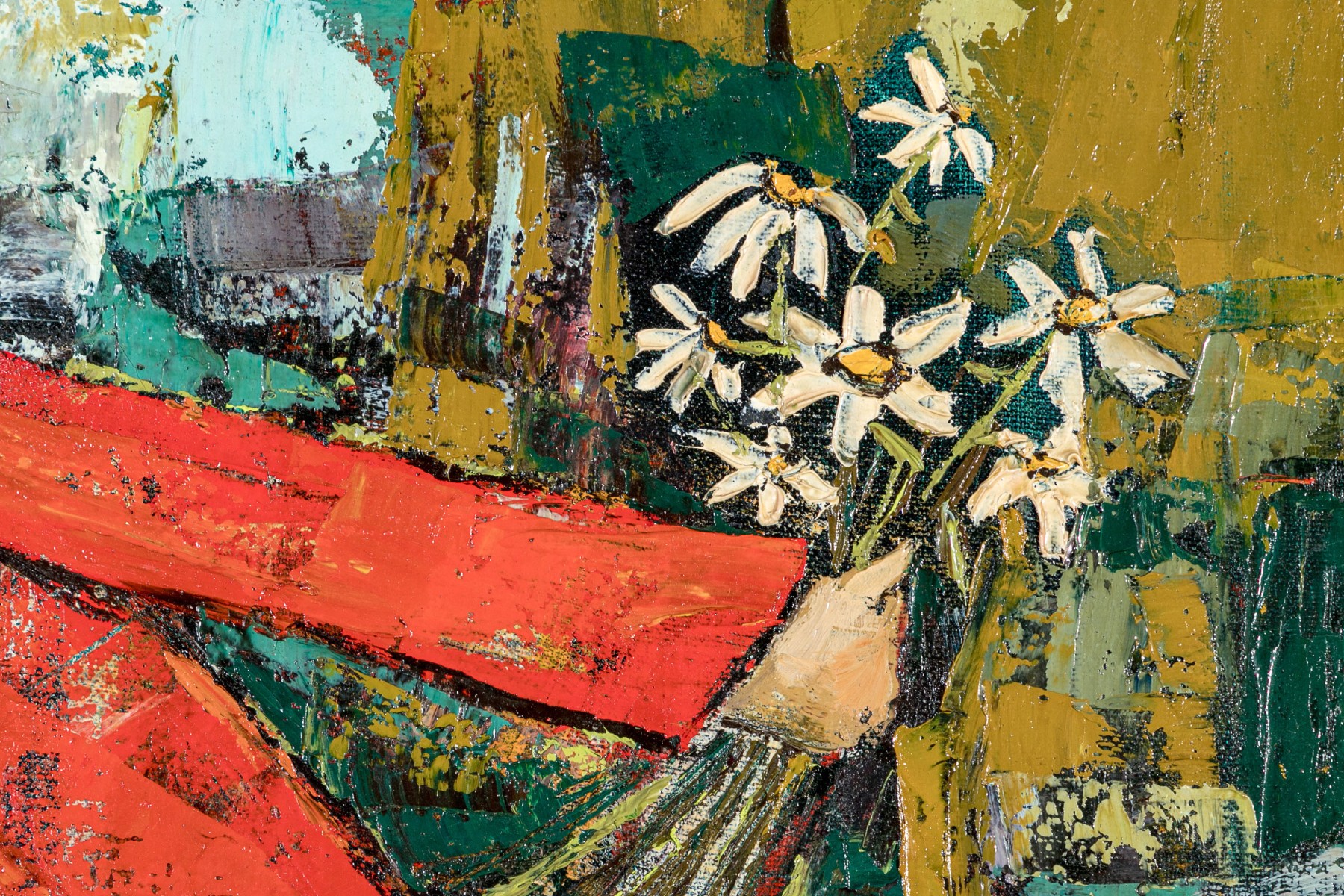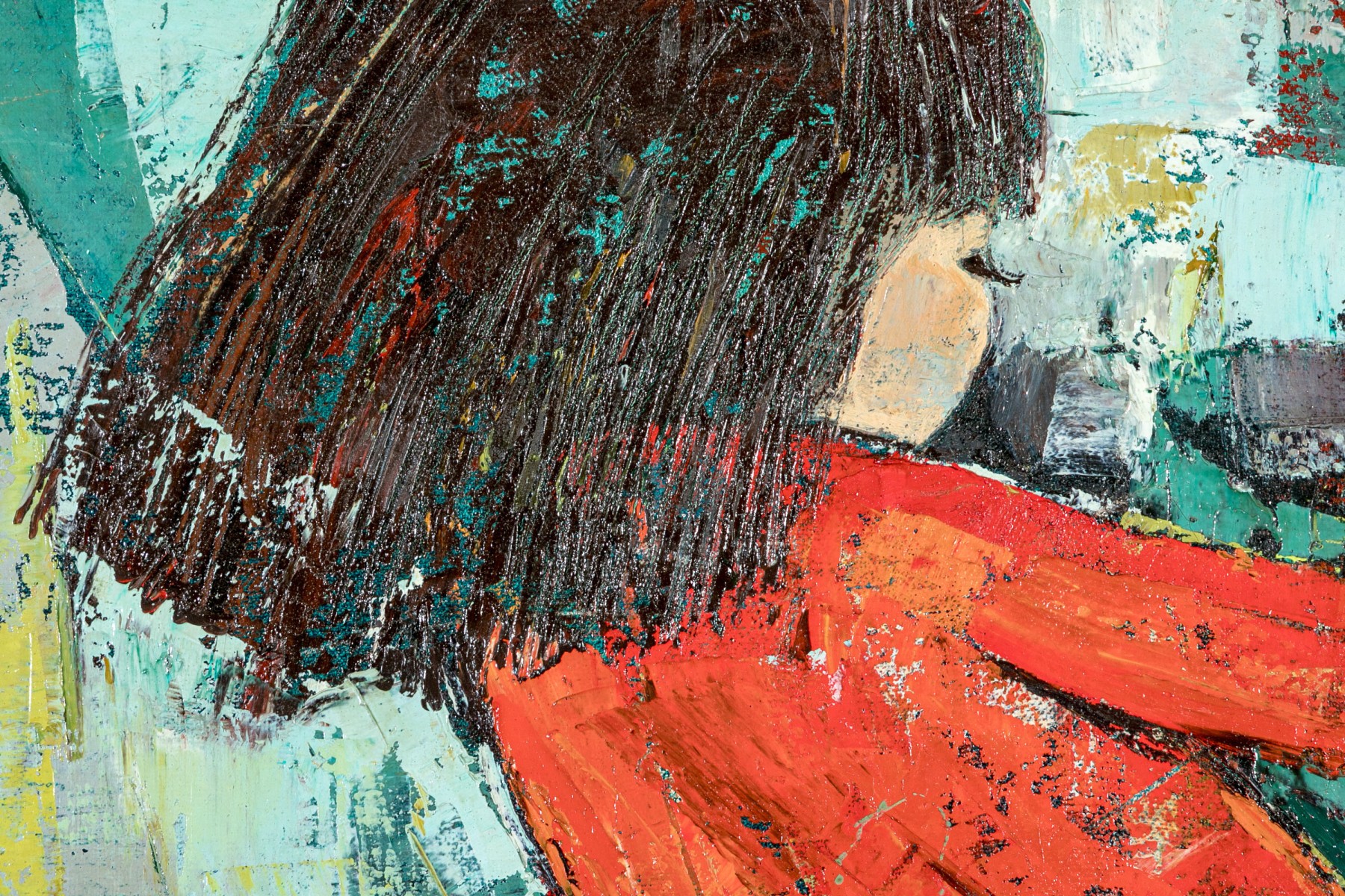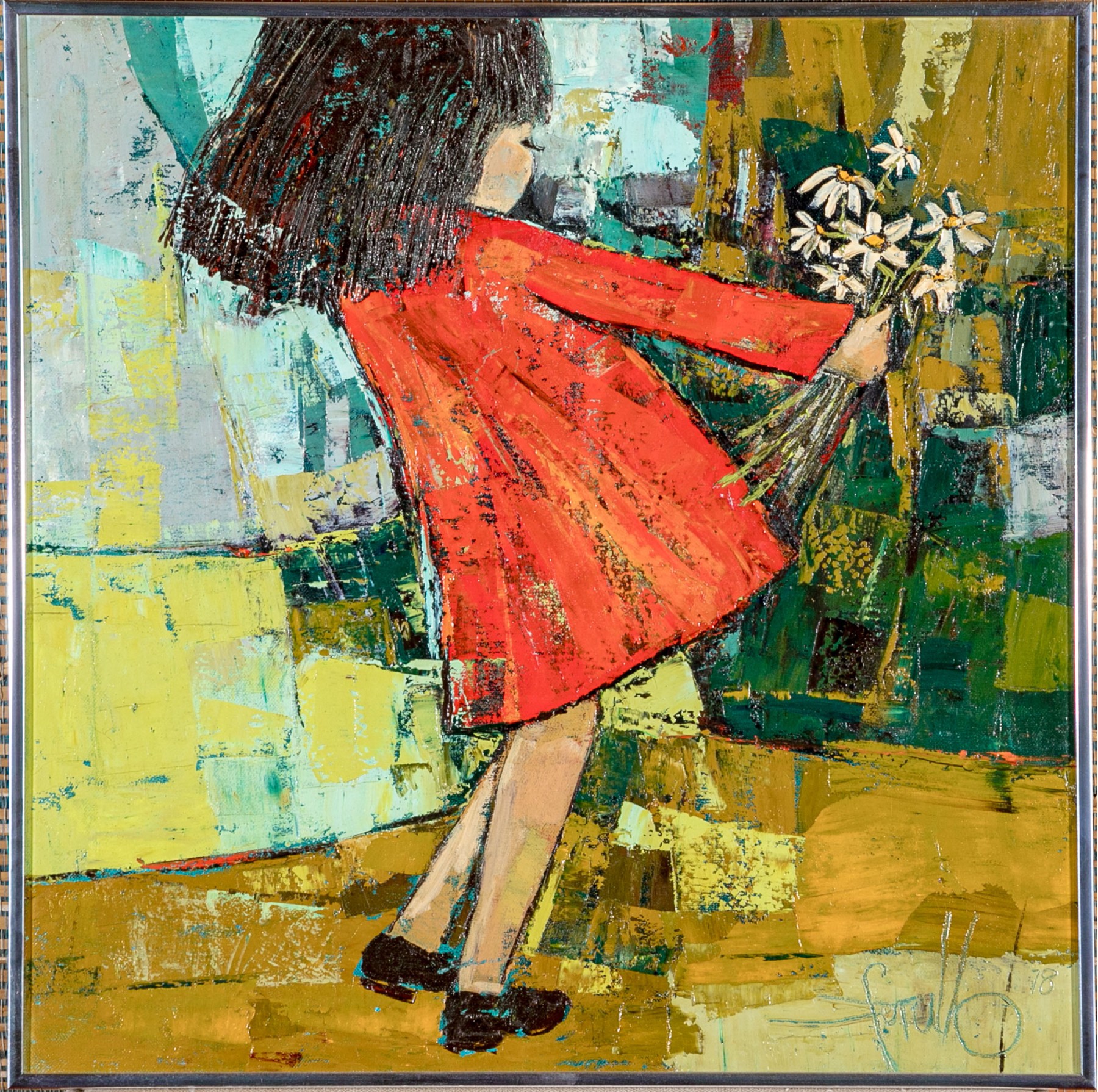 Oil on canvas depicting a little girl in red dress holding a bouquet of daisies. The work in a cubist style and presented a silver metal frame. Stamped in red on verso.