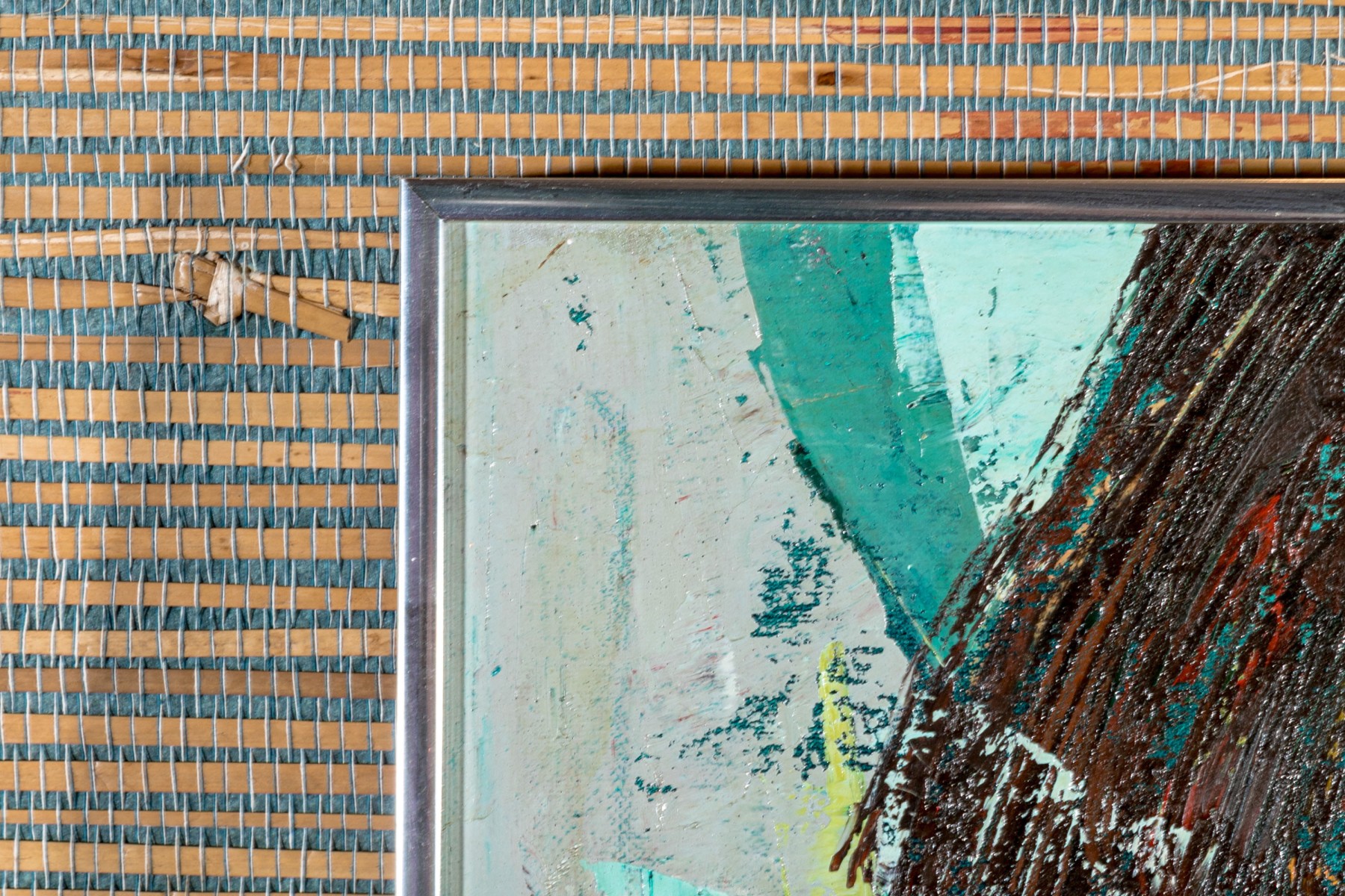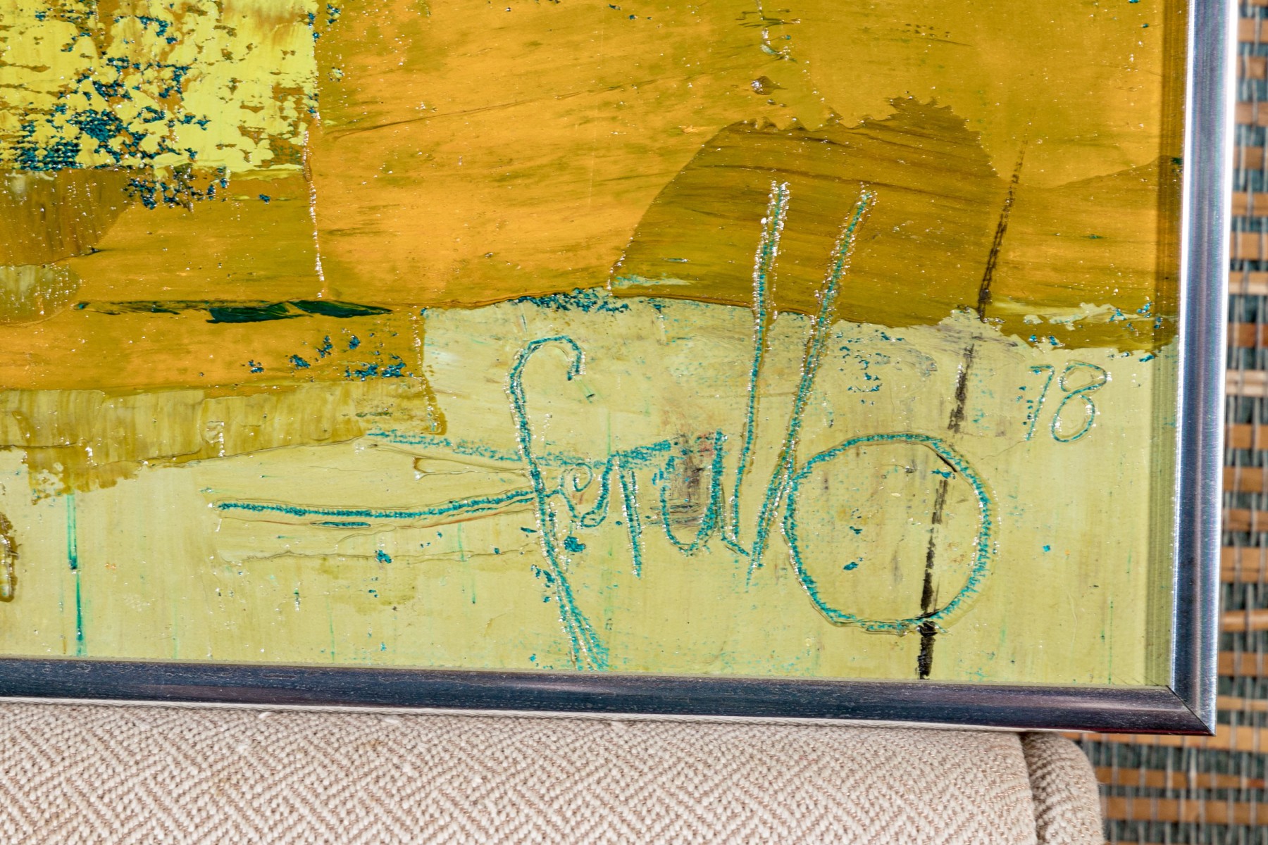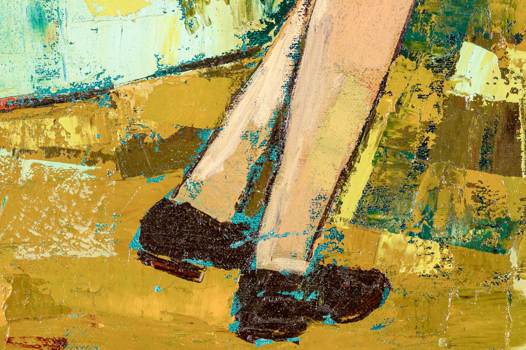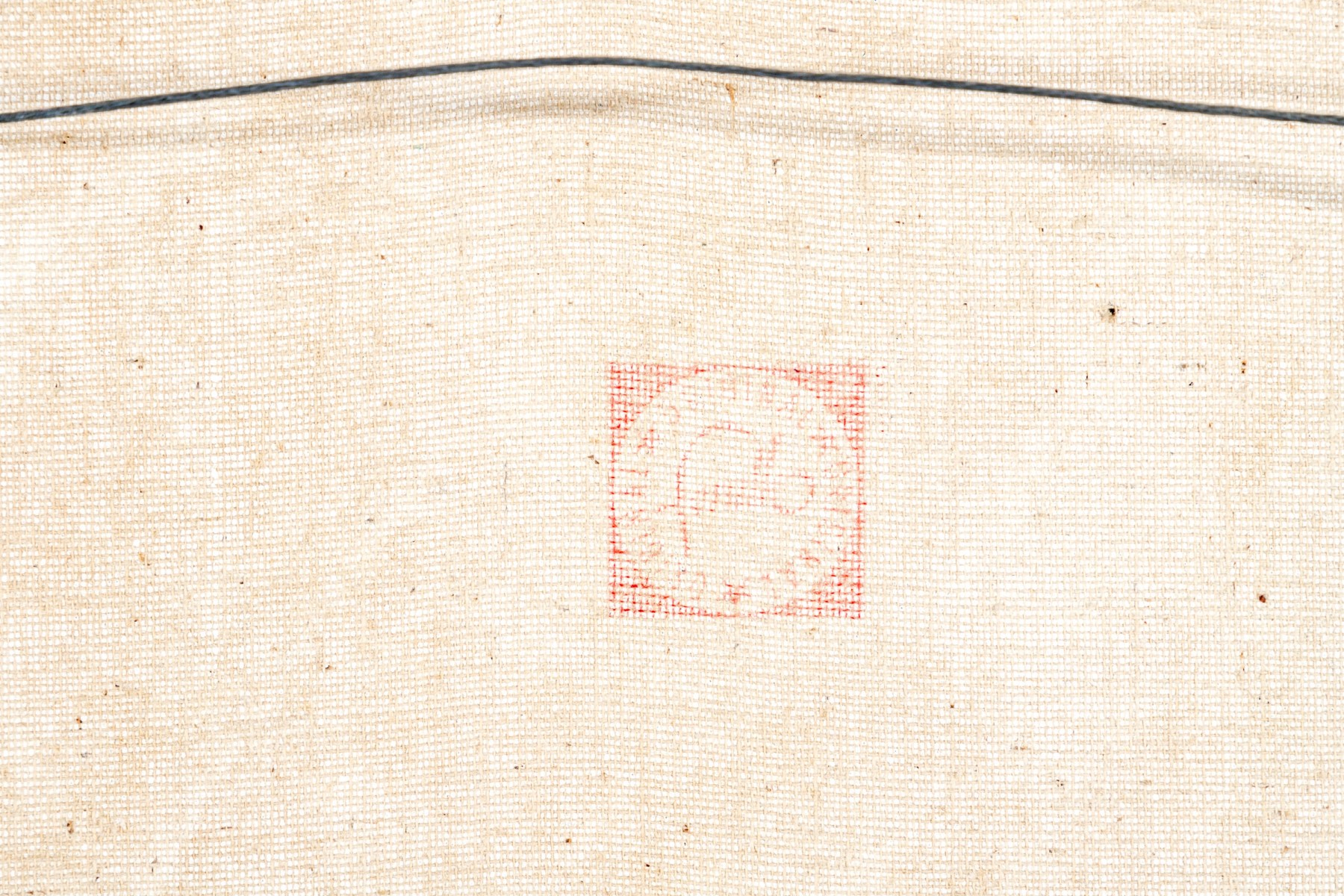 Oil on canvas depicting a little girl in red dress holding a bouquet of daisies. The work in a cubist style and presented a silver metal frame. Stamped in red on verso.