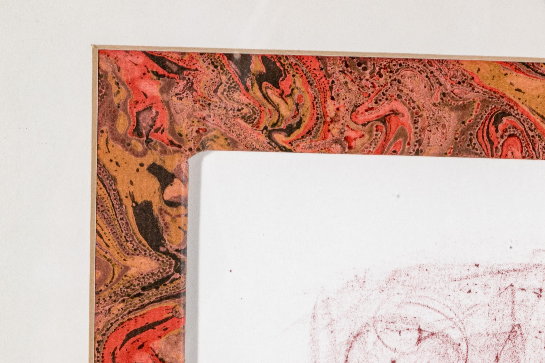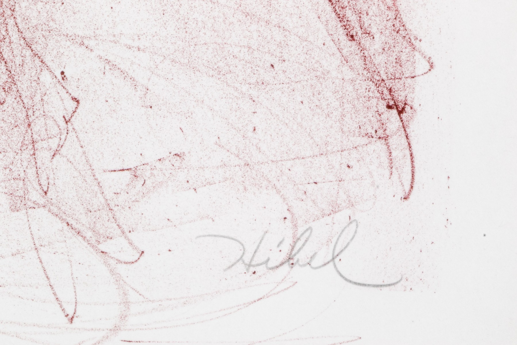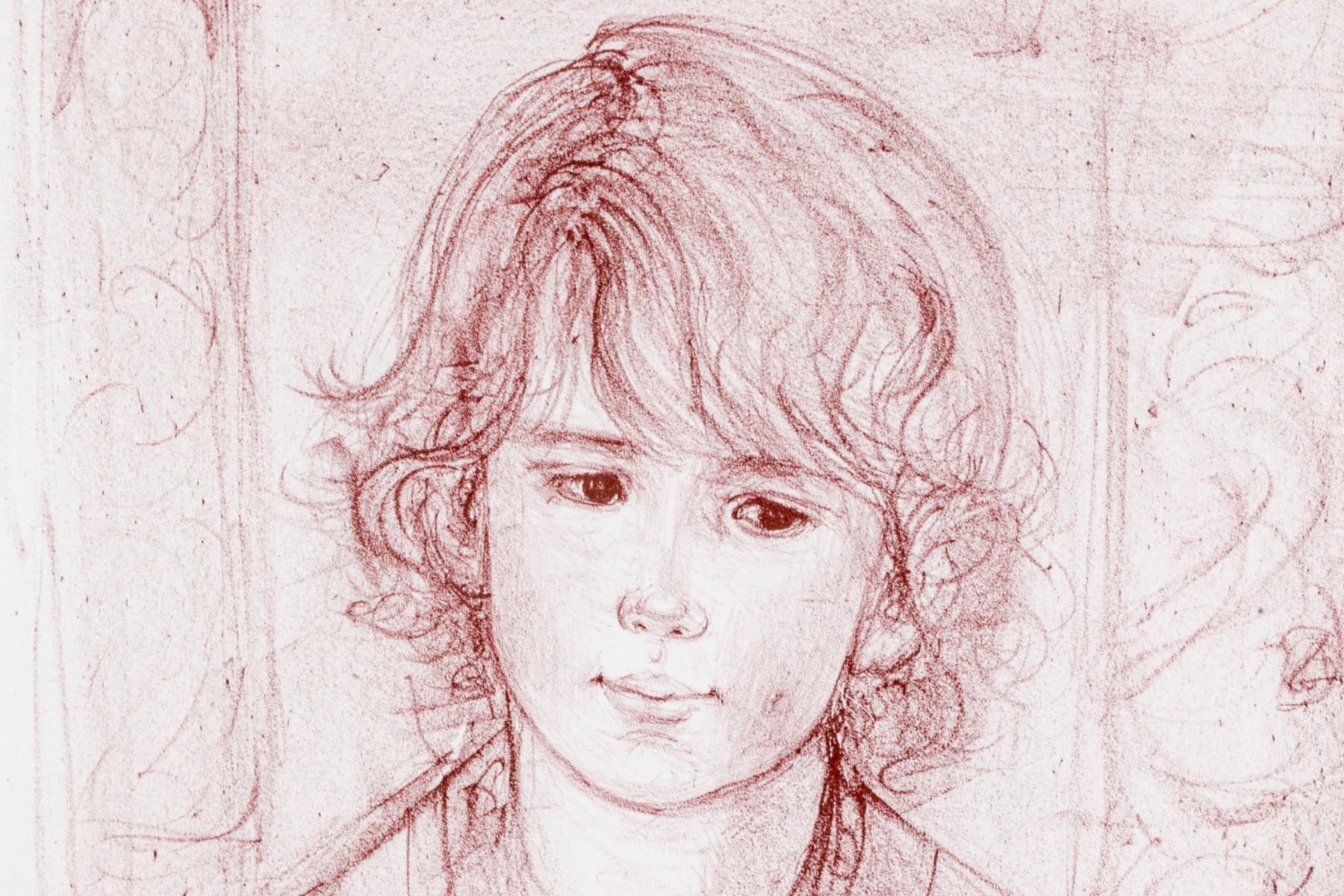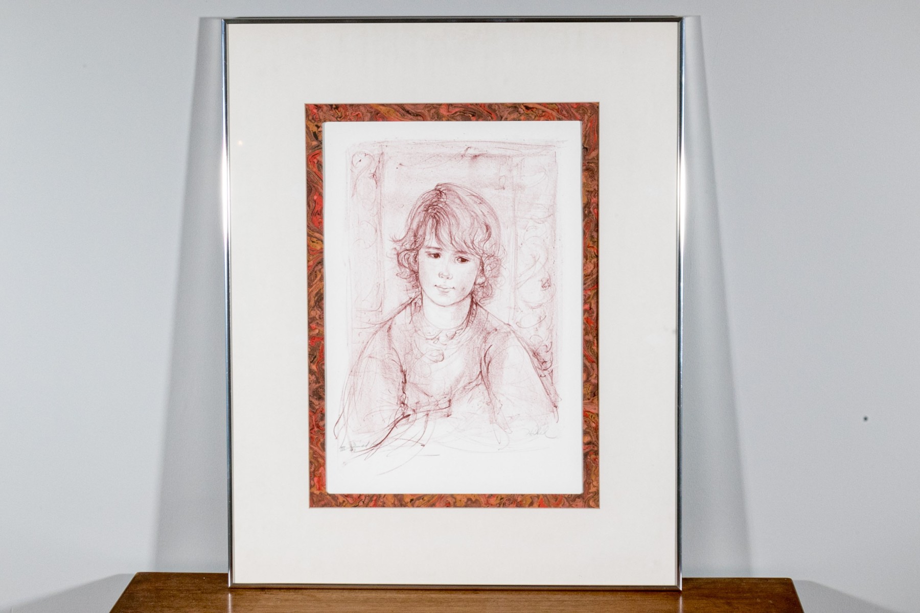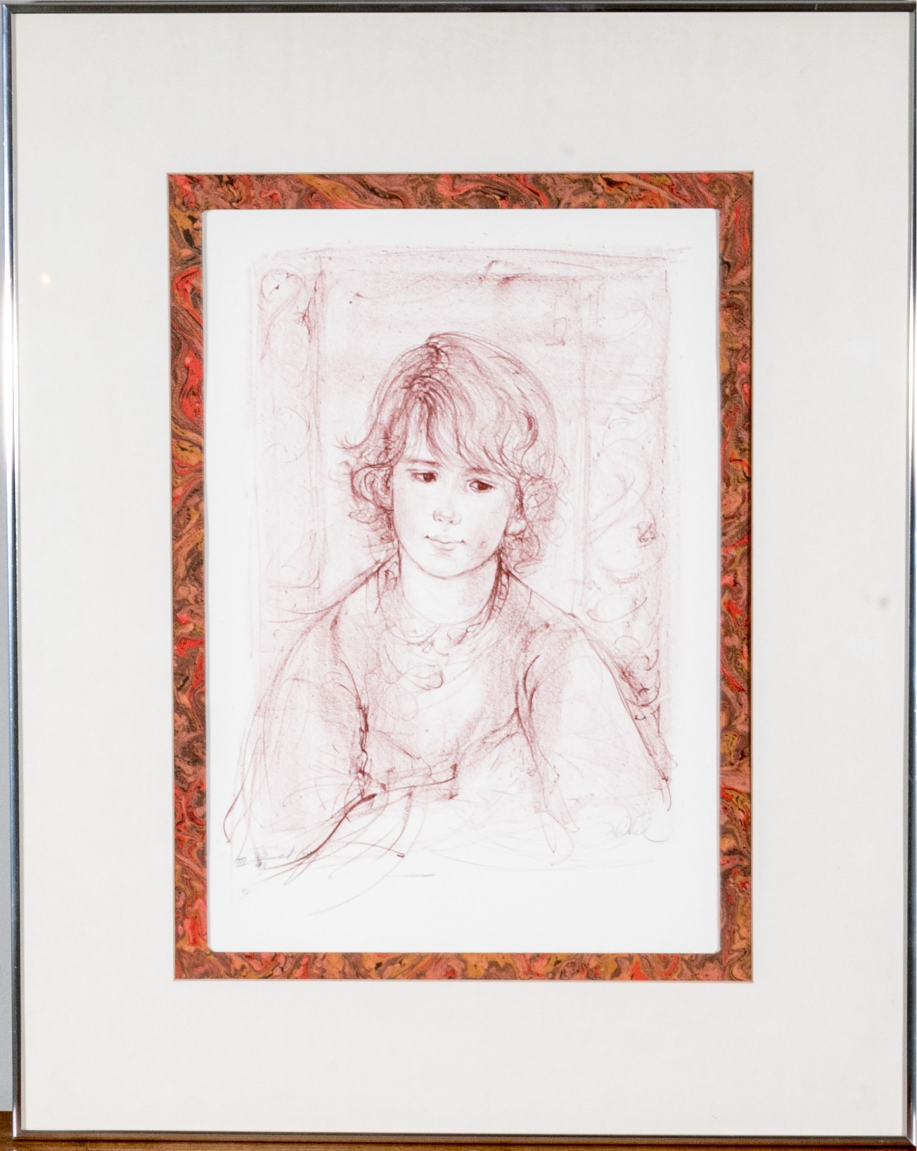 Edna Hibel (American, 1917-2014) "Young Girl" lithograph depicting a soft, sketch style rendering in red depicting a girl with feathery hair and a collared dress with puffy long sleeves.