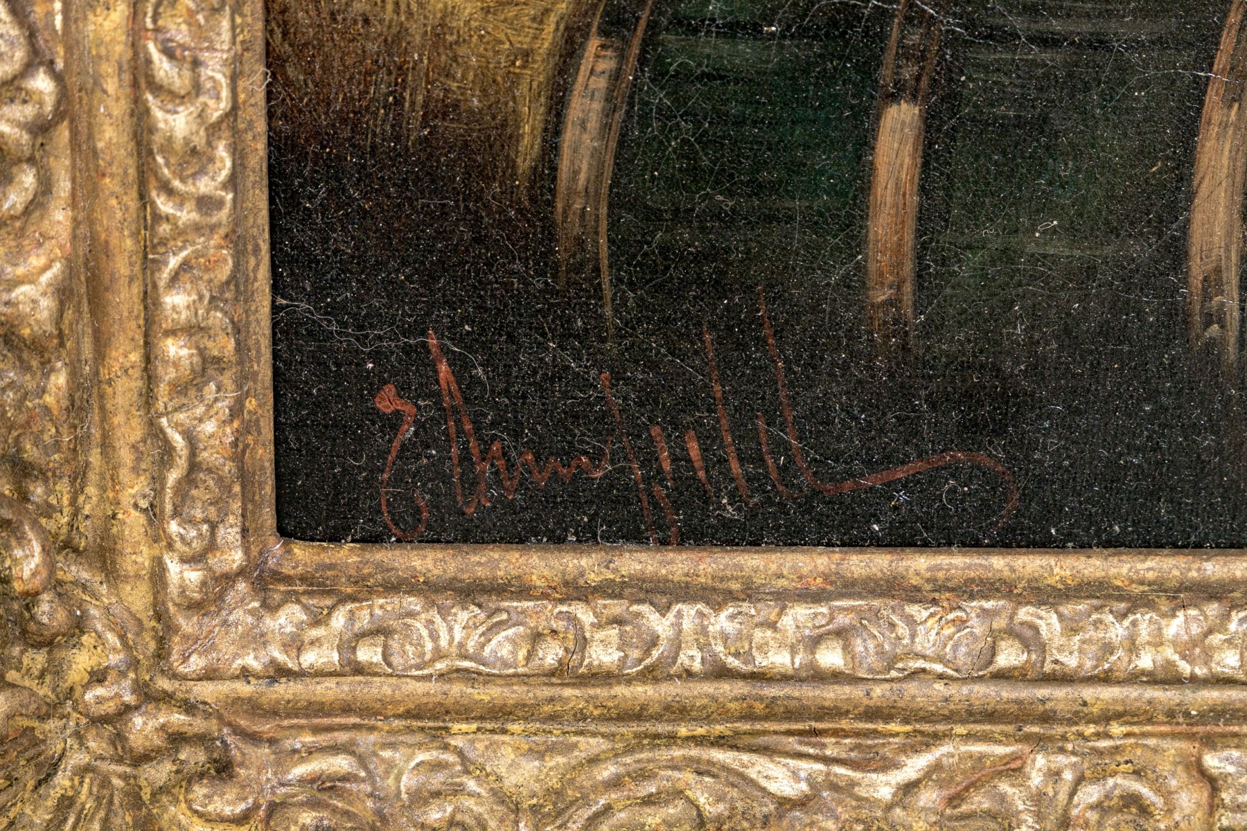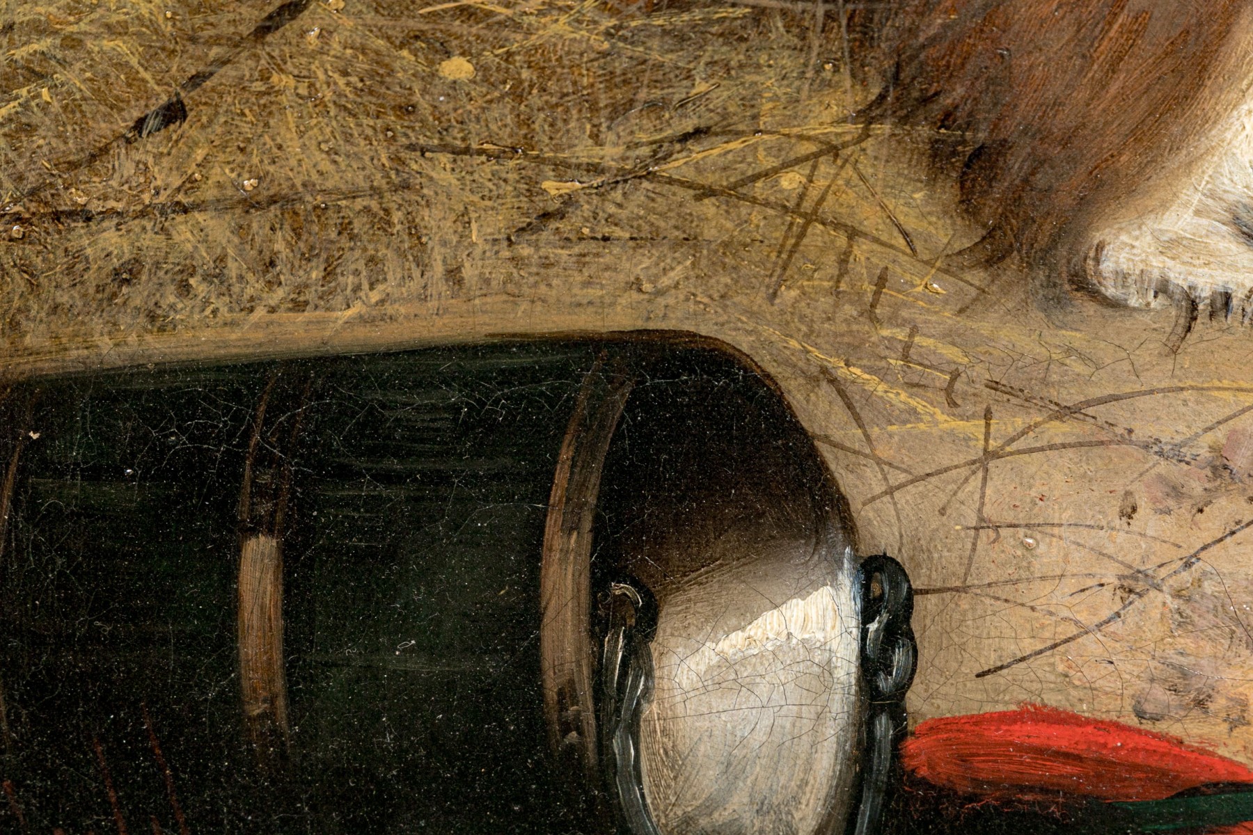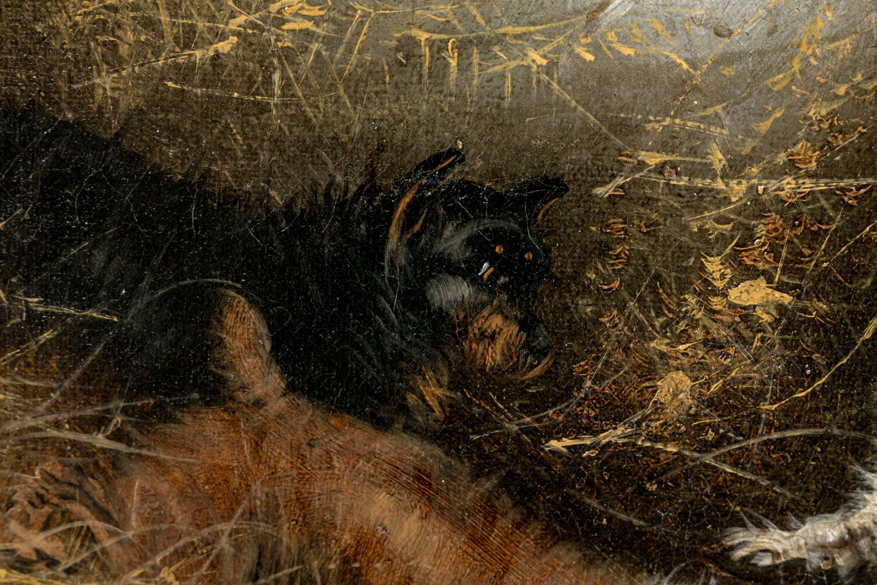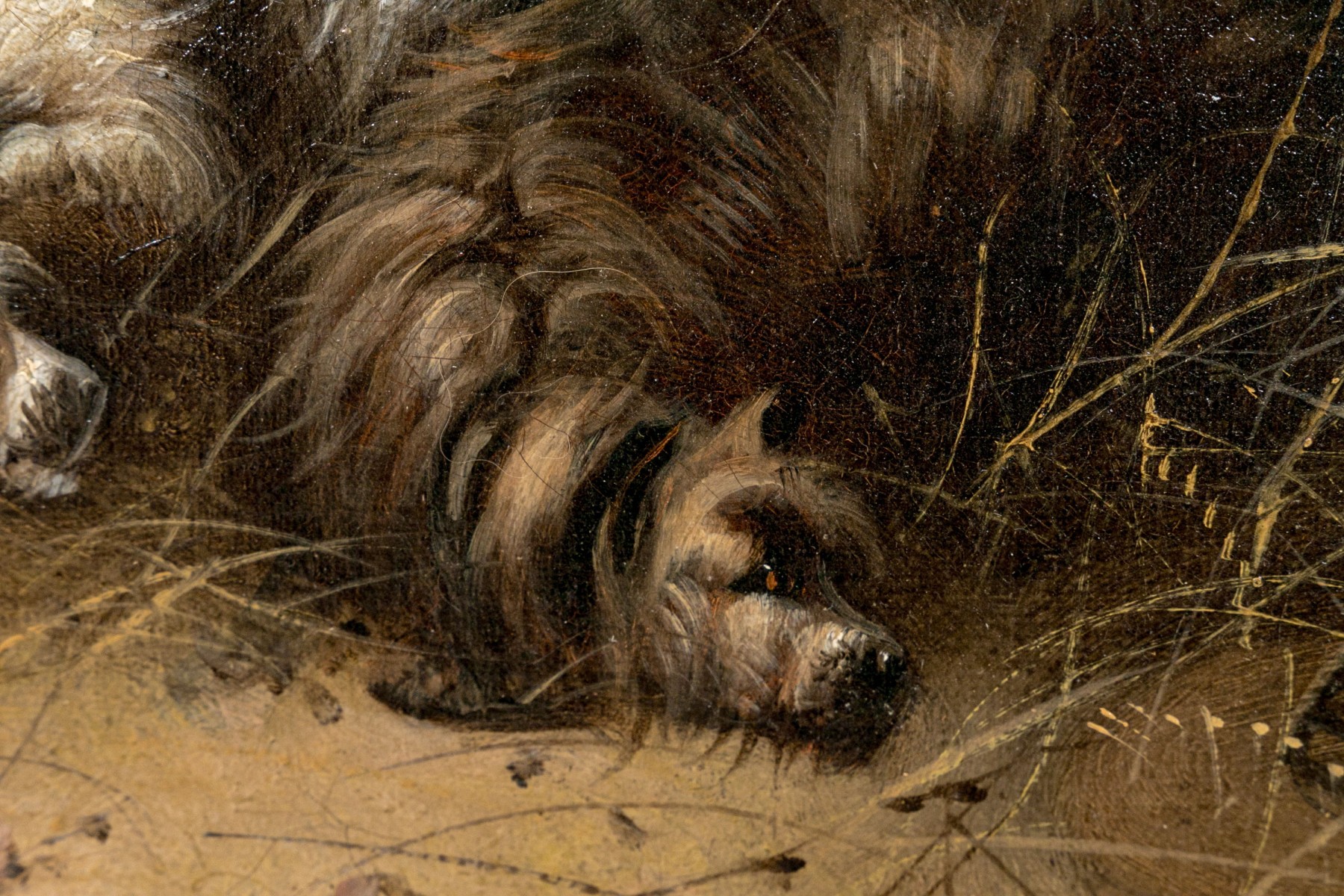This beautiful oil on canvas depicts adorable dogs in a barn shed surrounded by hay and a pale. Housed in an elaborate gilded frame. Signed lower left illegibly.