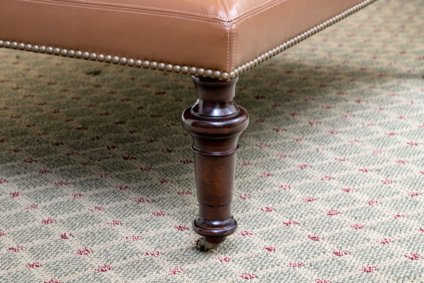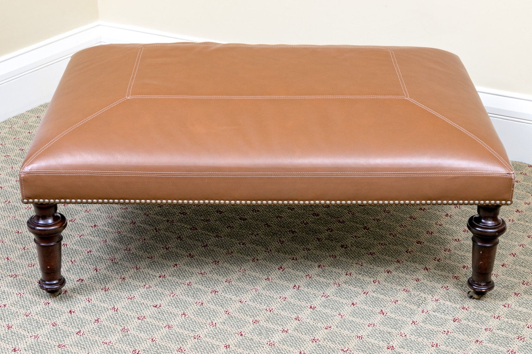 Excellent condition leather topped ottoman on mahogany legs and casters. Mitered stitching. Fine craftsmanship.
