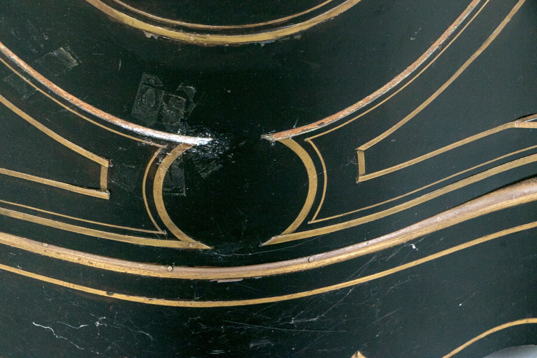 The door is in a latched position, and does not include a key. Losses, breaks, and bends to the gilt metal inlay. Checking/cracking to the left side extending approx 28". Scratches to the marble, light chipping around the edges, and some adhesive residue to the top. Some water stains to the mahogany shelves.