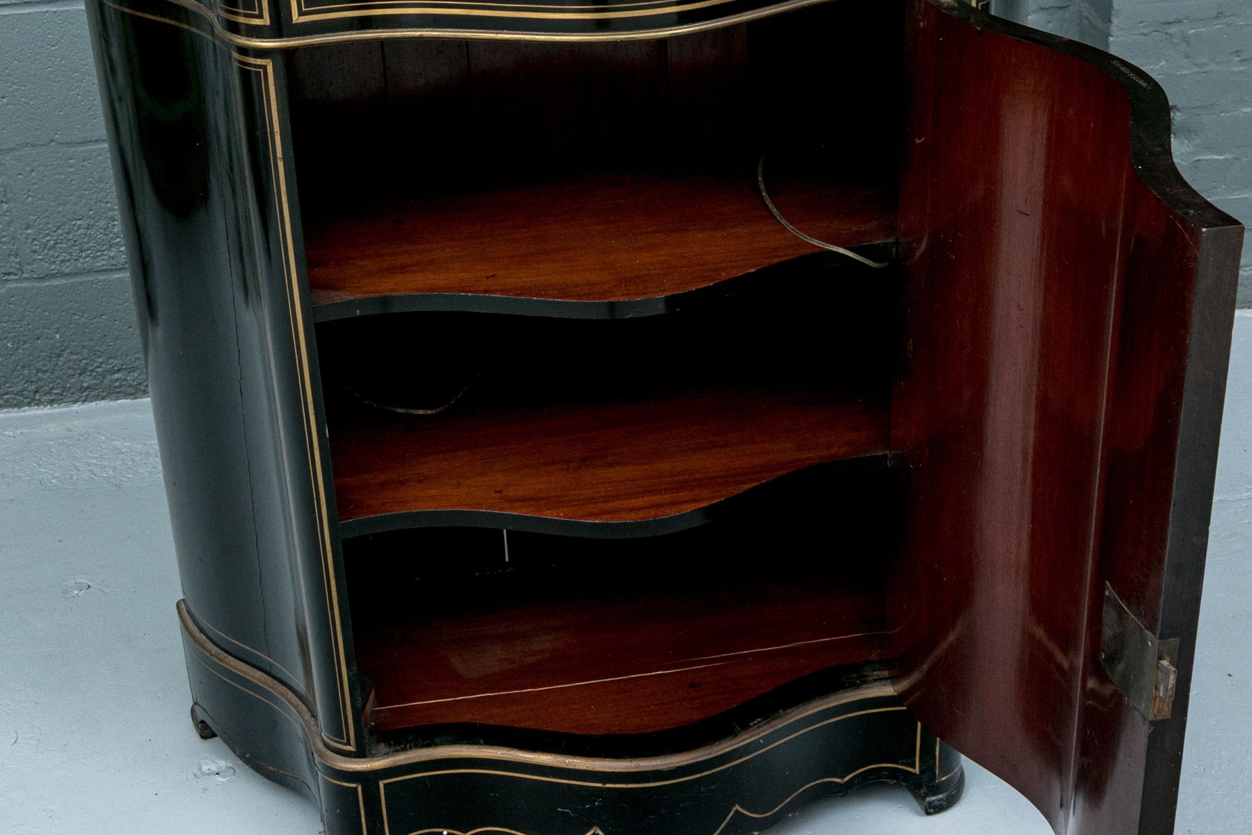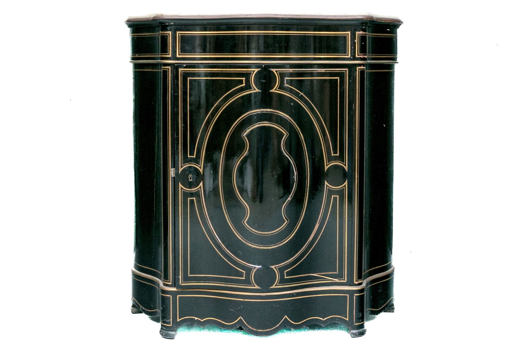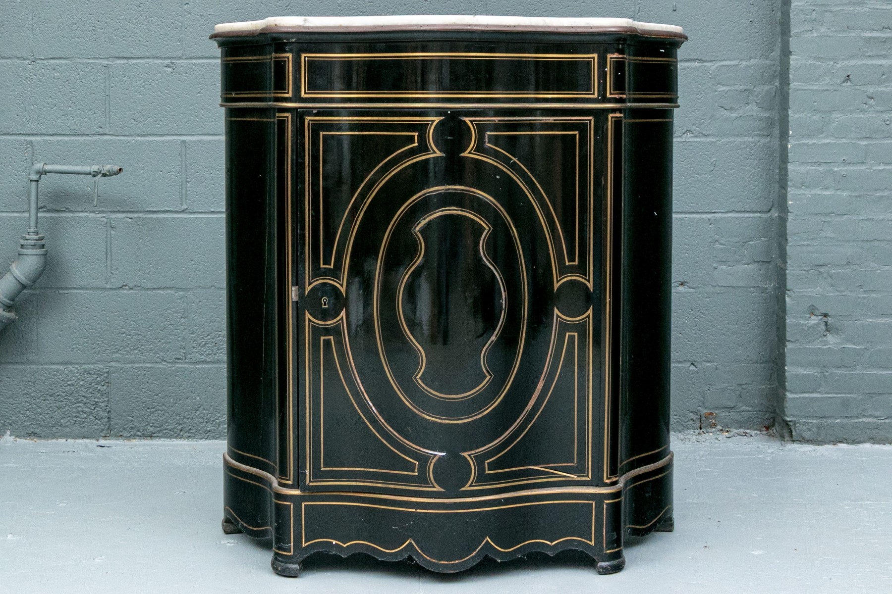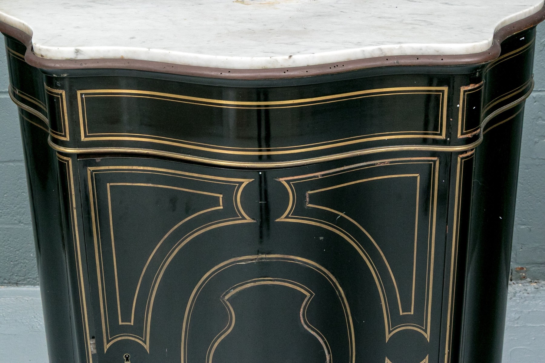 A stunning Edwards & Roberts commode exuding stately Napoleon III style, boasting a serpentine white marble top over a luxuriously ebonized body with striking, inlaid gilt metal borders around a single door that opens to a shelved interior in rich red-brown finished mahogany. Maker's mark on the center top edge of the door.