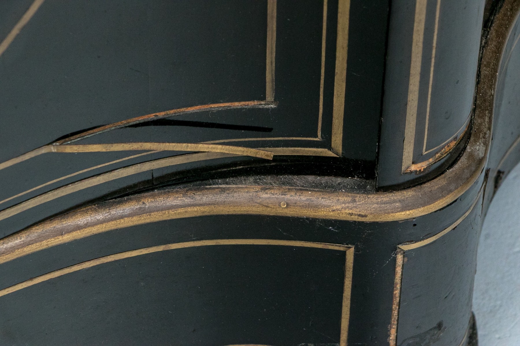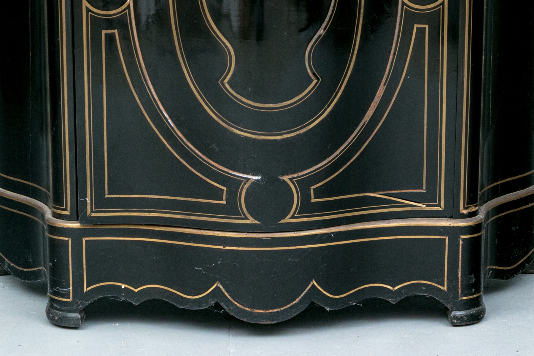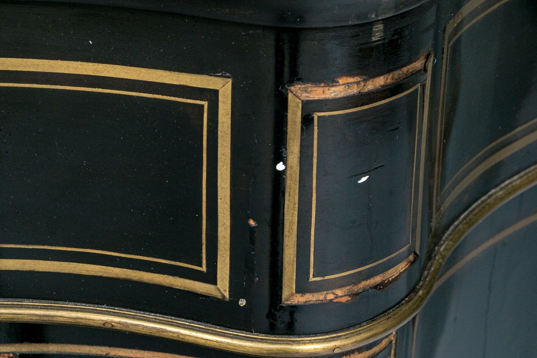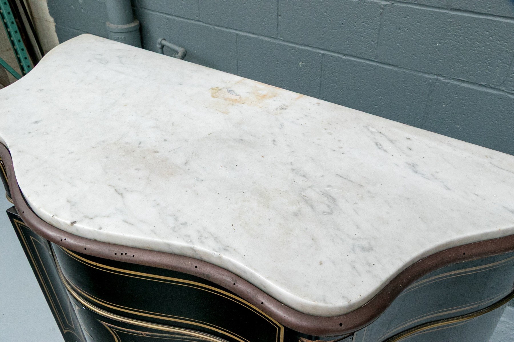 A stunning Edwards & Roberts commode exuding stately Napoleon III style, boasting a serpentine white marble top over a luxuriously ebonized body with striking, inlaid gilt metal borders around a single door that opens to a shelved interior in rich red-brown finished mahogany. Maker's mark on the center top edge of the door.
