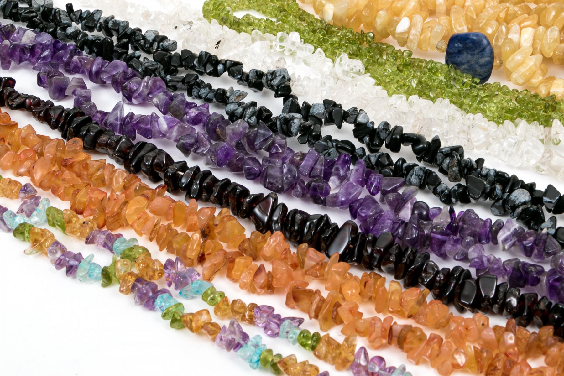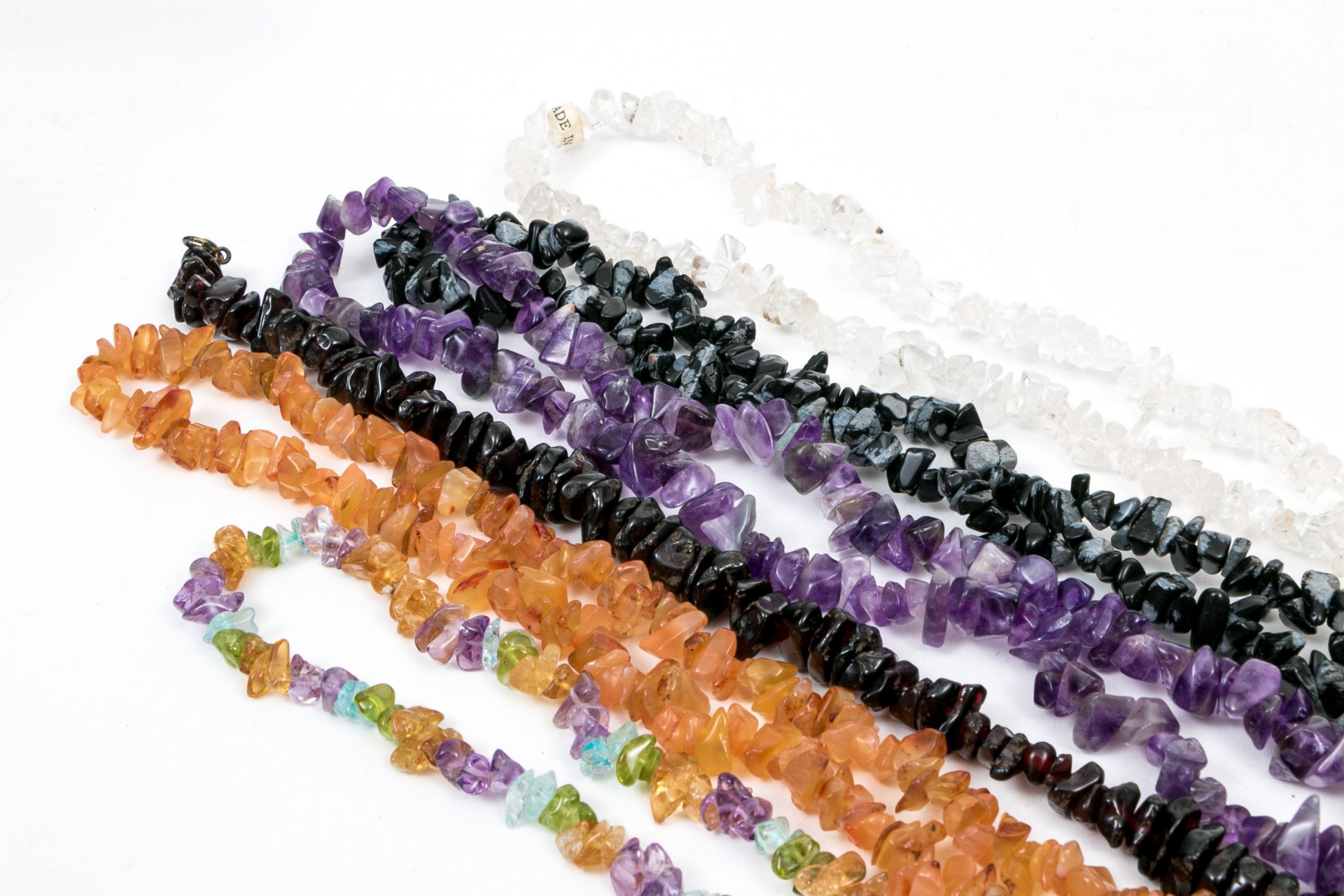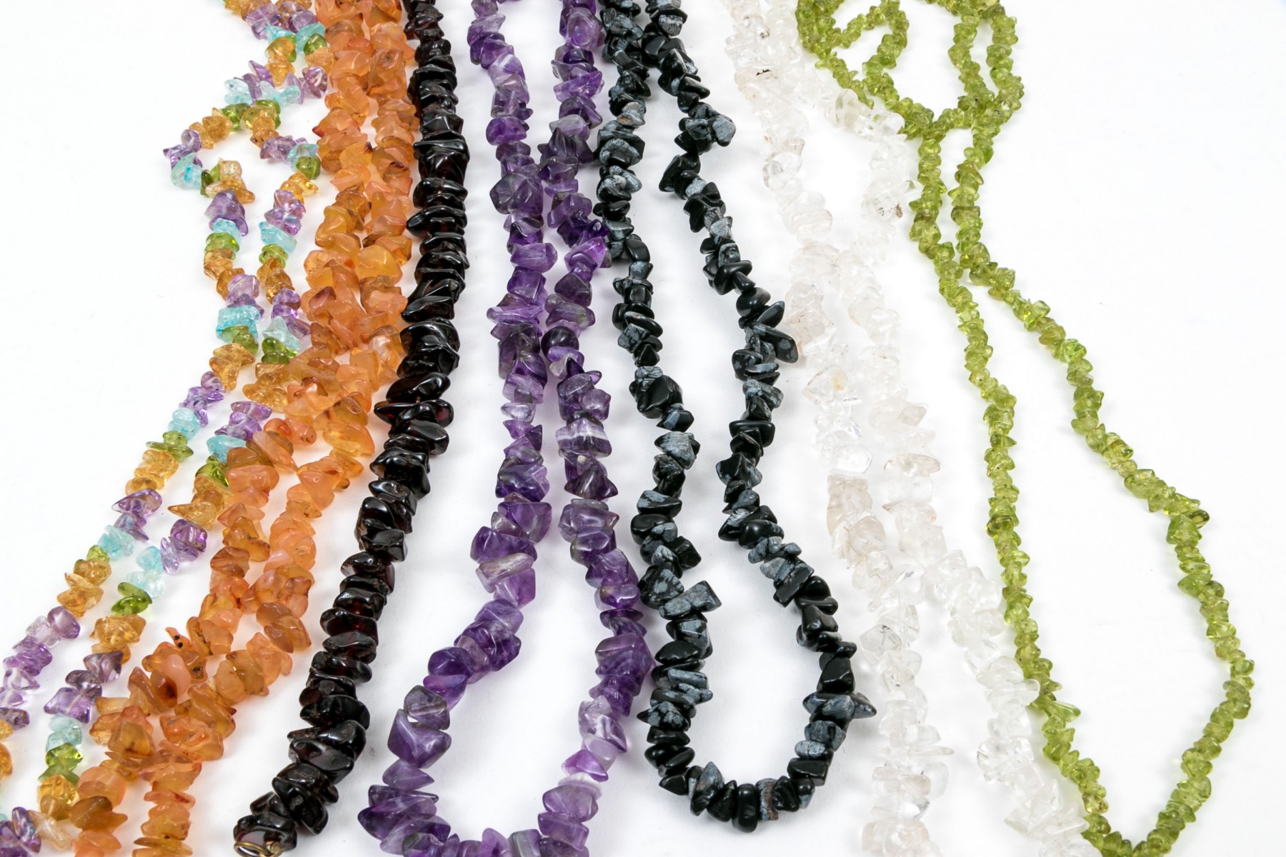 Eight unique and colorful stone beaded necklaces. The necklaces are strung with tumbled stones of amethyst, quartz, snowflake obsidian, citrine, peridot and garnet.