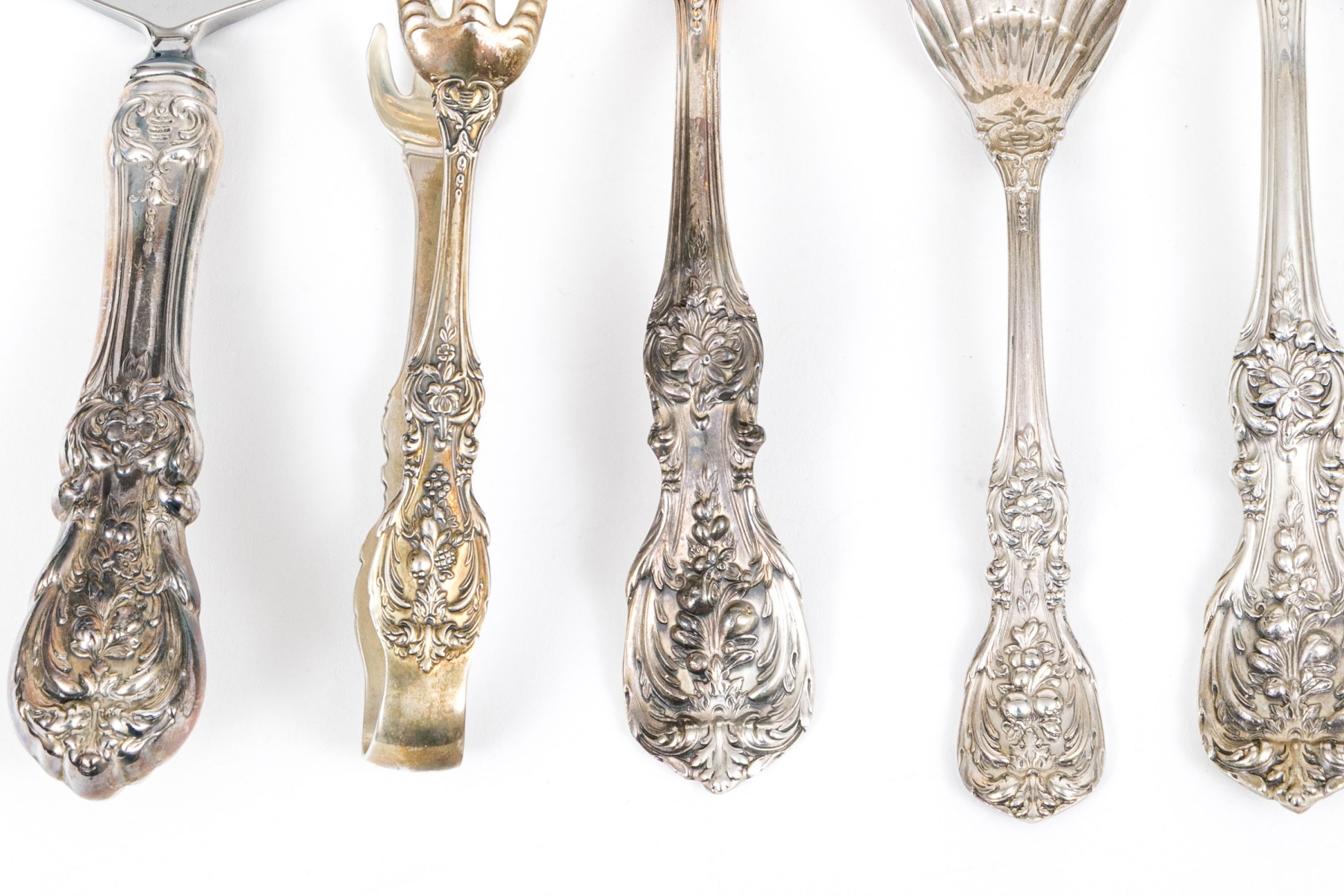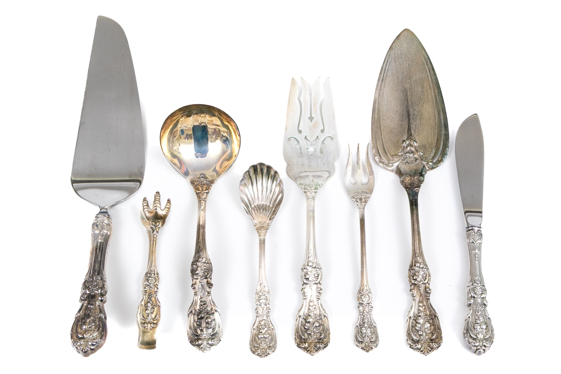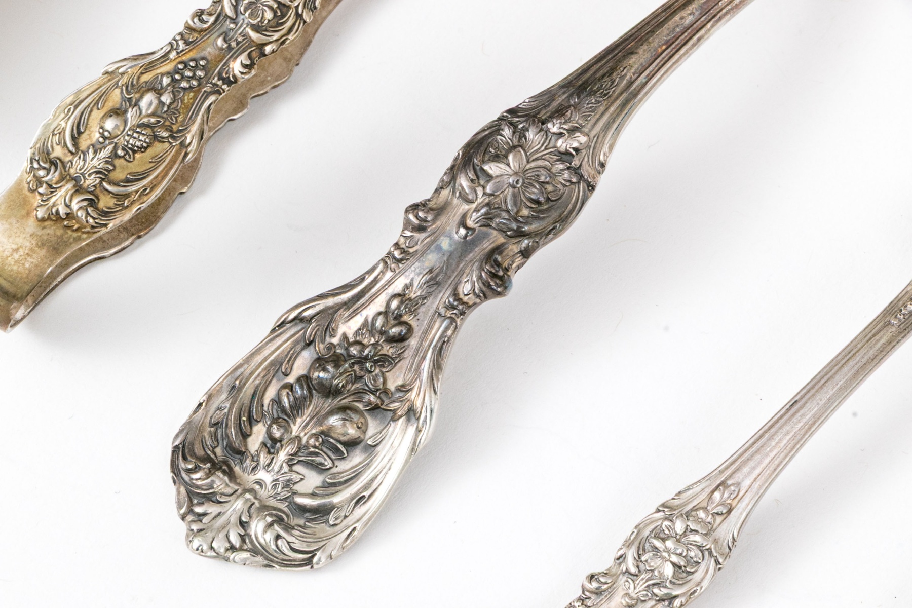 A wonderful collection of Reed & Barton "Francis I" sterling silver and sterling handled serving utensils designed with elegantly tapered stems and shapely handles with lavish berry, flower, and leaf relief.