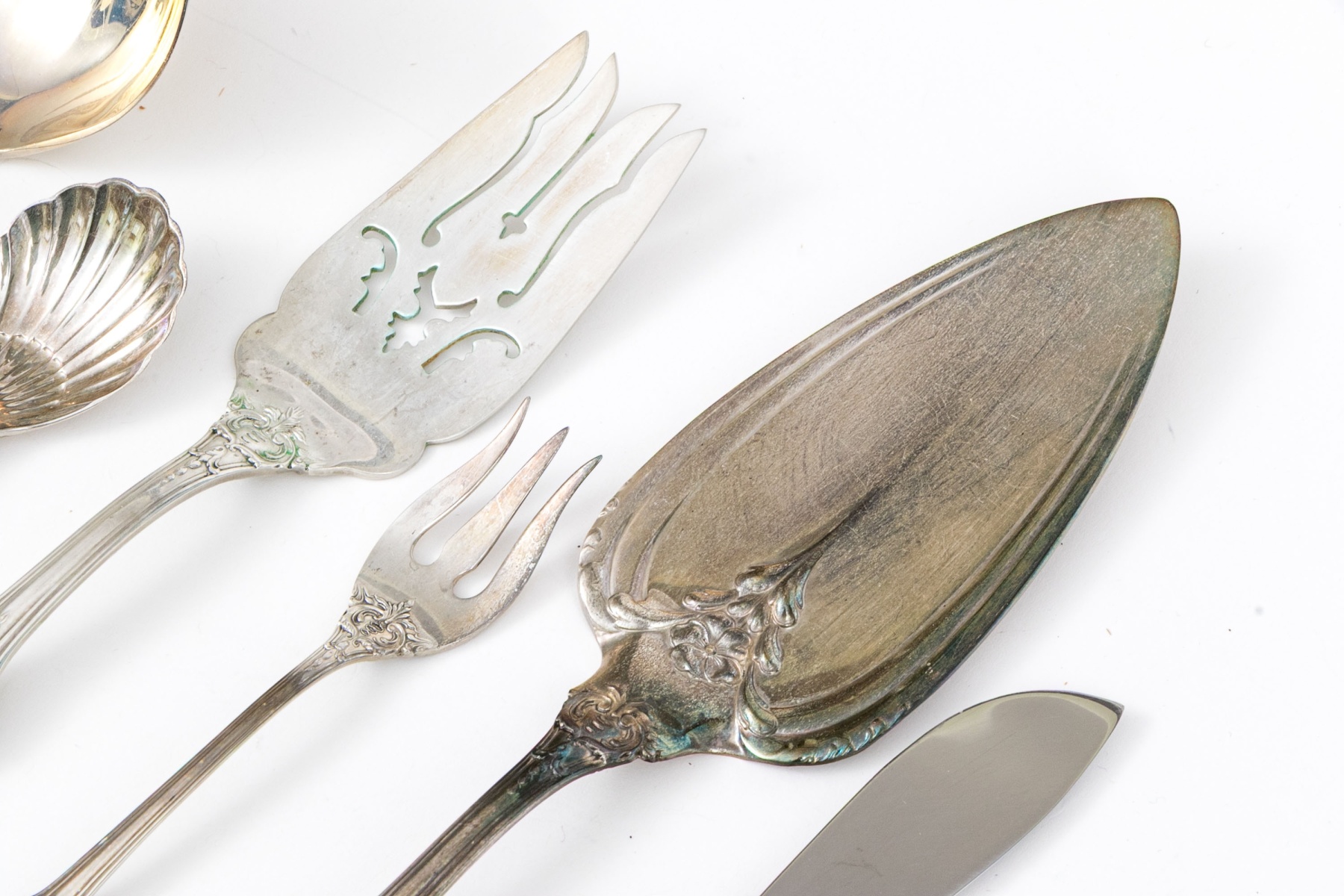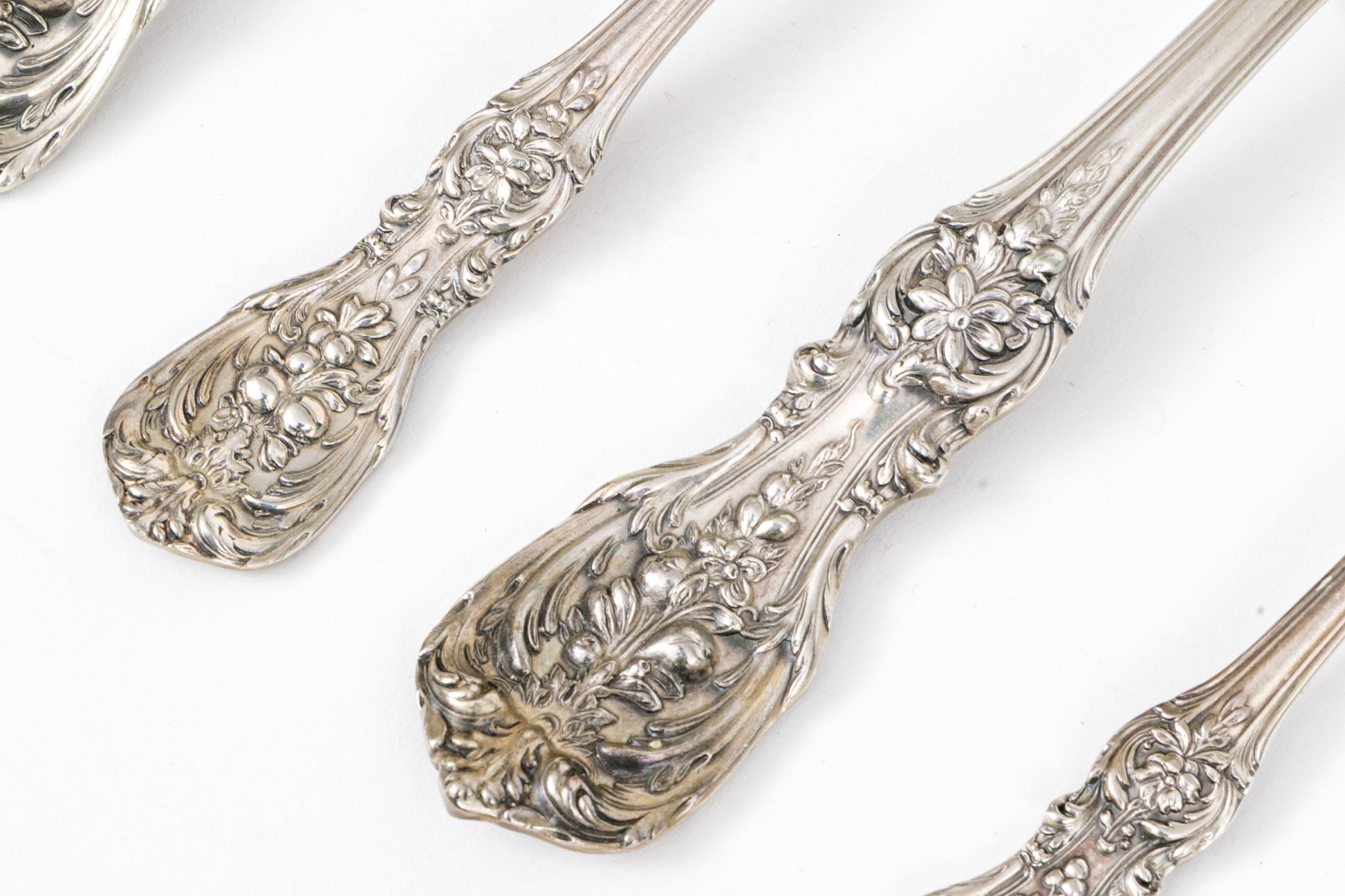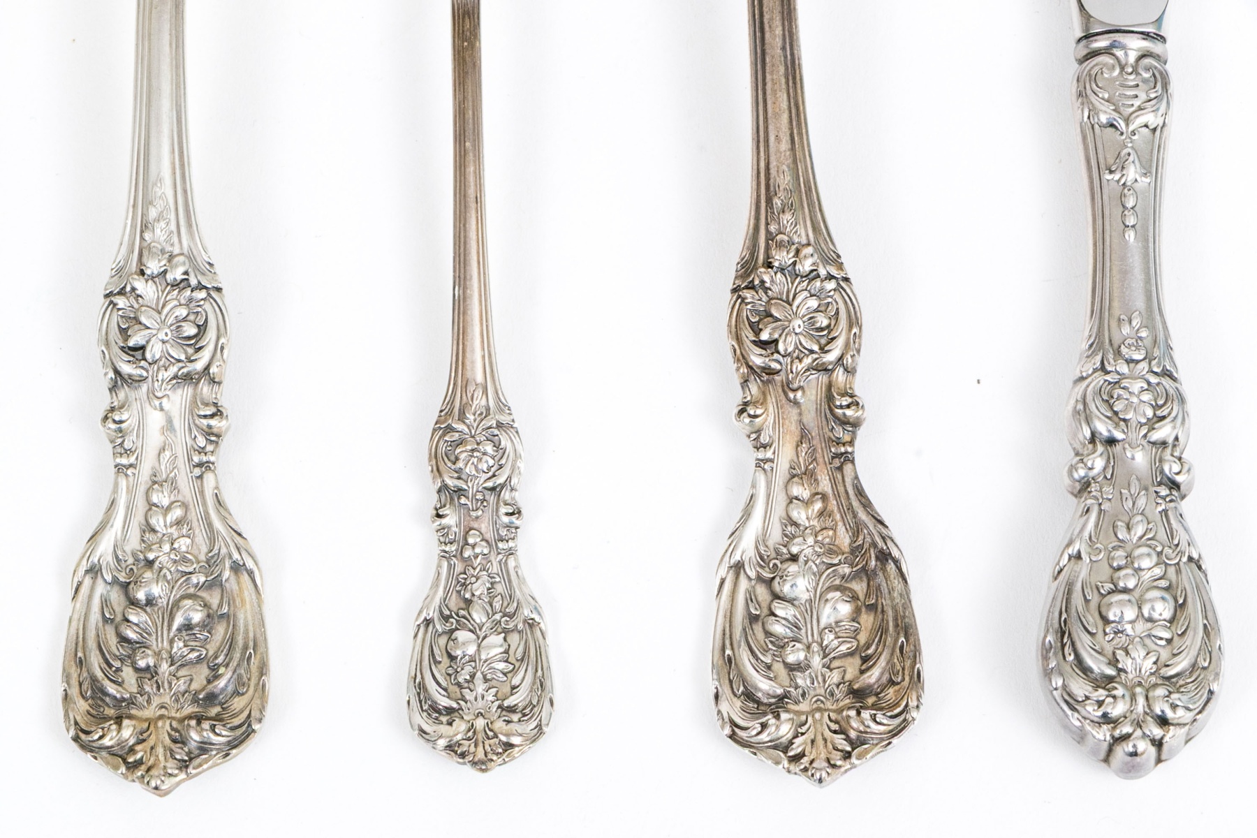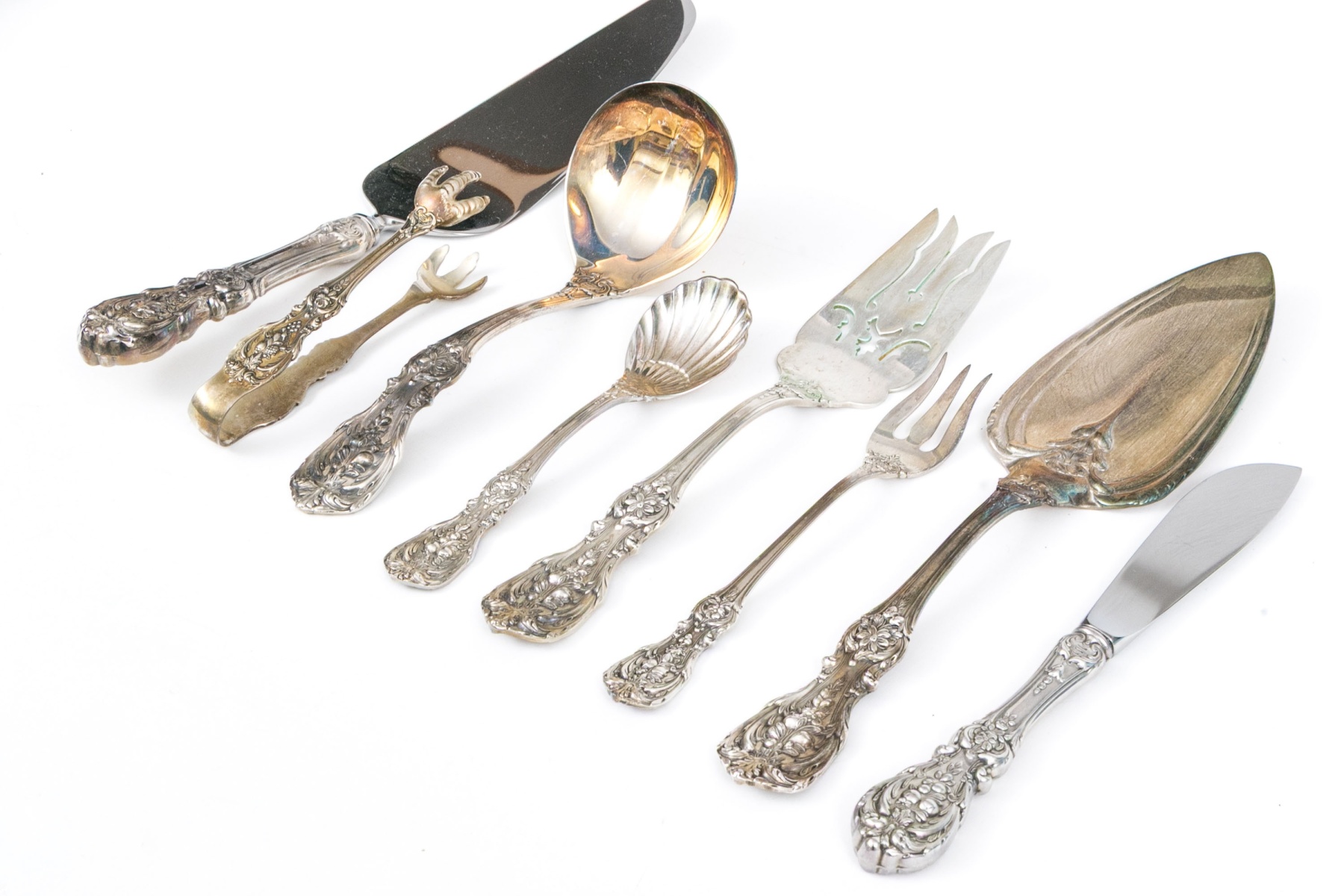 A wonderful collection of Reed & Barton "Francis I" sterling silver and sterling handled serving utensils designed with elegantly tapered stems and shapely handles with lavish berry, flower, and leaf relief.