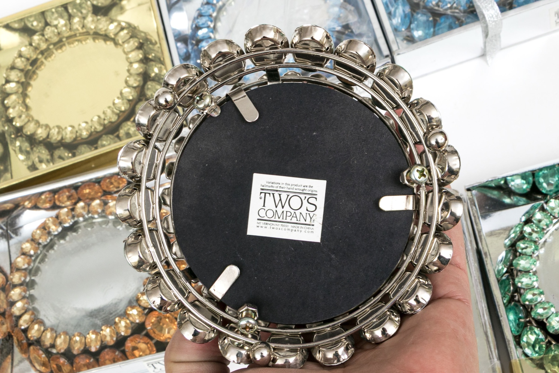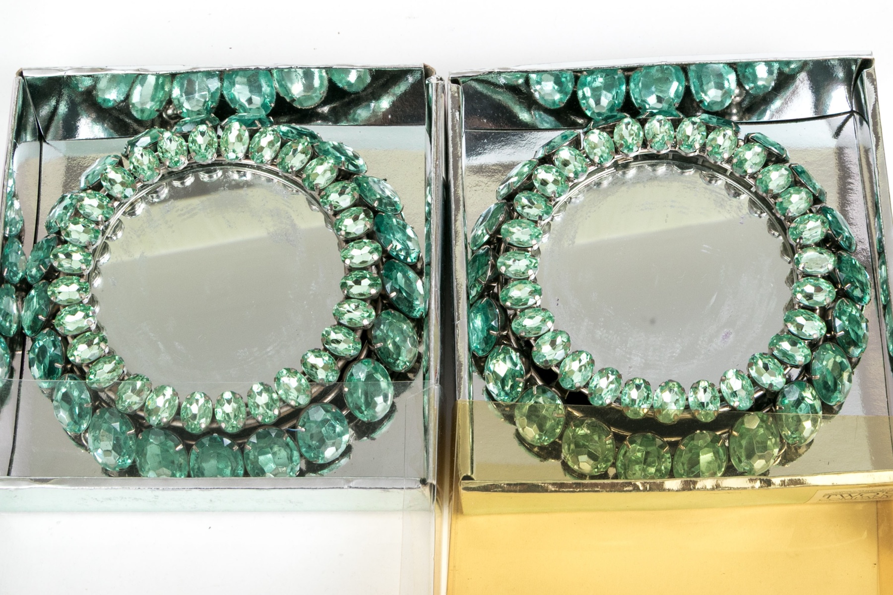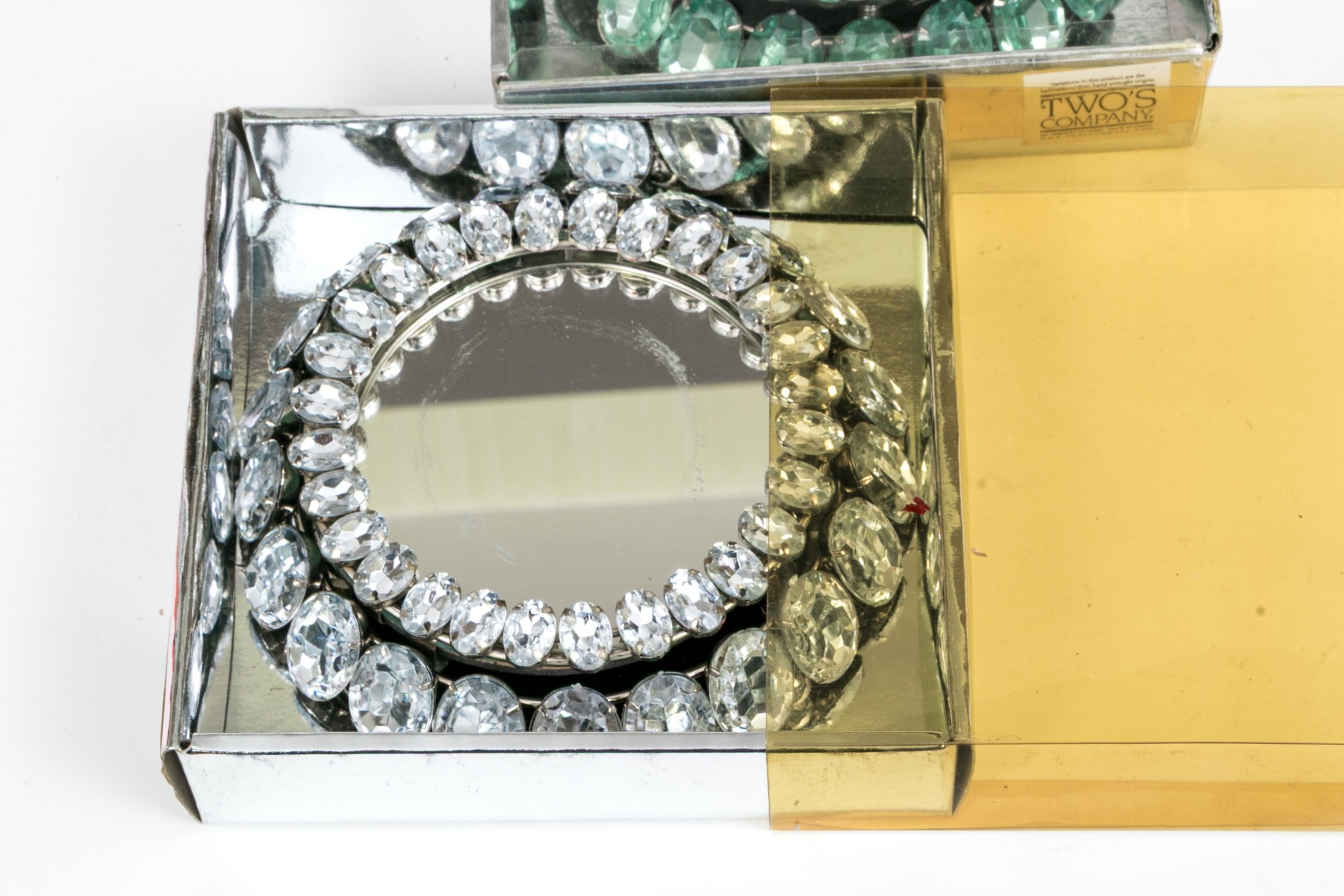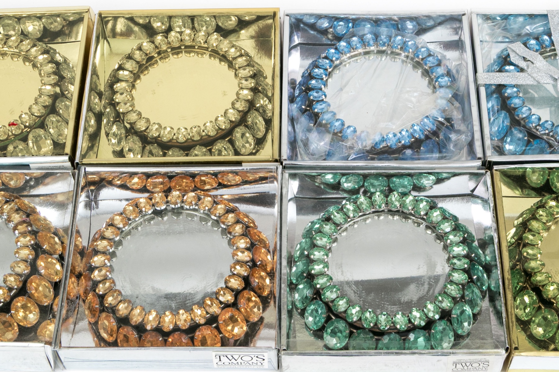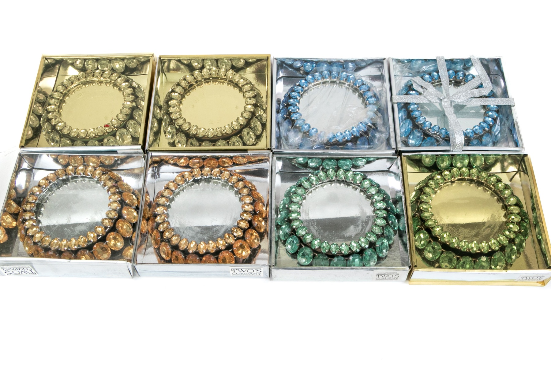 A delightful collection of Two's Company votive embellishers in four pairs, showcasing striking oval stones in clear, blue, orange, and green surrounding mirror bases for a chic and elegant flair.