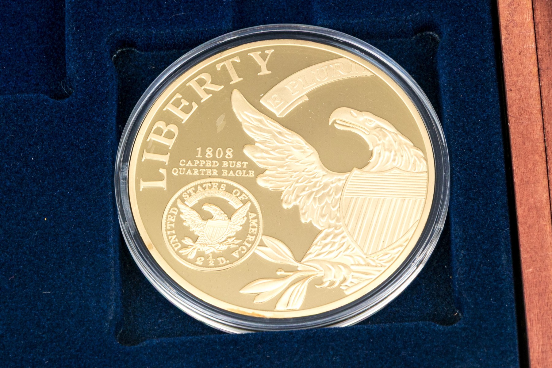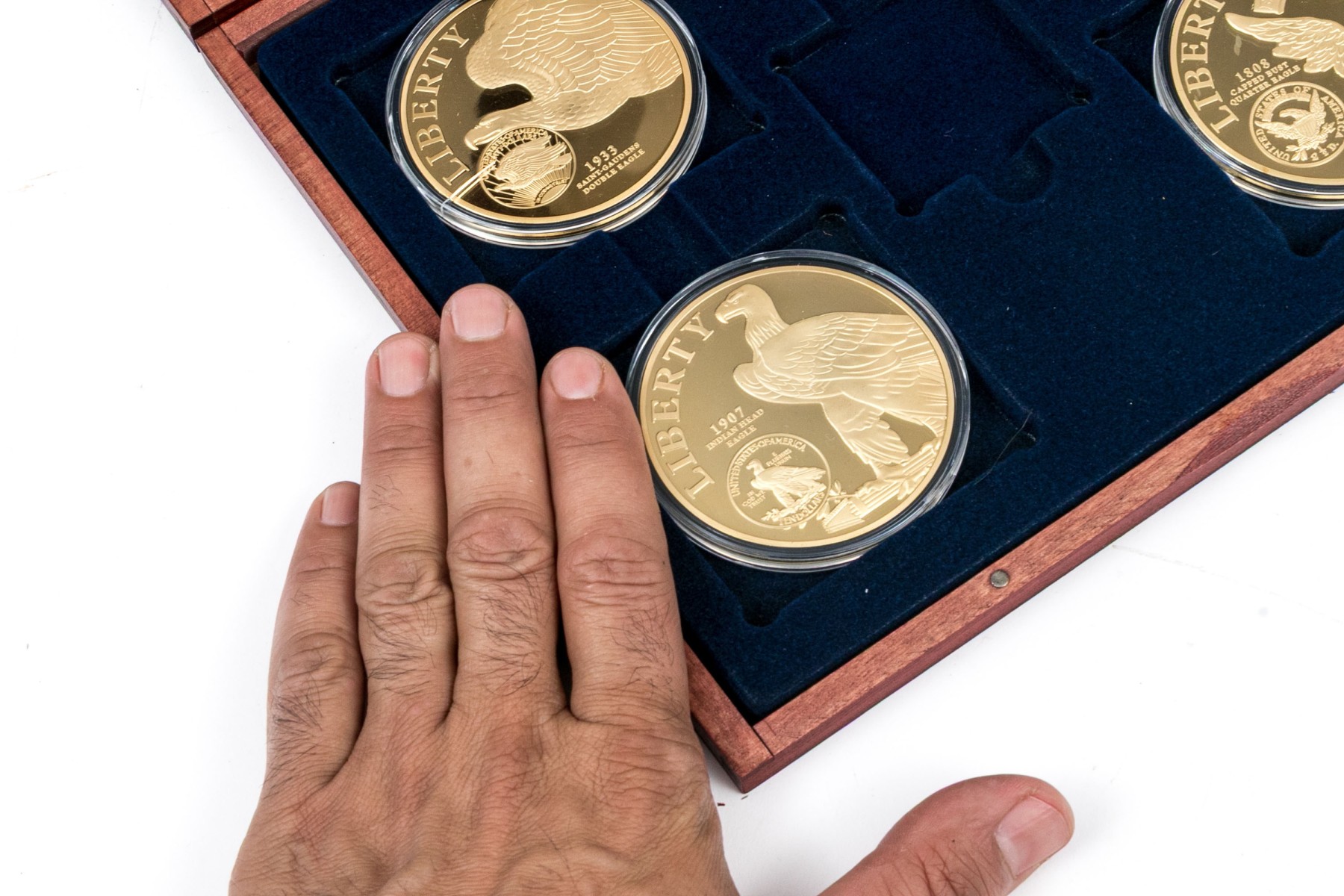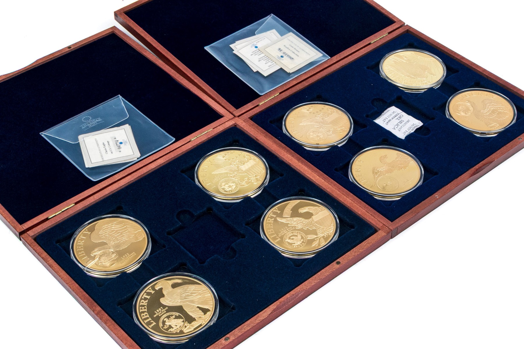 Two hinged cases, with four gilt silver plated coins with lucite cases in each totaling eight coins.