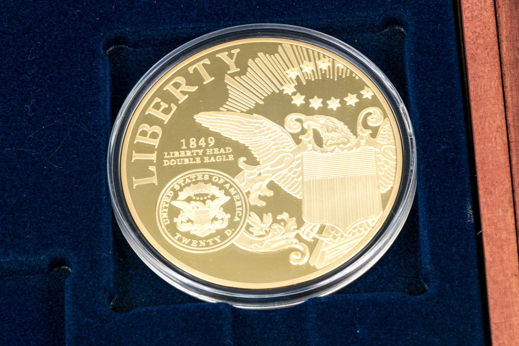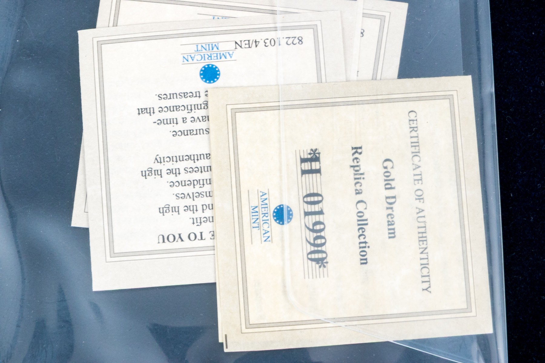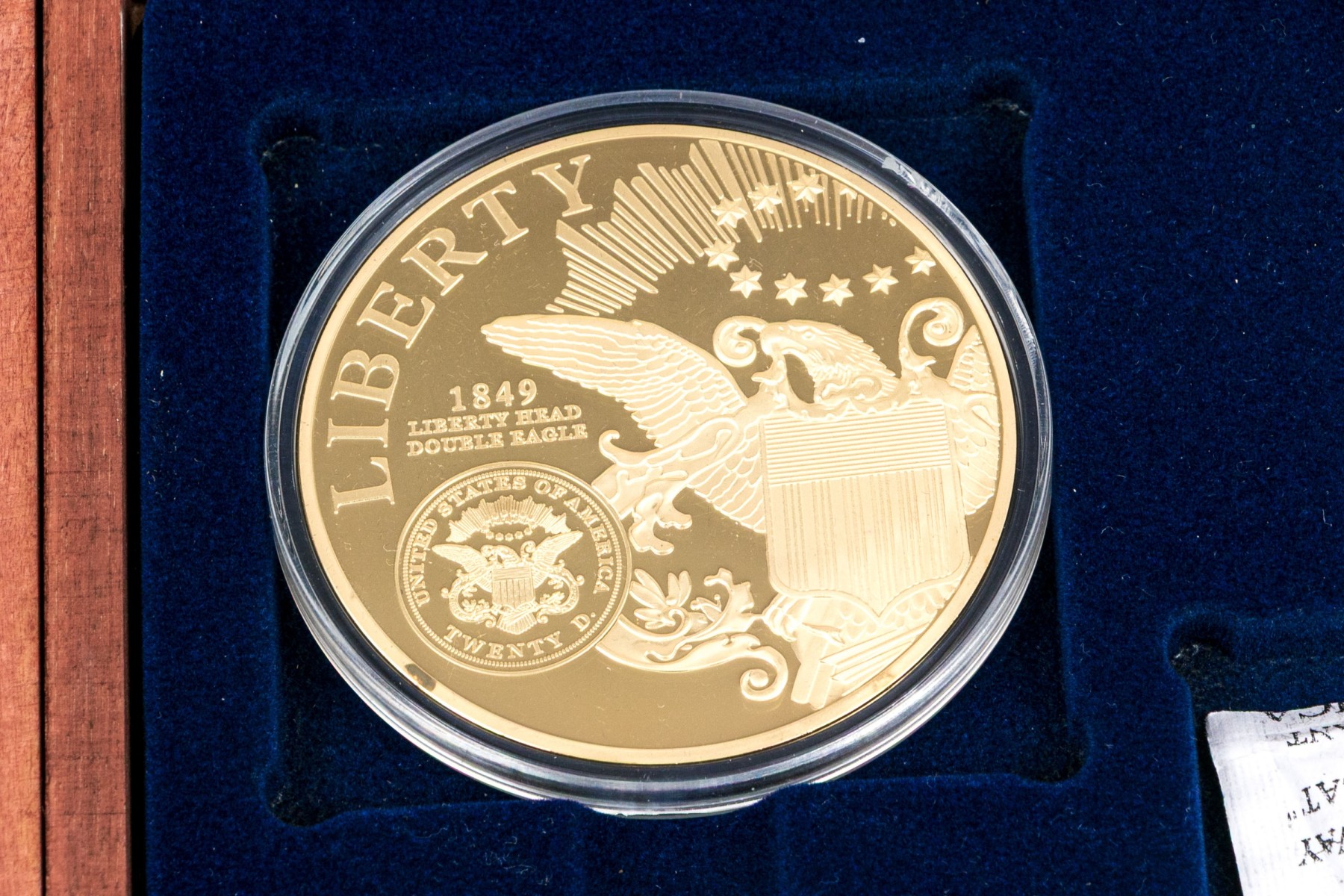 Two hinged cases, with four gilt silver plated coins with lucite cases in each totaling eight coins.