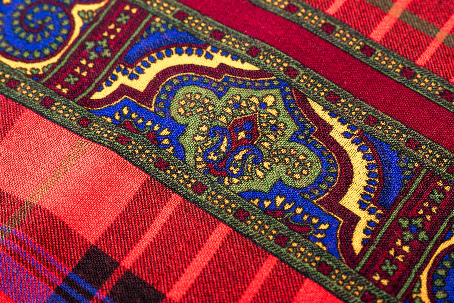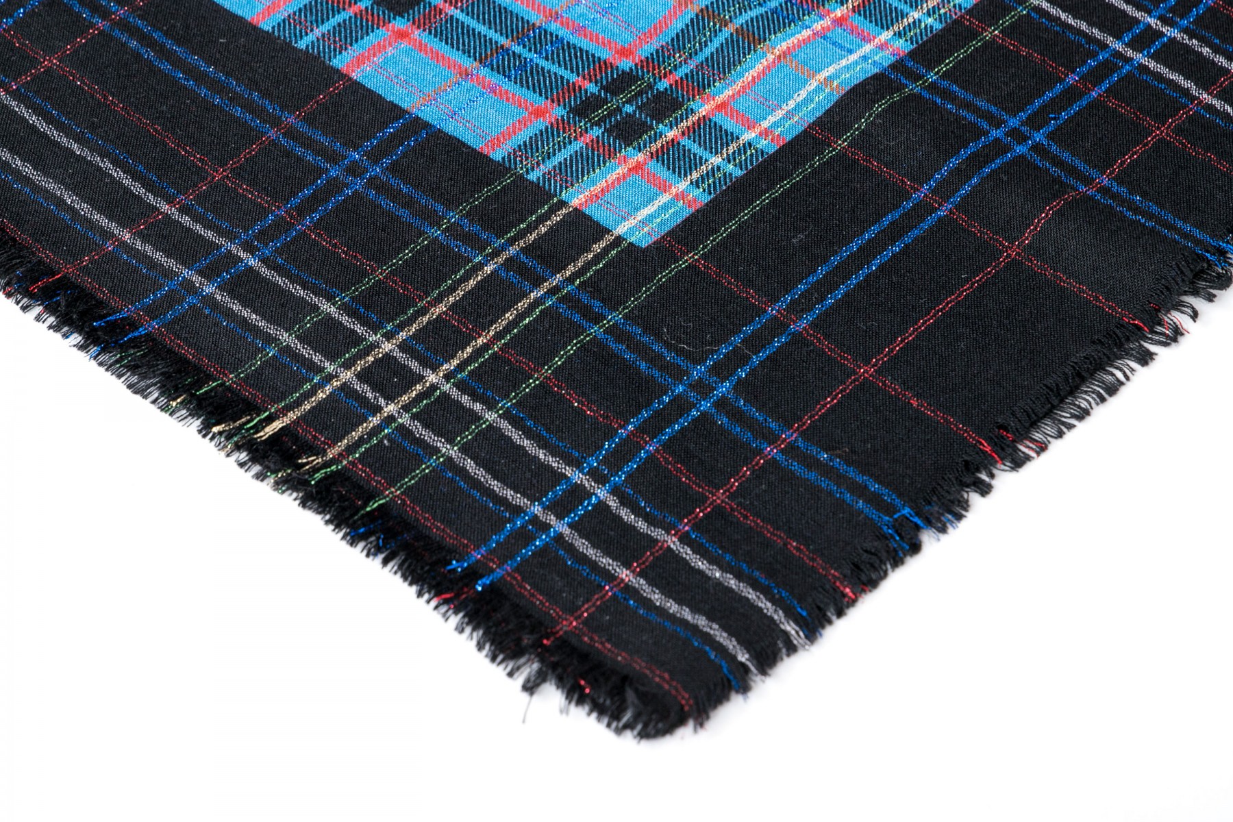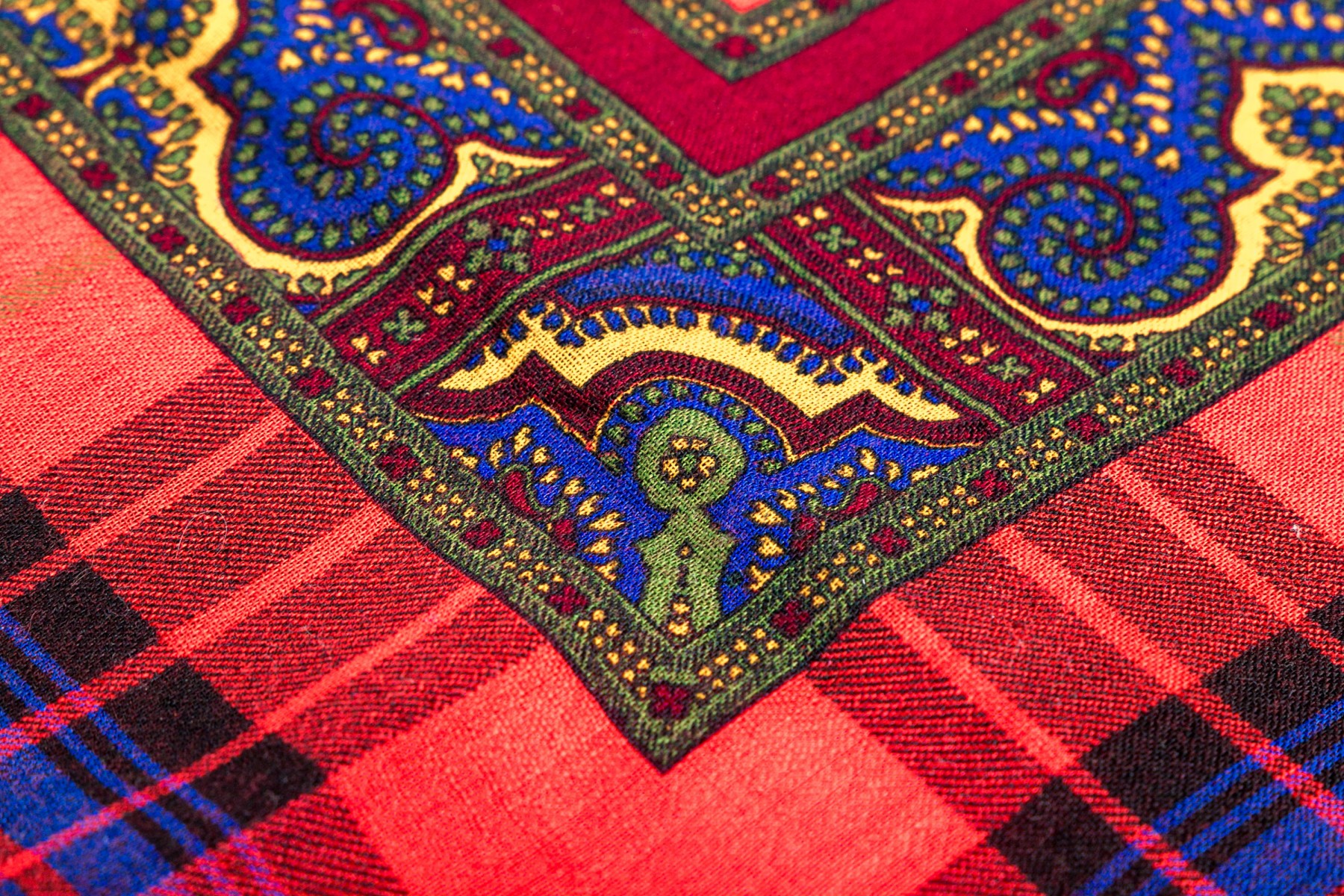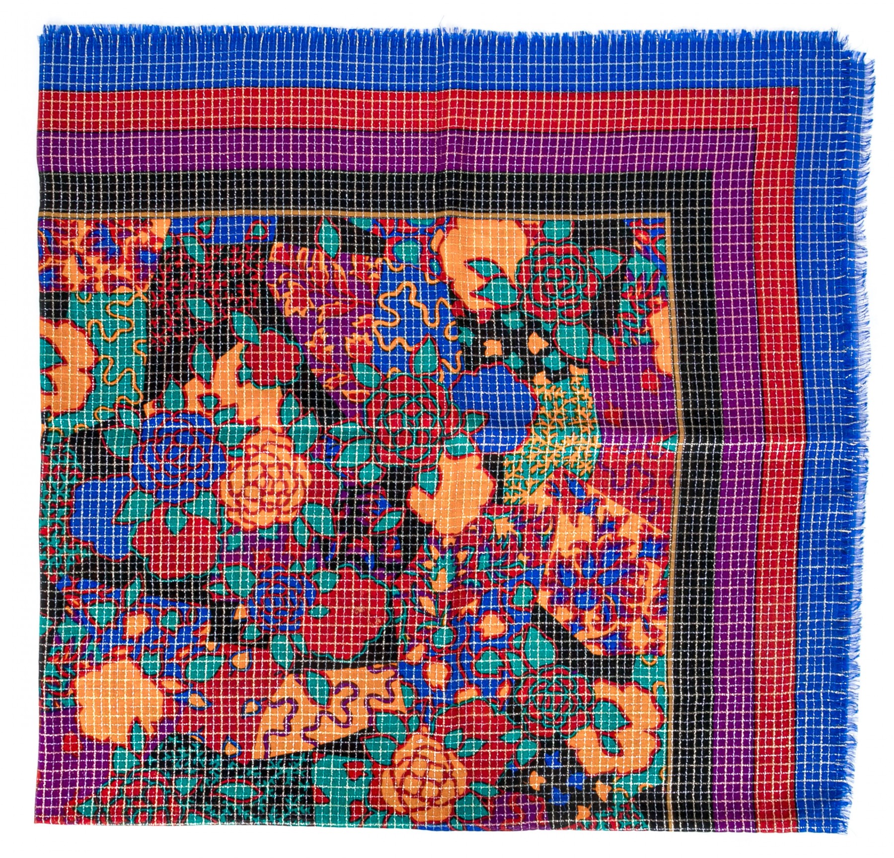 Dimensions: Sizes vary 53" x 53"-Red Plaid, black butterflies, Four Multicolored with Fringe Edges, 64" L x 14 1/2" W-Cream Scarf with Fringe.
