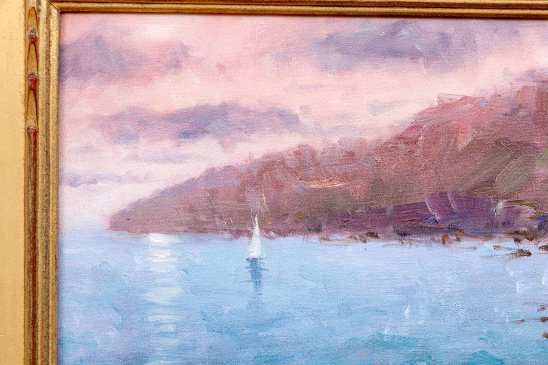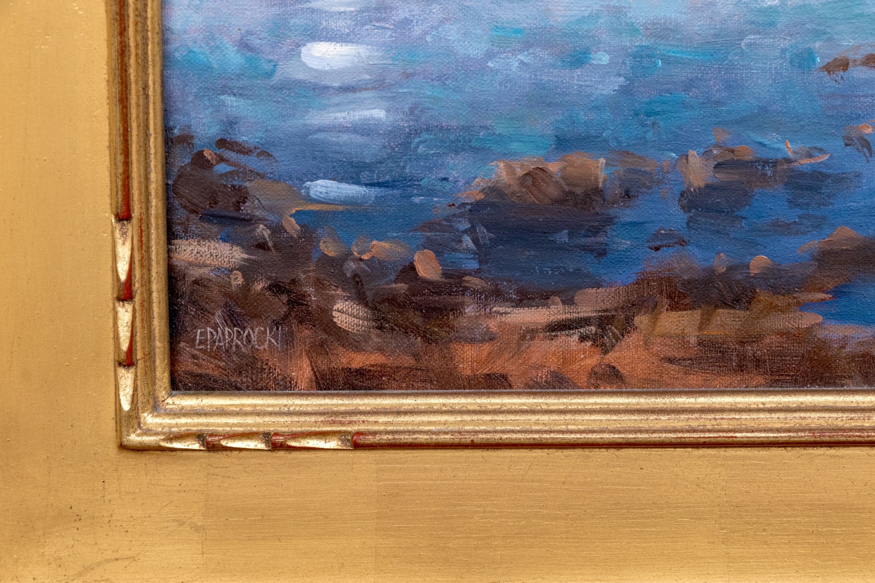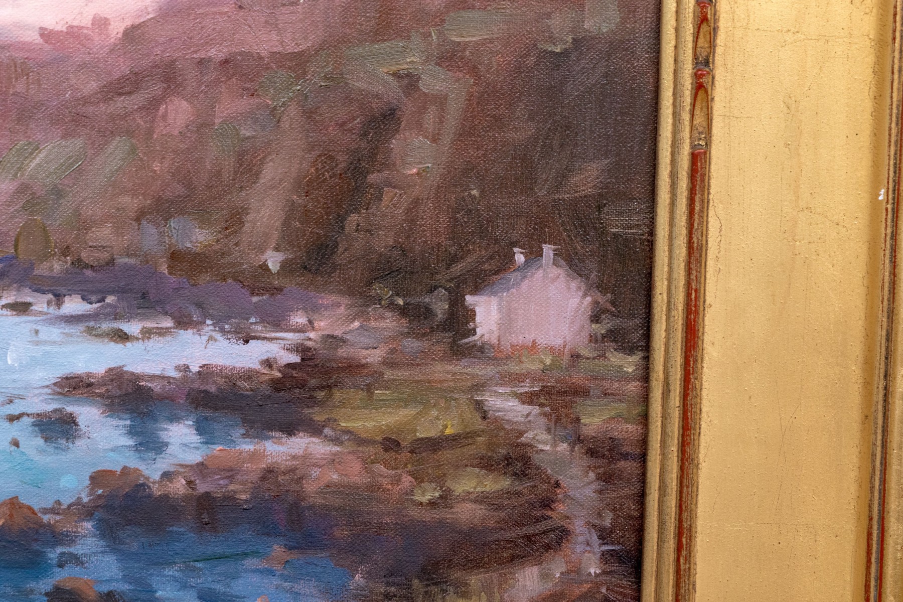 EJ Paprocki (American, b. 1971) oil painting on canvas depicting an impressionist coastal landscape with a lone sailboat on a calm, vibrant blue and purple dappled inlet leading to a narrow shoreline with a path extending down towards a white cottage embraced by a tapering cliffside. Signed lower left.