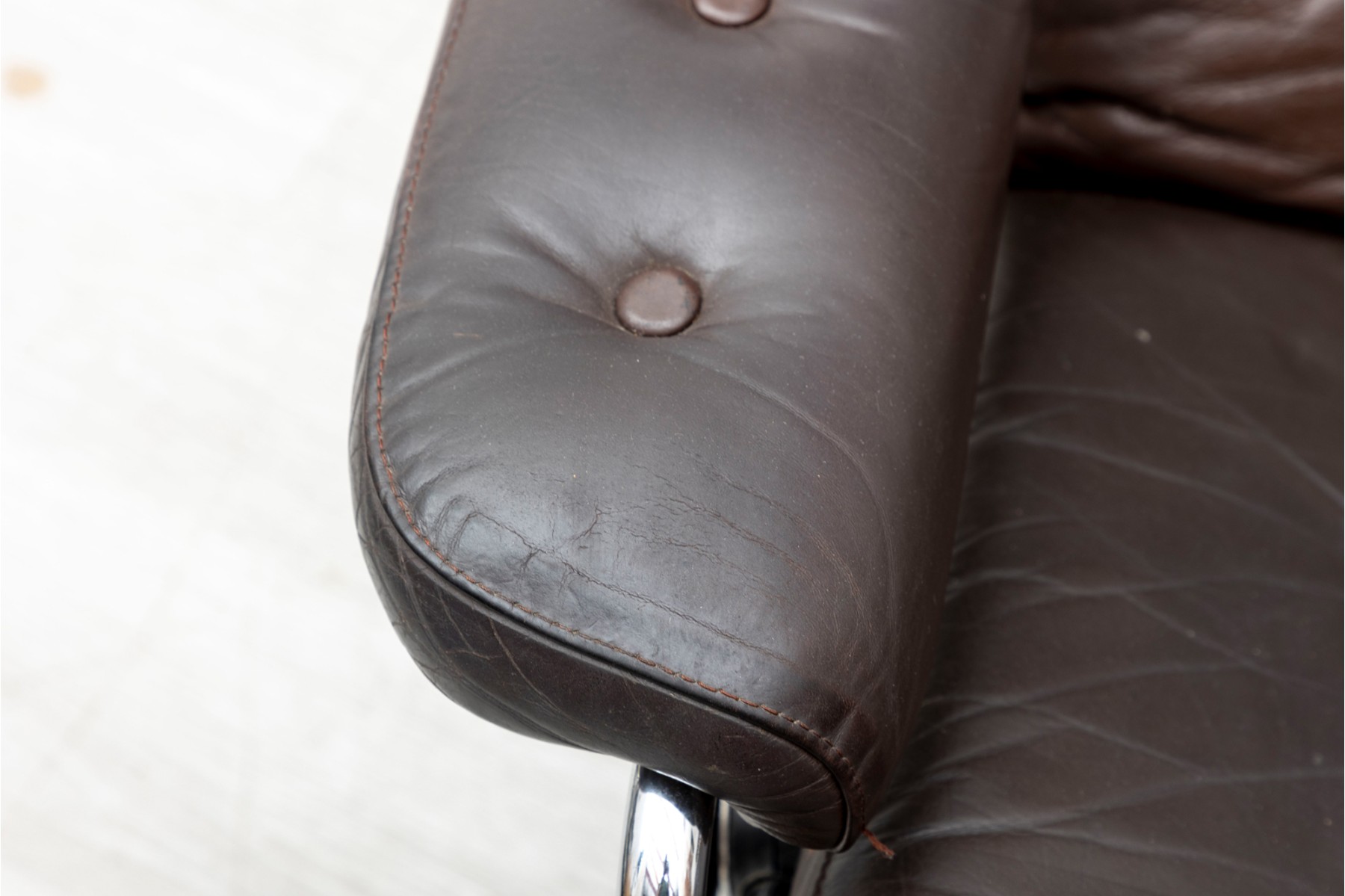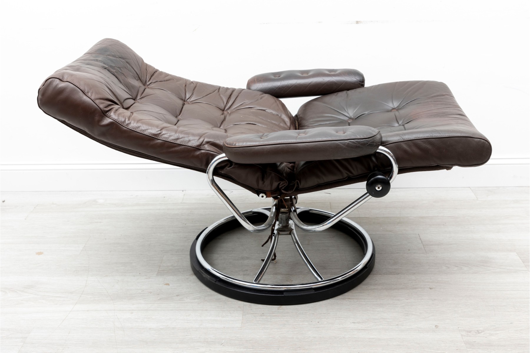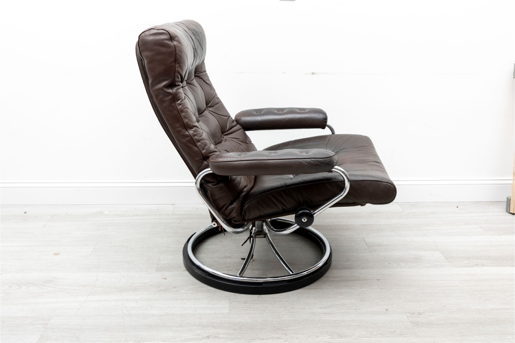 Ekornes Stressless reclining lounge chair. Elegant mid century Scandinavian design with tubular bent chrome frame and brown leather button tufted cushions.