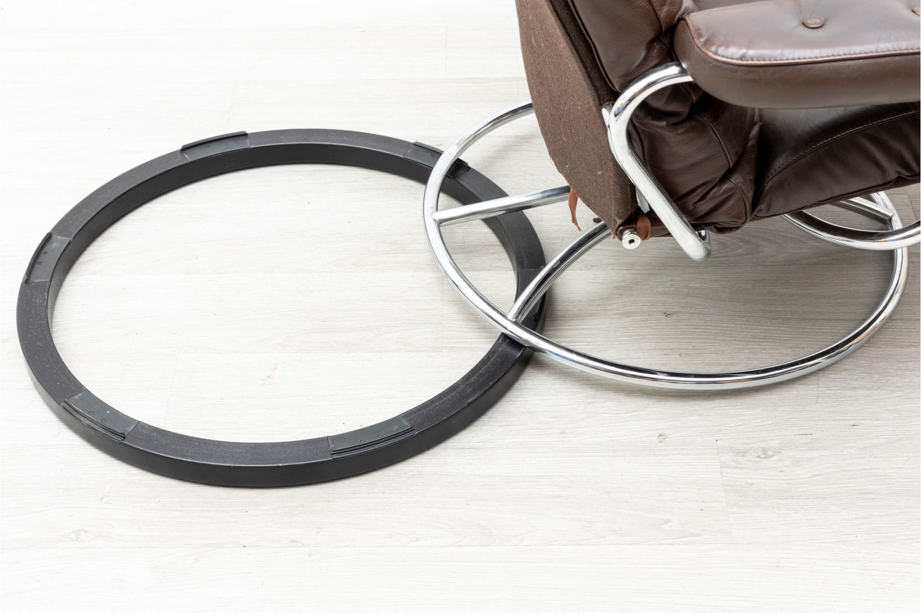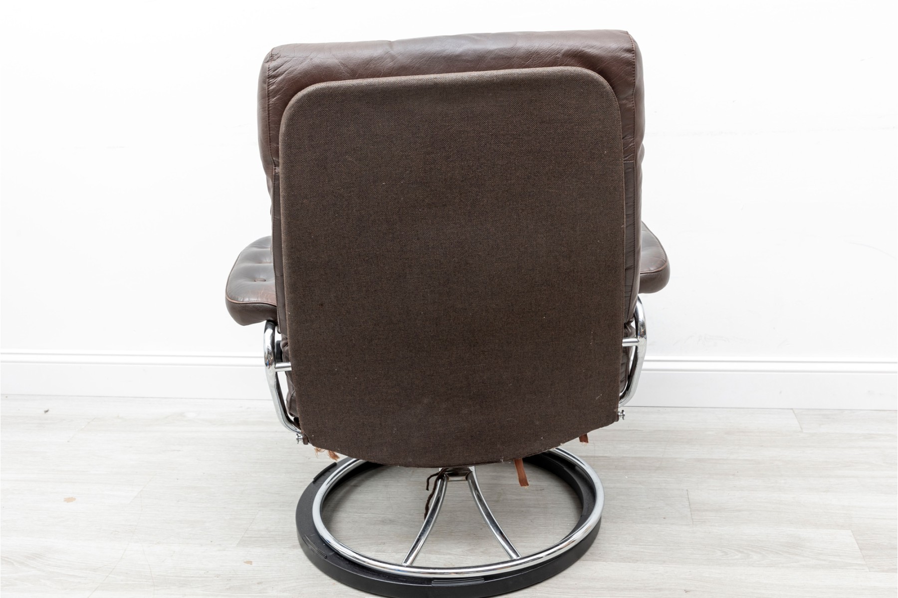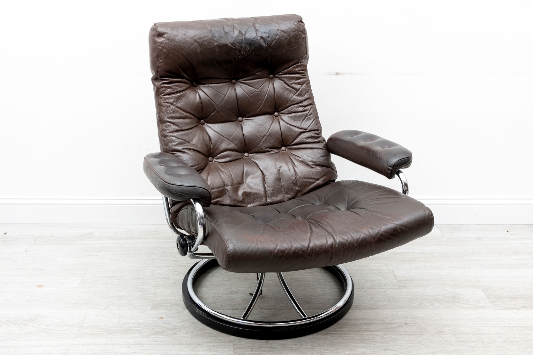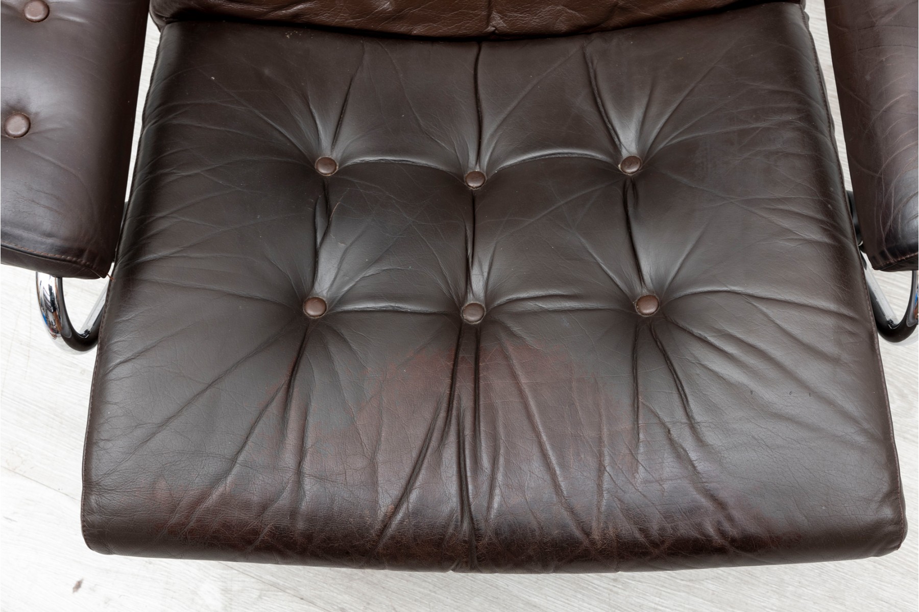 Ekornes Stressless reclining lounge chair. Elegant mid century Scandinavian design with tubular bent chrome frame and brown leather button tufted cushions.