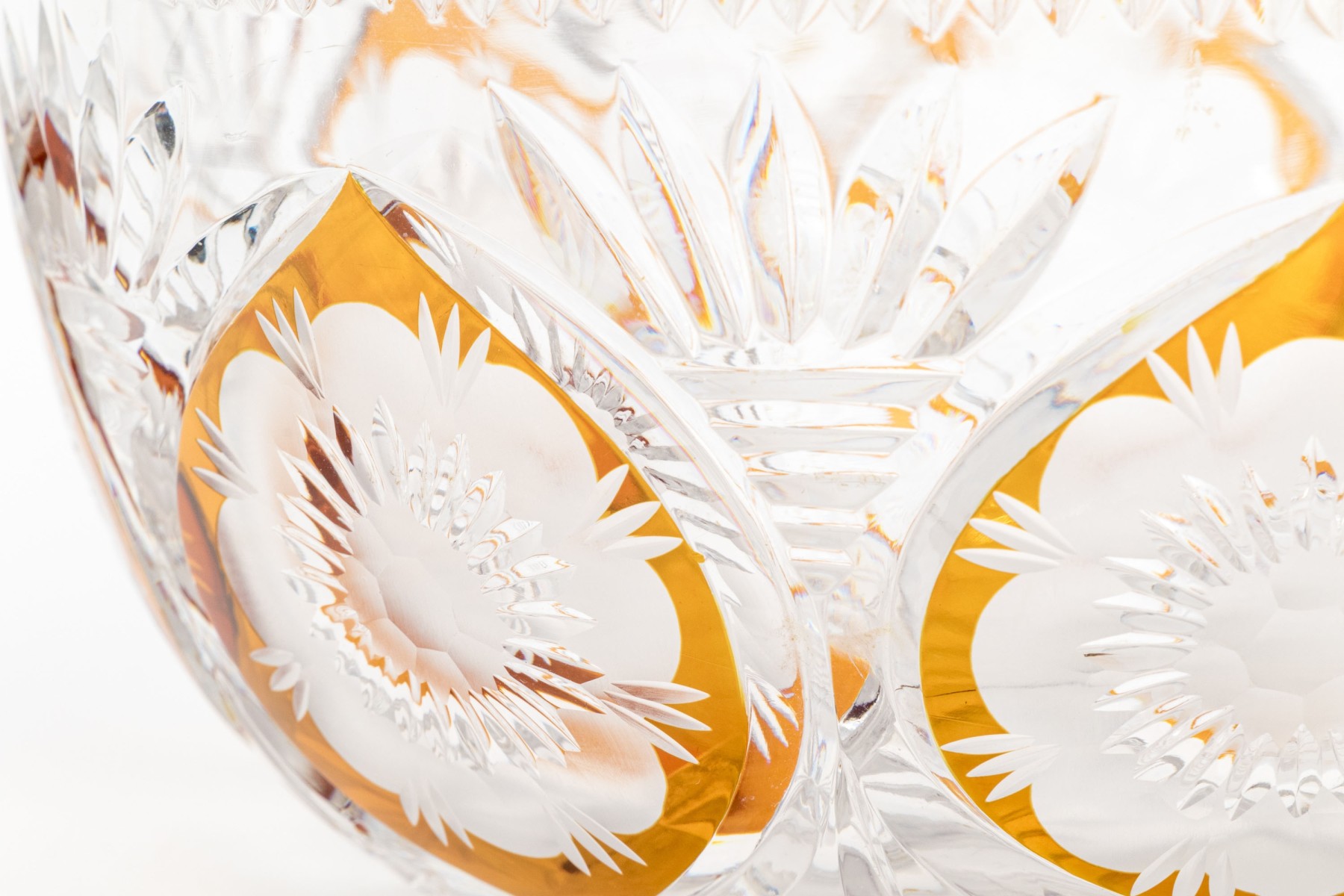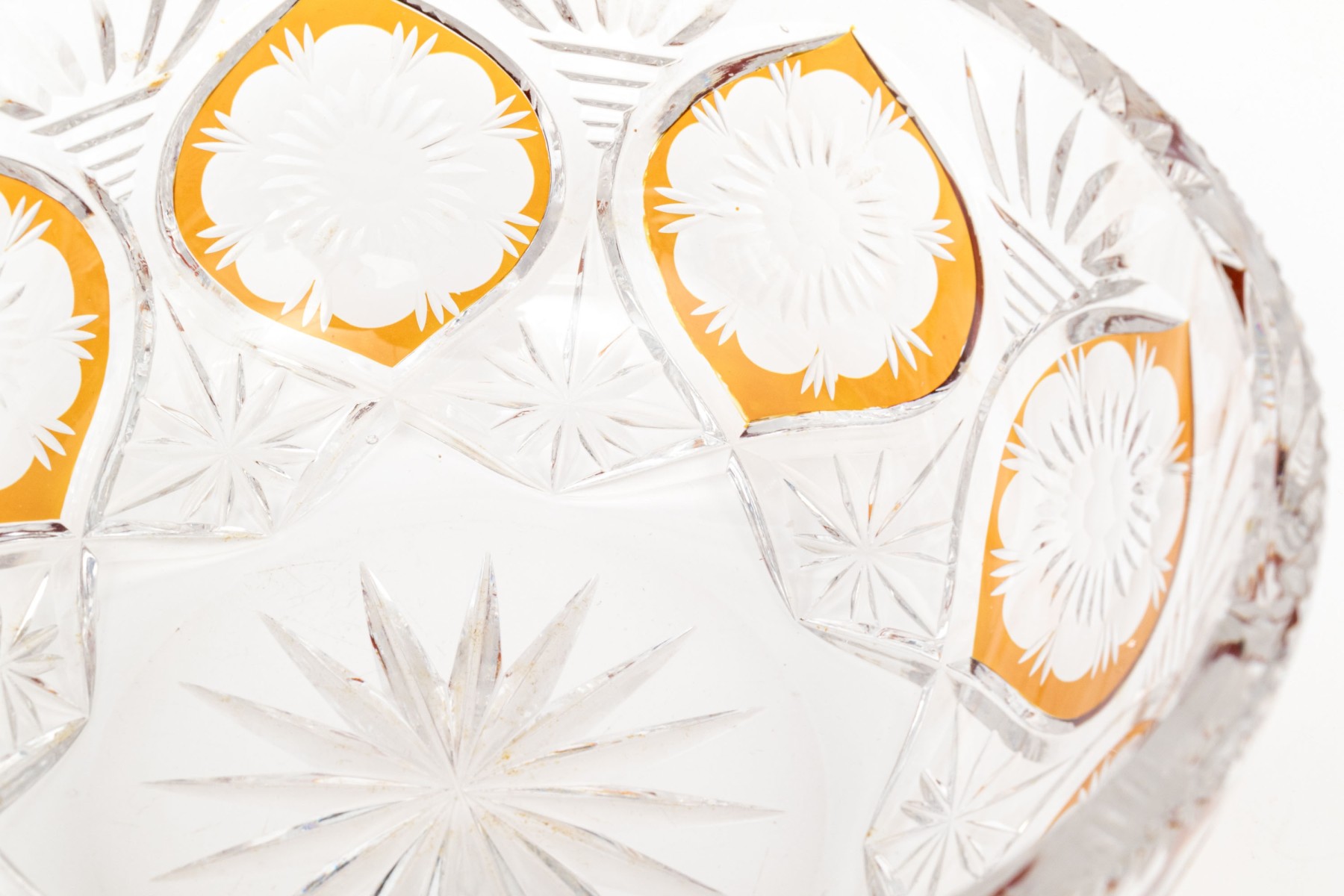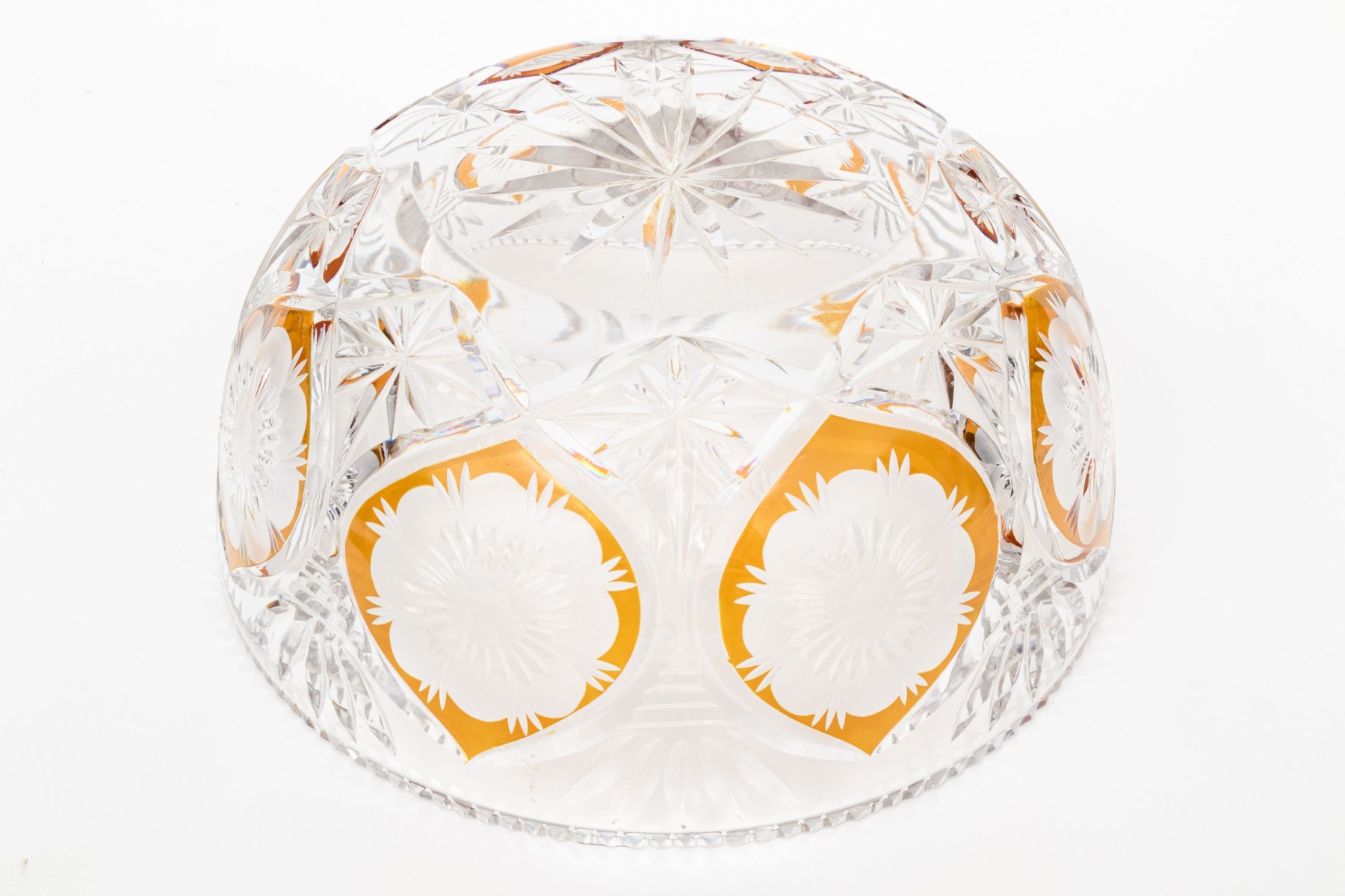 The bowl with frosted glass medallions framed in tan along with cut palmettes. Sunburst base.