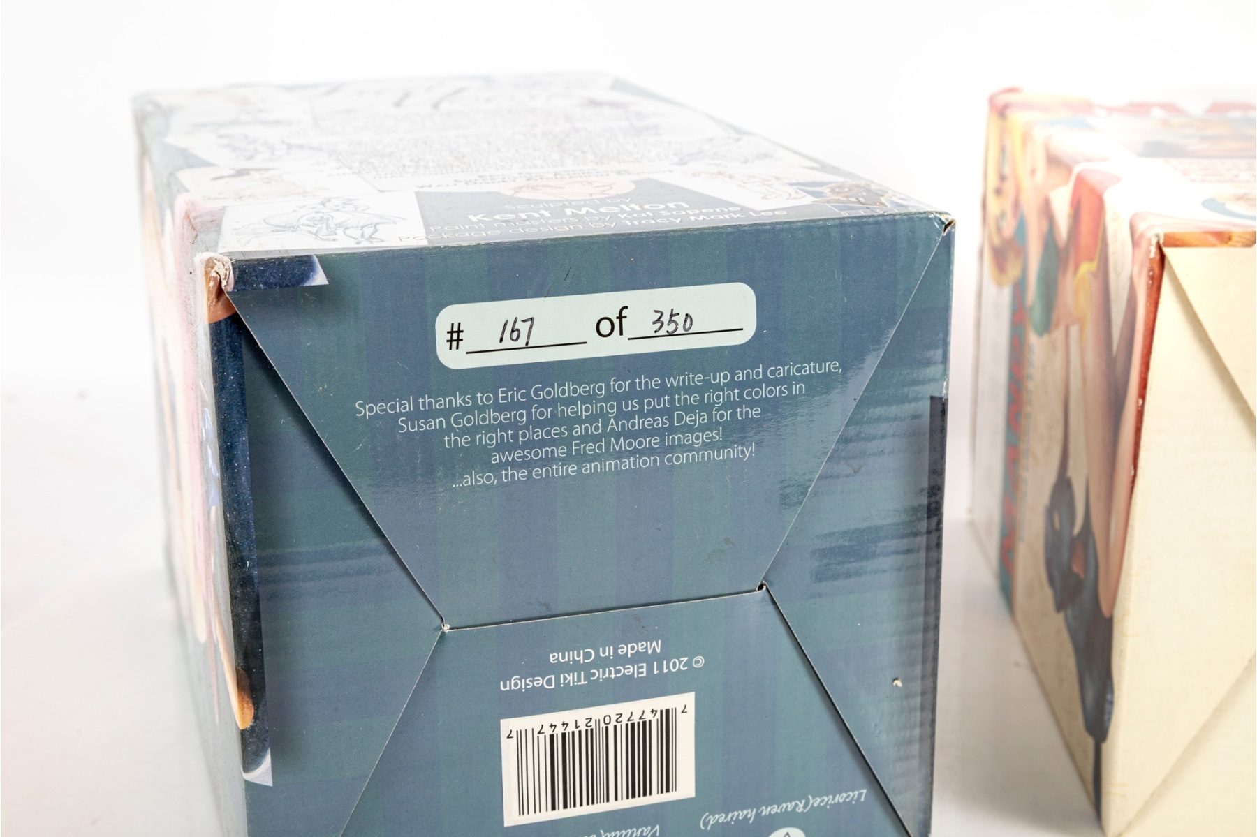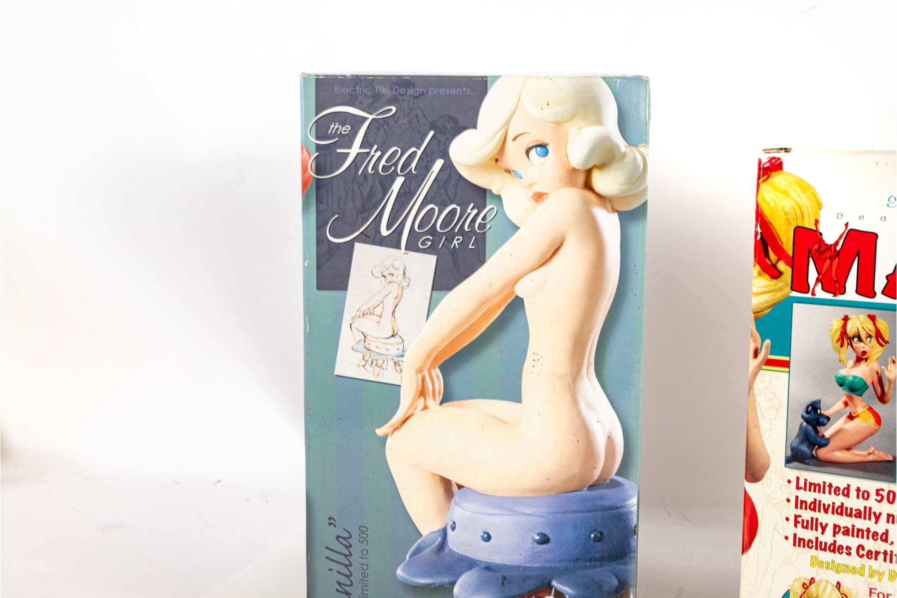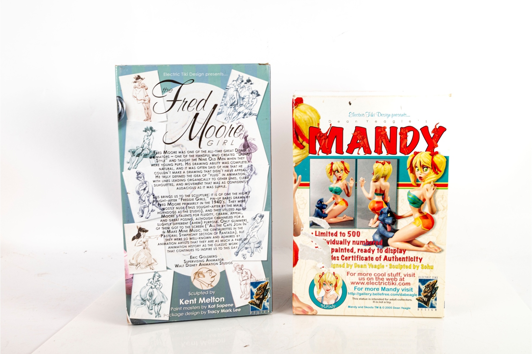 Pair of limited-edition Electric Tiki Design resin statues inspired by iconic animation and pin-up art.