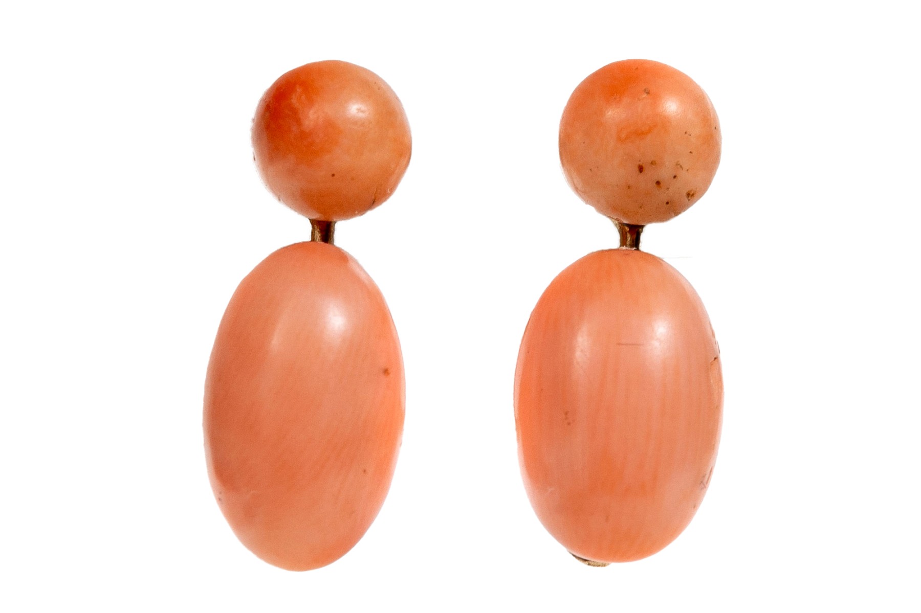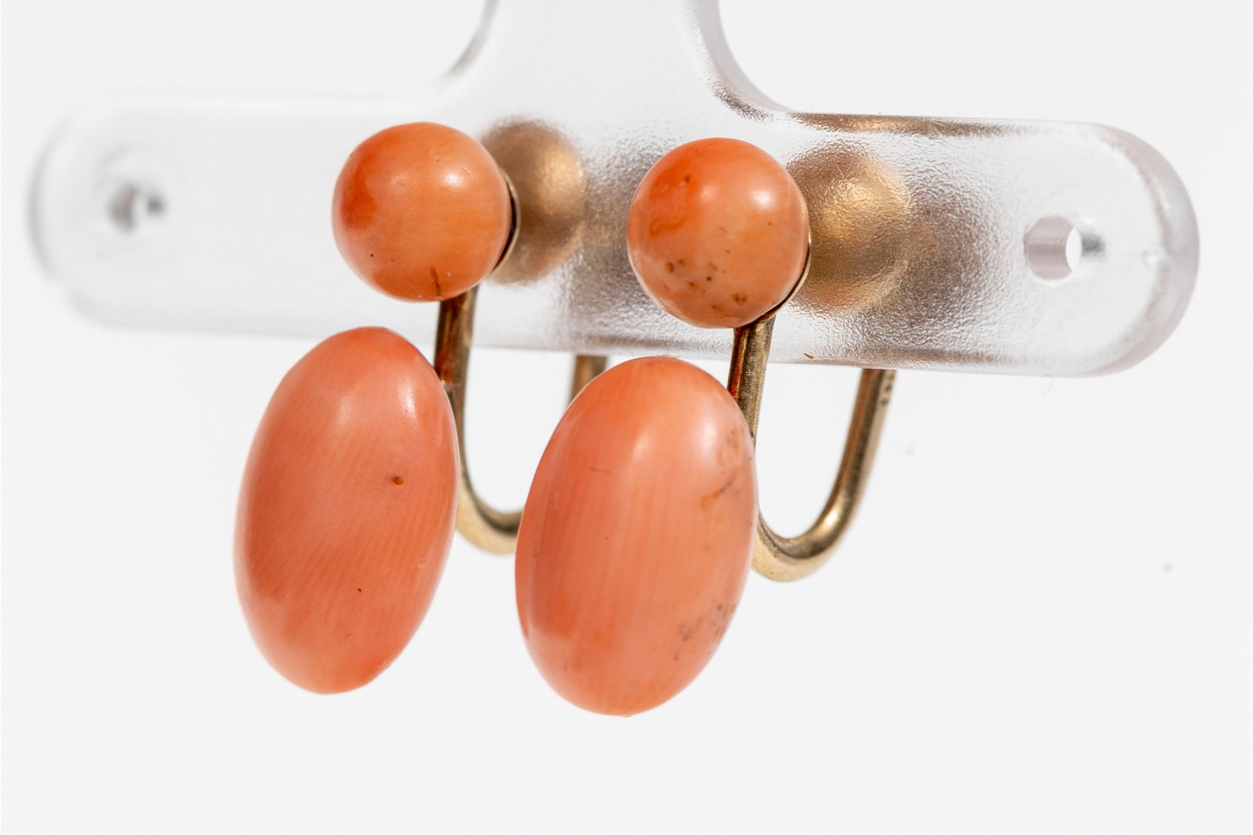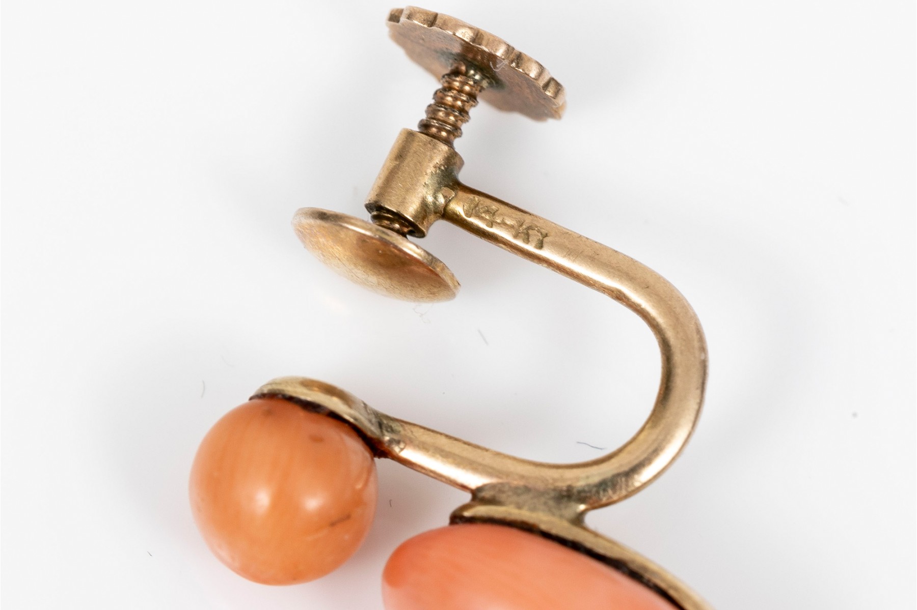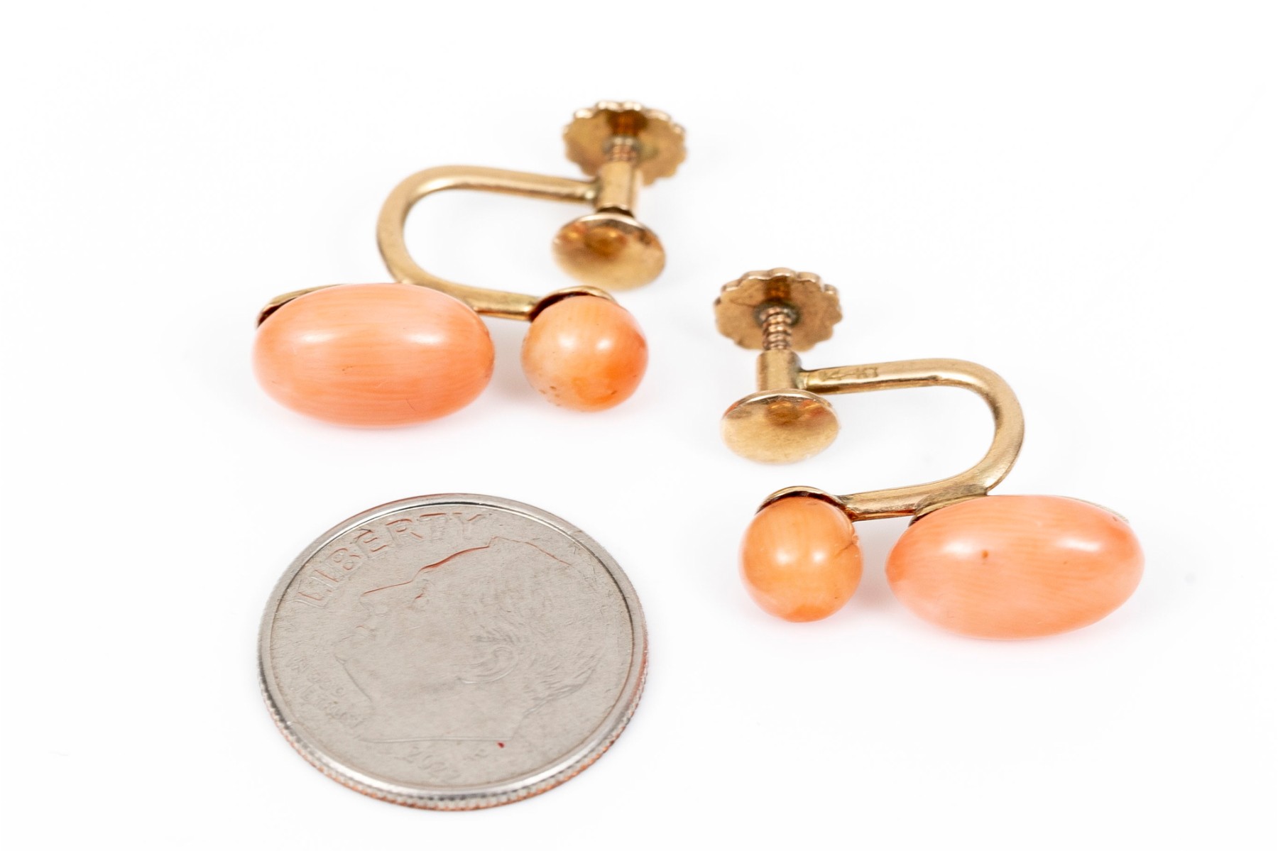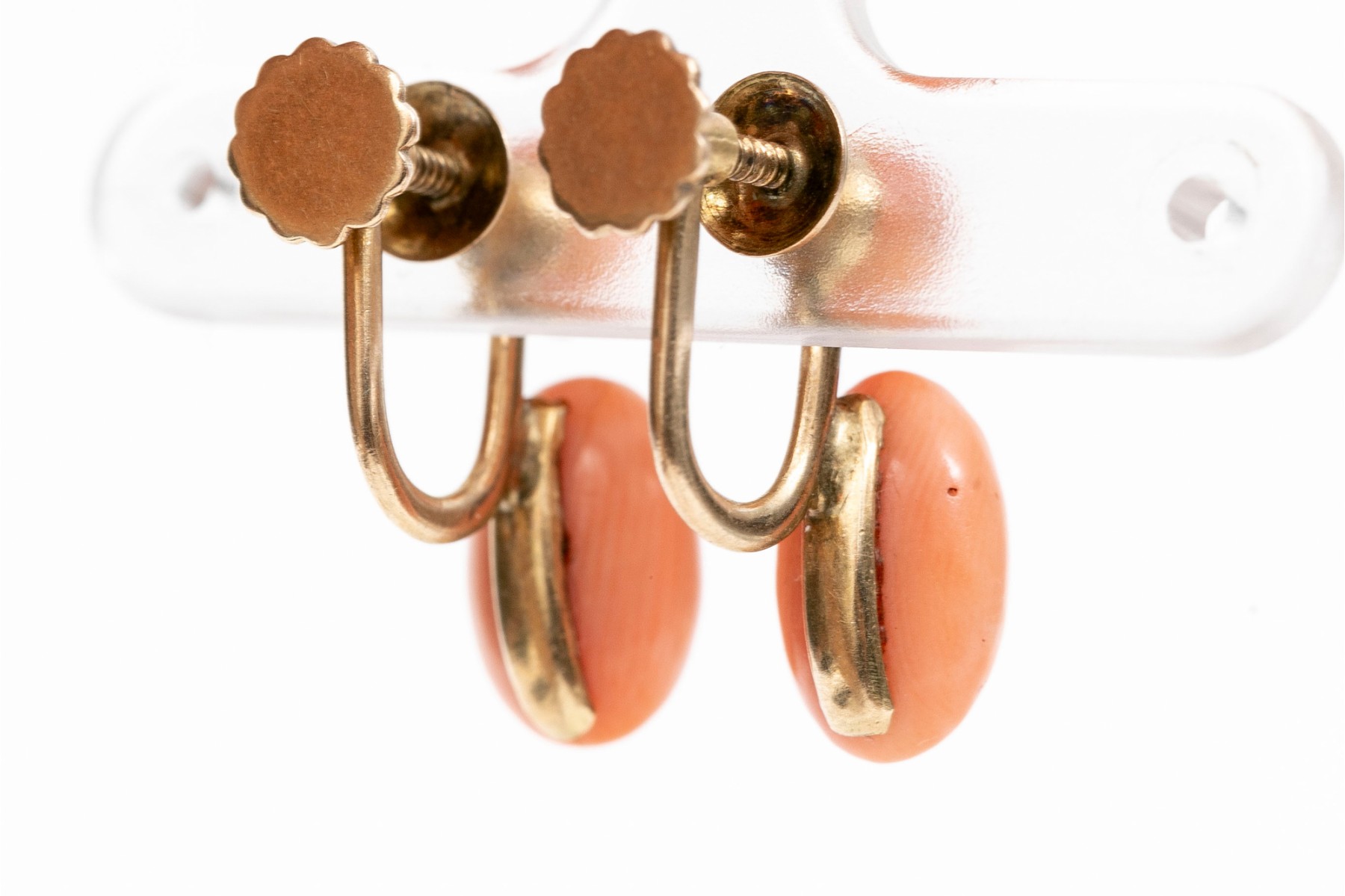 A pair of 14K yellow gold earrings. Set into the face of the earrings are round and oval carved coral. The earrings have a screw clip style backing.