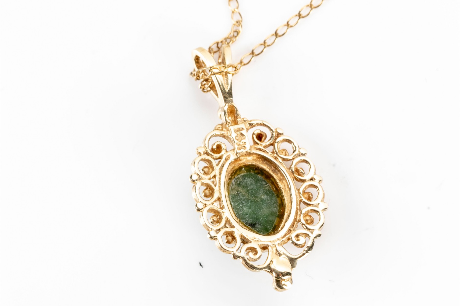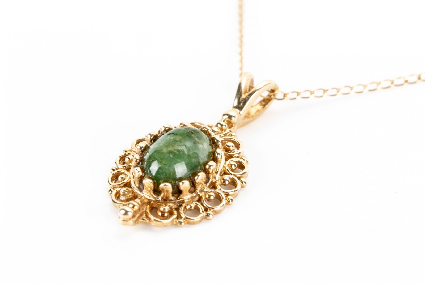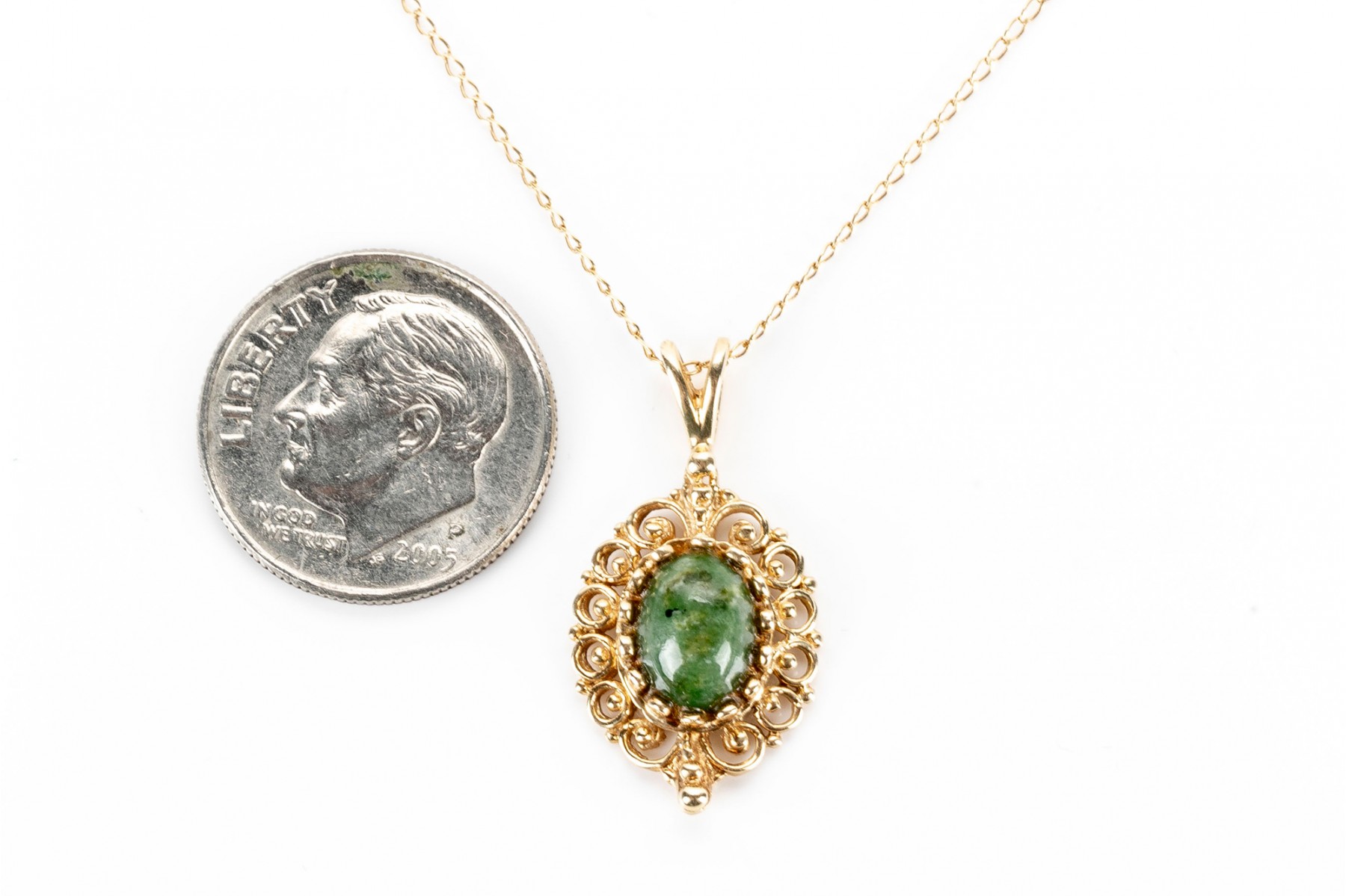 A 14K yellow gold pendant necklace. Displayed on a delicate cable link style chain is a pendant with an elegant open frame around a green serpentine stone. Spring ring clasp.