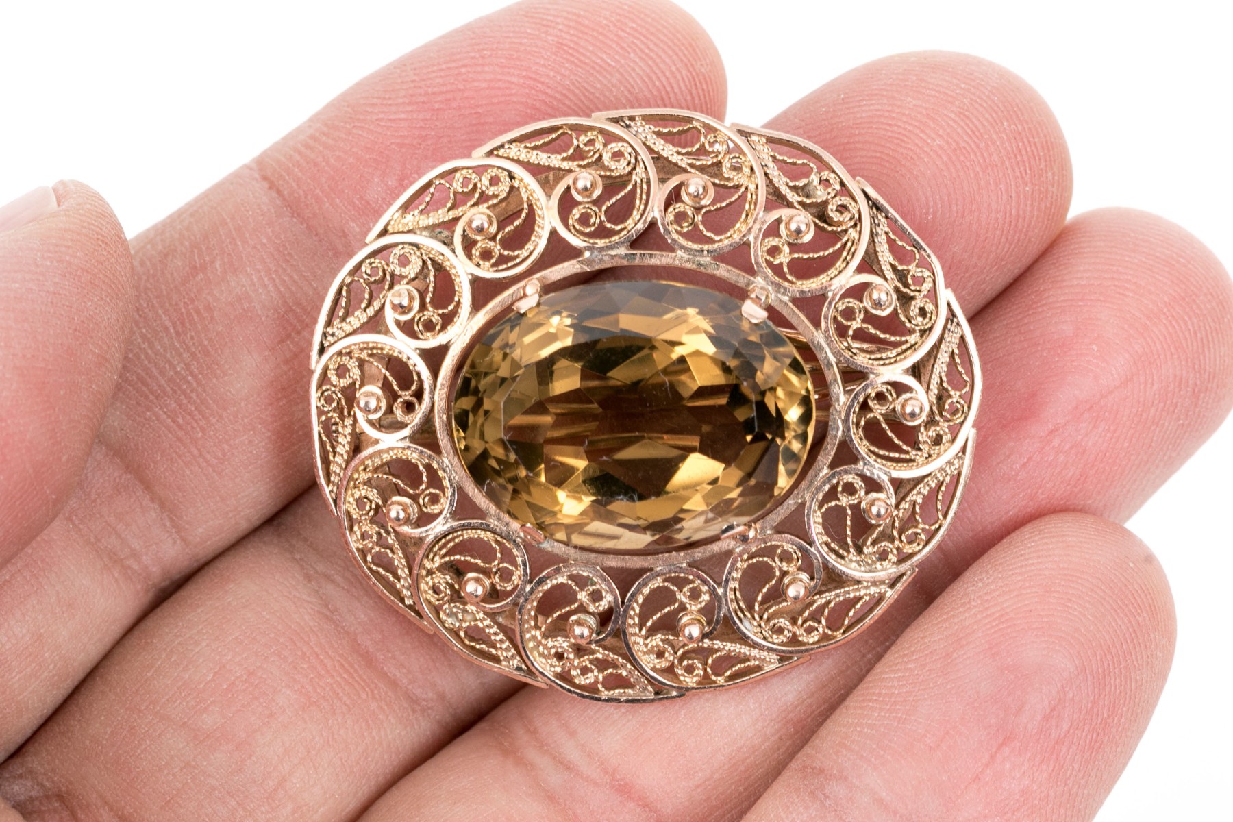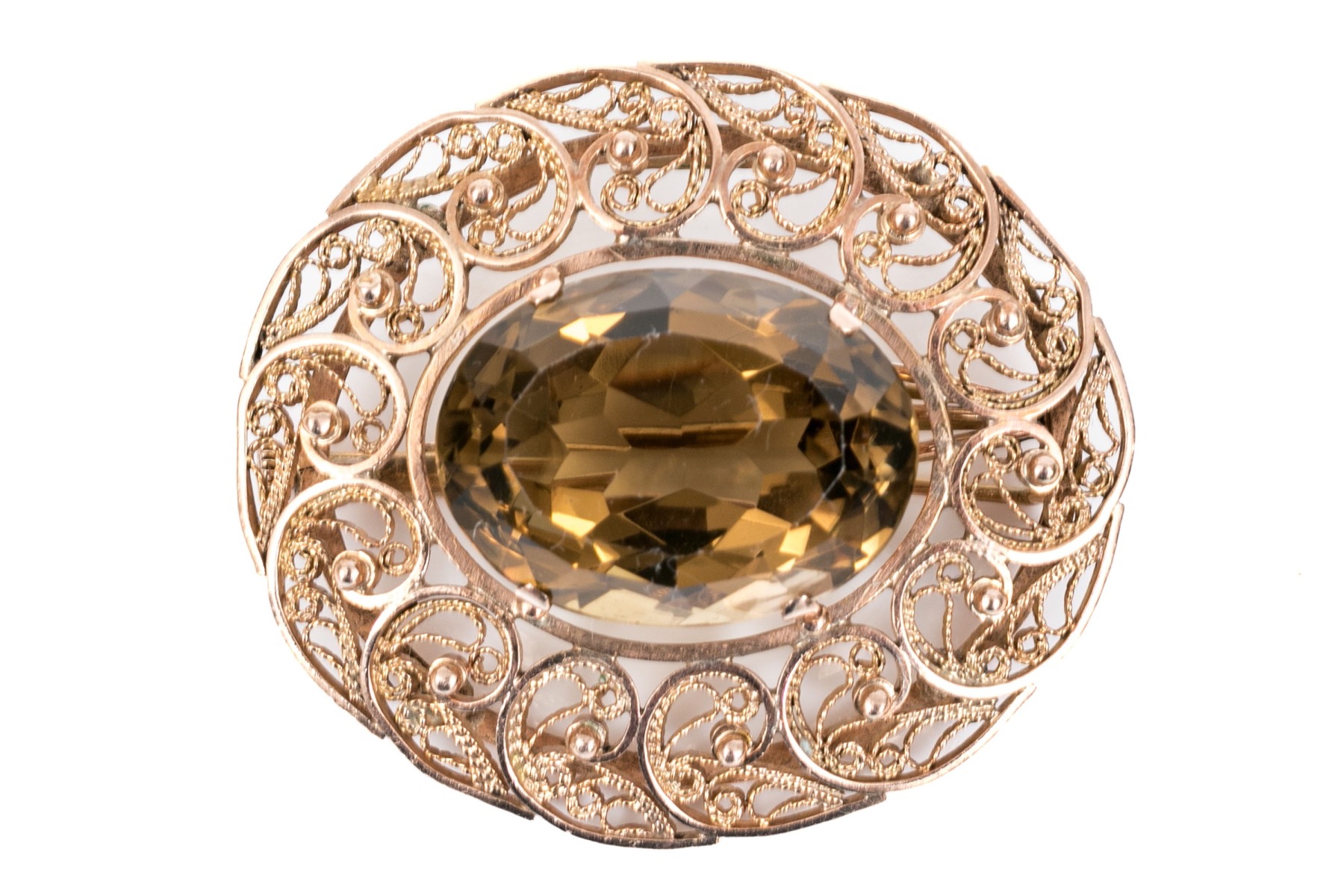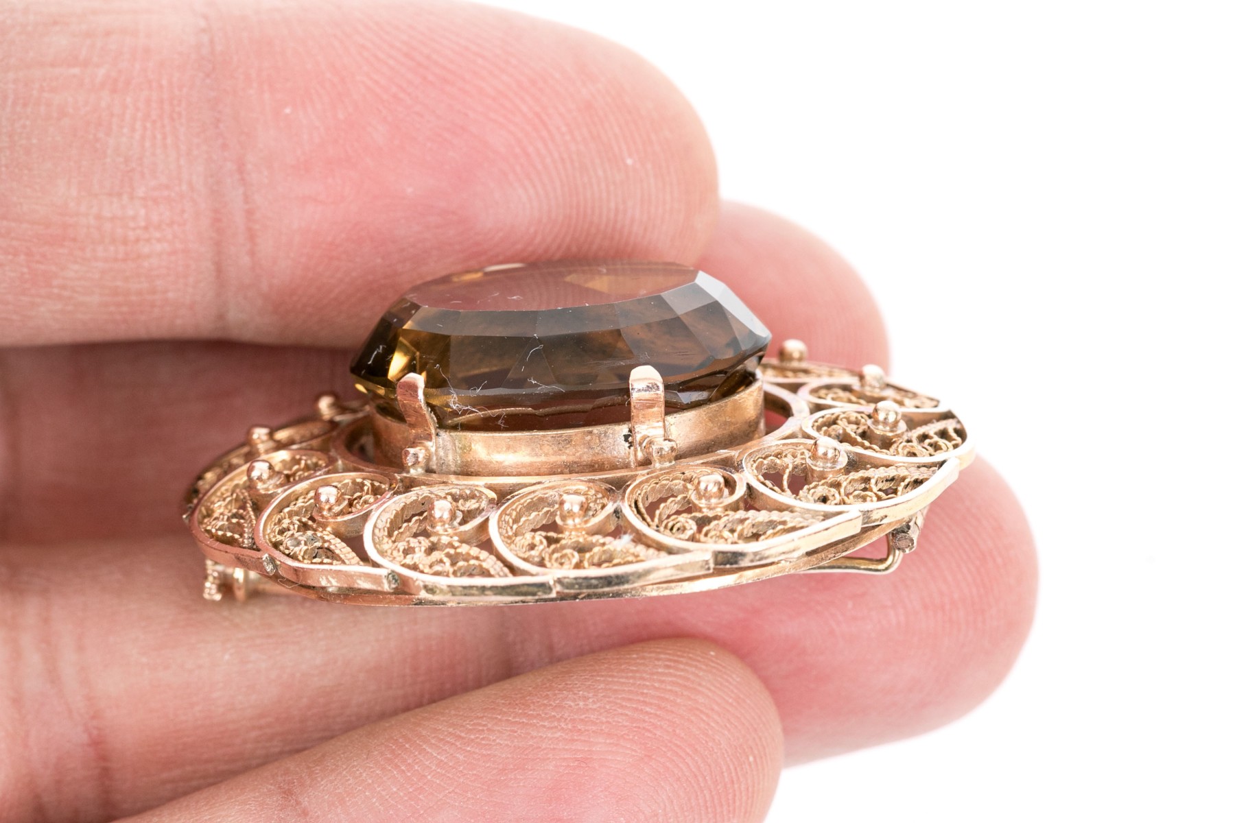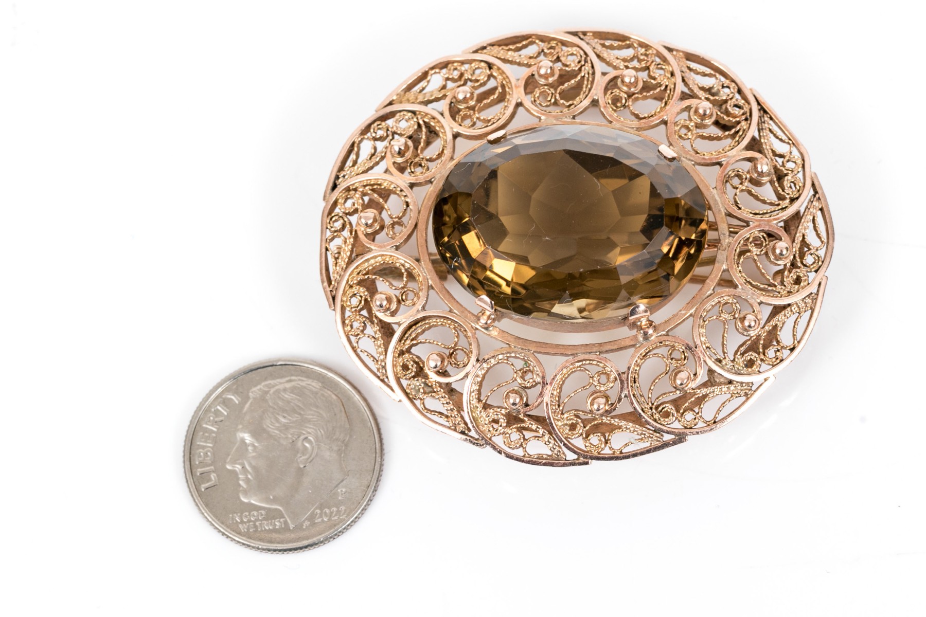 Elegant 14K gold brooch. The brooch displays a single oval faceted smoky quartz within a filigree frame. The smoky quartz is approximately 25.0 TCW.