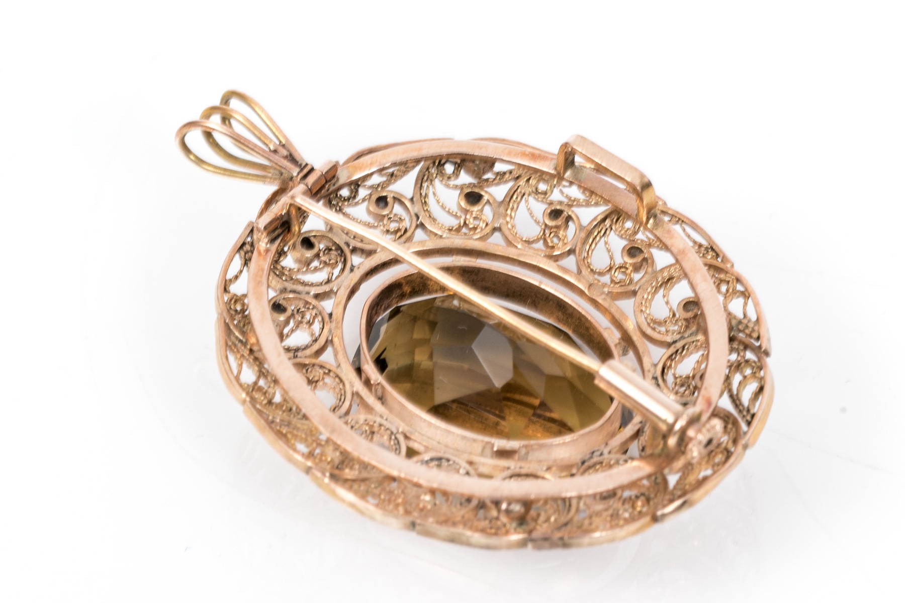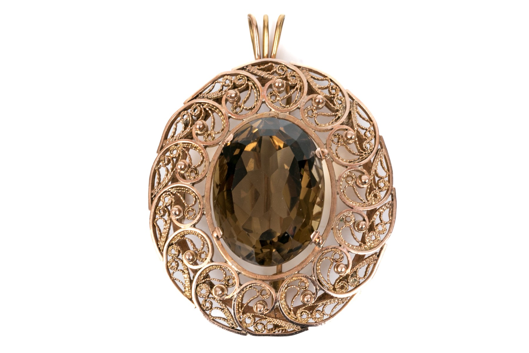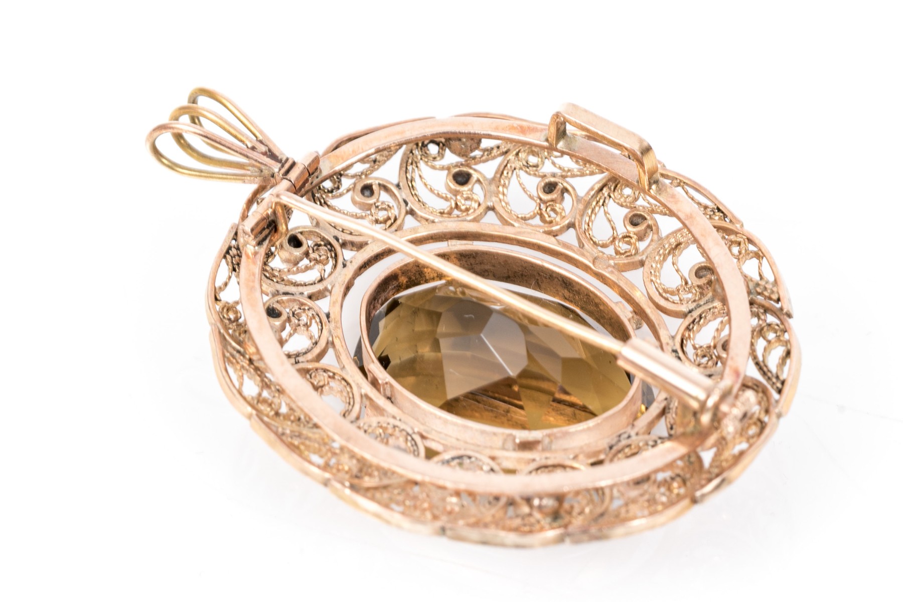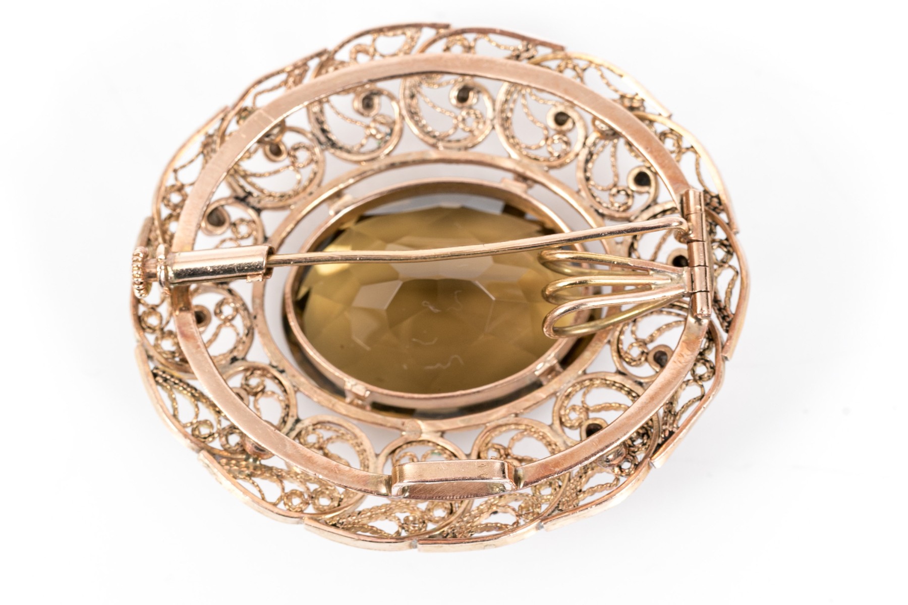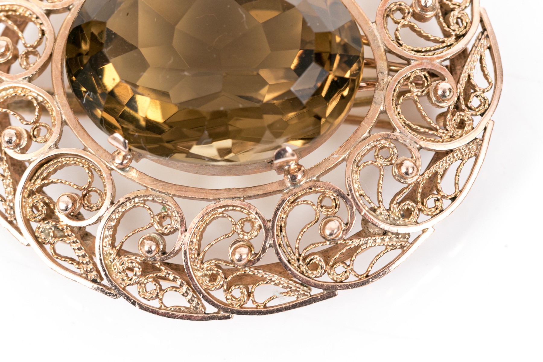 Elegant 14K gold brooch. The brooch displays a single oval faceted smoky quartz within a filigree frame. The smoky quartz is approximately 25.0 TCW.