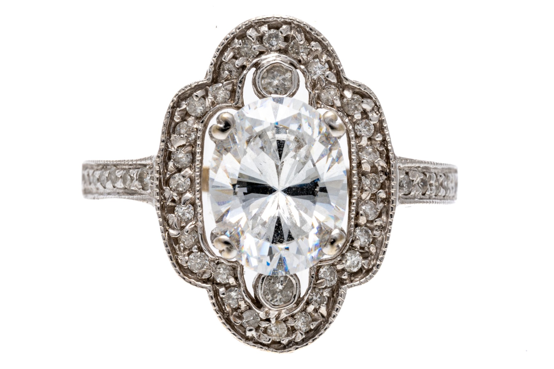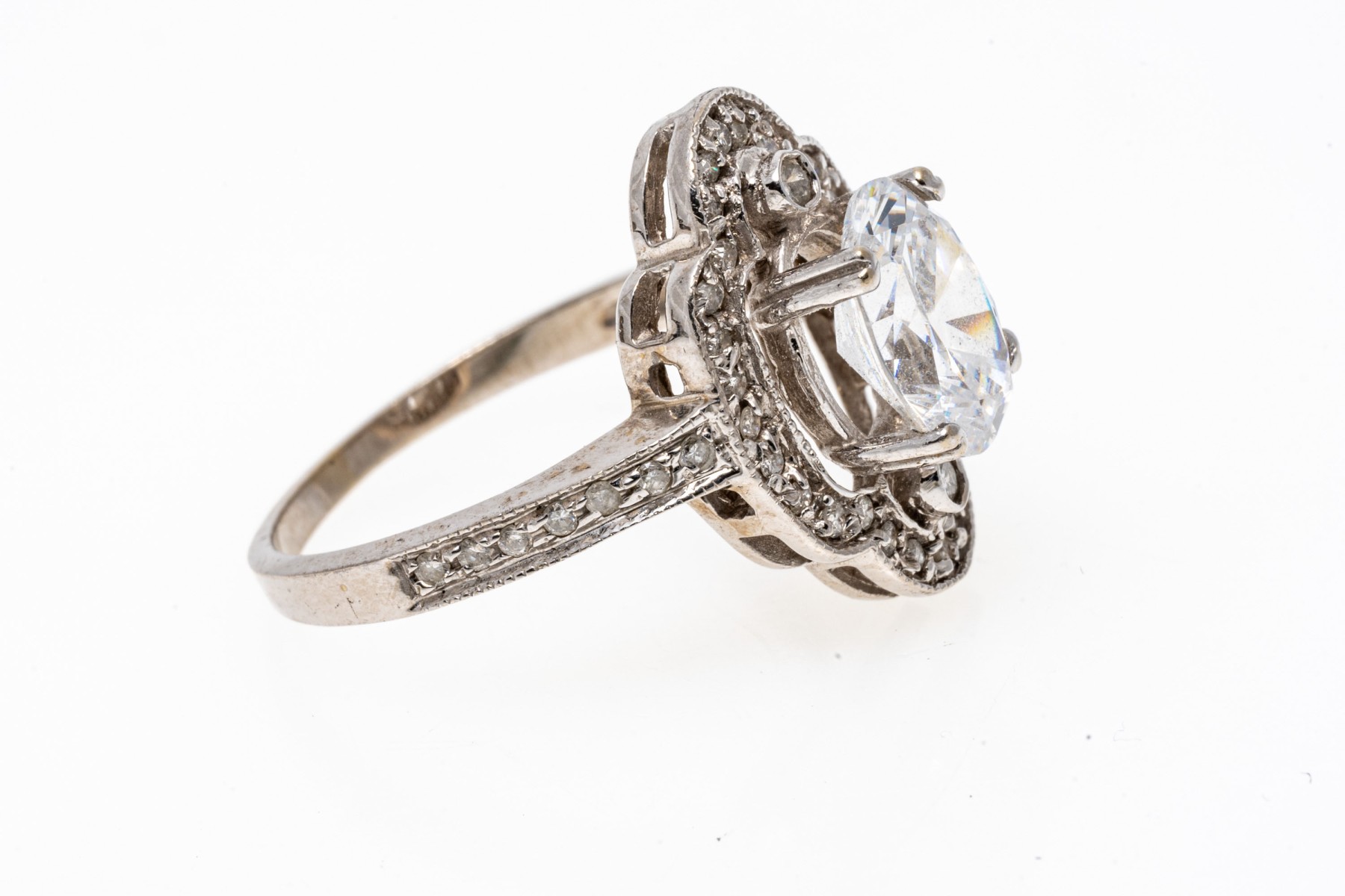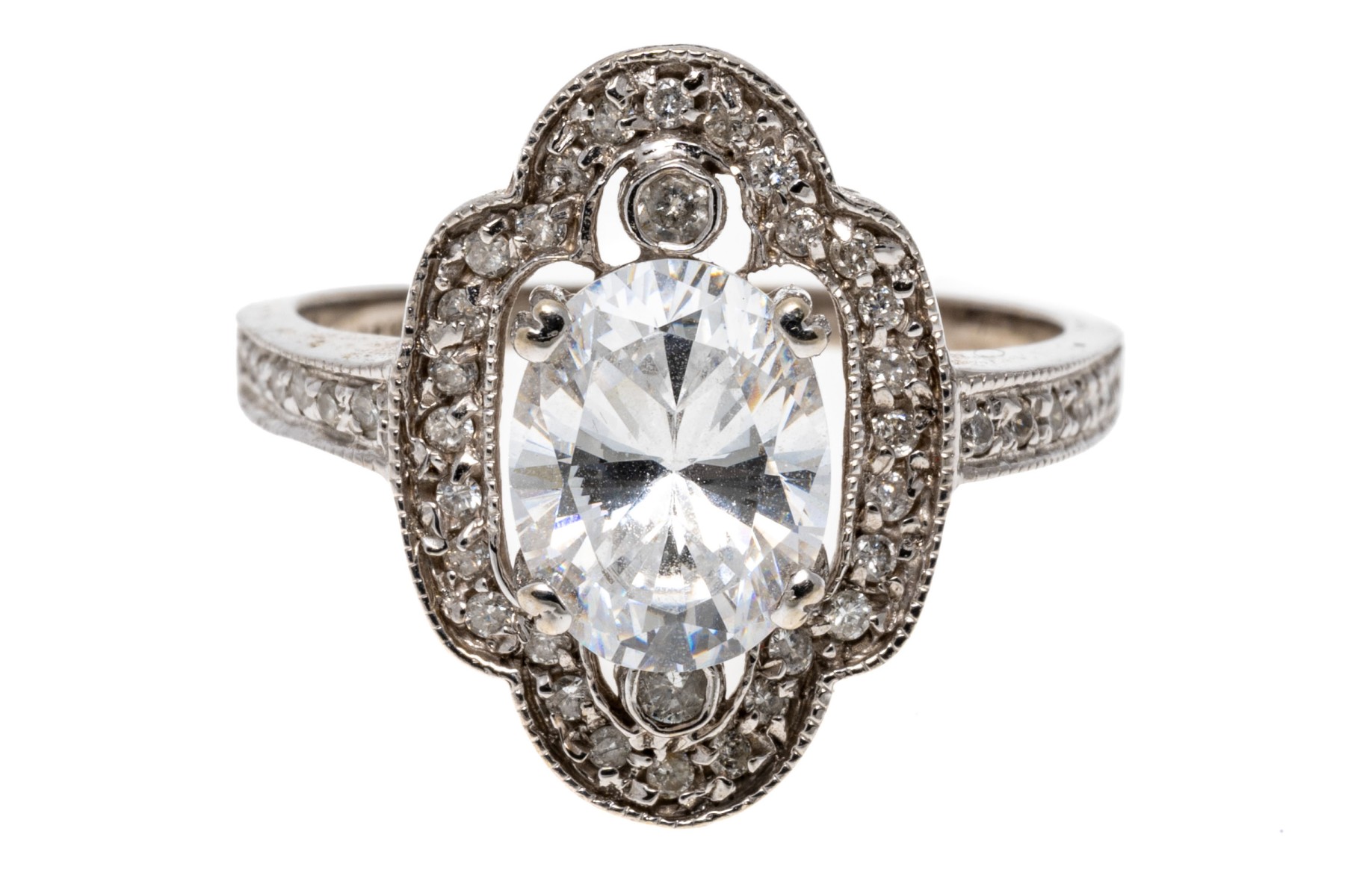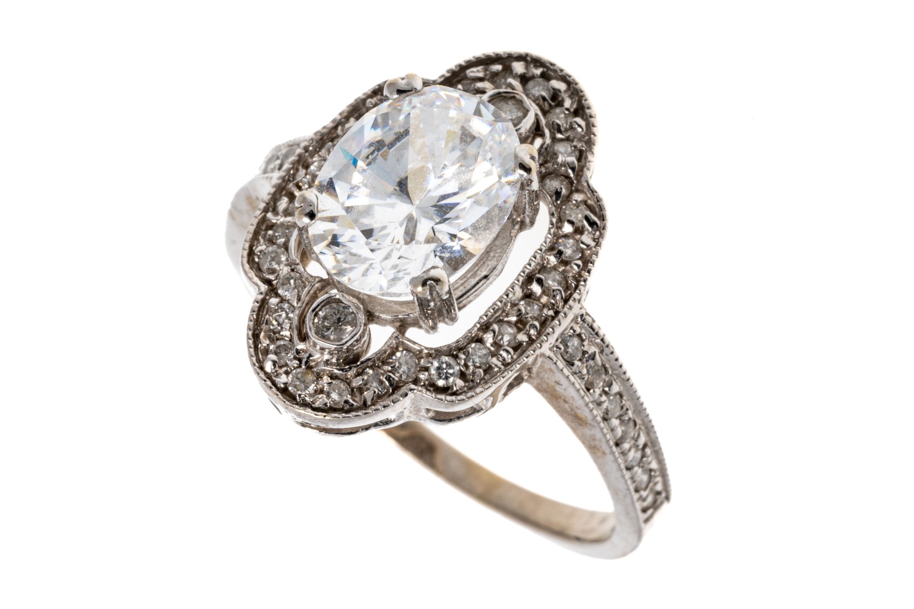 14K white gold ring. This elegant ring is set with a frame of round faceted accent diamonds framing an eye-catching oval cut cubic zirconia. Ring size 7.75.