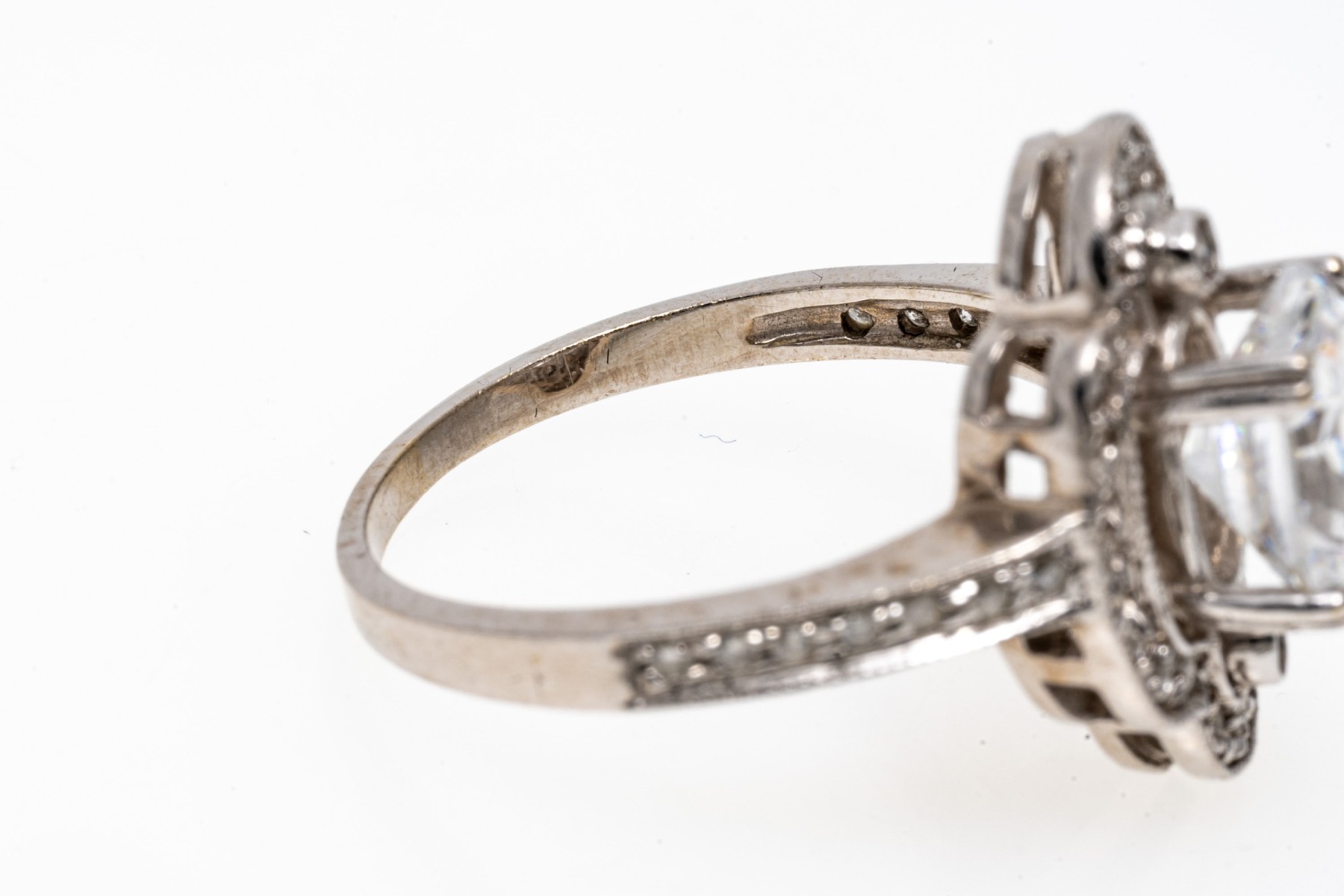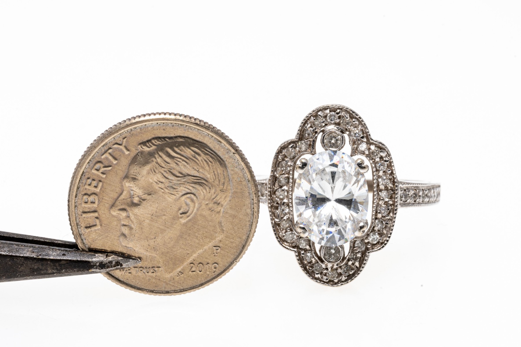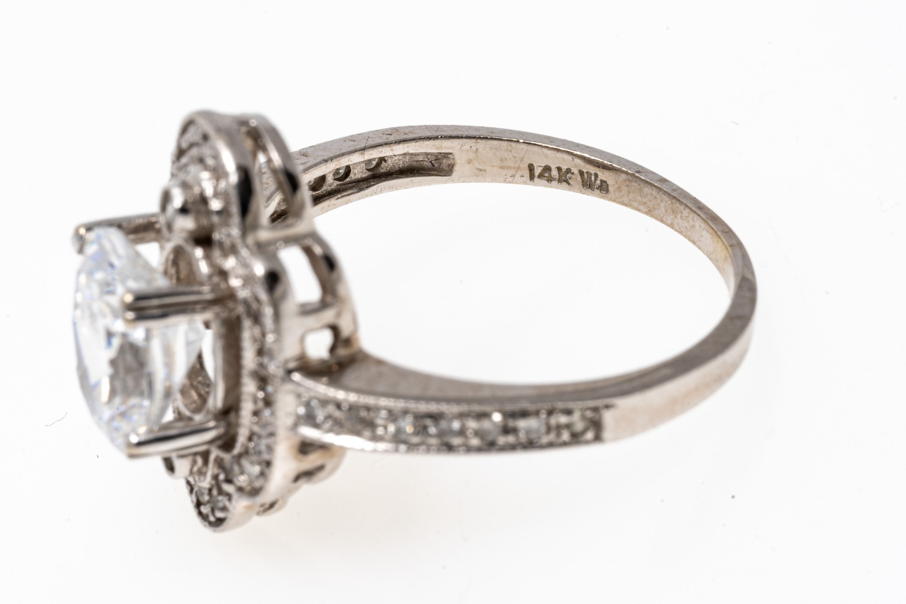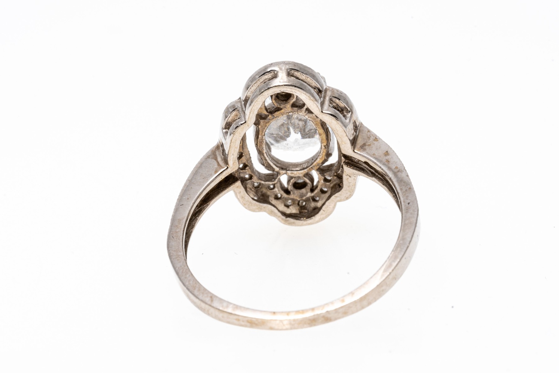 14K white gold ring. This elegant ring is set with a frame of round faceted accent diamonds framing an eye-catching oval cut cubic zirconia. Ring size 7.75.