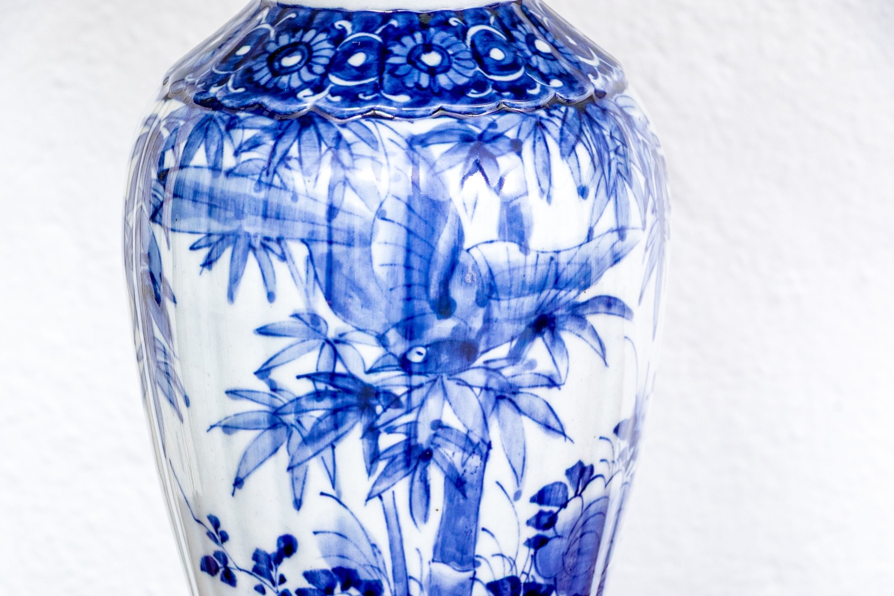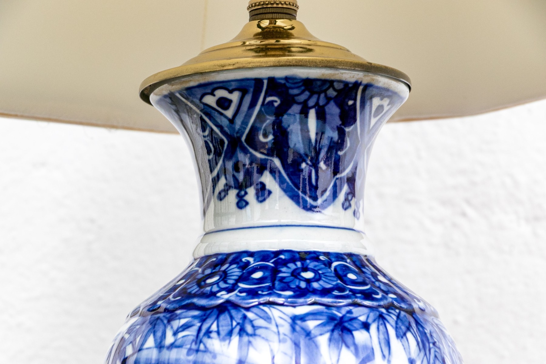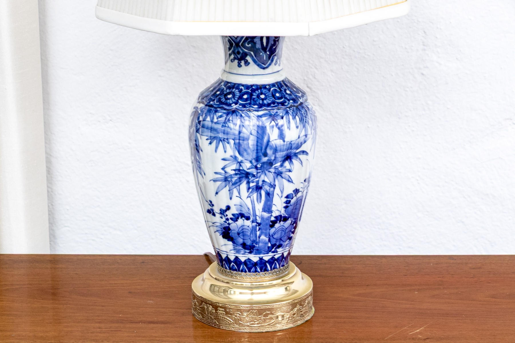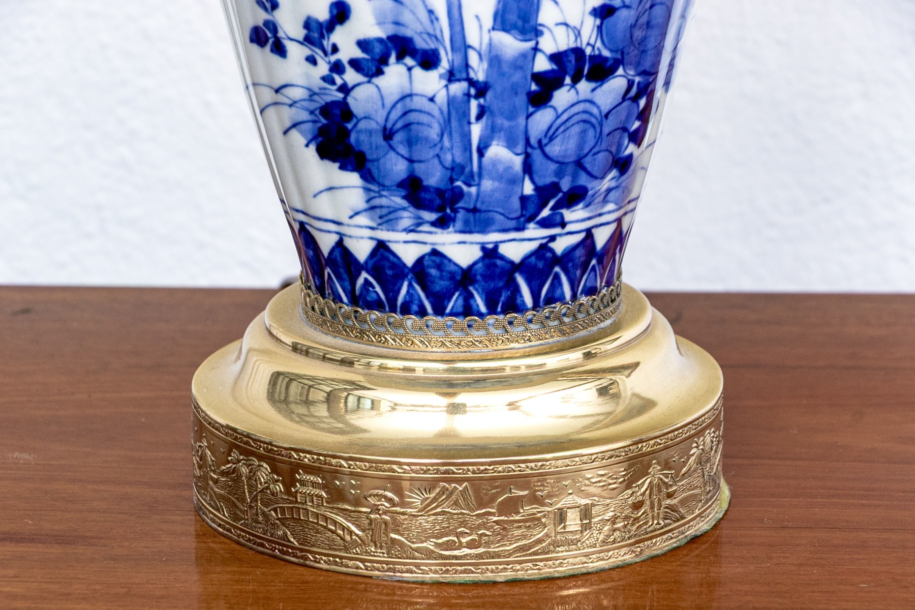 A beautiful blue and white porcelain vase mounted as a table lamp, showcasing a flared rim over an elongated ovoid body in bright white with vibrant monochromatic blue decoration including scenes of lush nature and foliate borders. The vase mounts to a circular brass base with ornate relief scenes of bridges and architecture, and is surmounted with a white pleated fabric empire shade.
