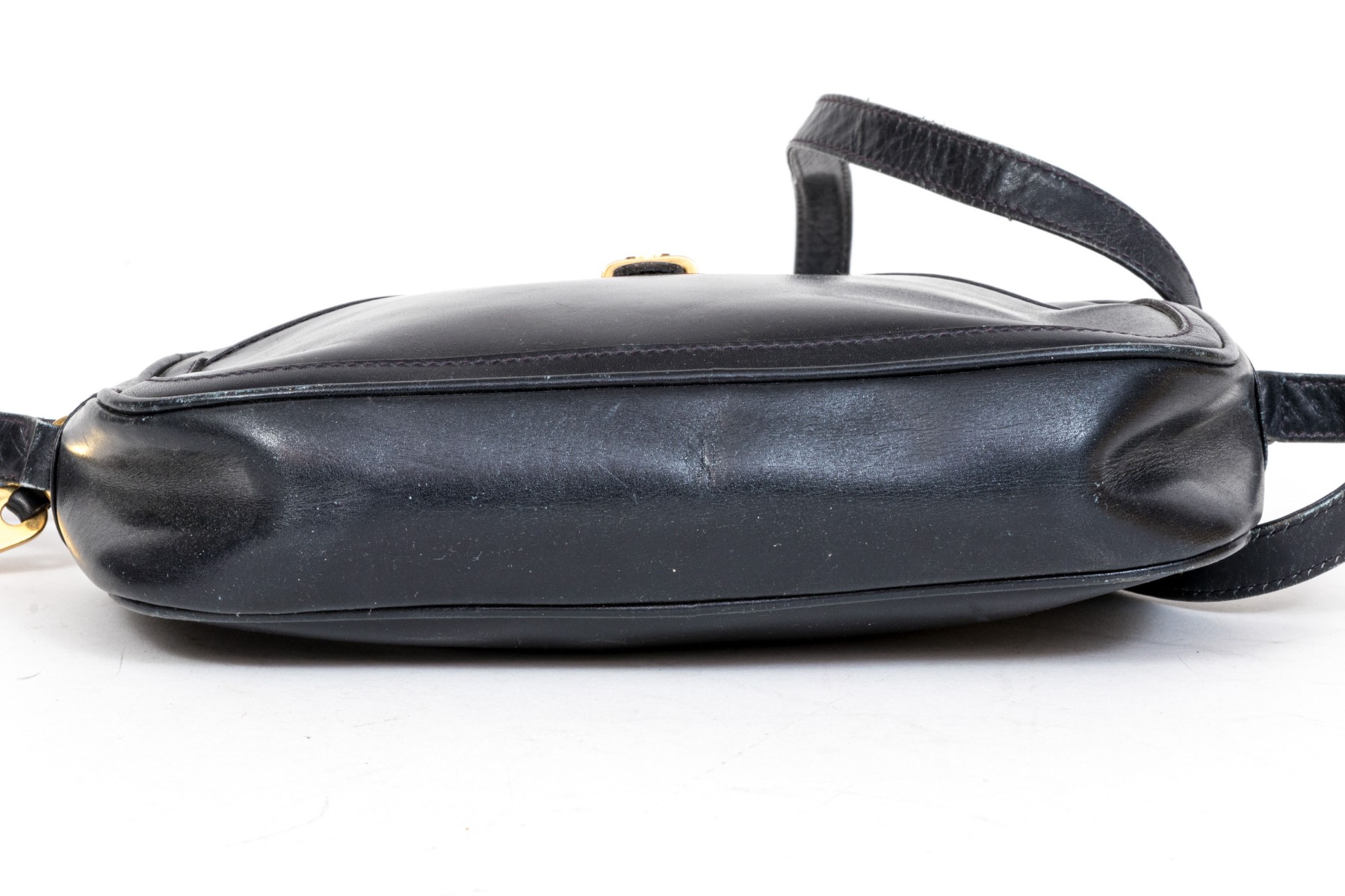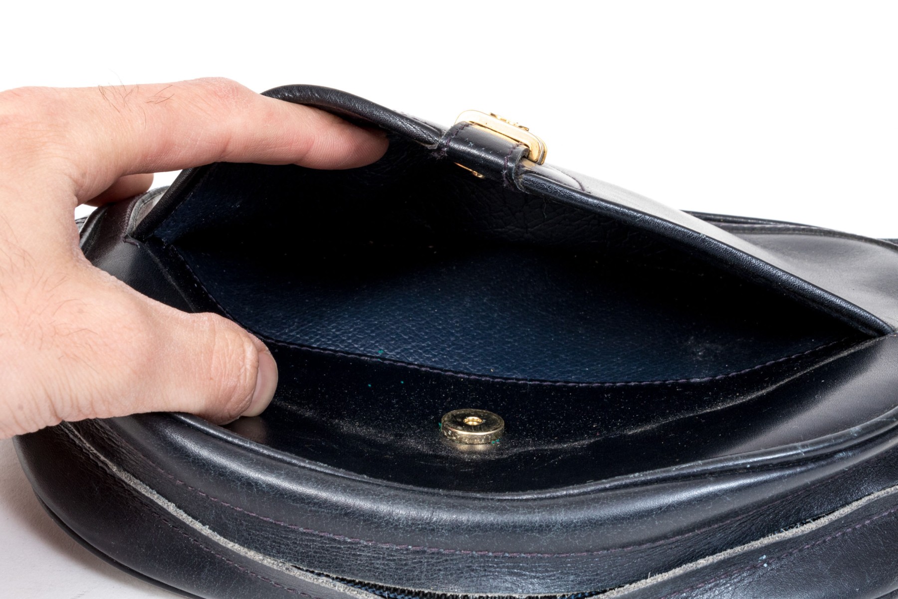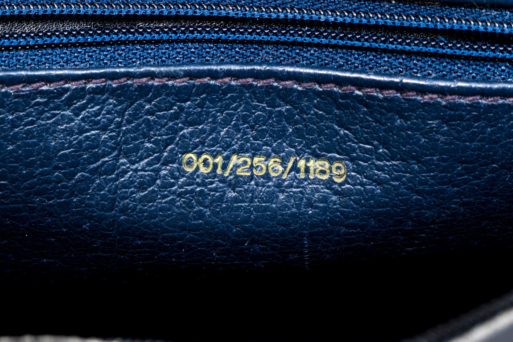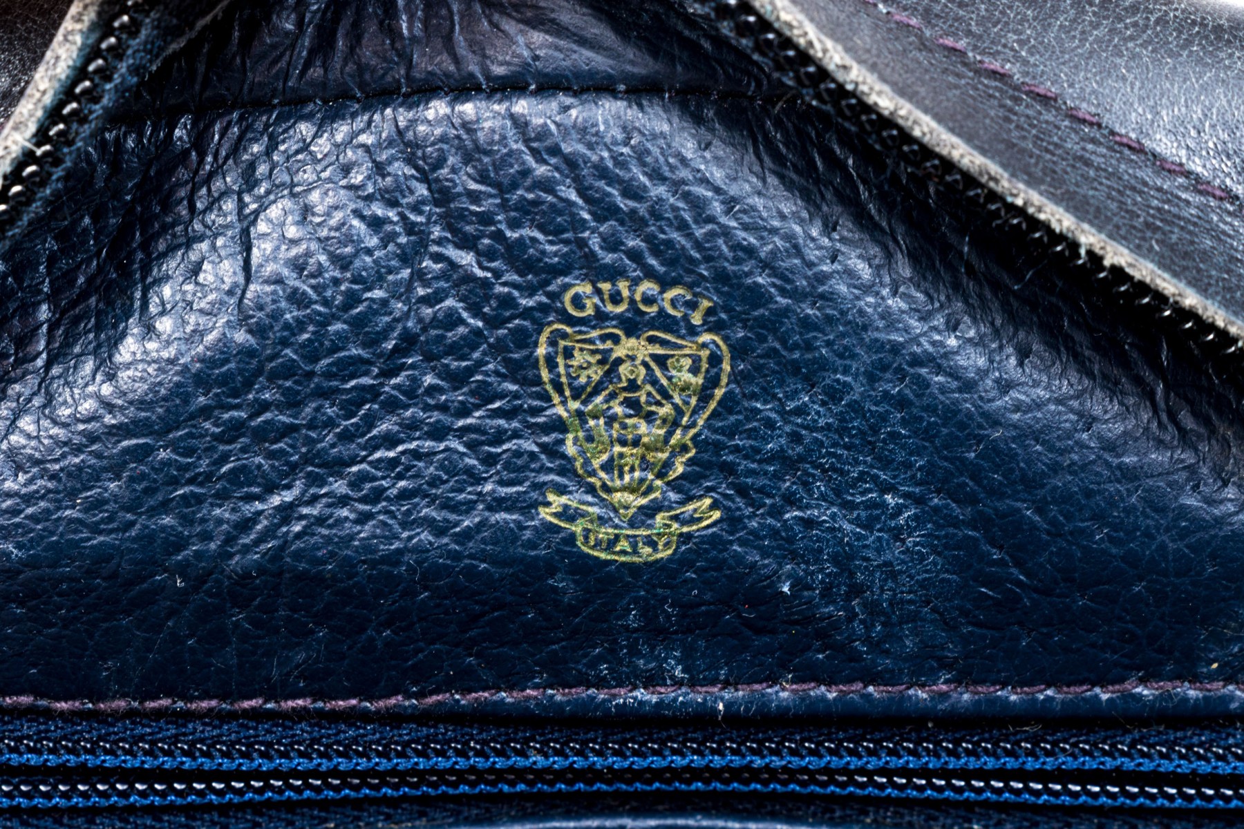 Elegant dark navy blue Gucci shoulder bag. Zipper closure top with exterior magnetic closure front pocket. The interior of the bag is a blue lining and zipper closure pocket.