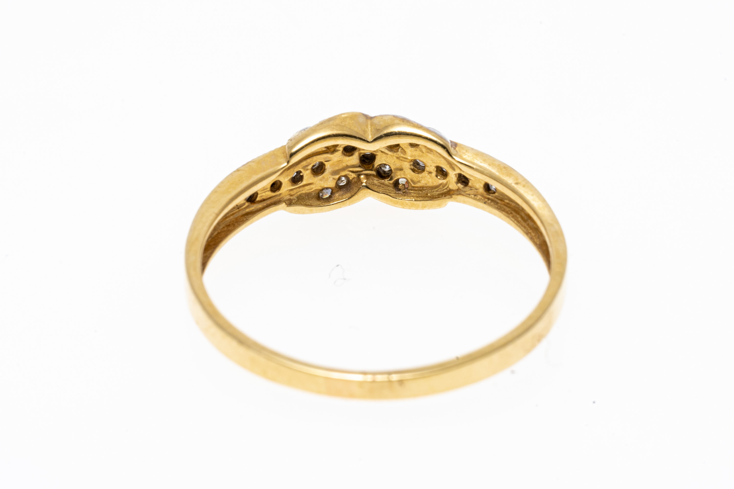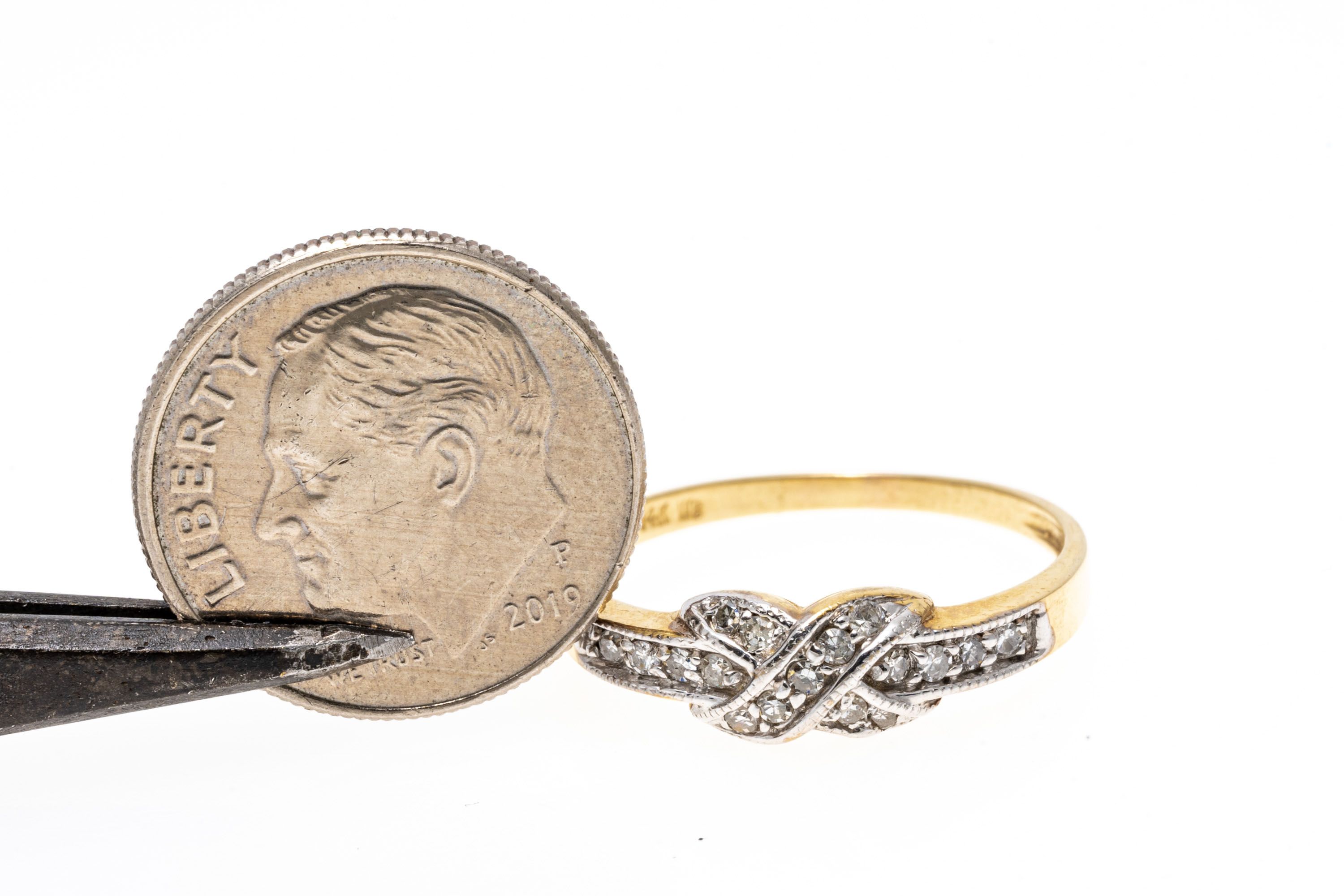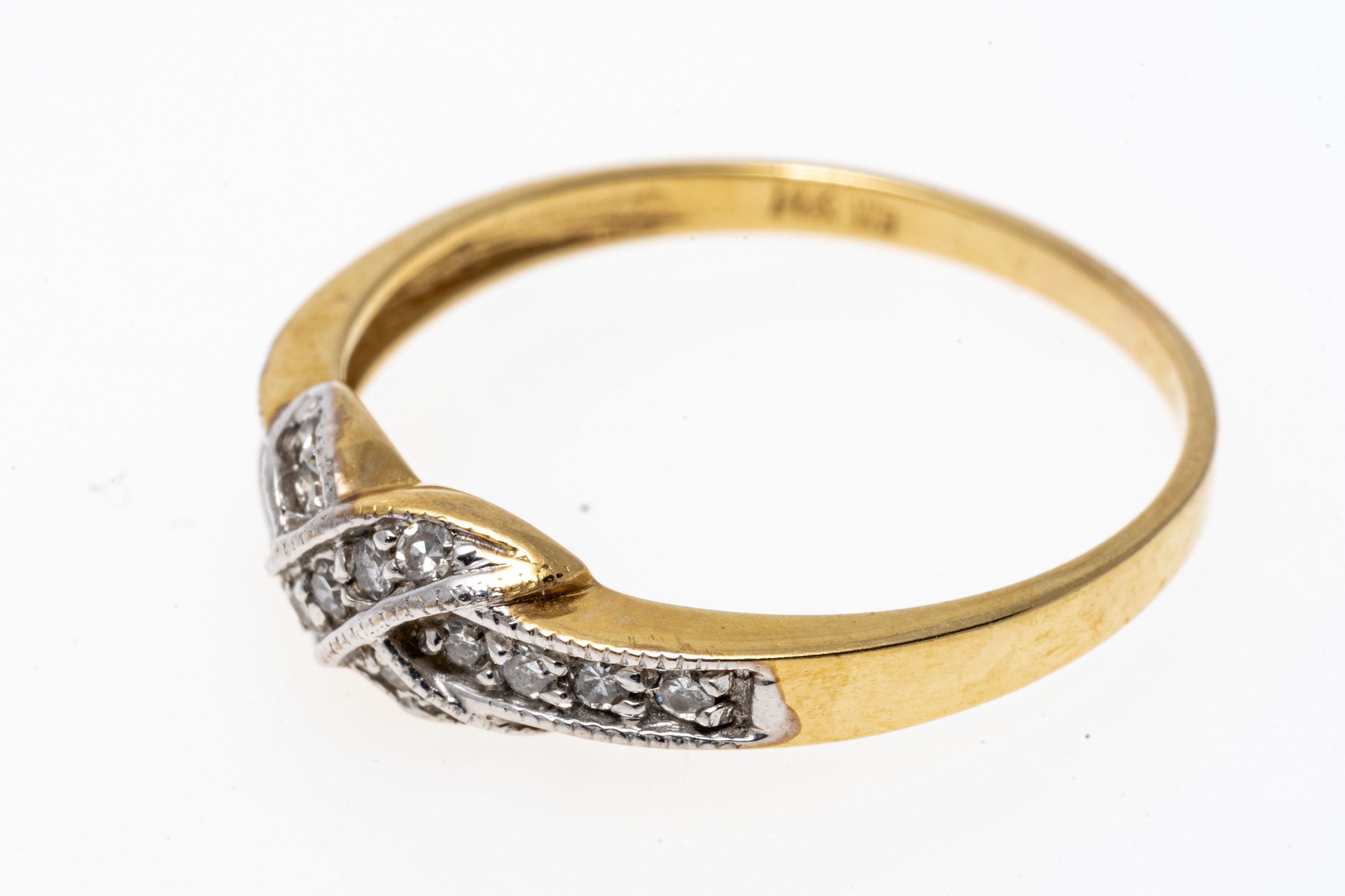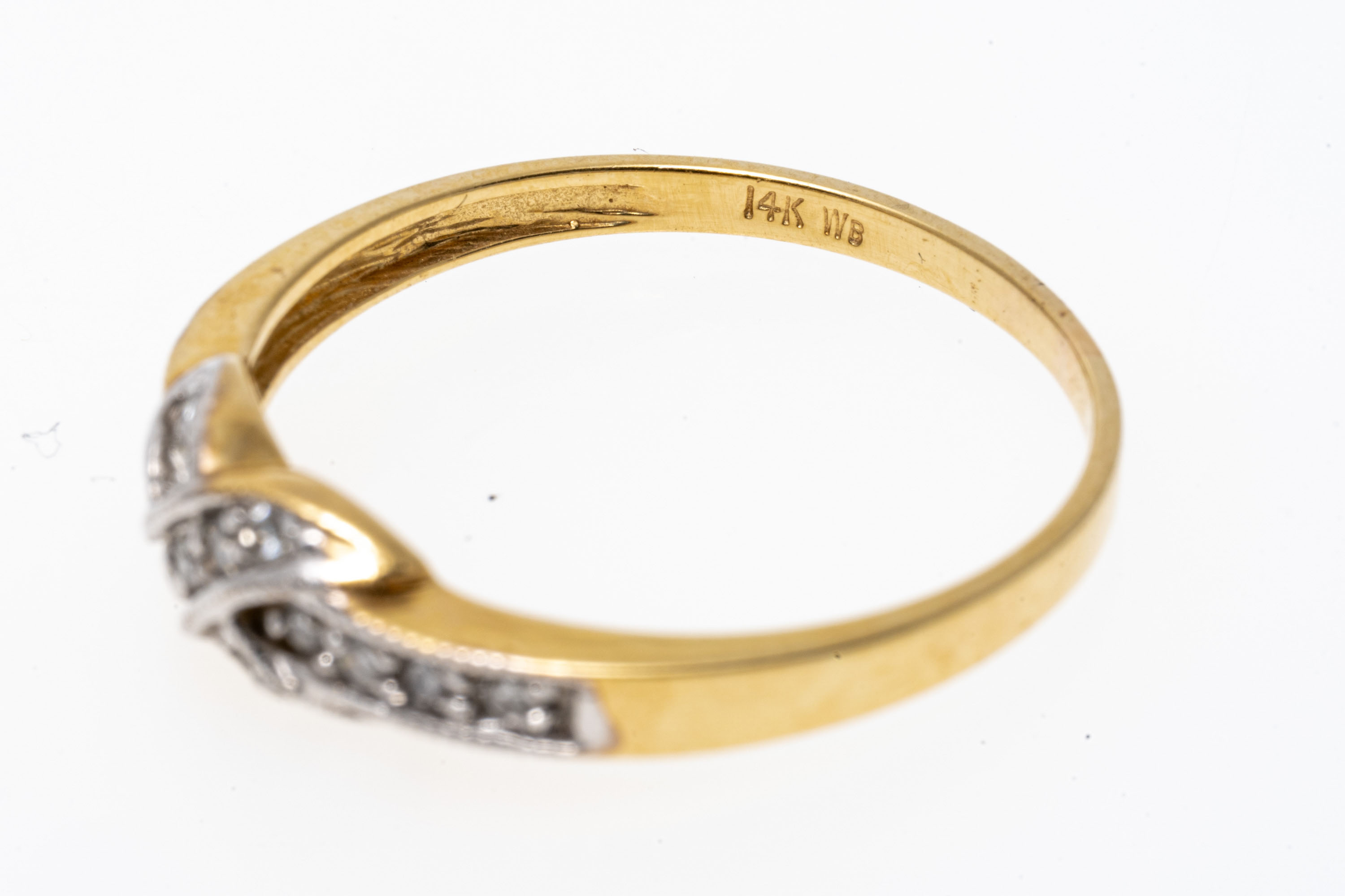 14K yellow gold ring. This ring displays a 'X' design set with round brilliant cut diamonds, approximately 0.25 TCW. Ring size 8-.