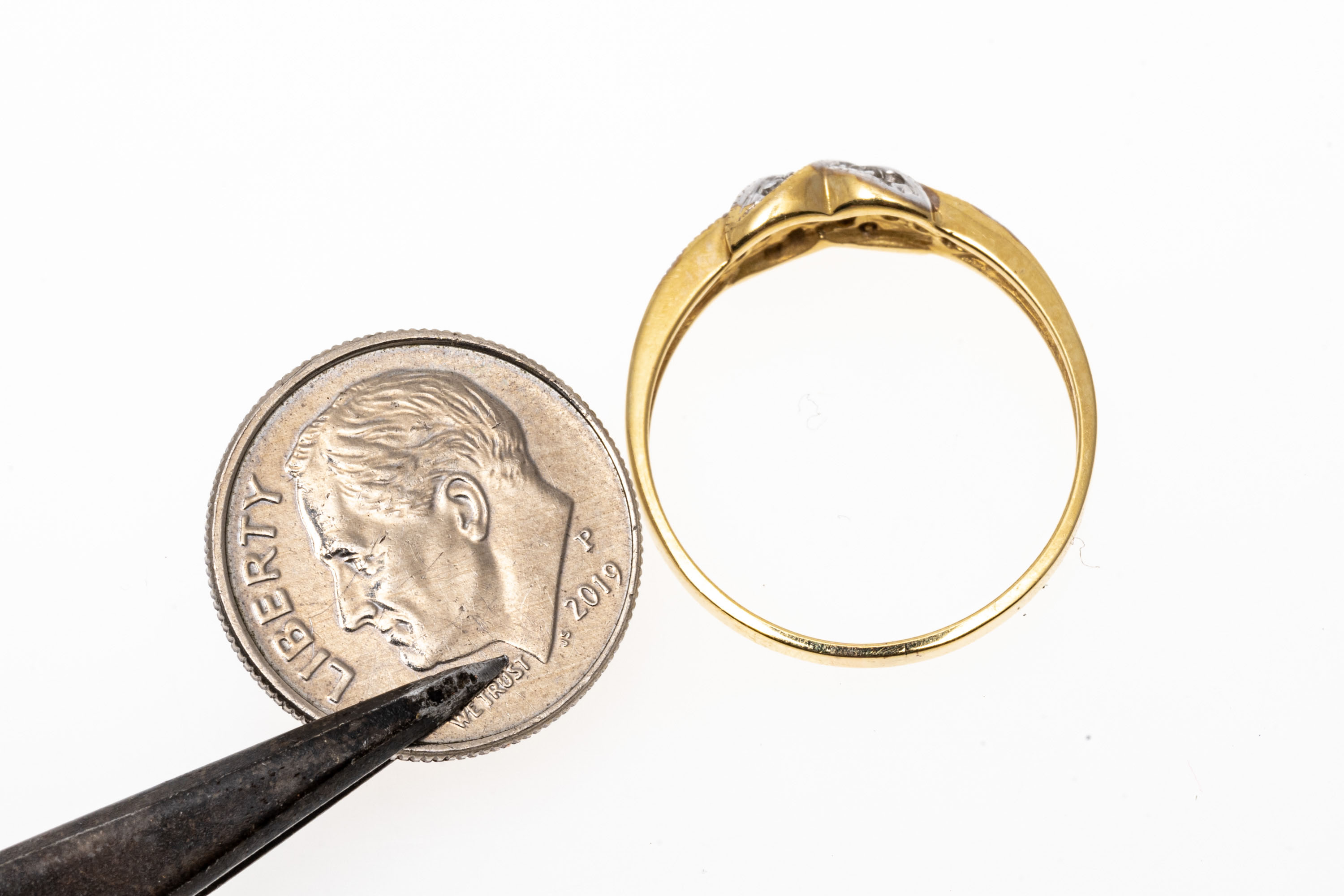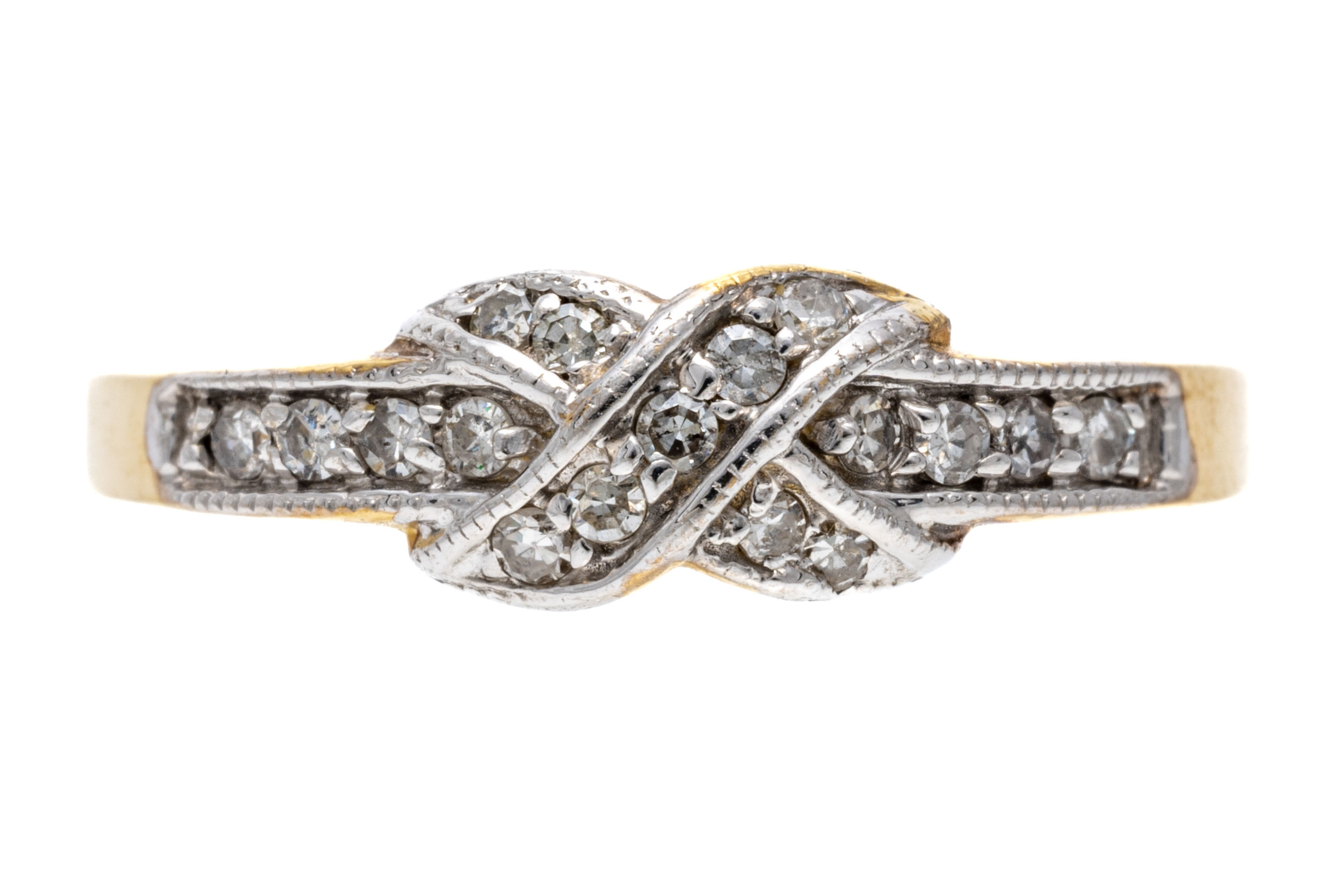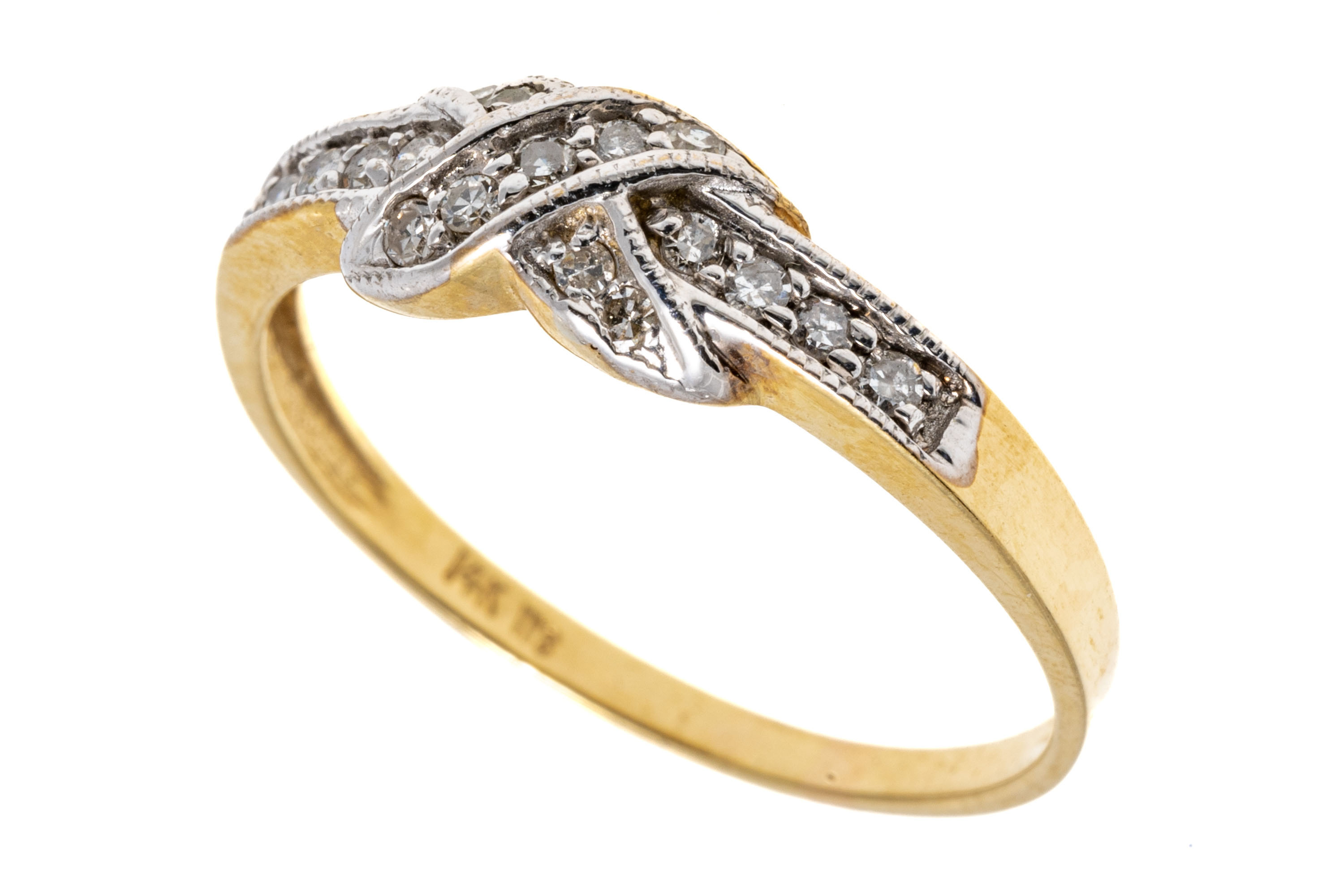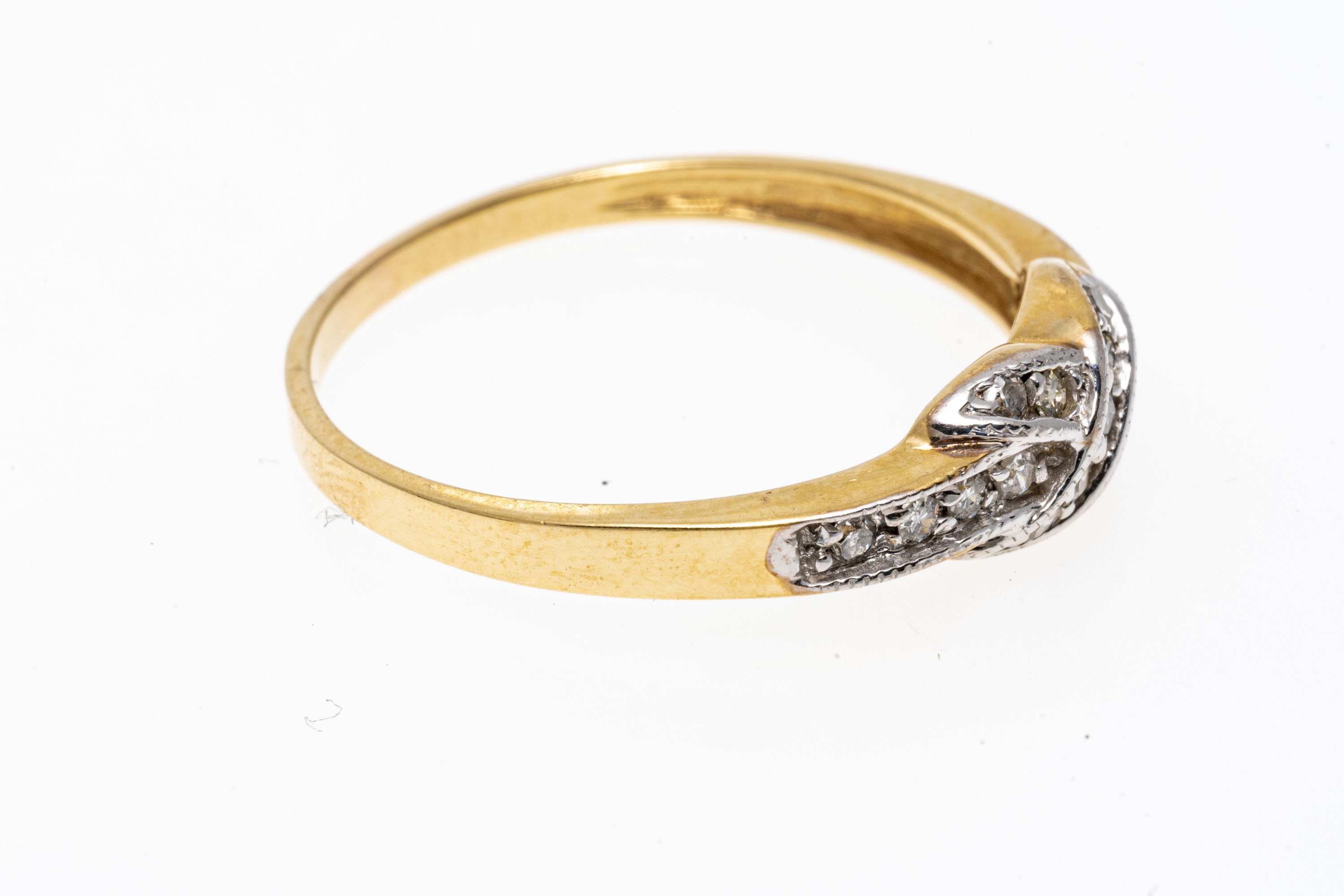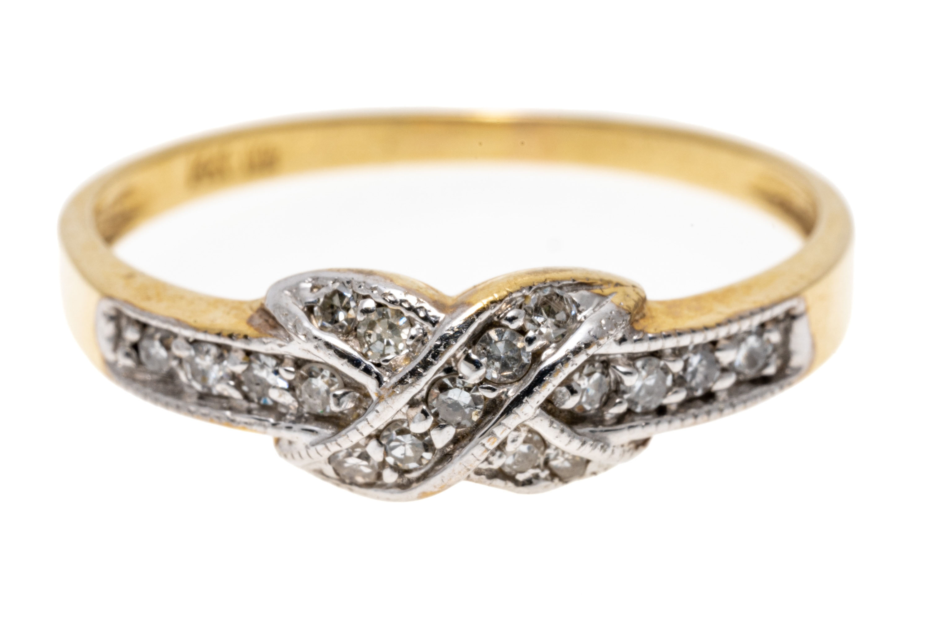 14K yellow gold ring. This ring displays a 'X' design set with round brilliant cut diamonds, approximately 0.25 TCW. Ring size 8-.