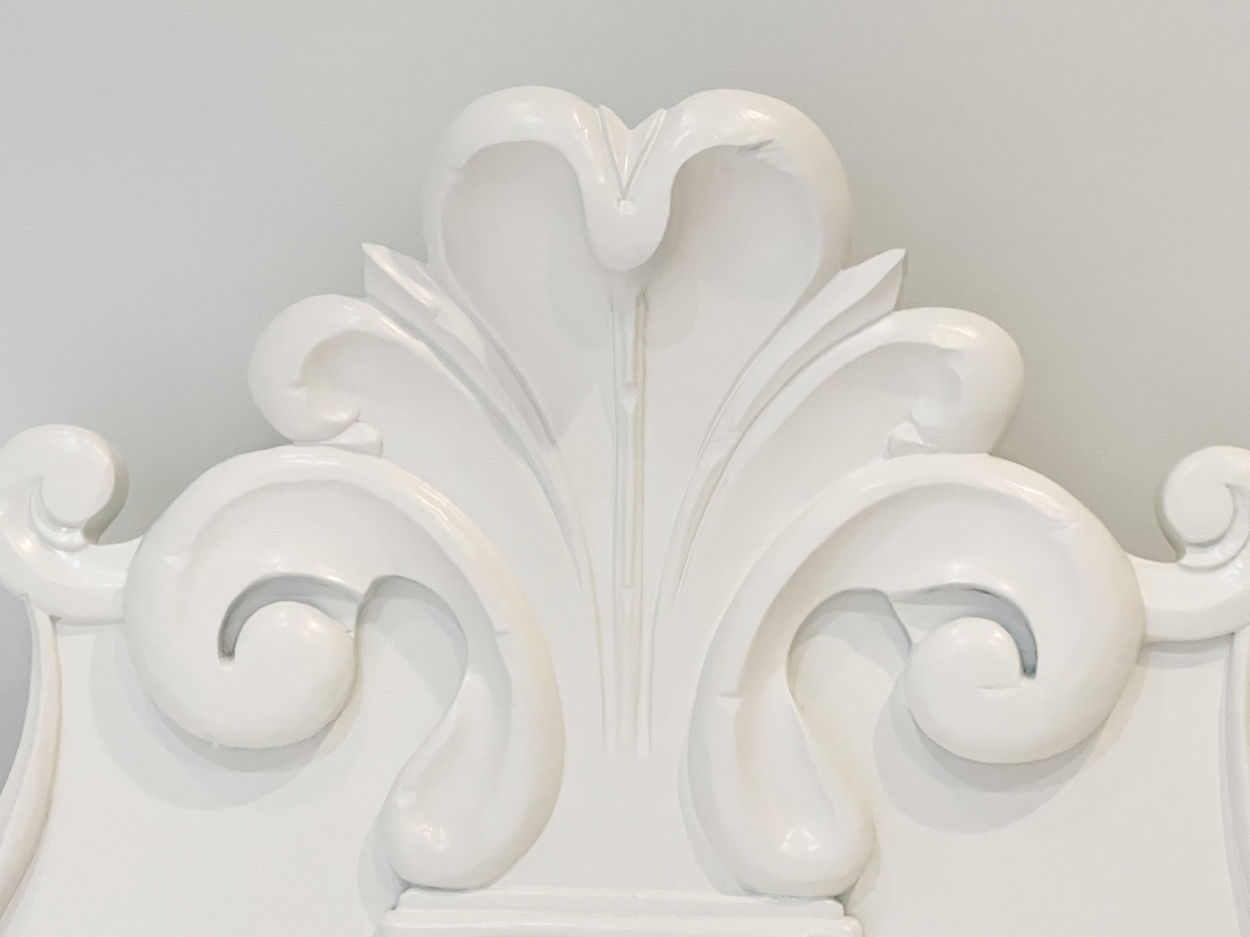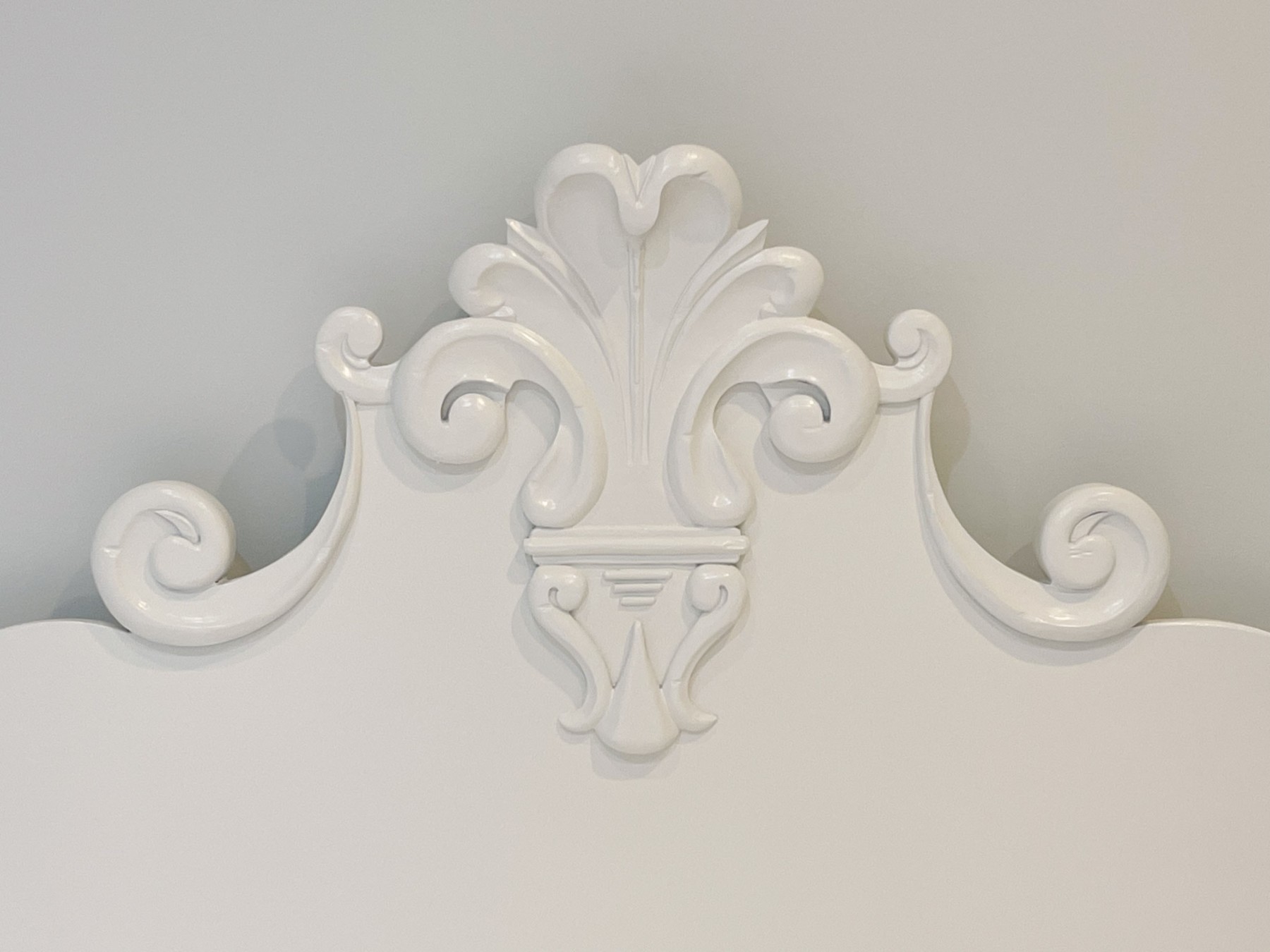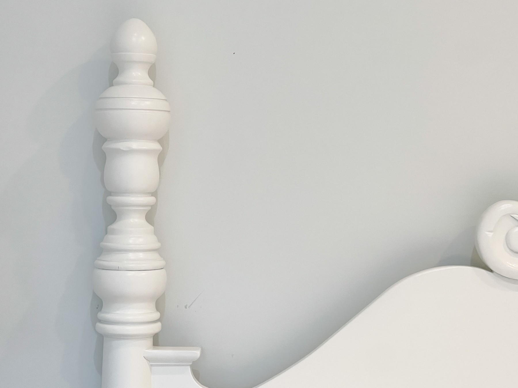 This beautiful bedstead has a scalloped design to the top crest with turned columns to both sides. Painted in a lovely white hue. Note* Mattress not included.