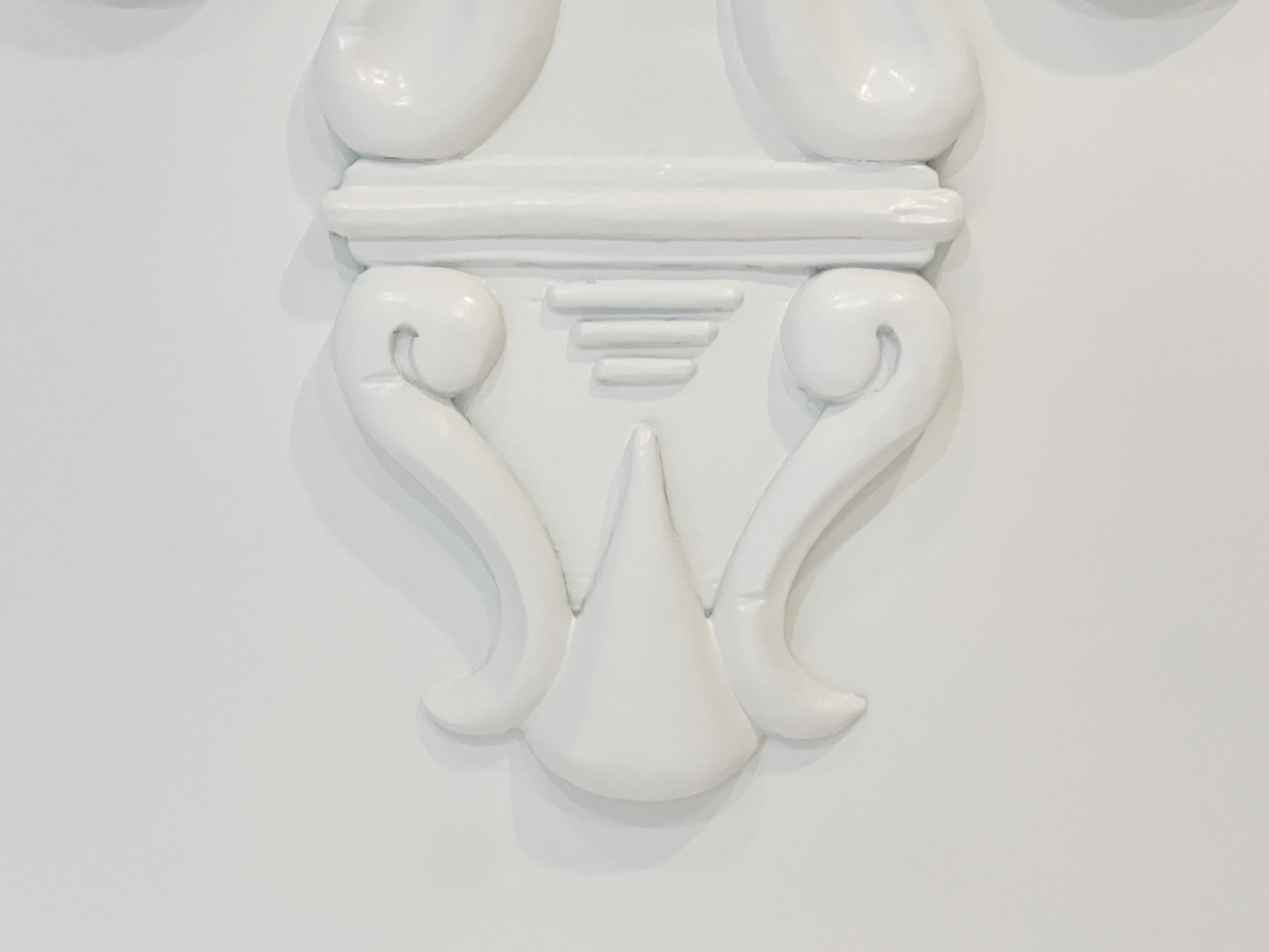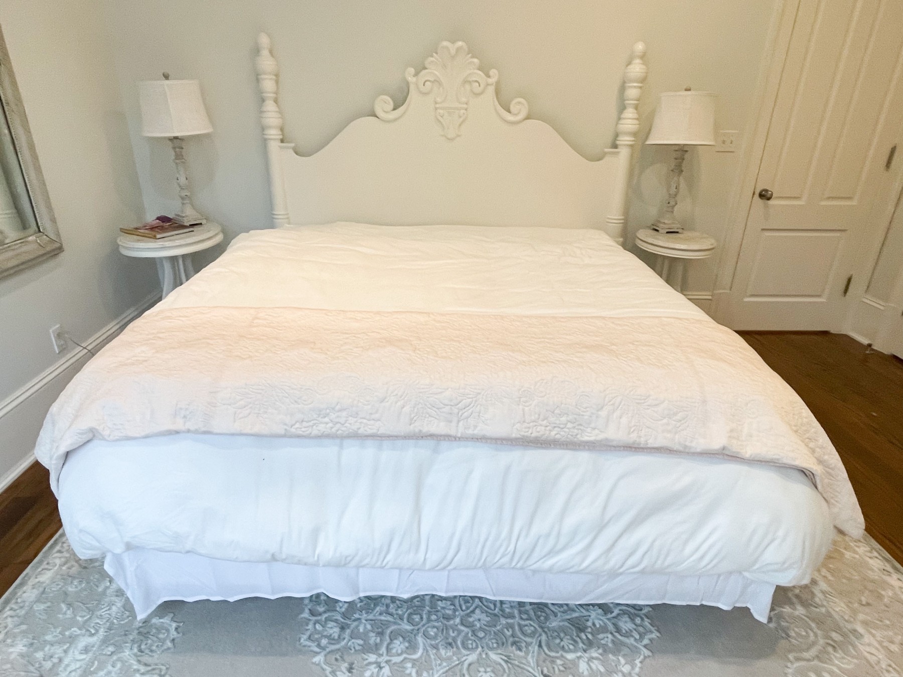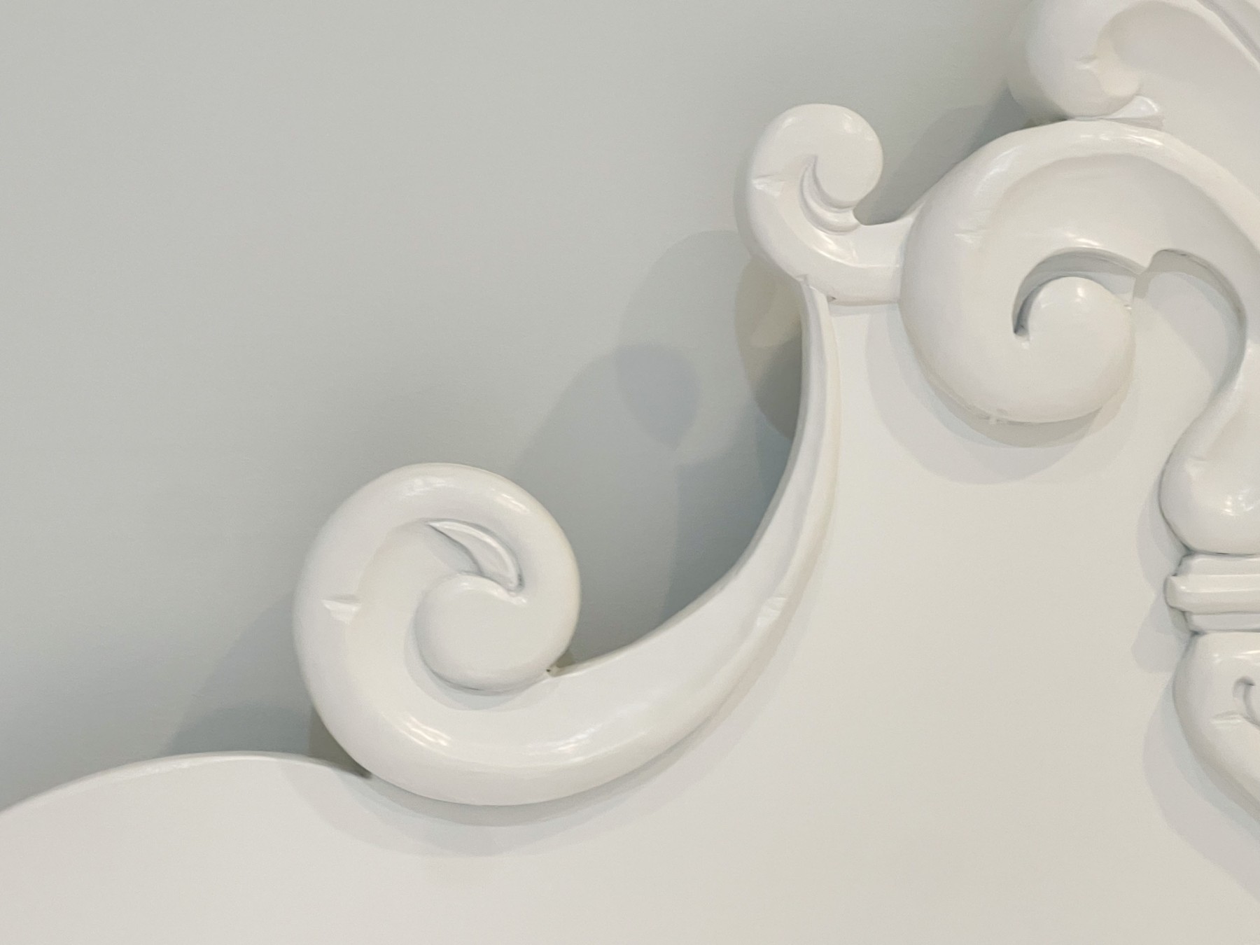 This beautiful bedstead has a scalloped design to the top crest with turned columns to both sides. Painted in a lovely white hue. Note* Mattress not included.