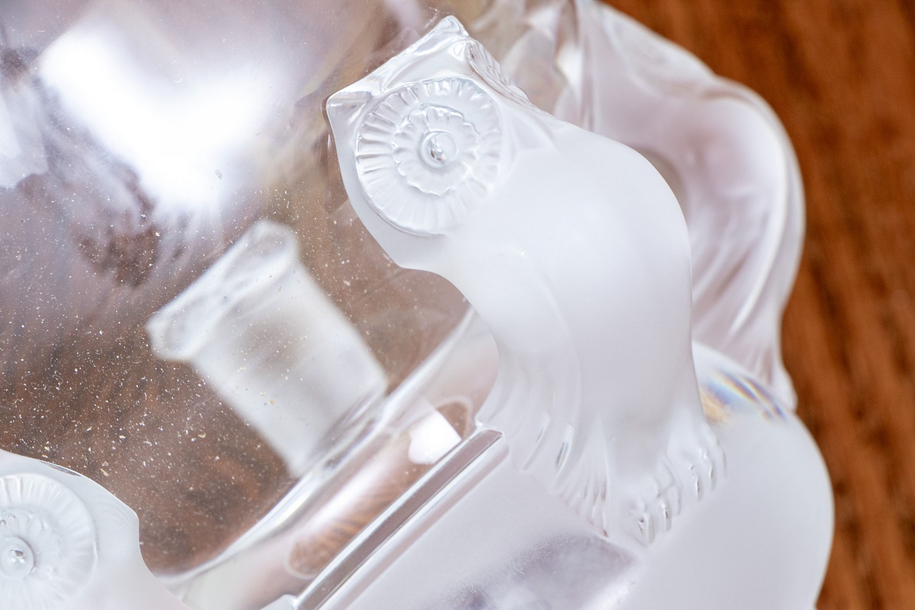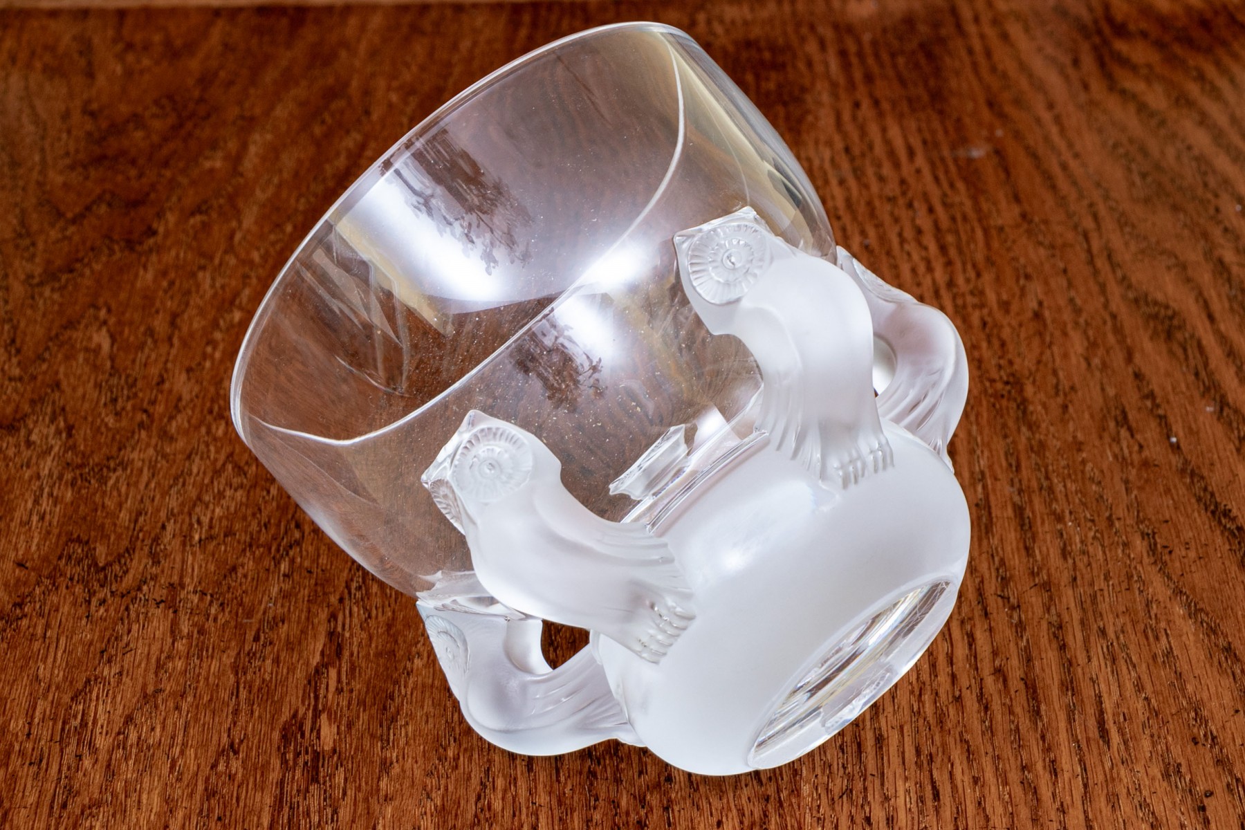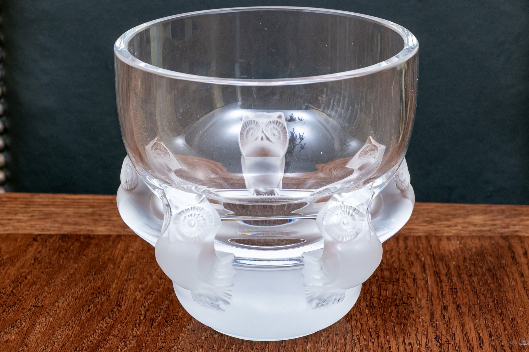 An elegant, French, Lalique footed crystal bowl with 5 moulded, frosted owls in relief around the section of the bowl where the foot and bowl are joined.