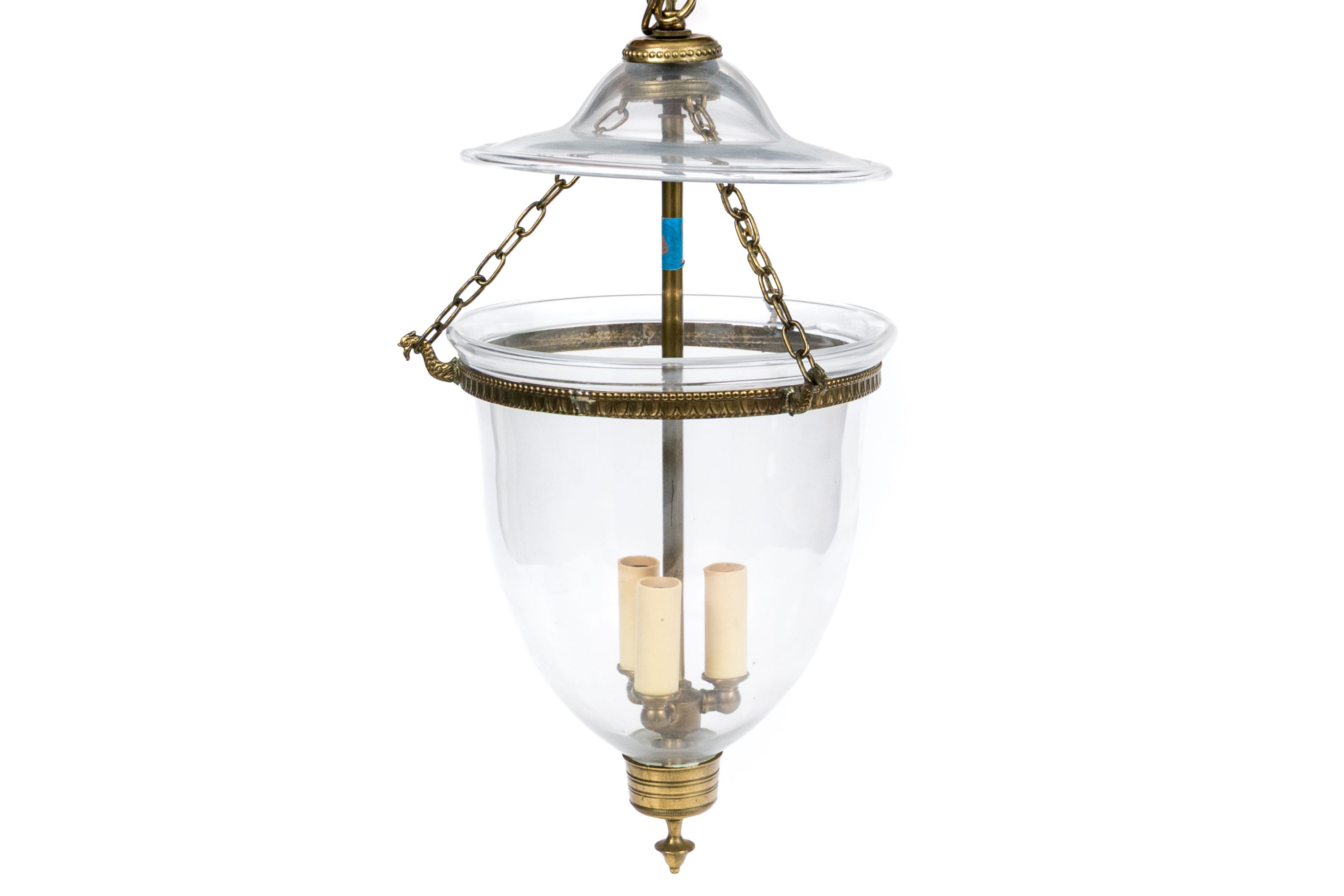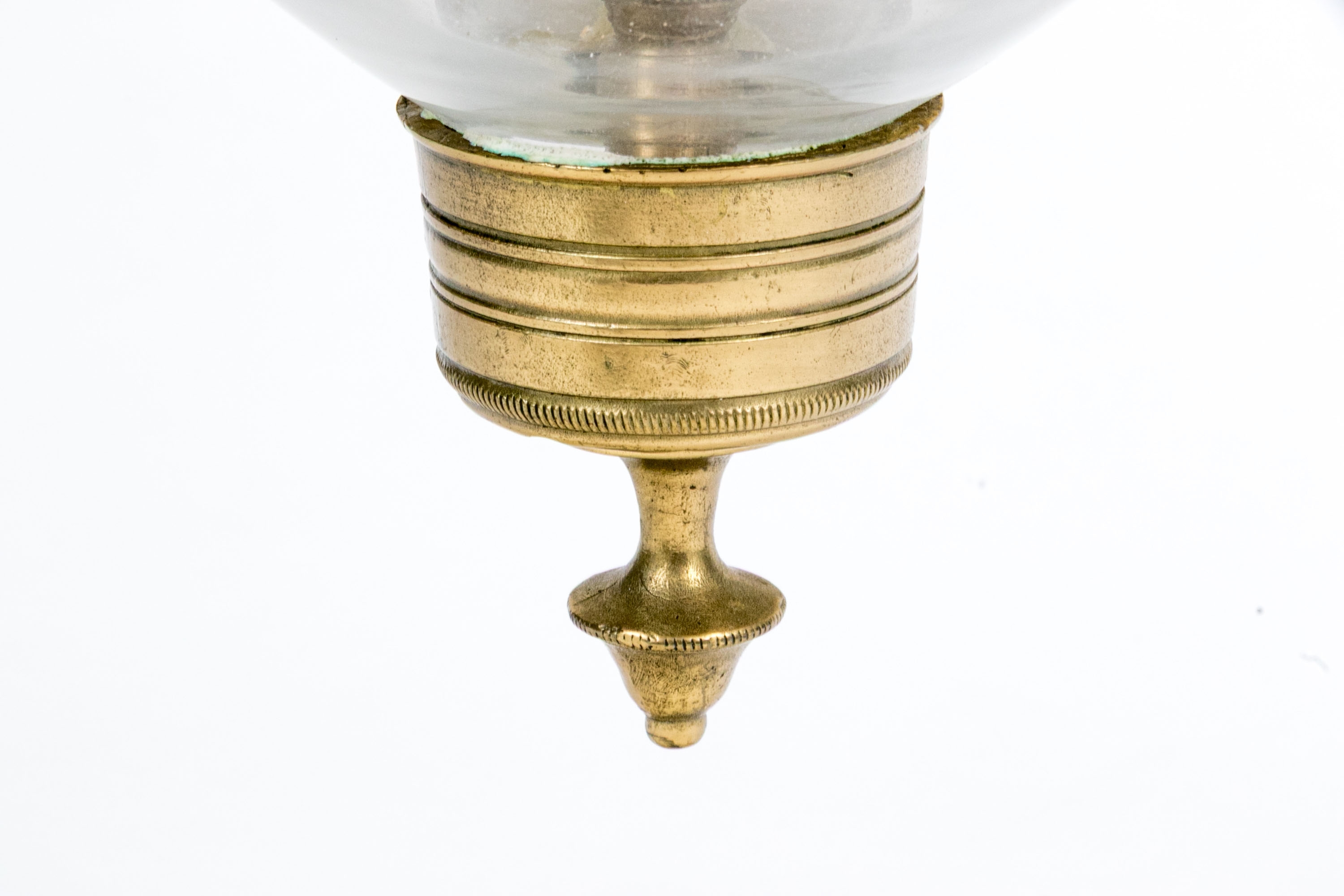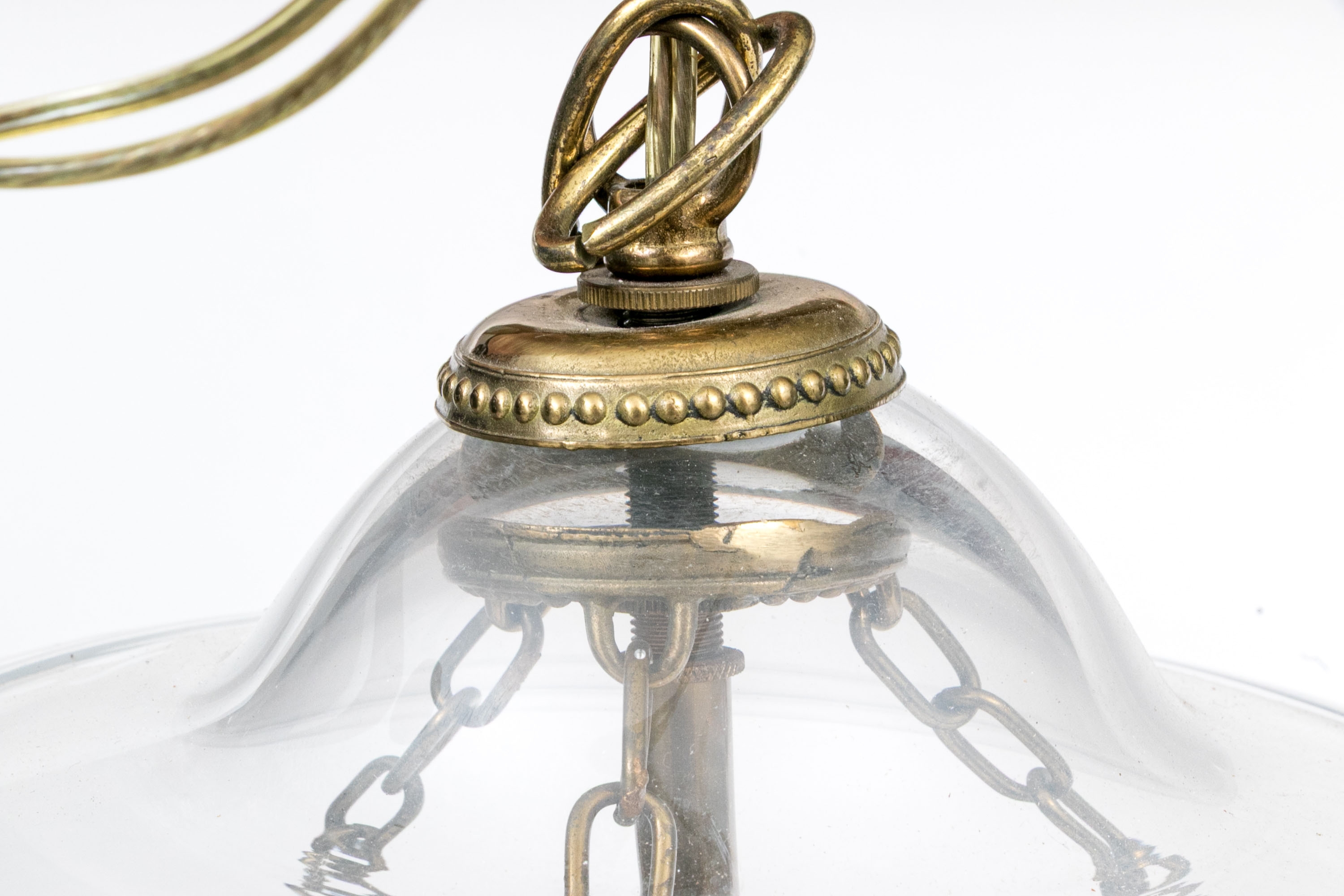 With brass mounts including the terminal, below a glass bowl form shade with brass mounts and three chains to affix to an upper glass domed top with brass ceiling mount.