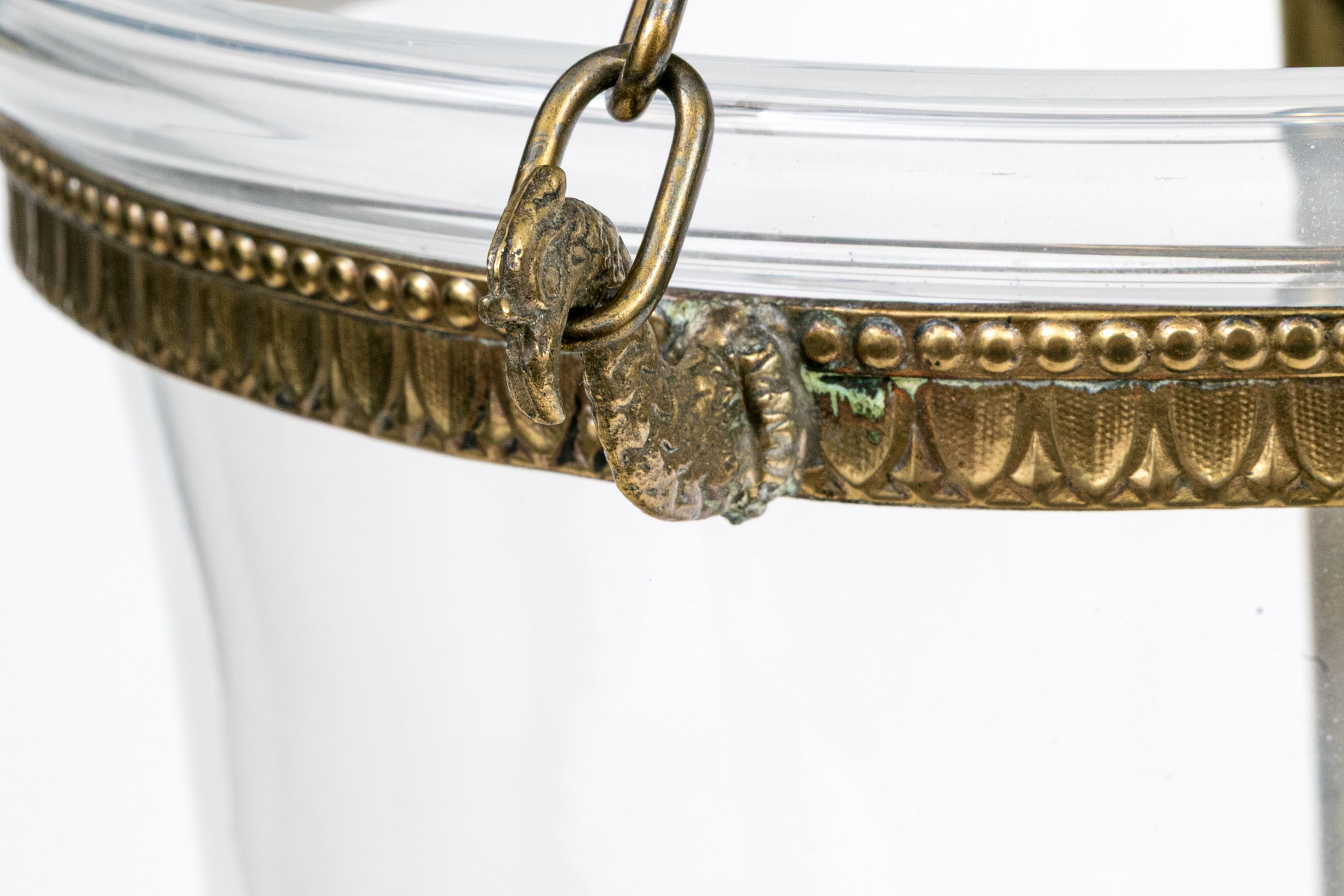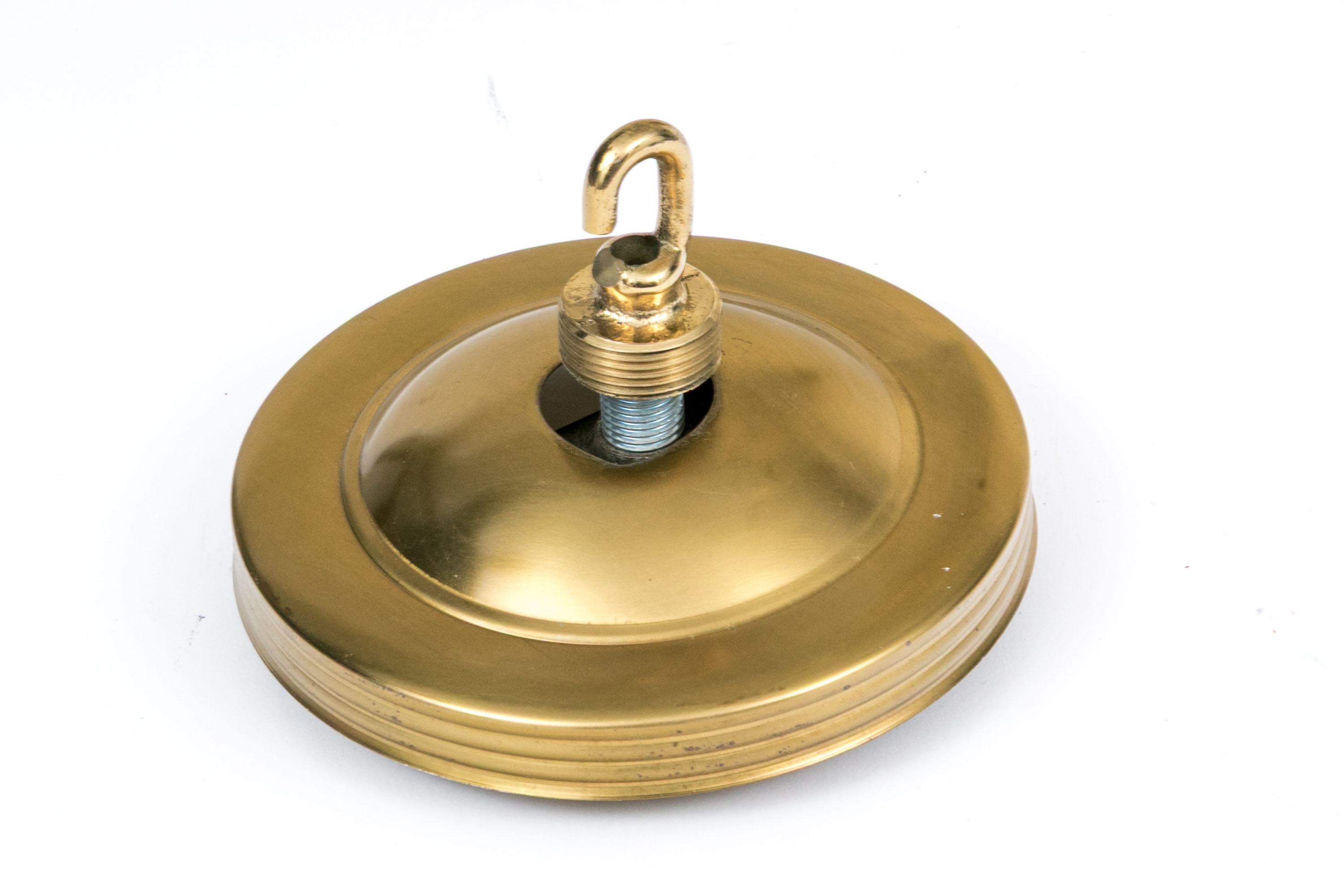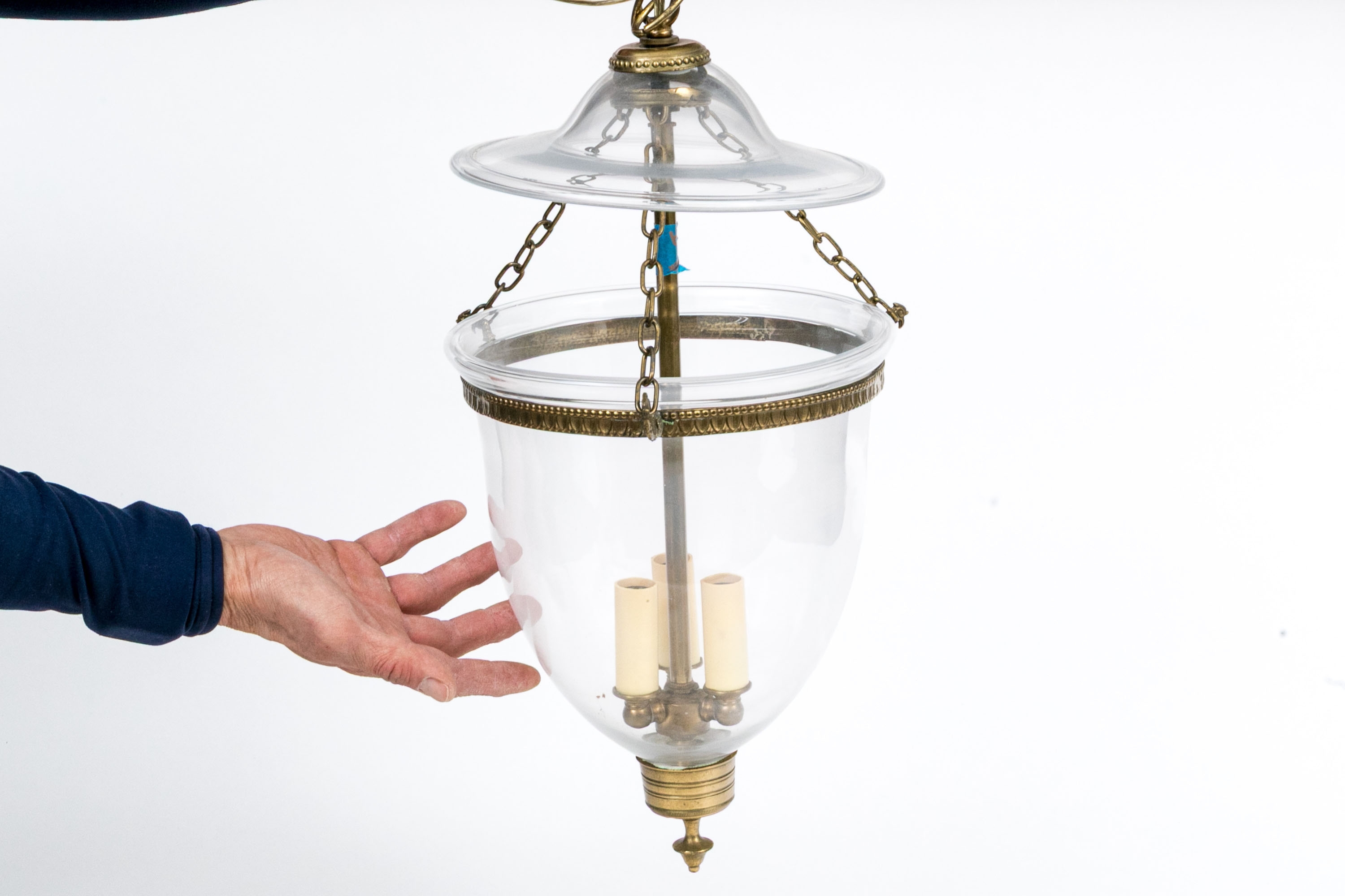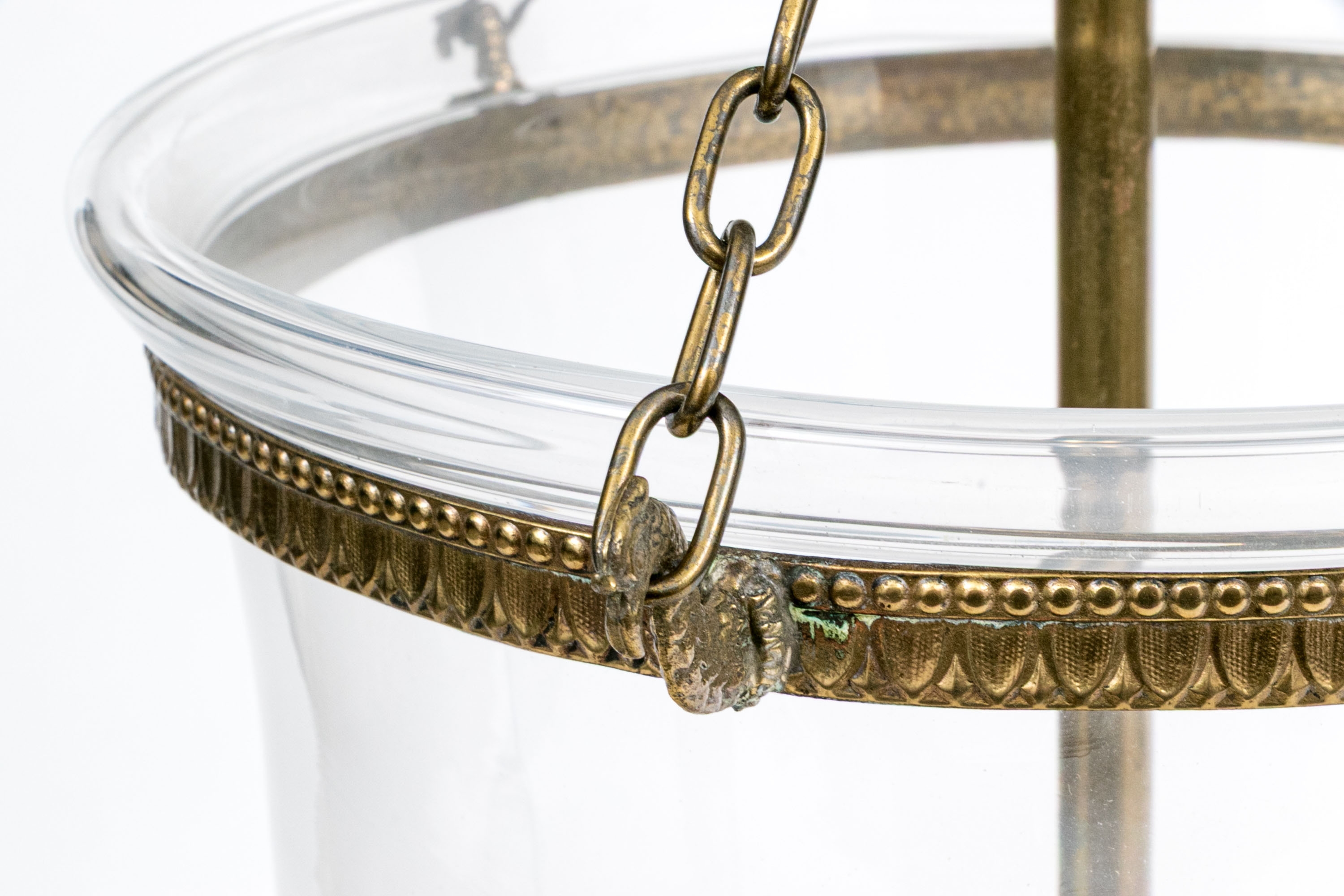 With brass mounts including the terminal, below a glass bowl form shade with brass mounts and three chains to affix to an upper glass domed top with brass ceiling mount.