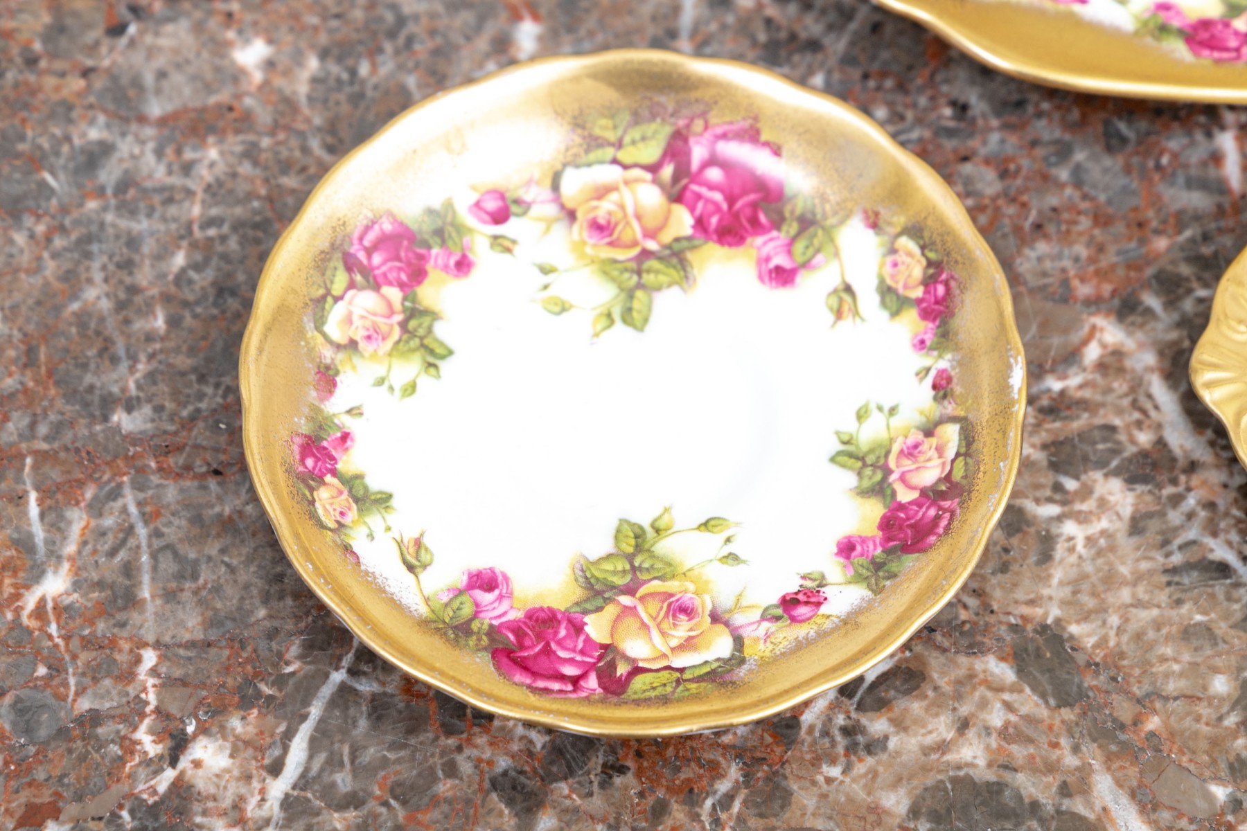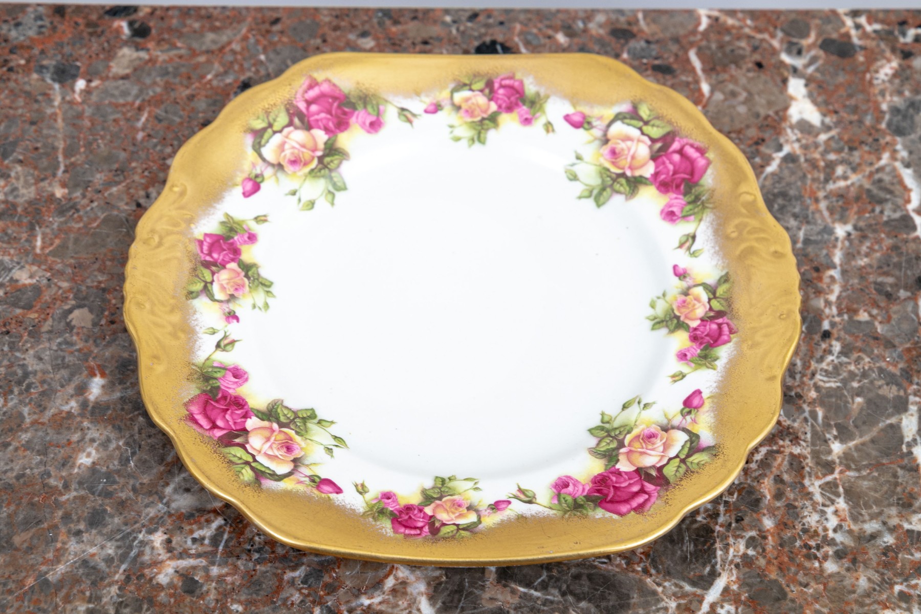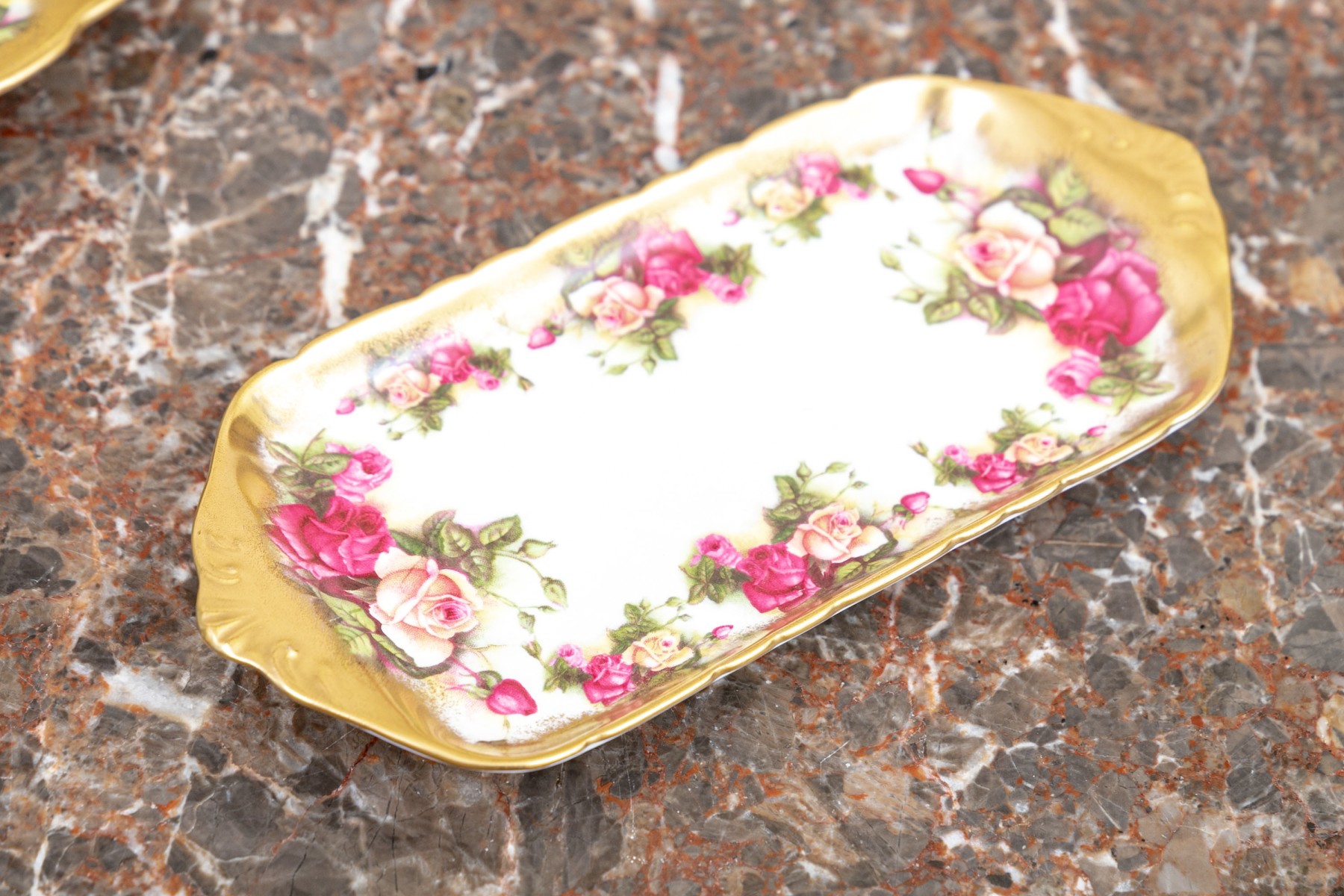 - With a dish, with scalloped trim in gilt finish with floral border encircling the white finished central section.